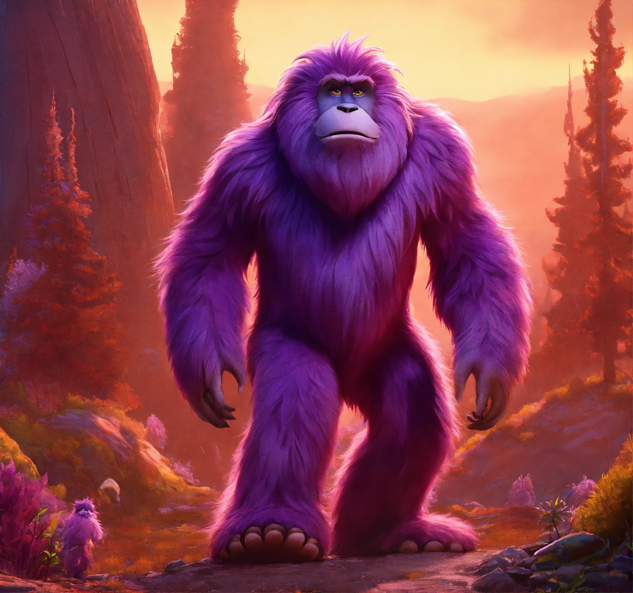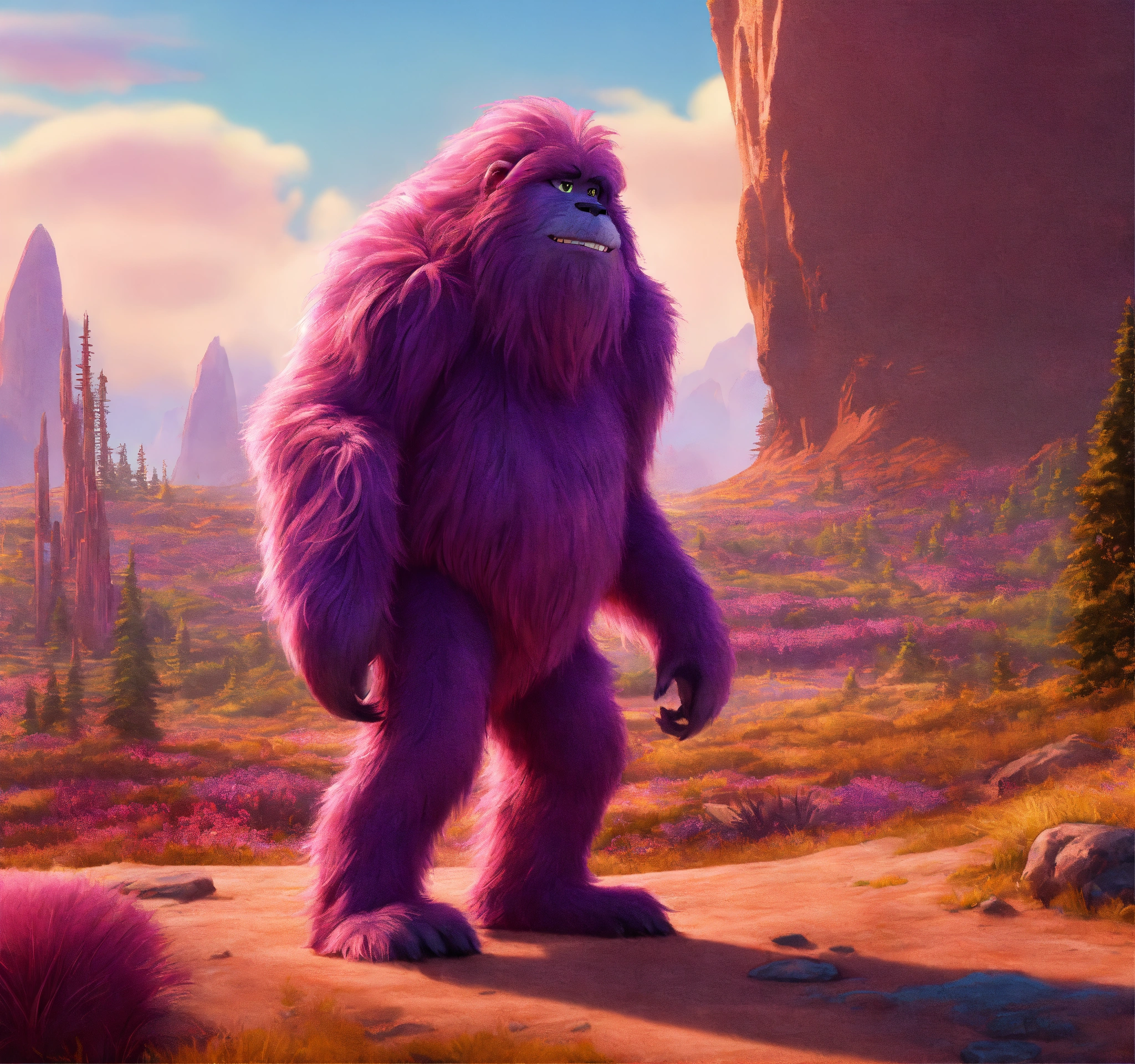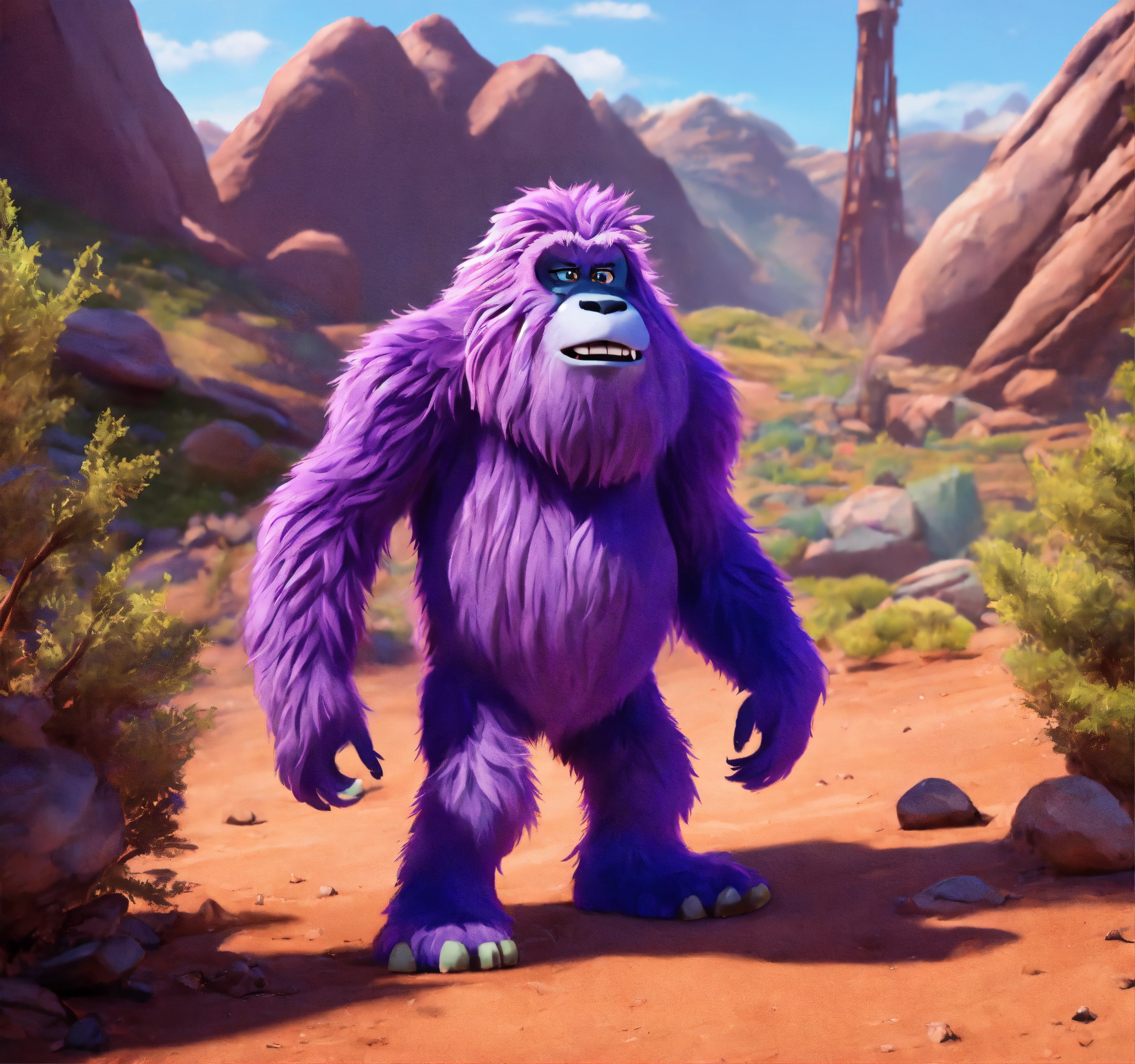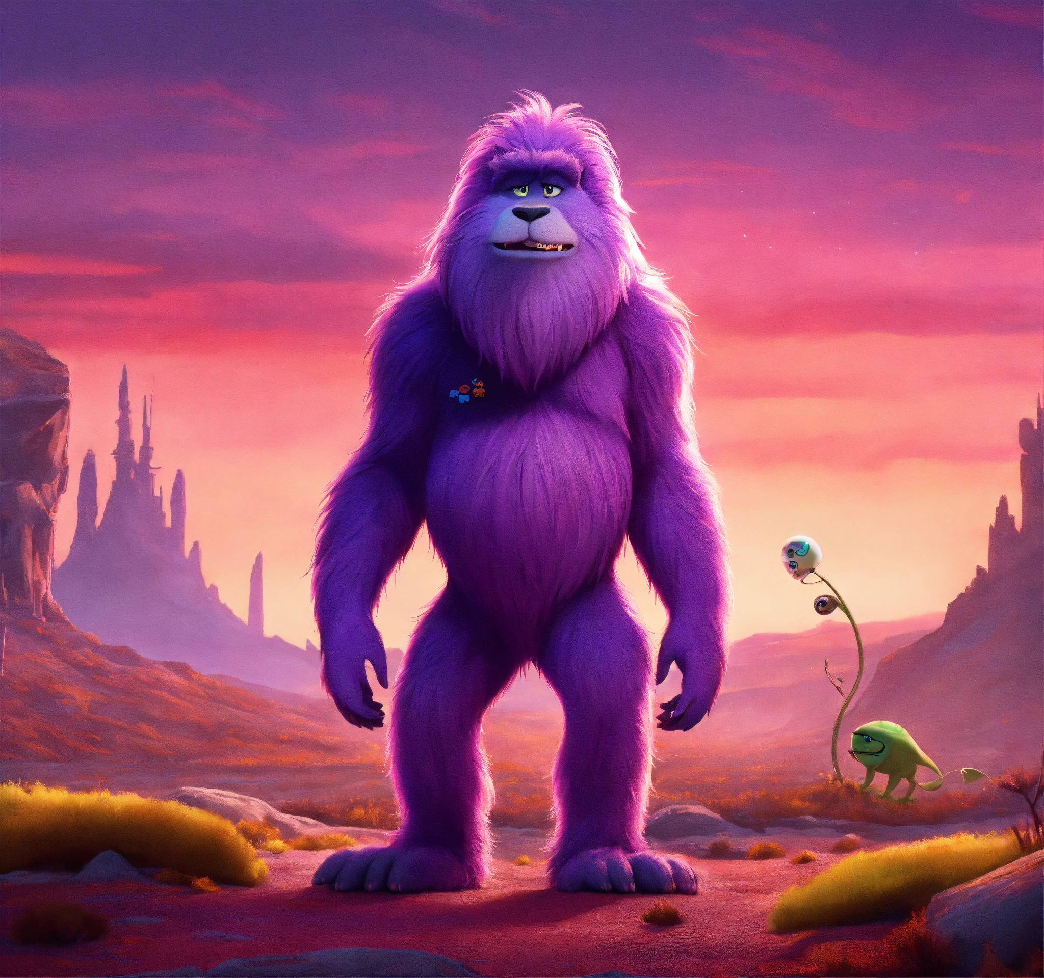 Zoom out on the full body of a fun loving, tall, hairy violet fur sasquatch in the middle of an alien wasteland, pixar, disney