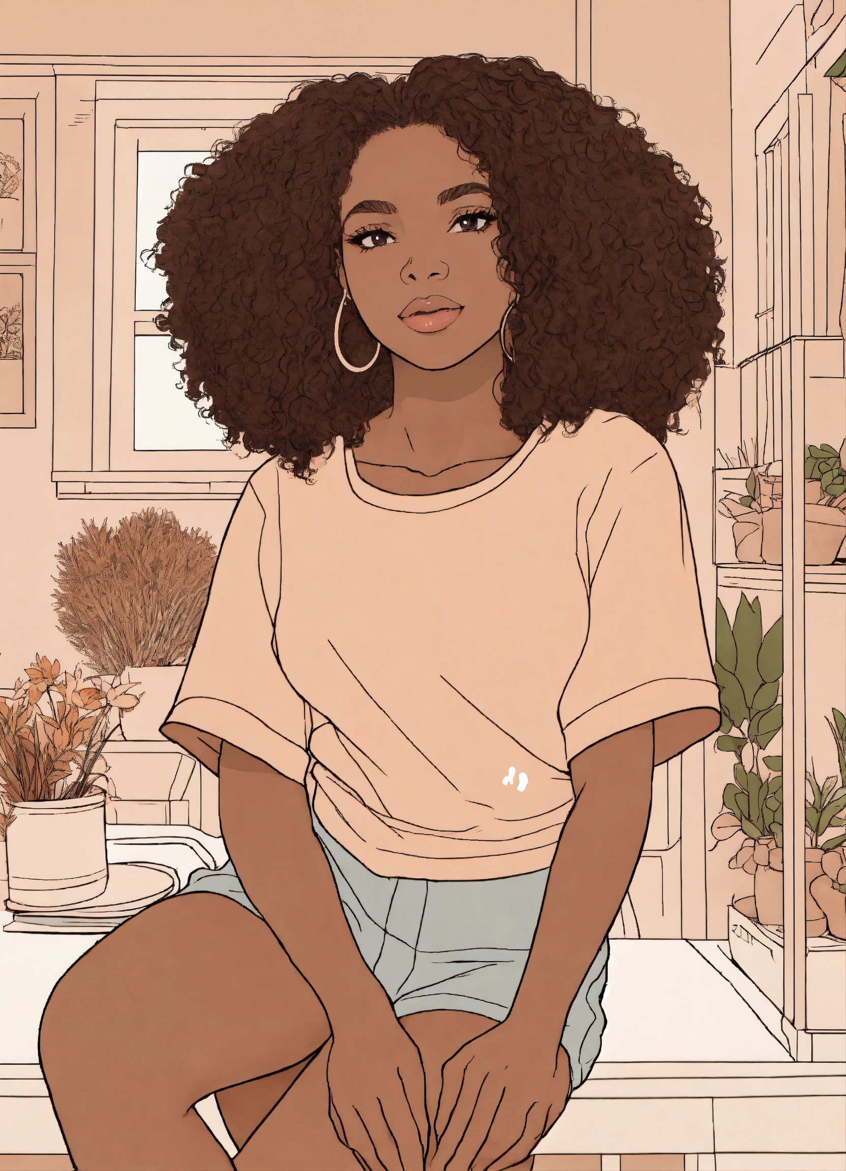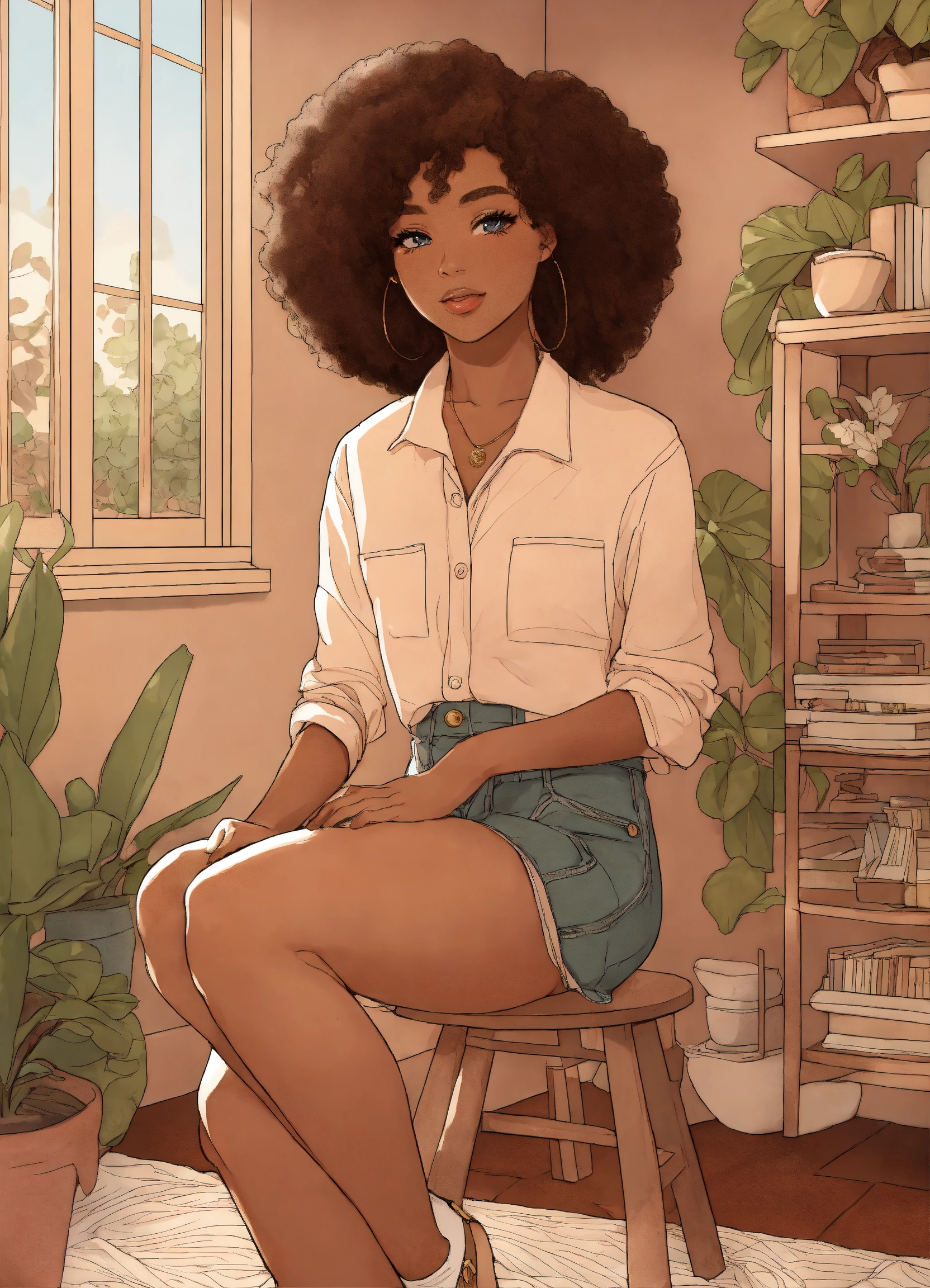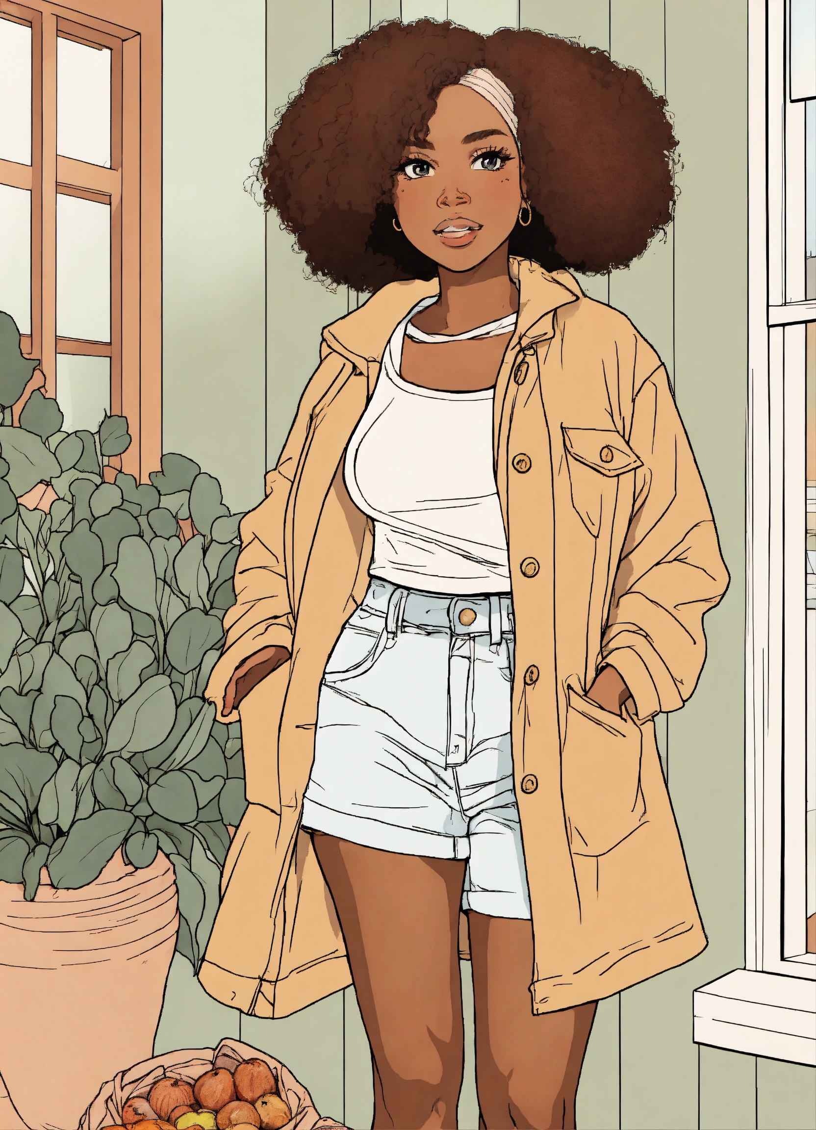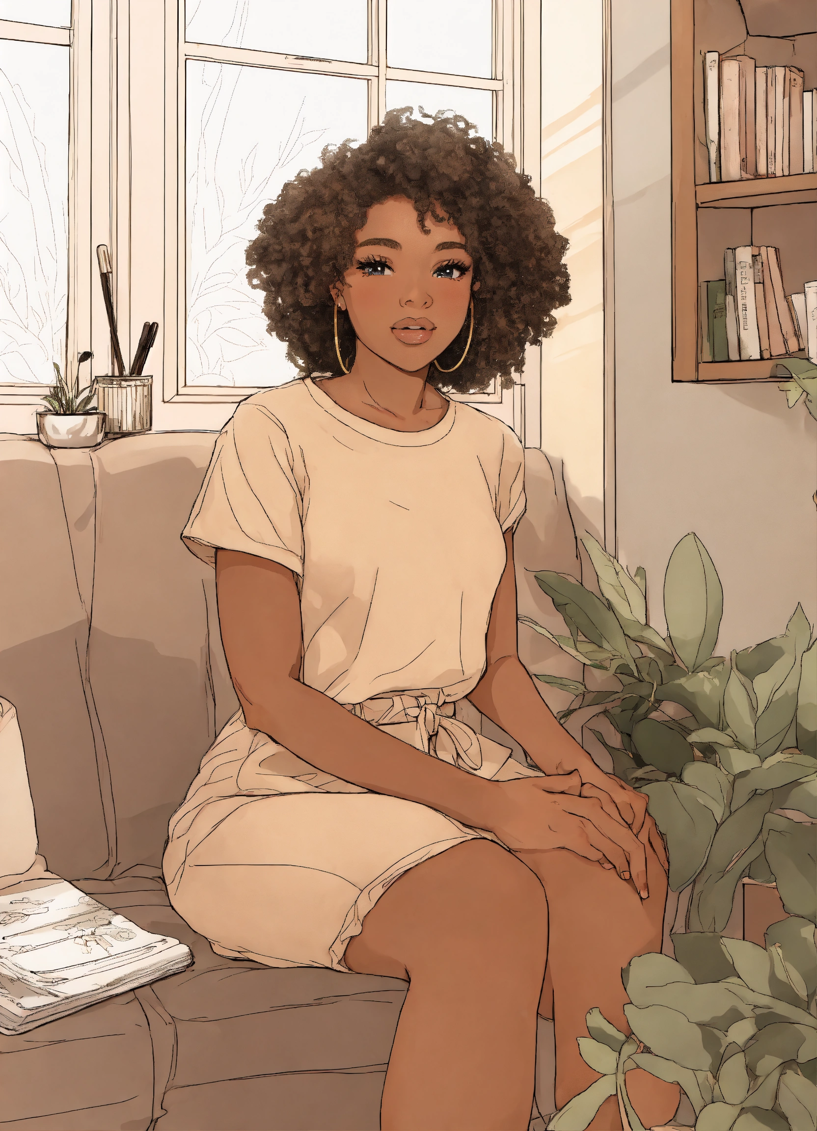 Outline, cute african-american woman, earthy aesthetic, at home, coloring book, anime eyes, wide shot, full body