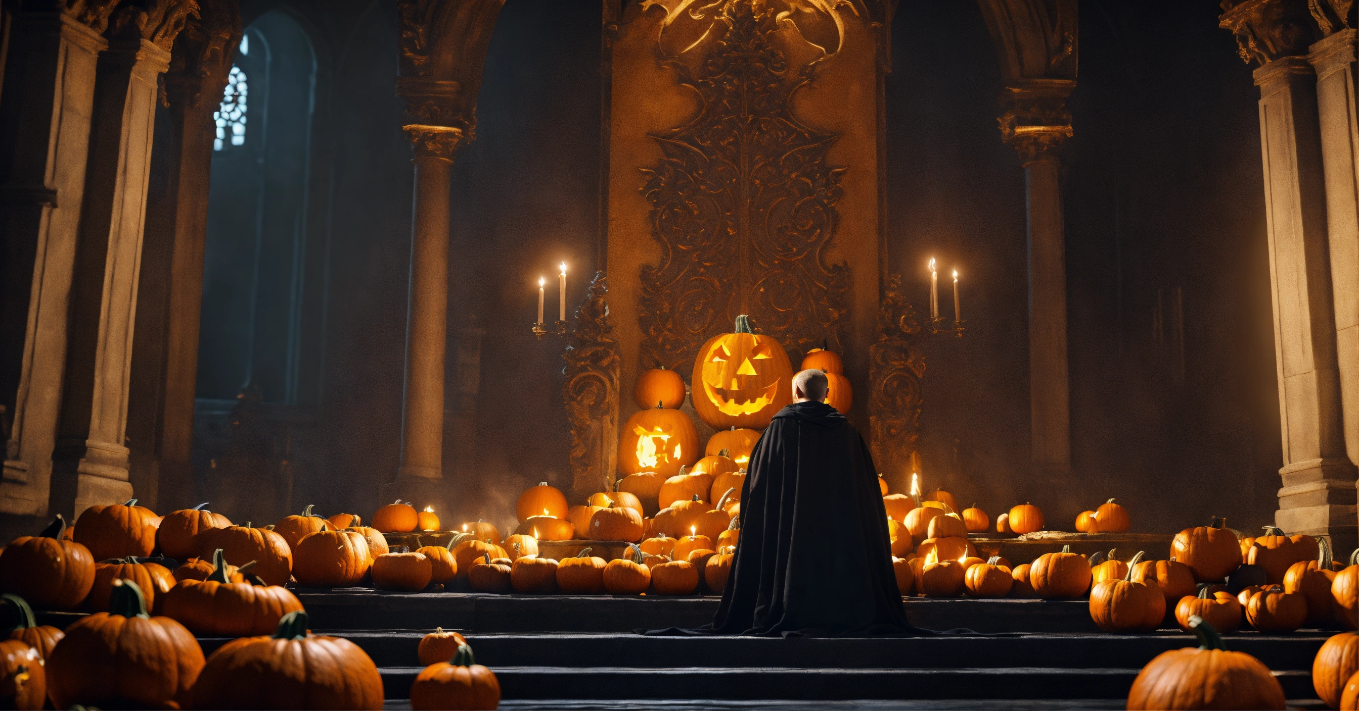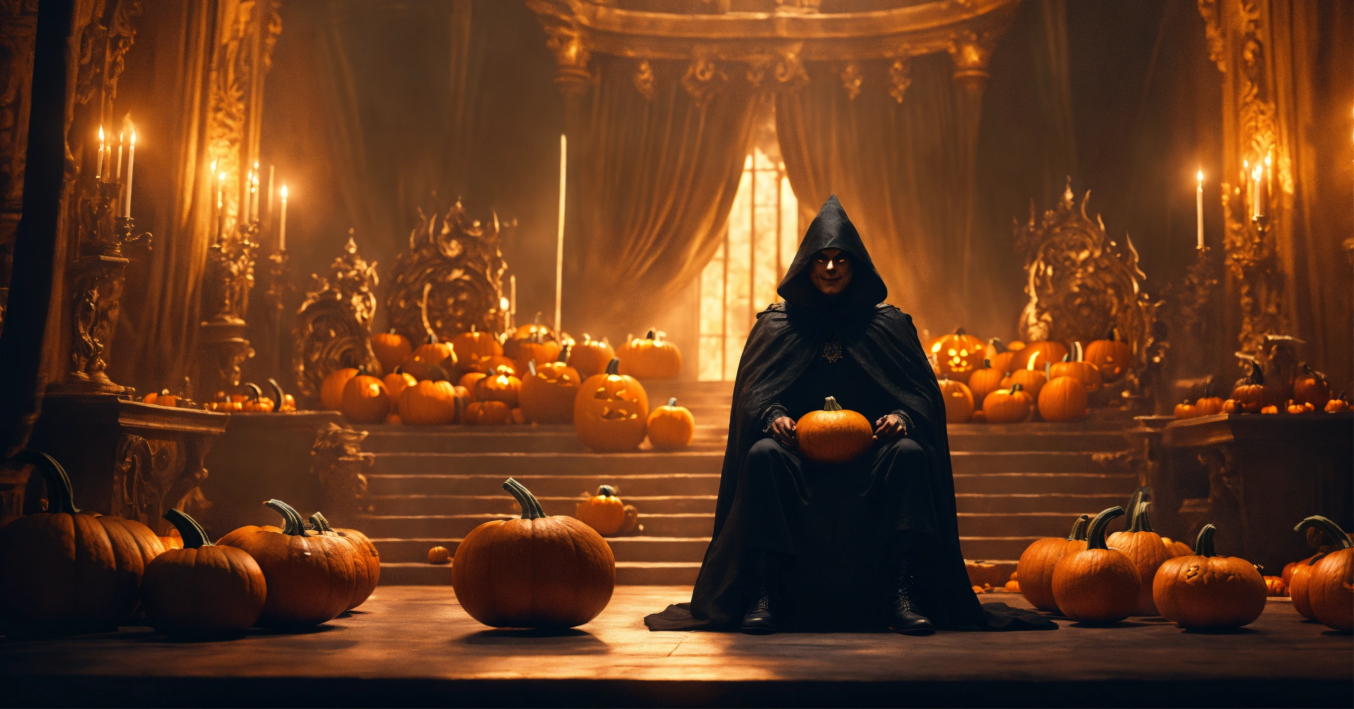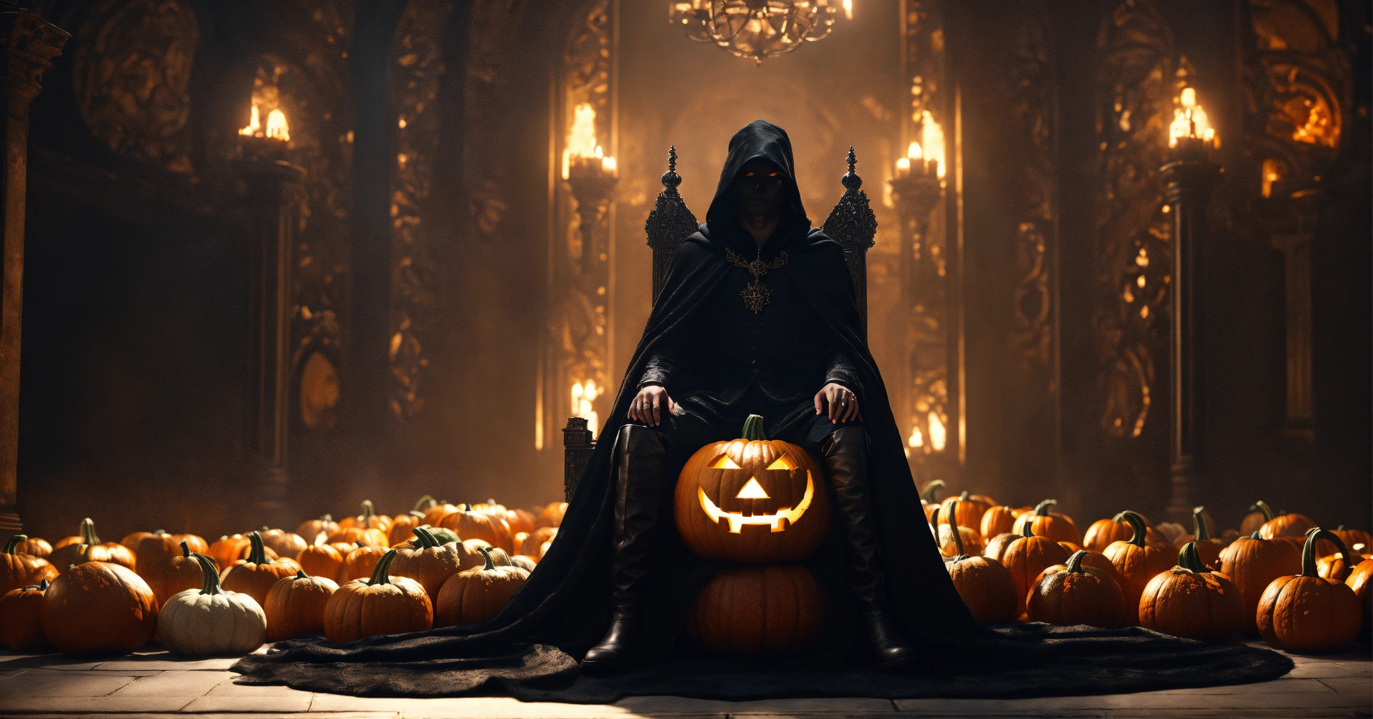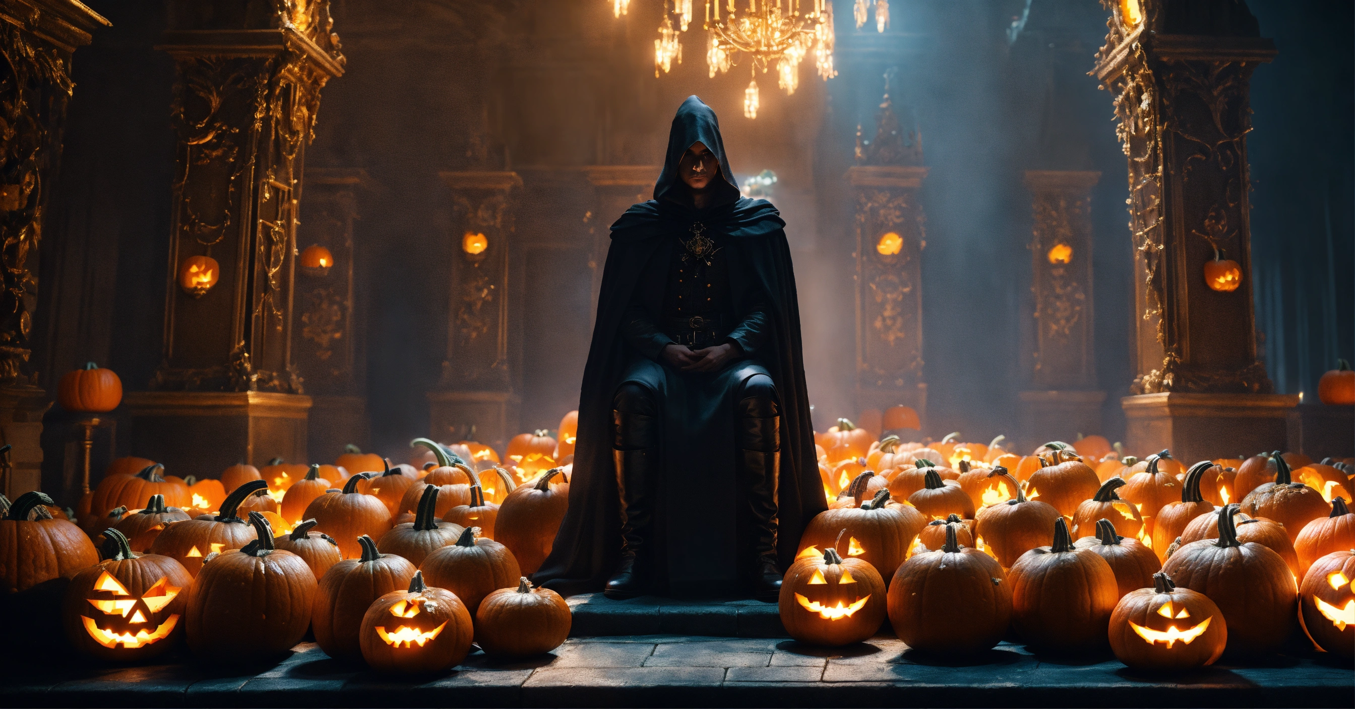 Fantasy setting, pumpkin head, sitting on a throne, wearing black cloak, surrounded by small pumpkin monsters, throne room background cinematic light, realistic, 8k, corrected