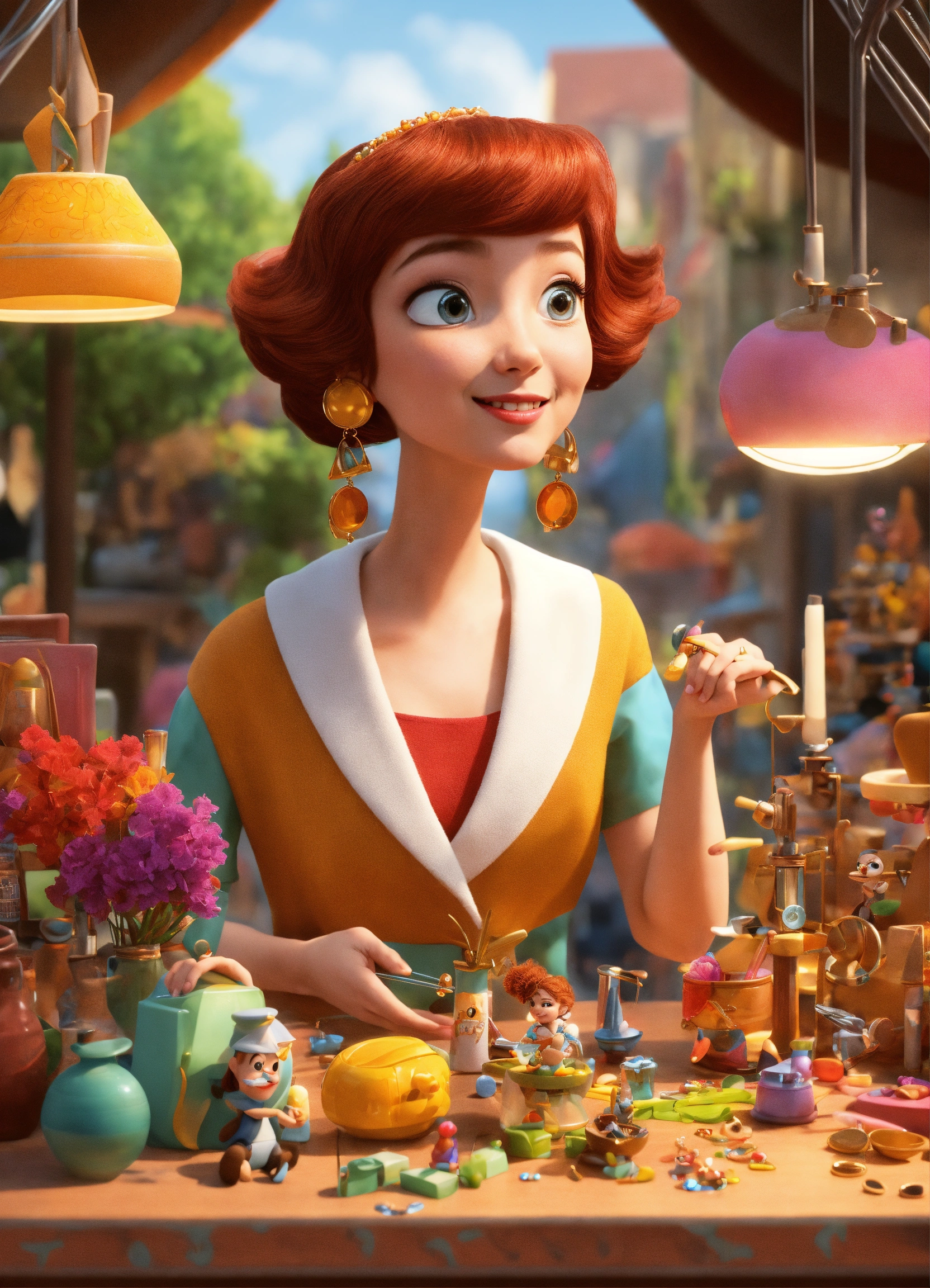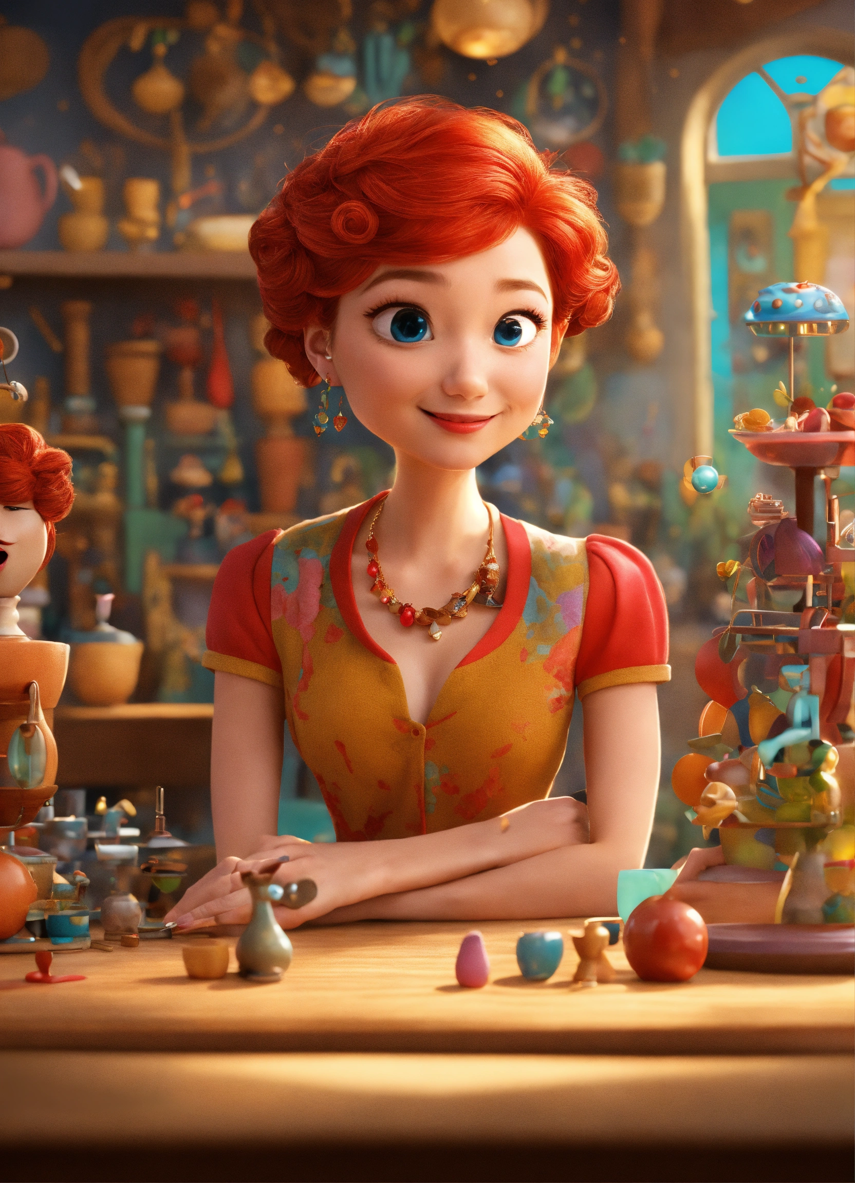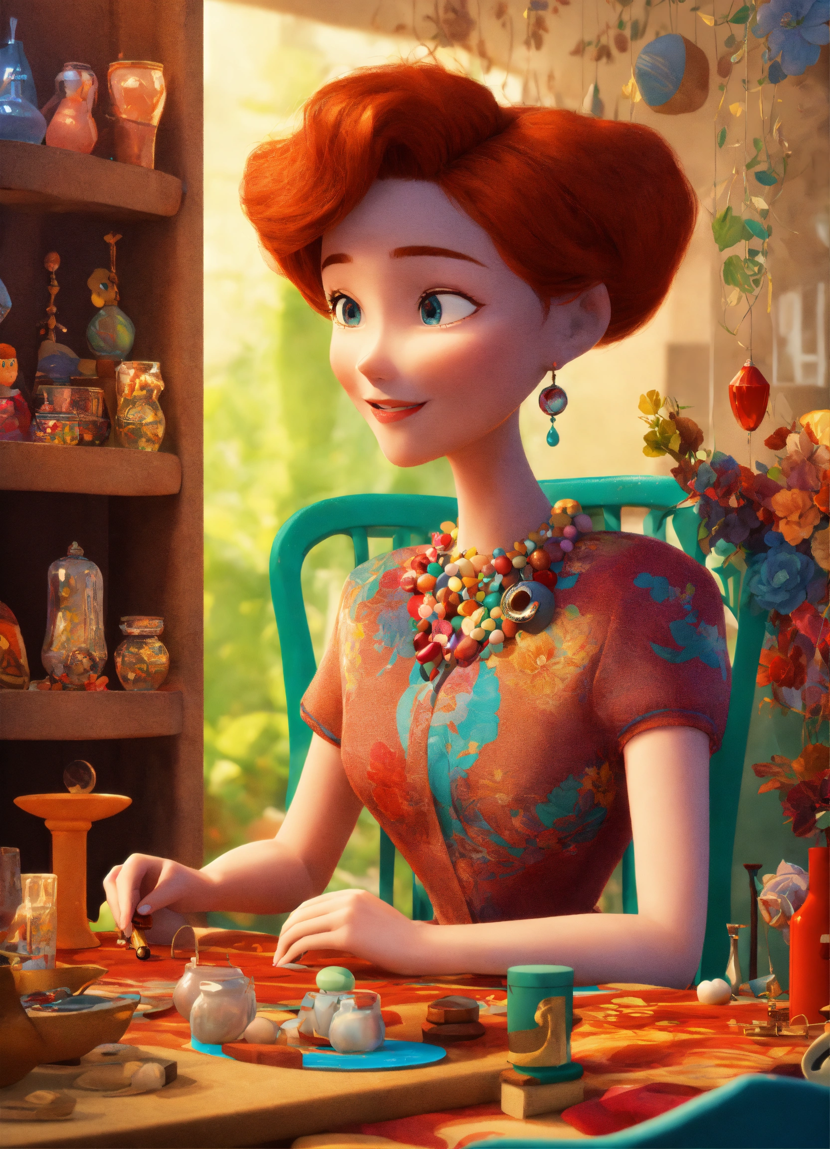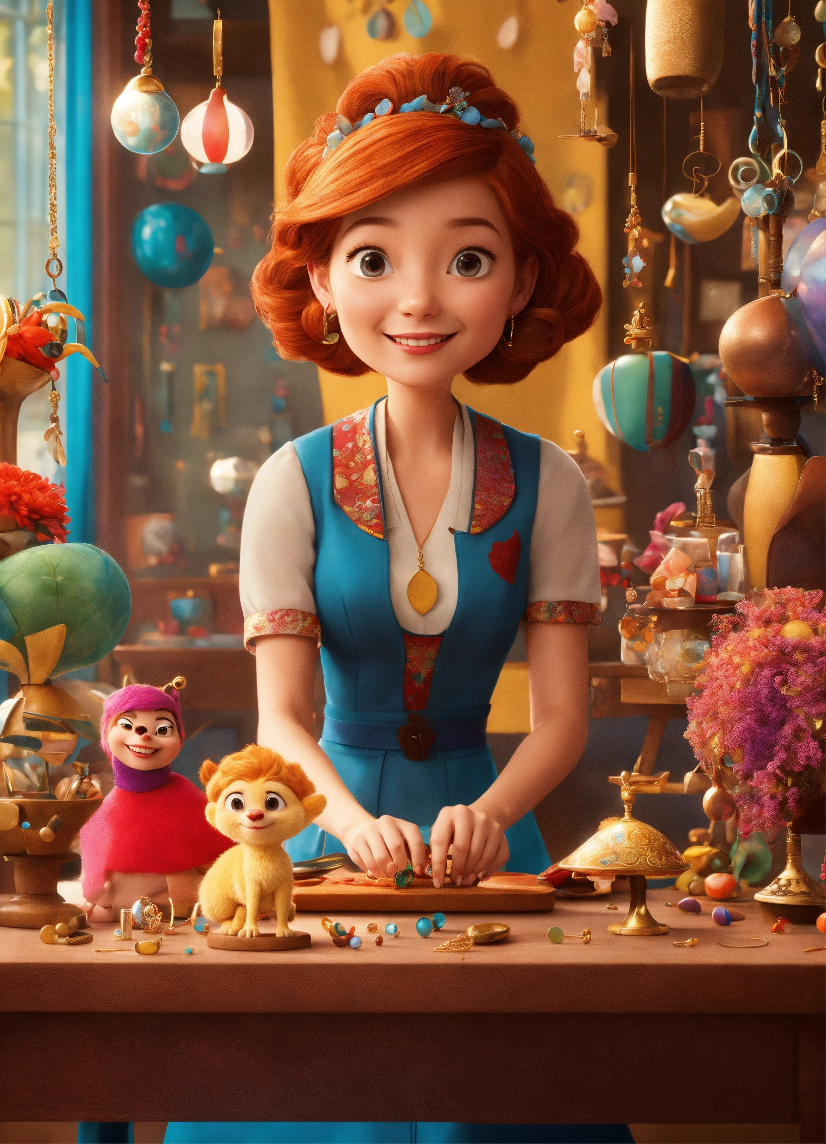 Poster in the style of pixar, with 3d animated characters and many colors and details. the title is 'vinibeu' and shows a woman sitting at a table making earrings. the tall white woman with short red-brown hair looks with joy at the creation of her pieces. other accessories can be seen on the table. lots of color, lots of style and fashion. the woman is a designer