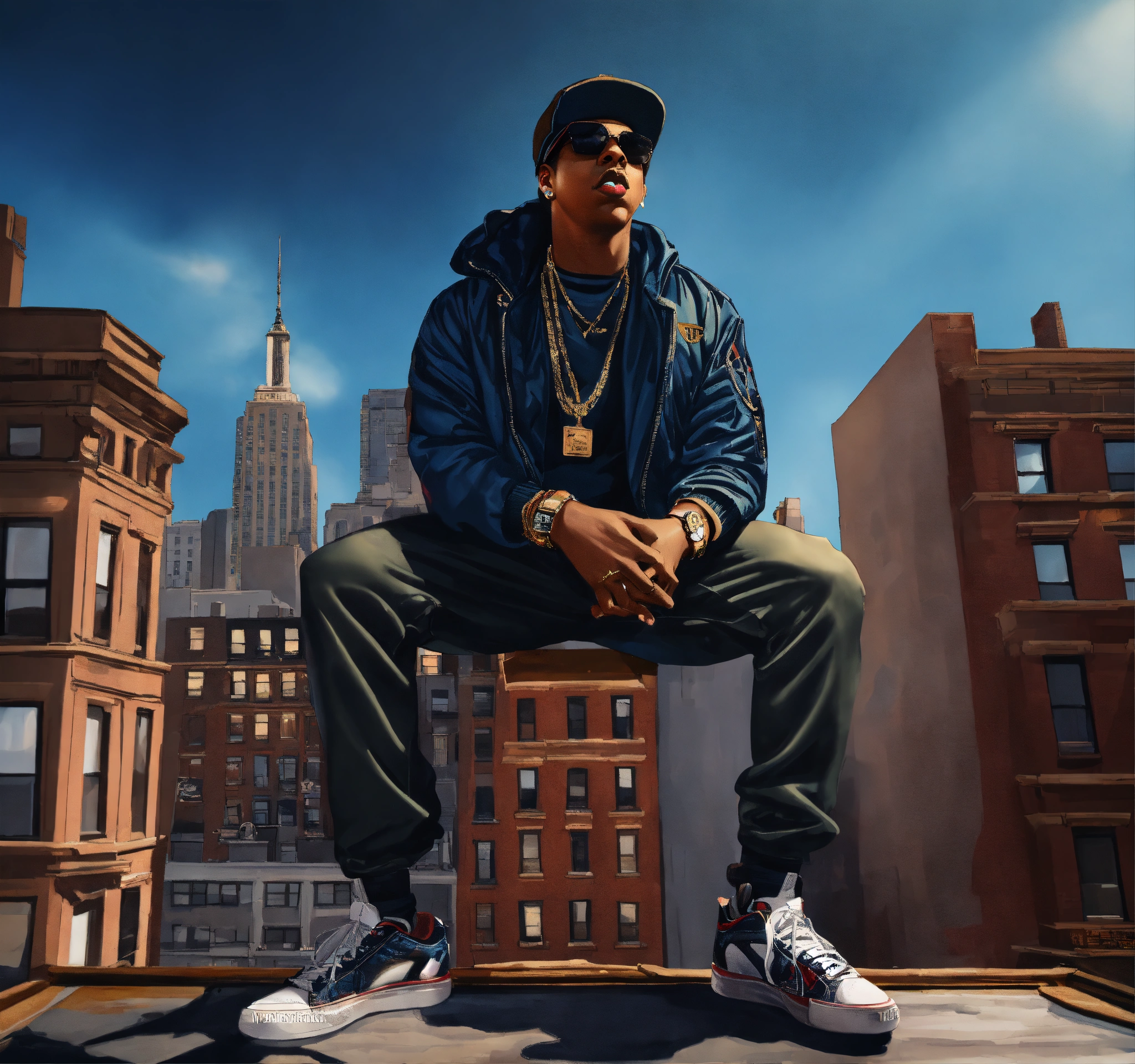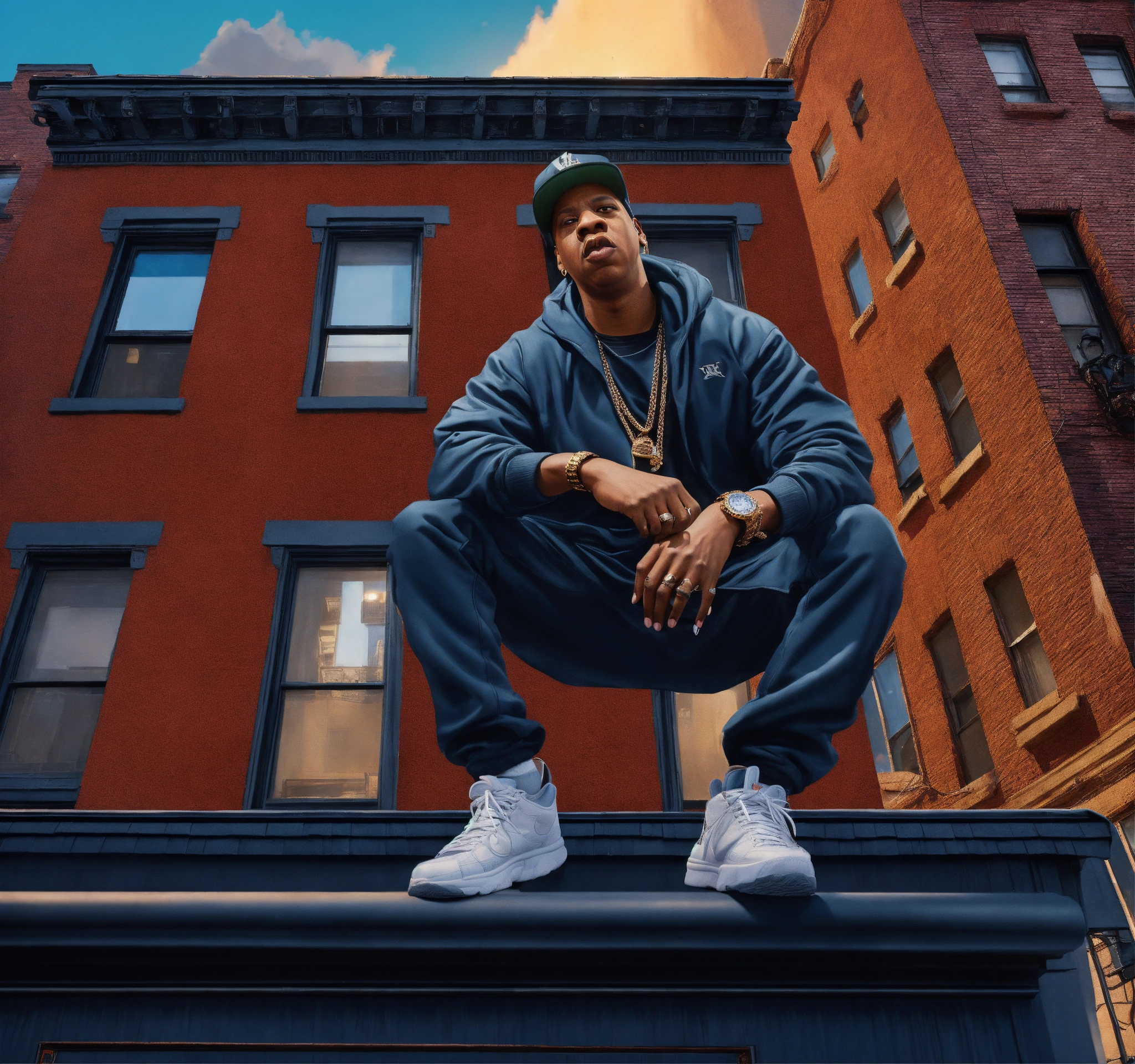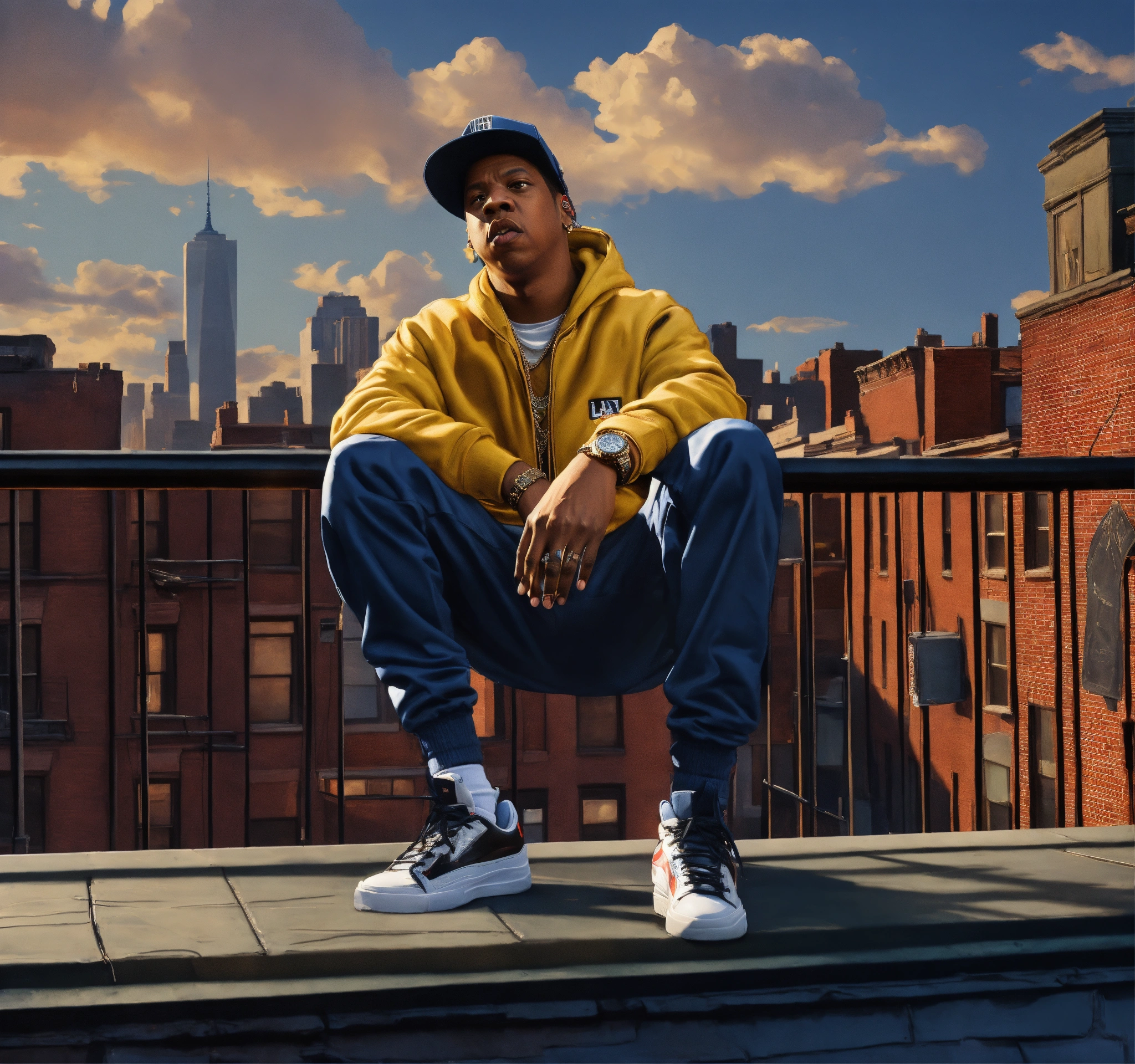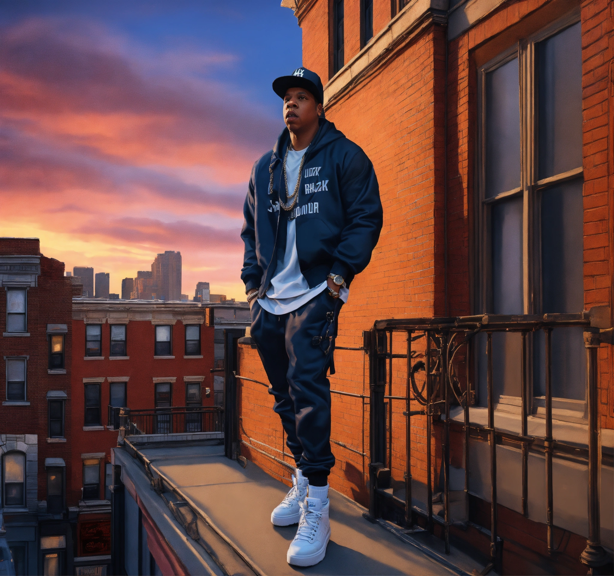 Pop art, hyperrealist full body portrait of black rapper "jay-z" rapping on a roof top brownstone building. new york street corner, fantasy art, photo realistic, dynamic lighting, artstation, poster, volumetric lighting, very detailed faces, 4 k, award winning
