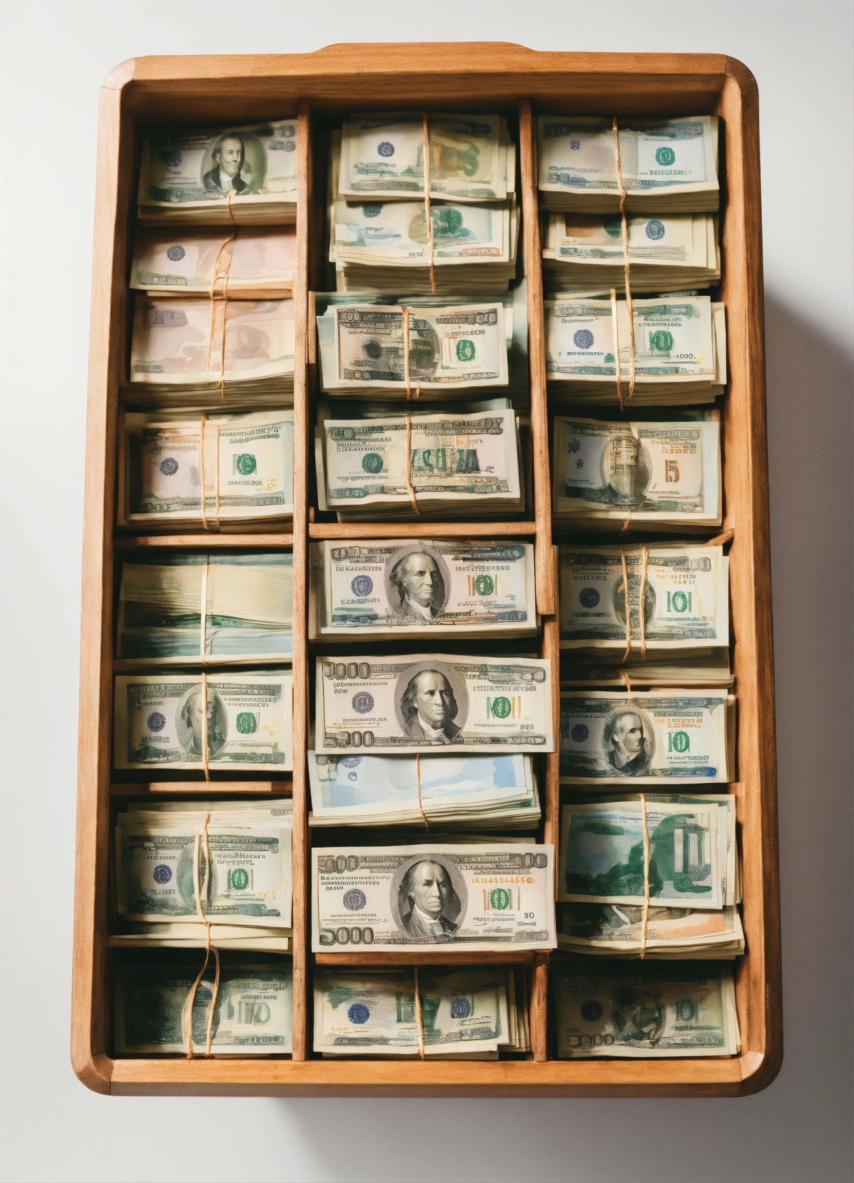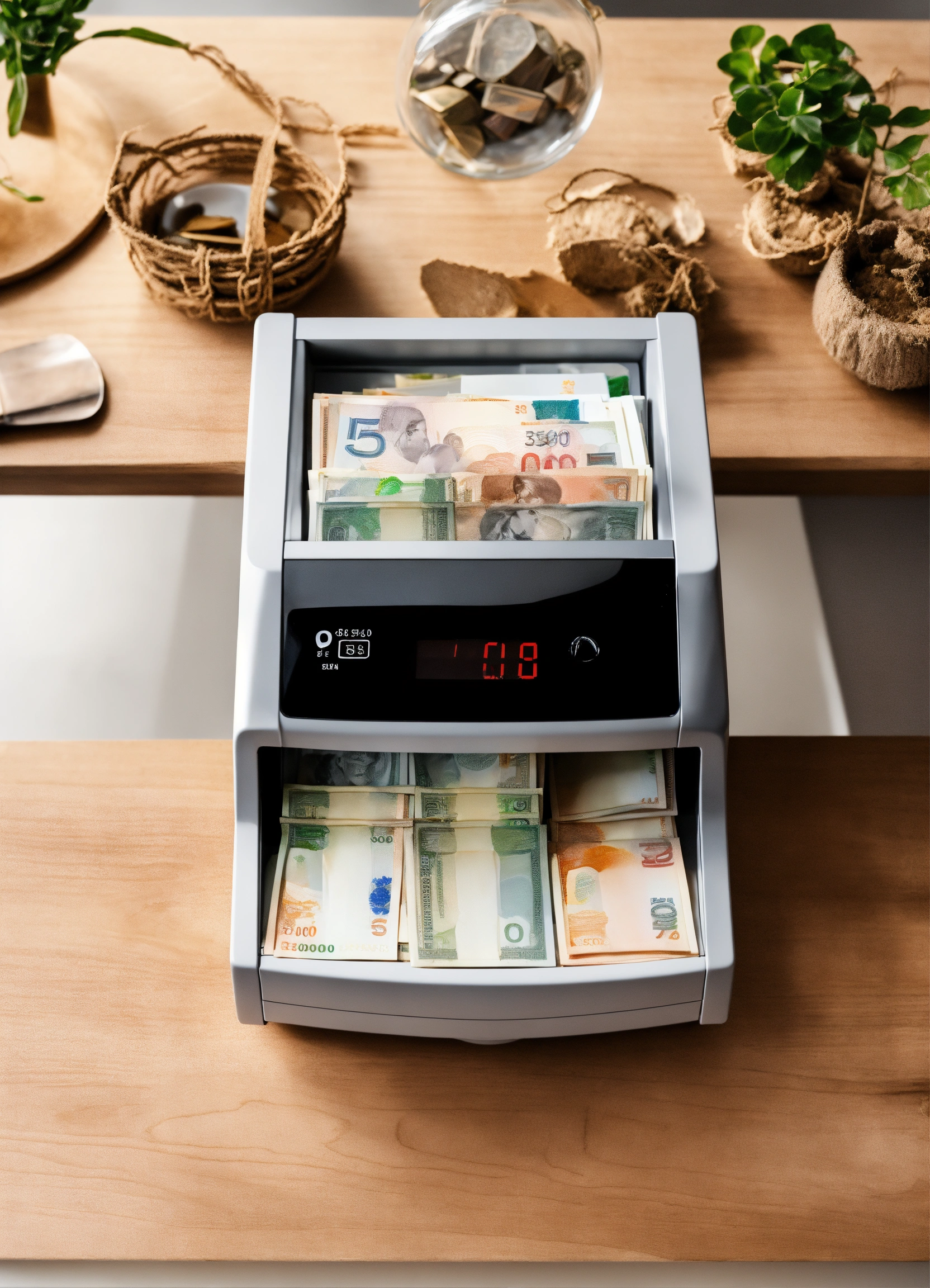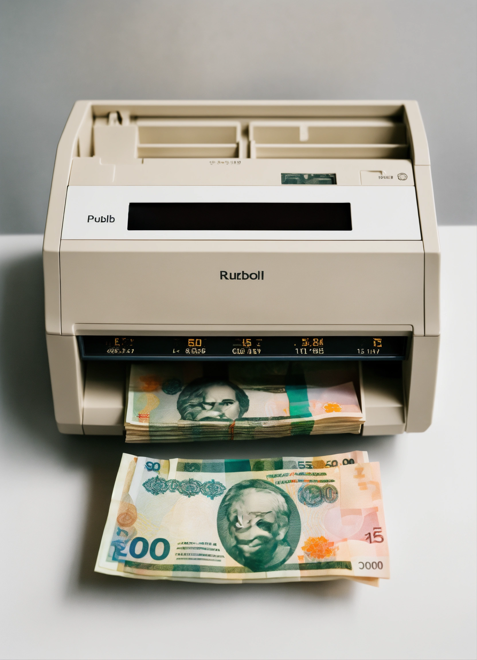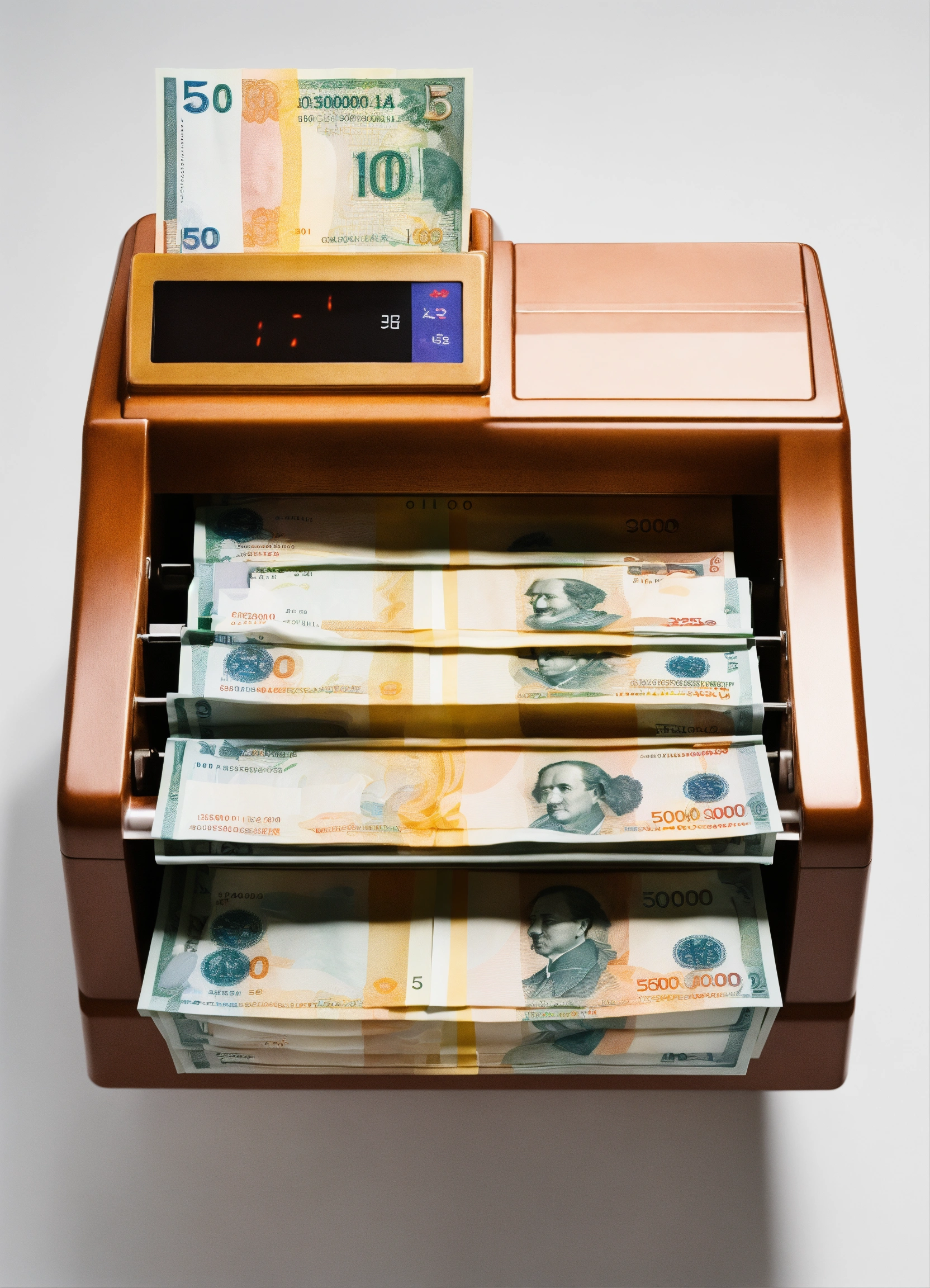 The banknote counter is on the table, from there come out 5, 000 russian ruble banknotes, style minimalism, view from above, white background