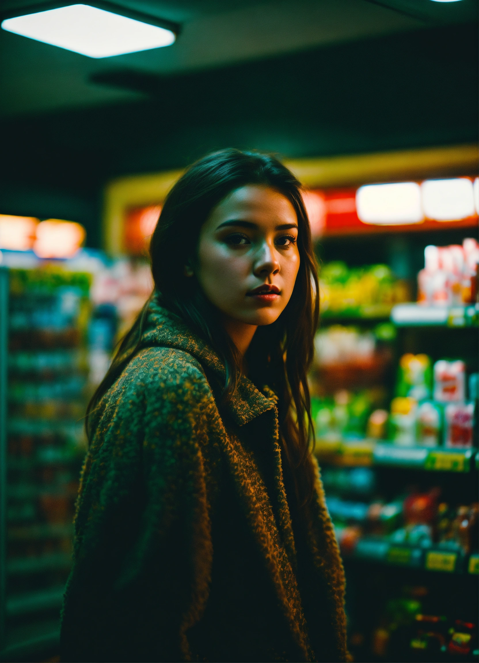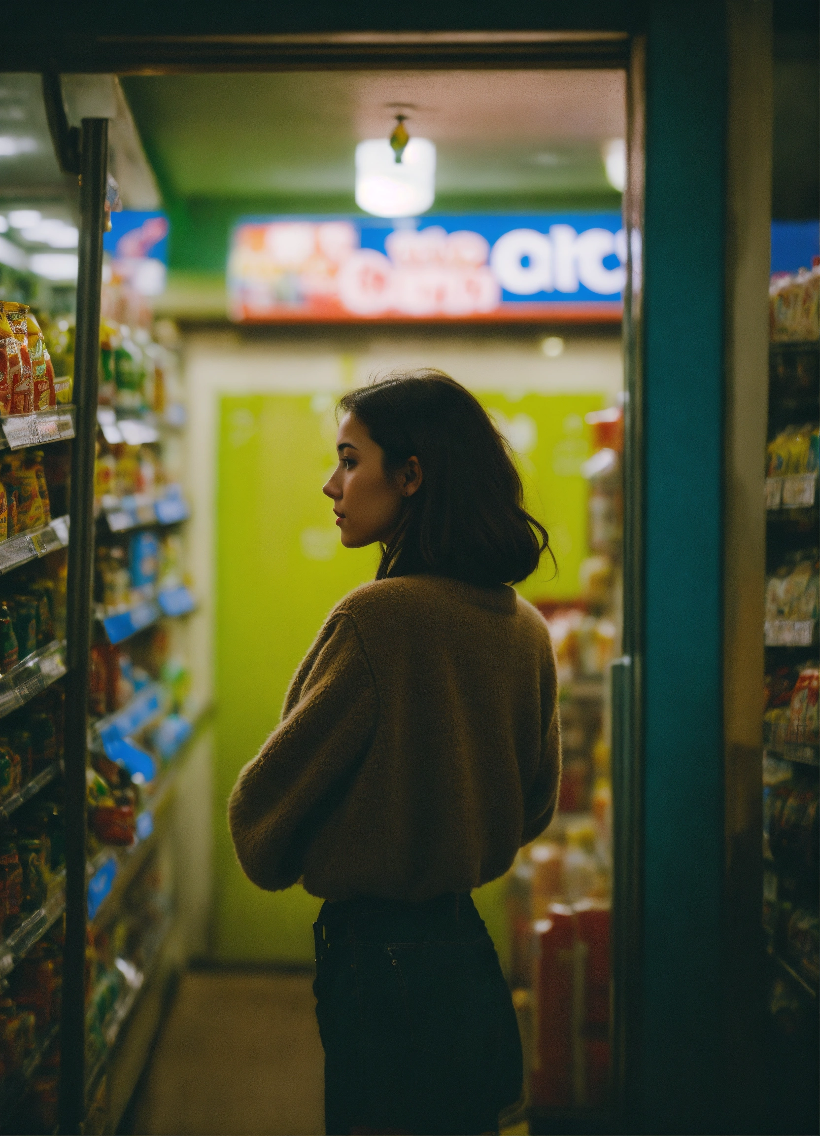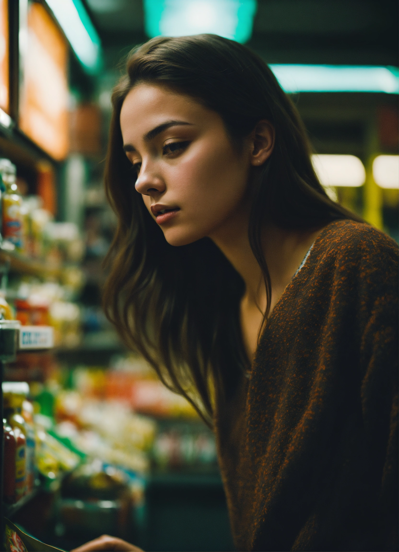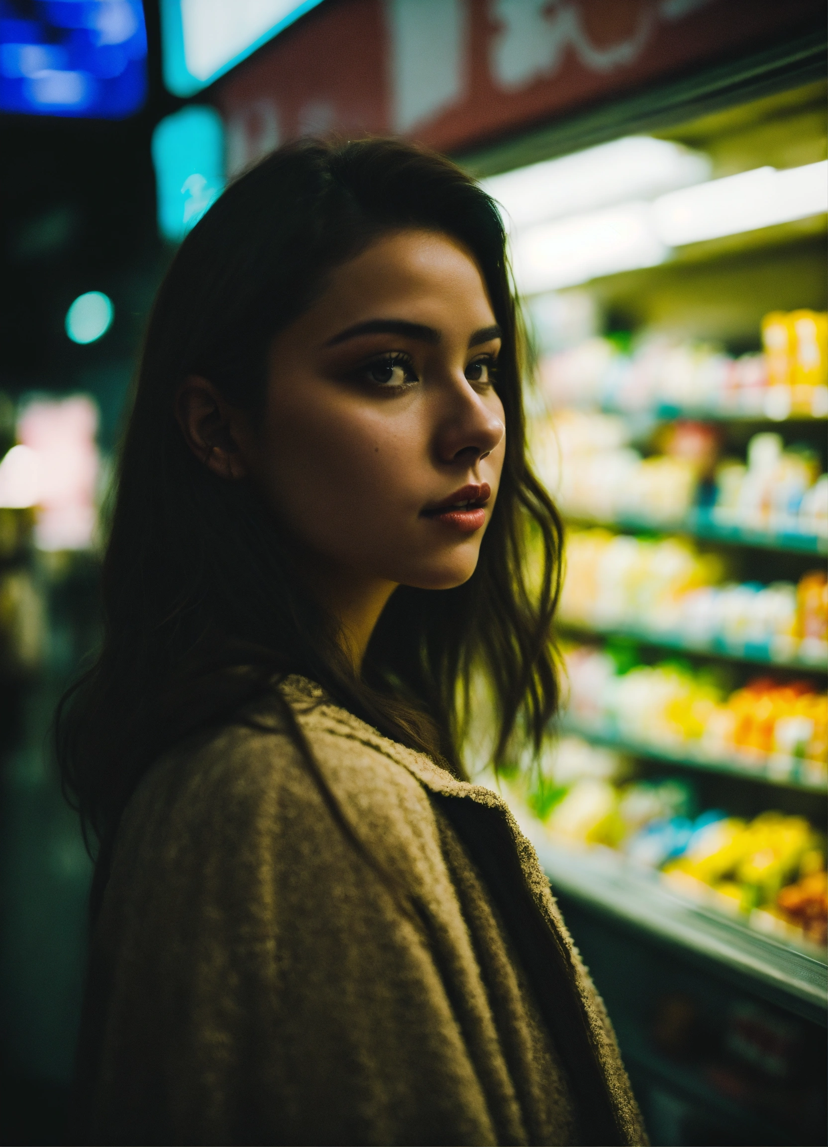 Candid photo of a young brunette woman taken at a convenience store during the night, low quality image, exhibiting a grainy texture, jpg artifacts, film grain, gritty, raw aesthetic