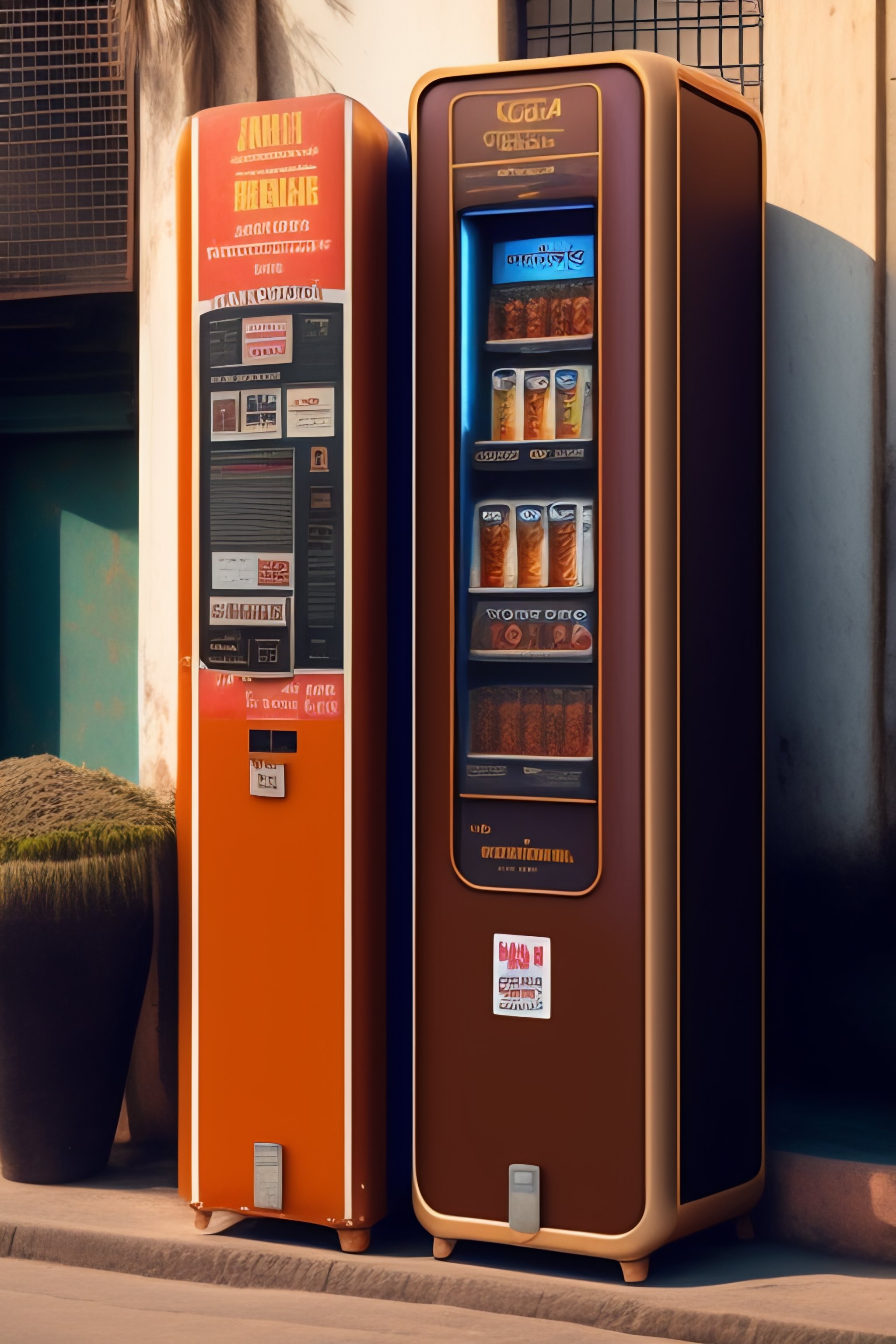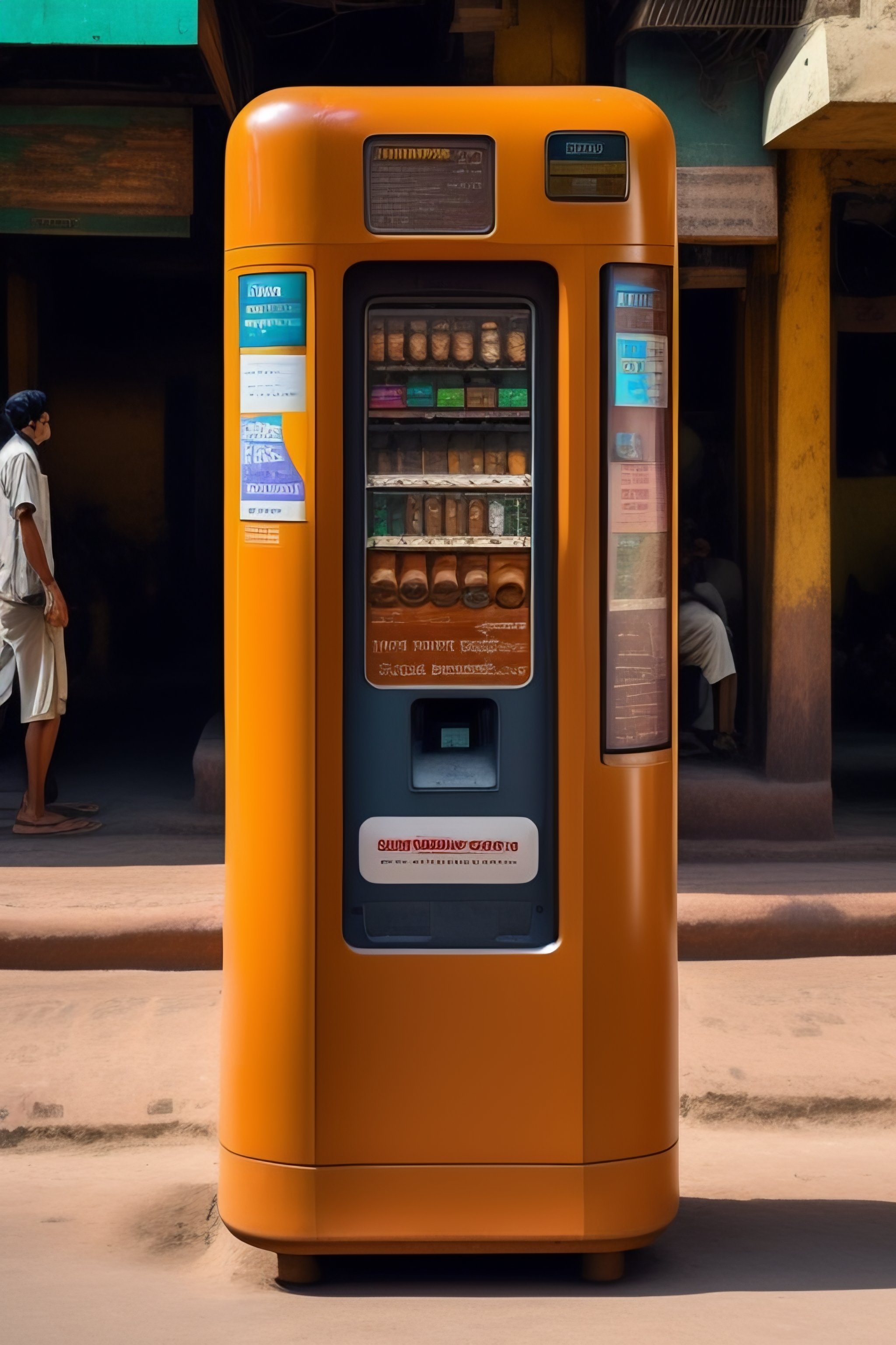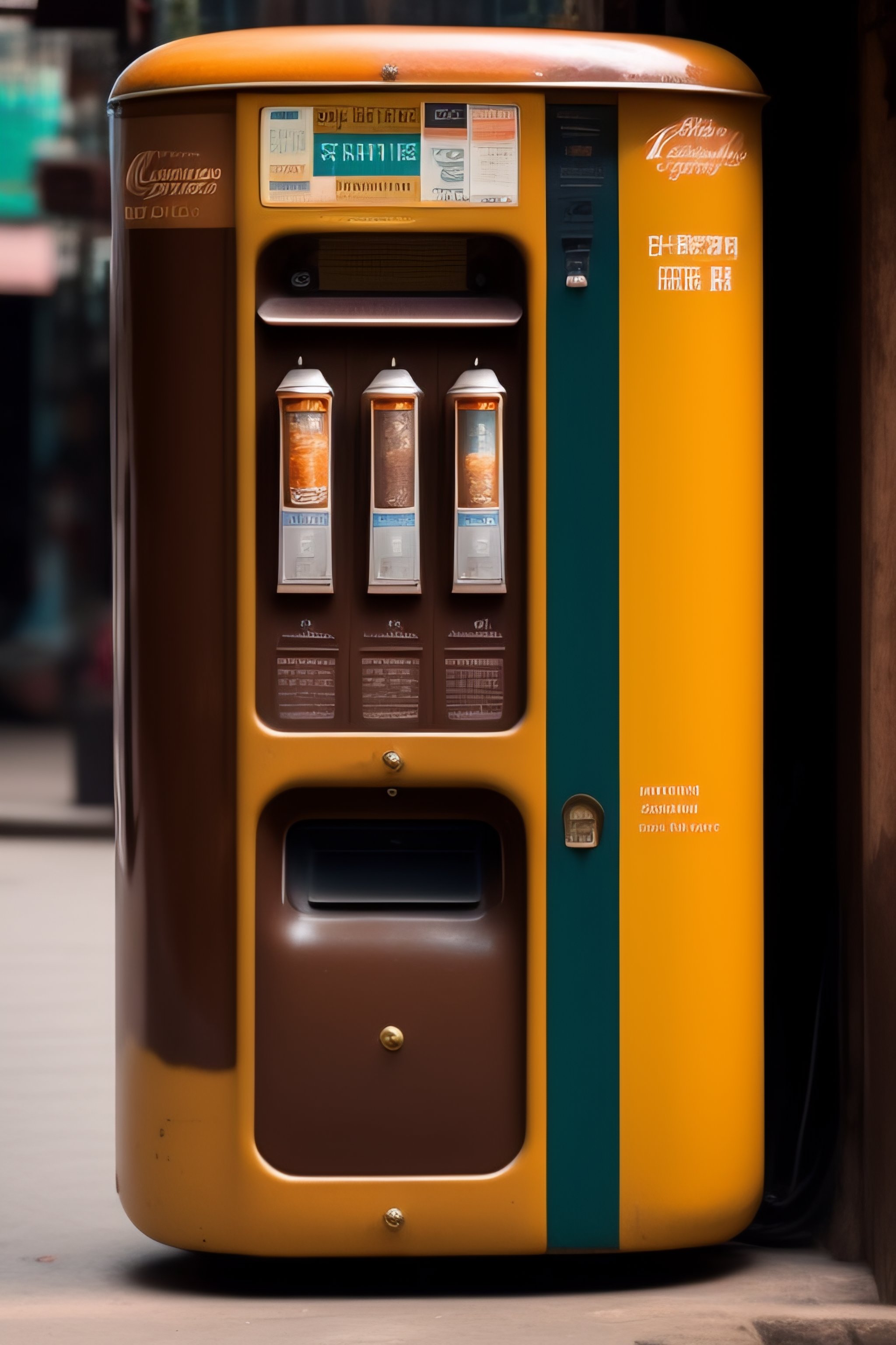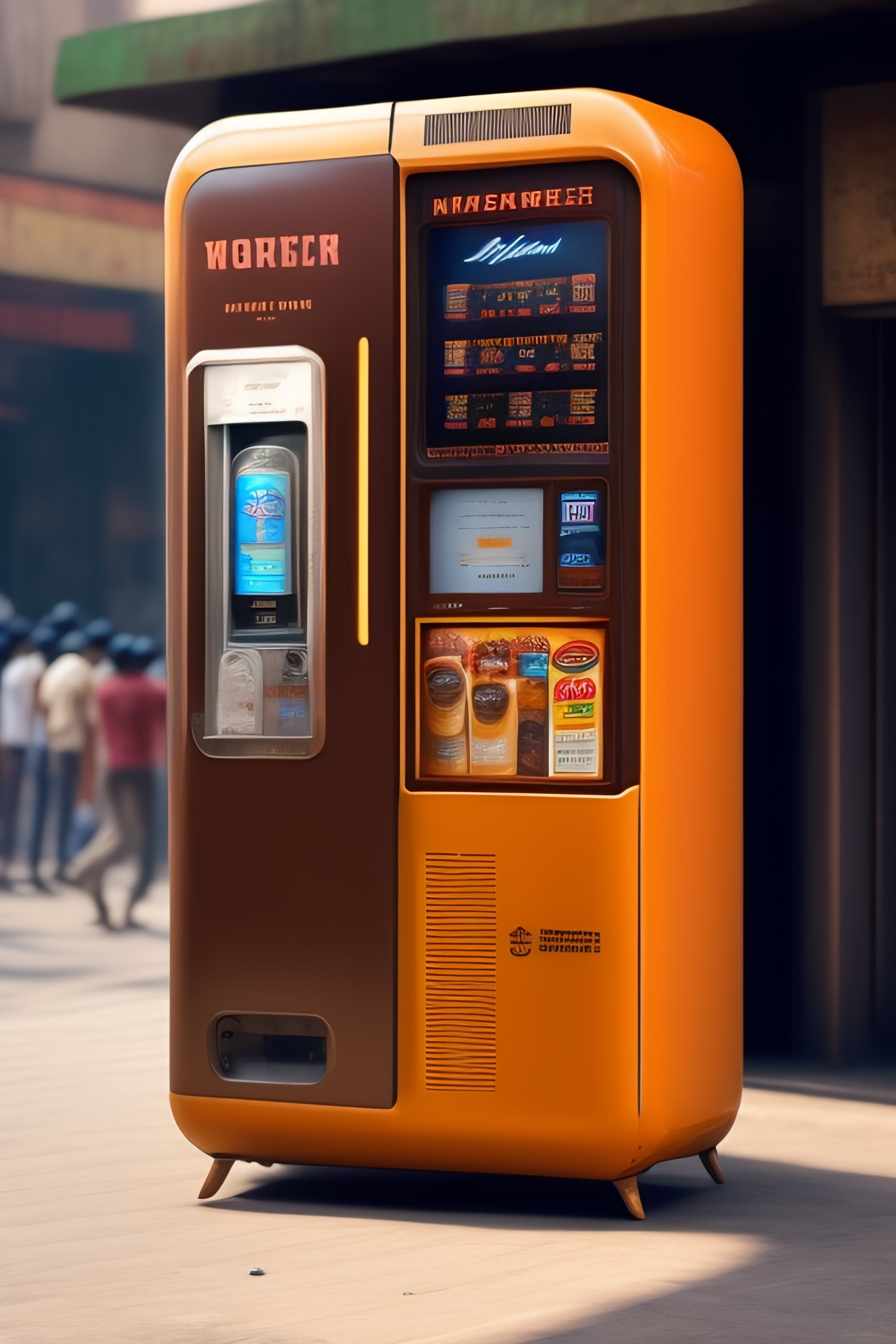 80s style, old and rusty, light brown coffee vending machine in the middle of busy mumbai, 2023, daytime