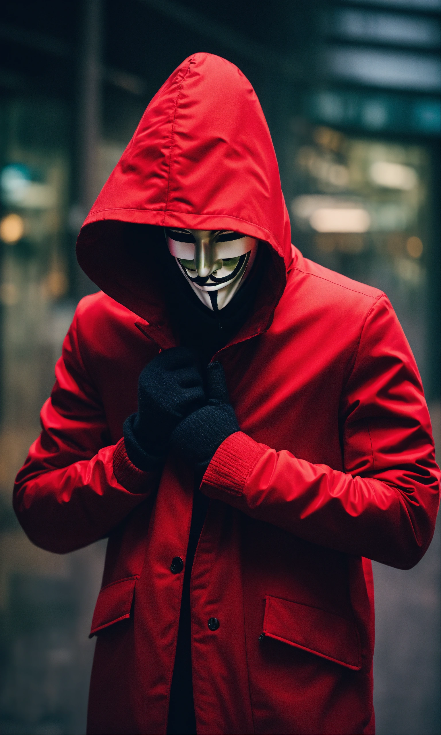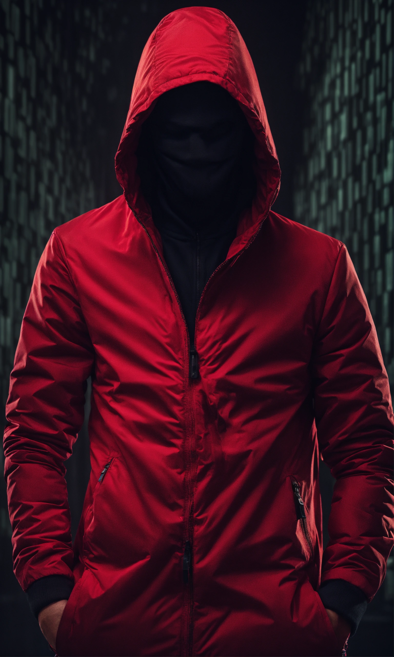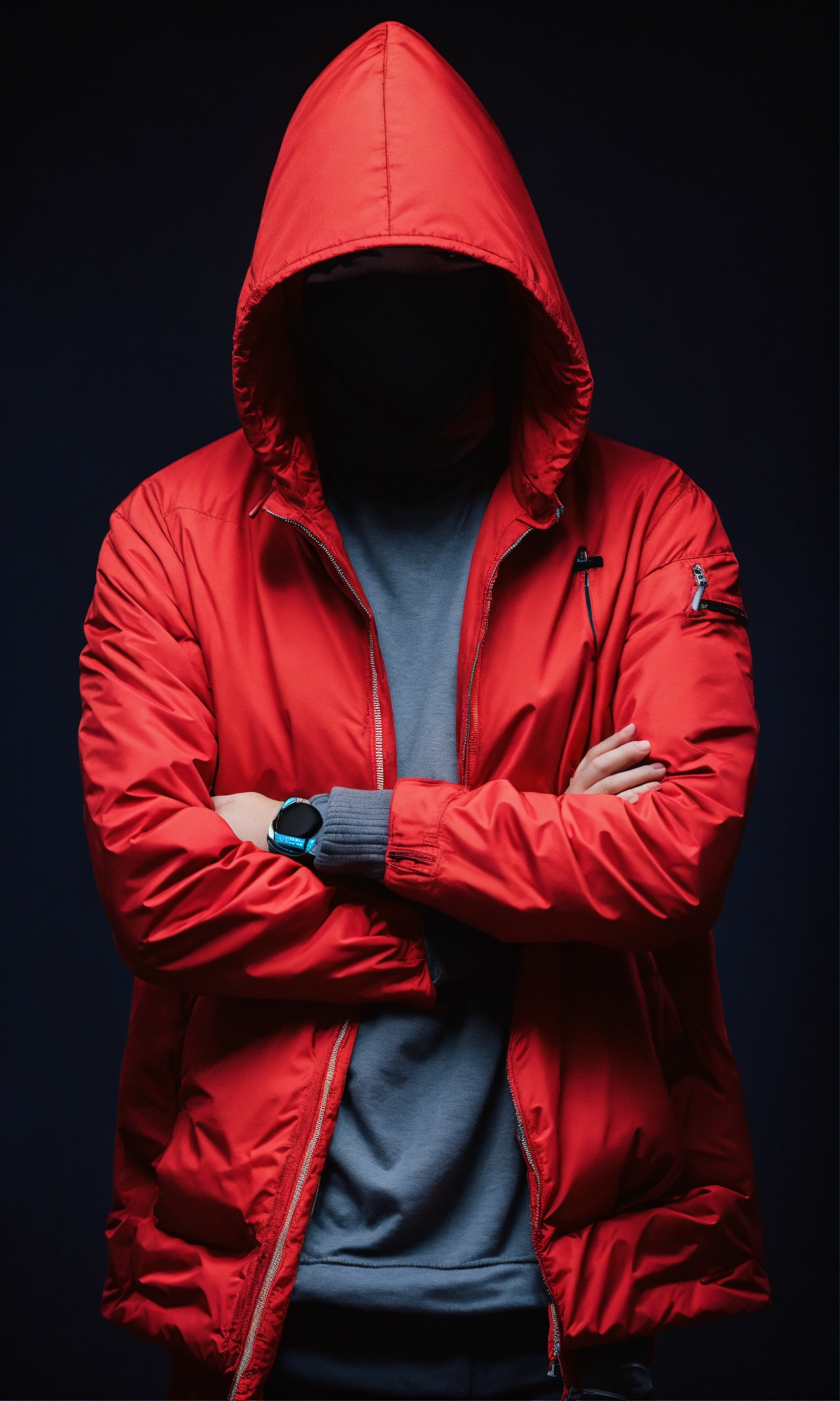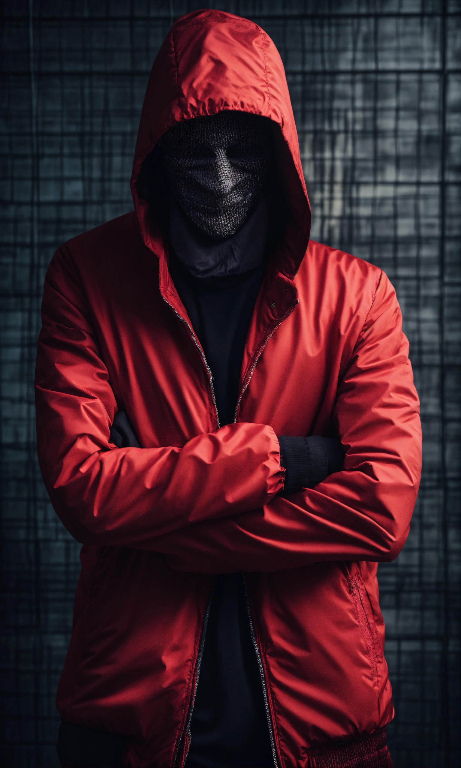 Anonymous hacker in red jacket with hidden face with arms crossed