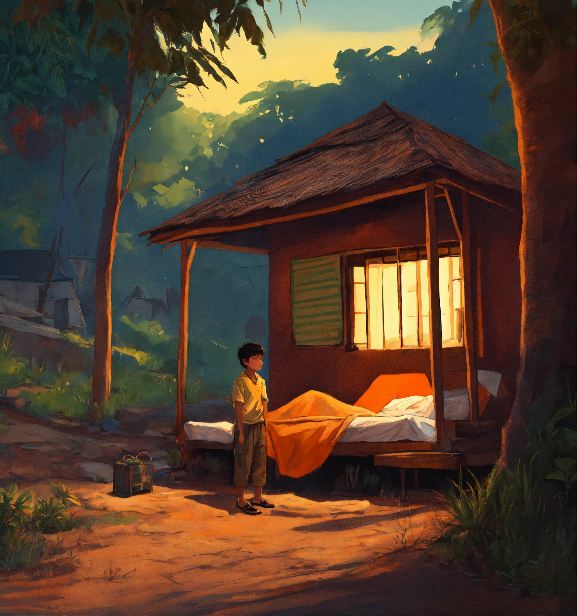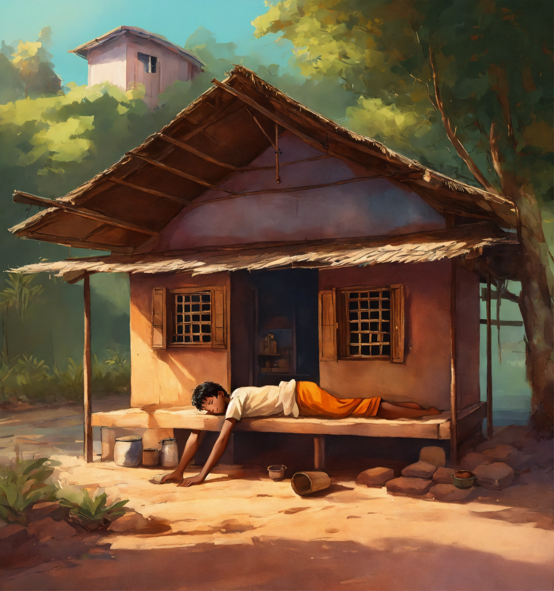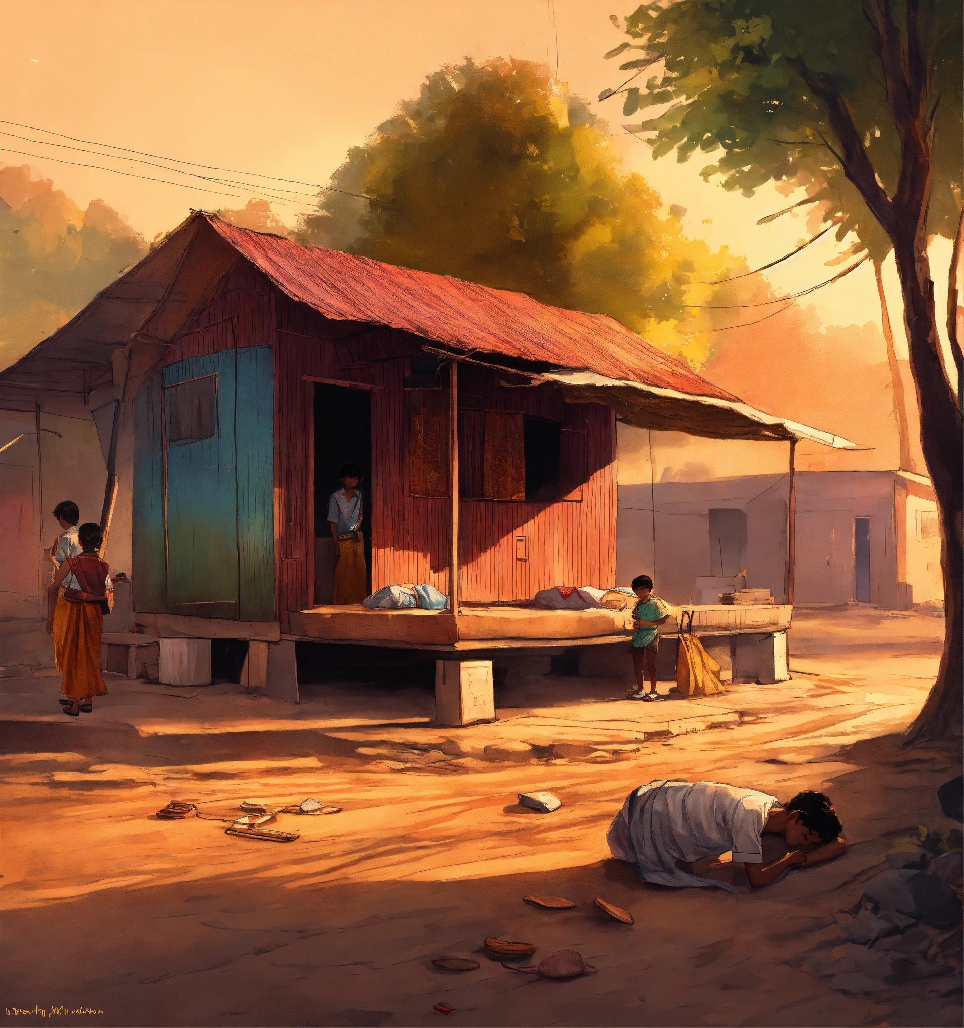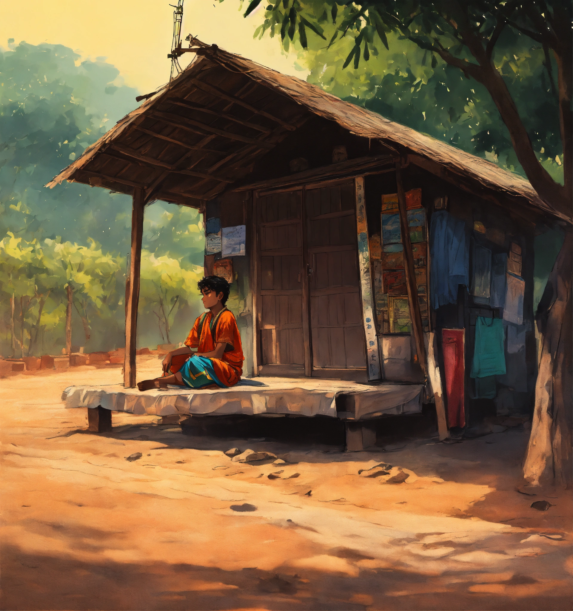 A hand drawn painting of a young indian boy sleeping under a cabin near a tiny, local hotel in rural india. it is morning and the sun is yet to come out, there is one street lamp on the road next to the hotel which is in the middle of a tiny local market. this is in 1980s india. 8k, wide-angle, sharp, highly detailed, vibrant, vivid.