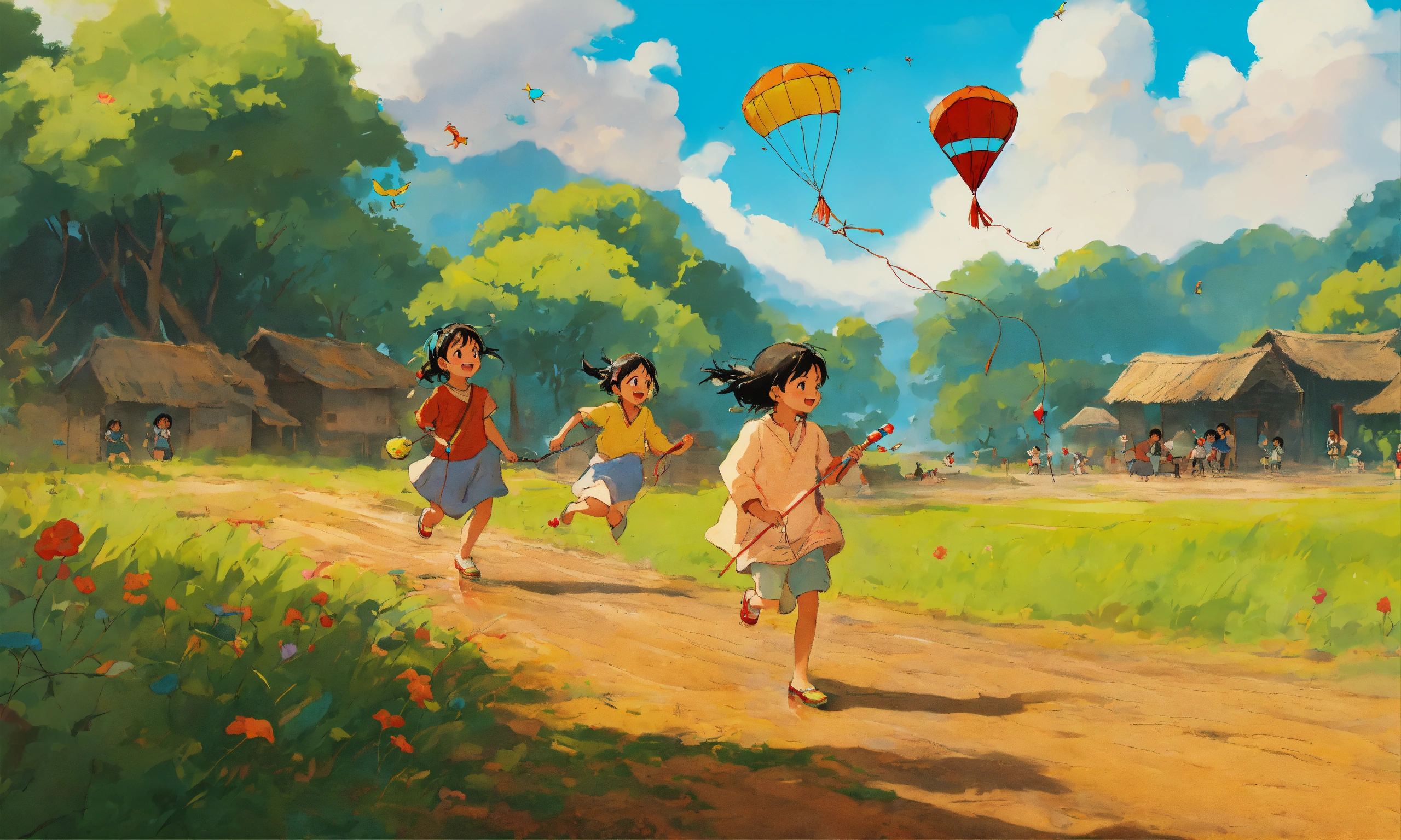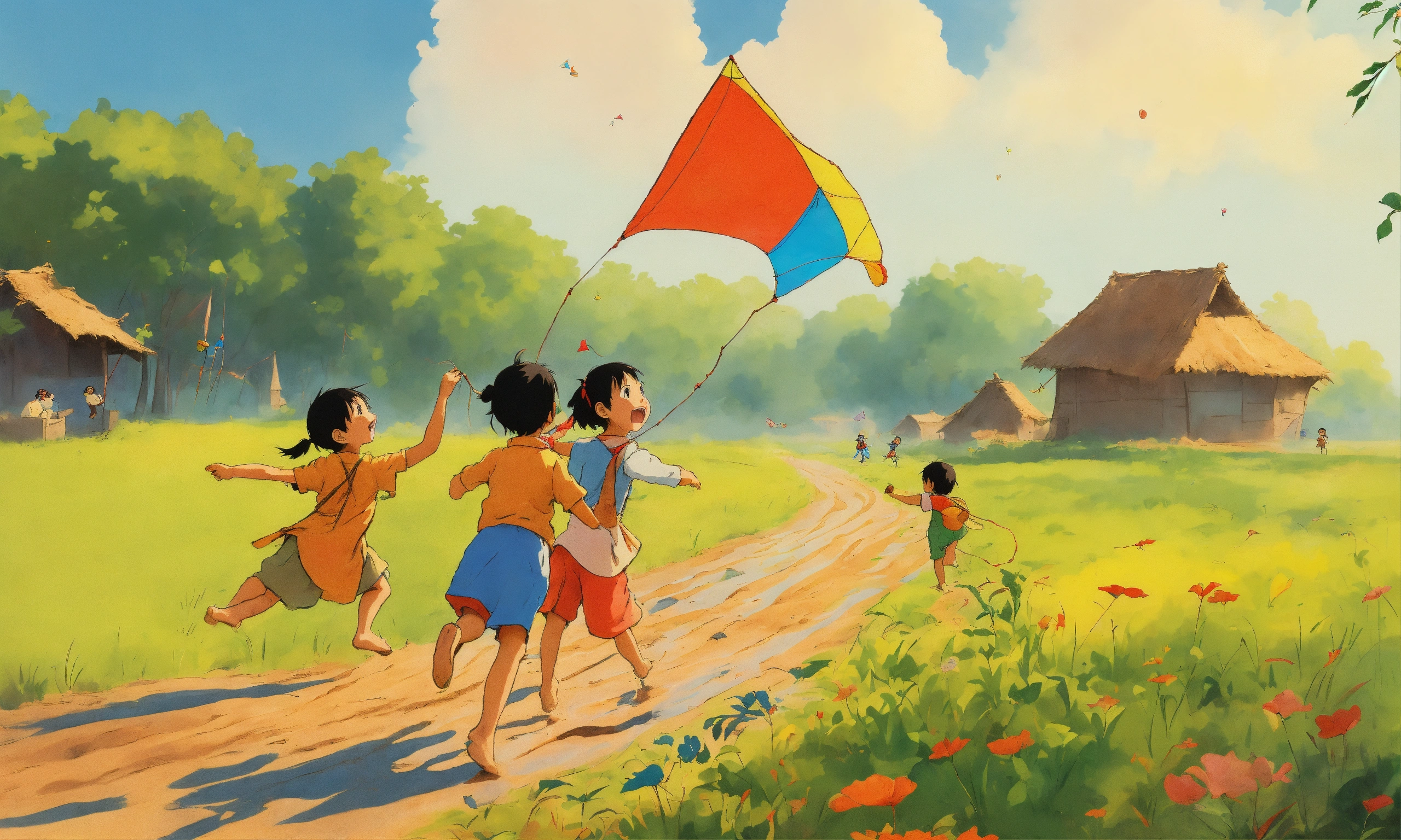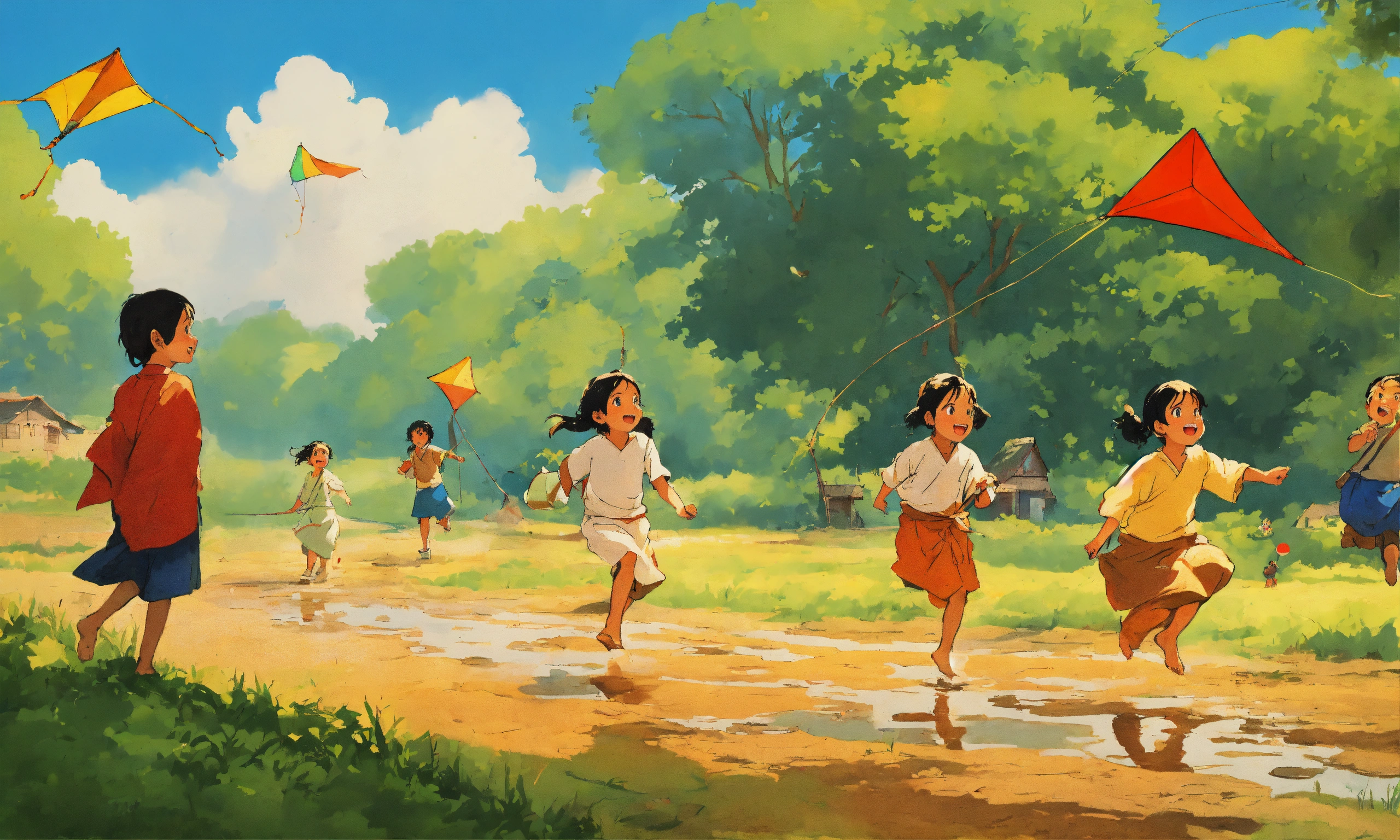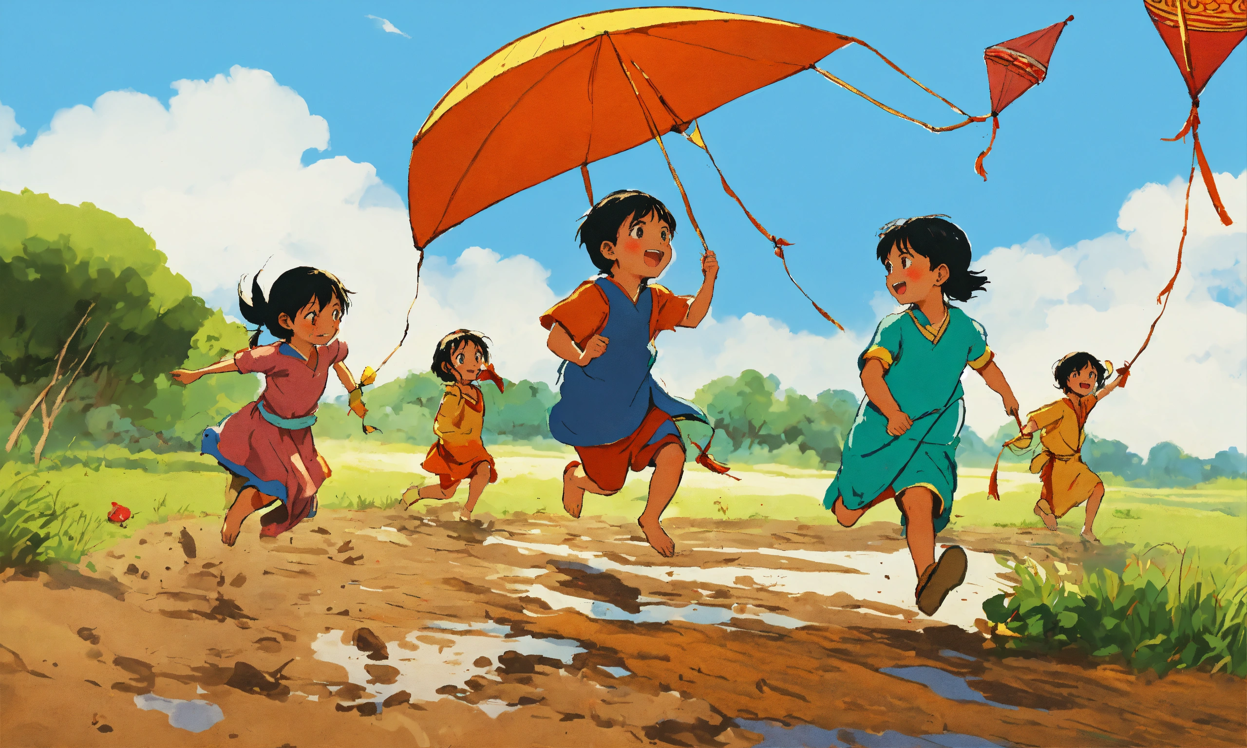 Examples of indian culture for children, happy children playing hopskotch in the mud, children flying kites, style of hayao miyazaki, cartoon, simple, childrens book, primary colors