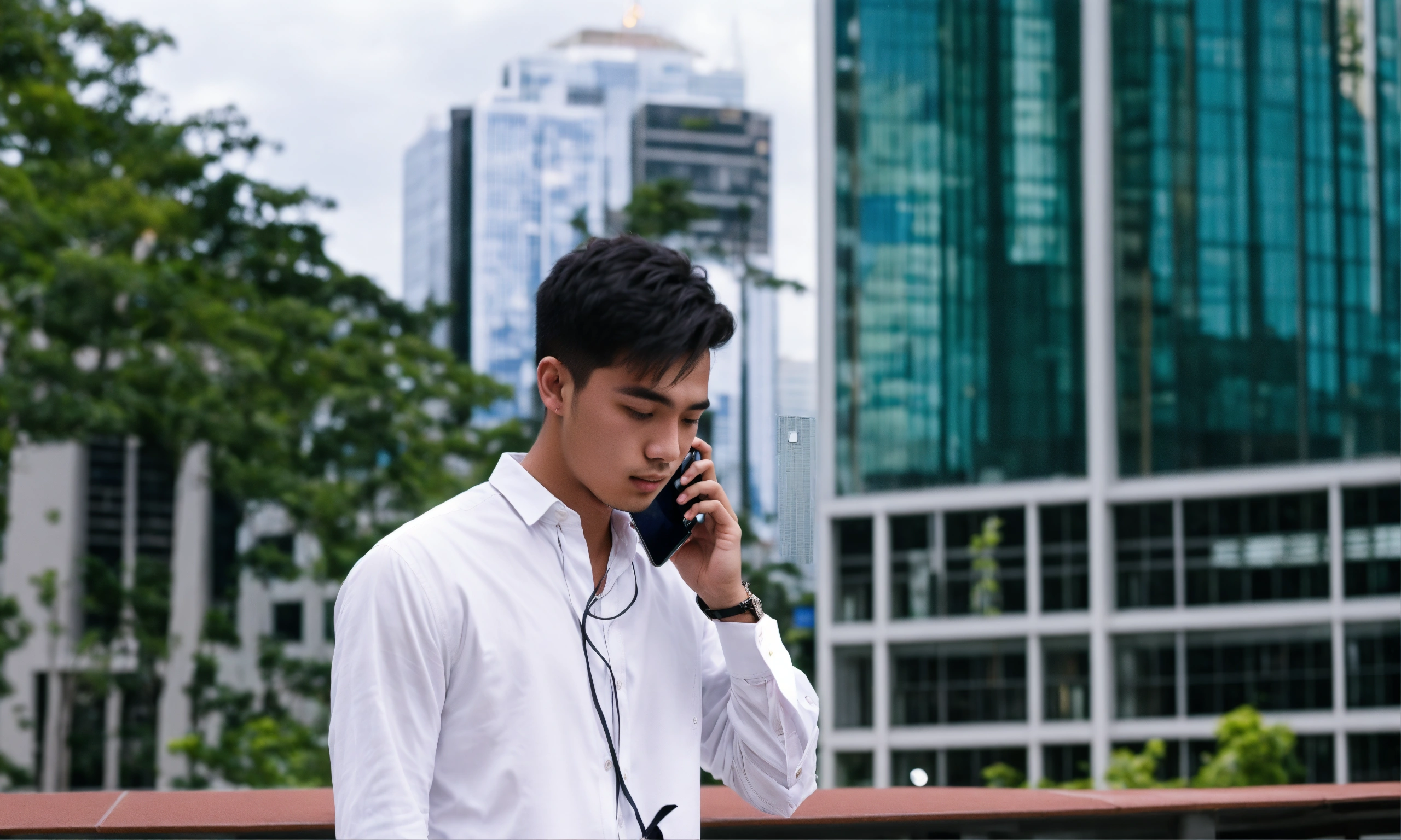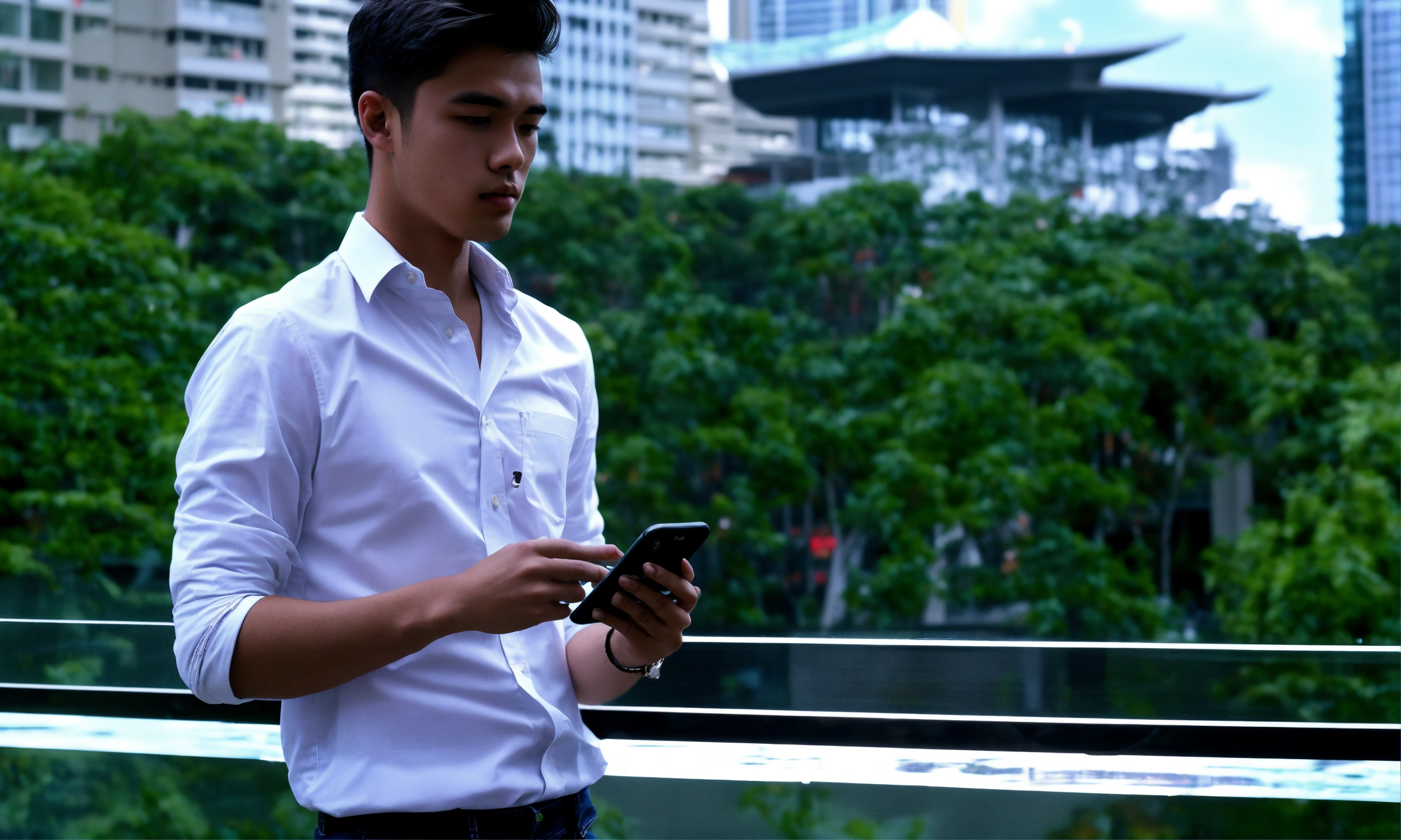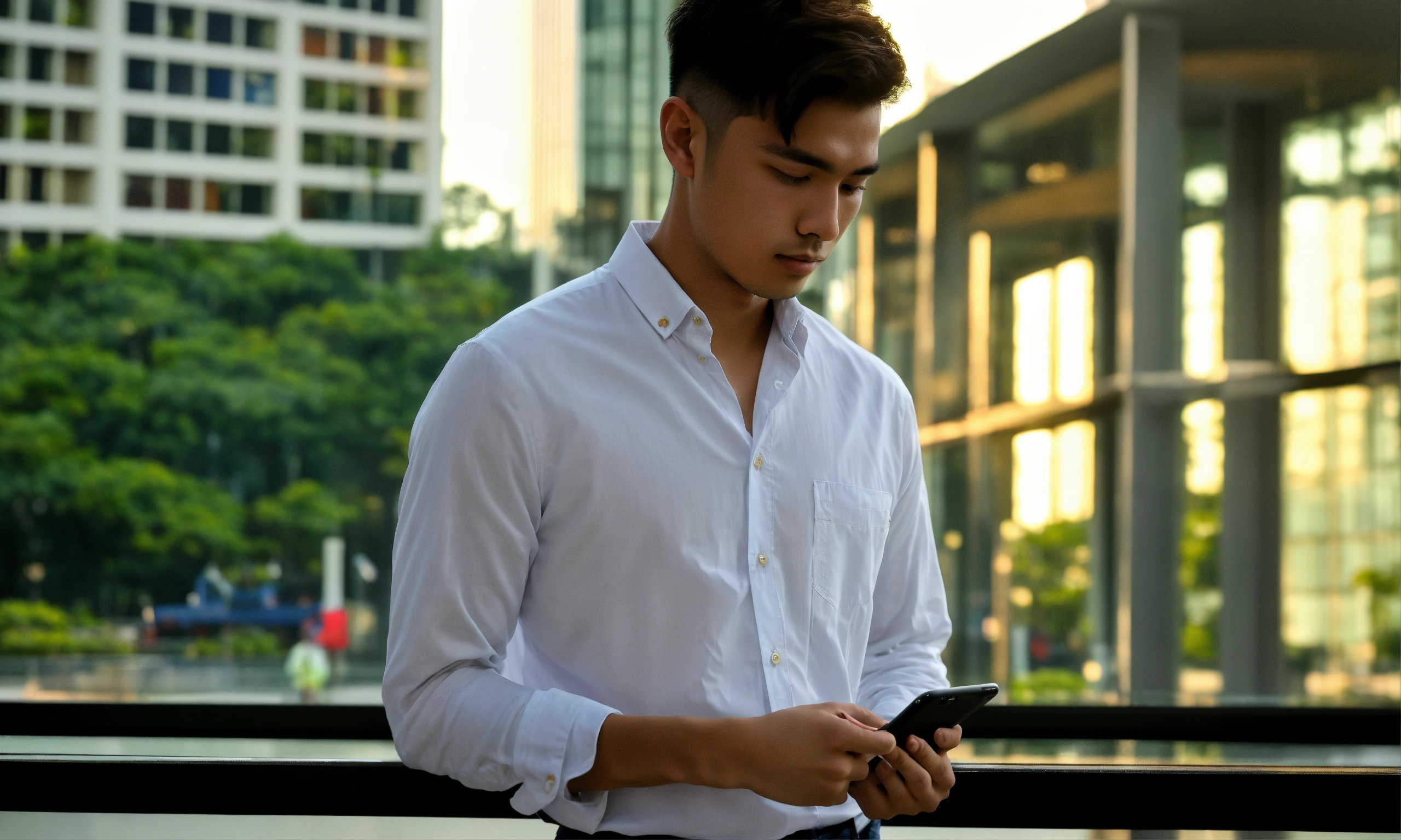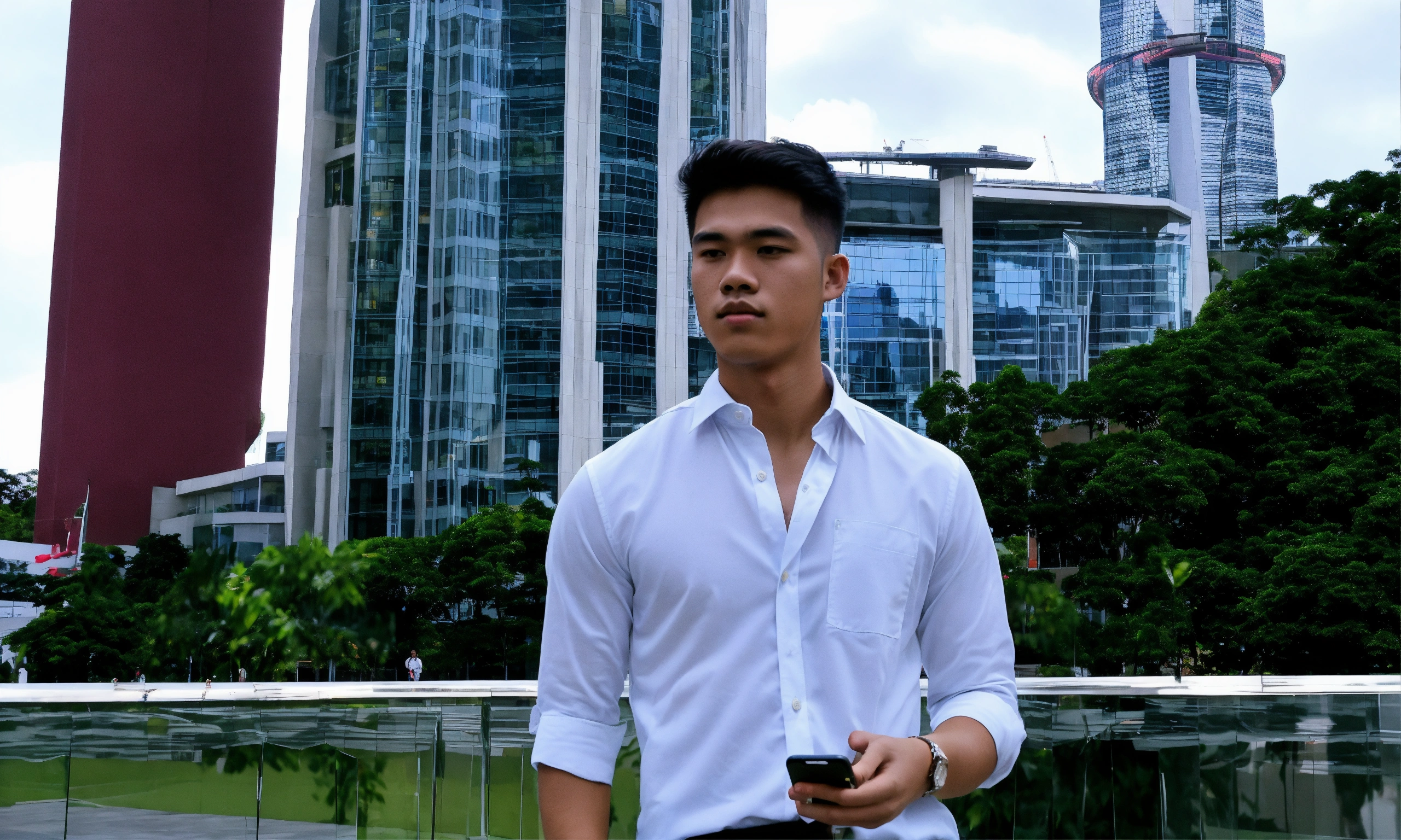 A 21 year old handsome man, in a long white button down shirt, sleeves slightly rolled up, black jeans, against the background of singapore management university (glass buildings) as the background, there are other students there as well. he is standing up, holding on his phone and looking at it.
