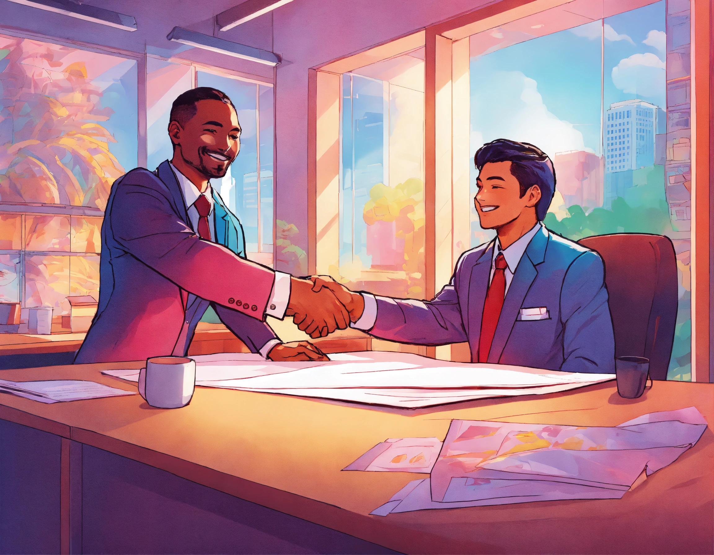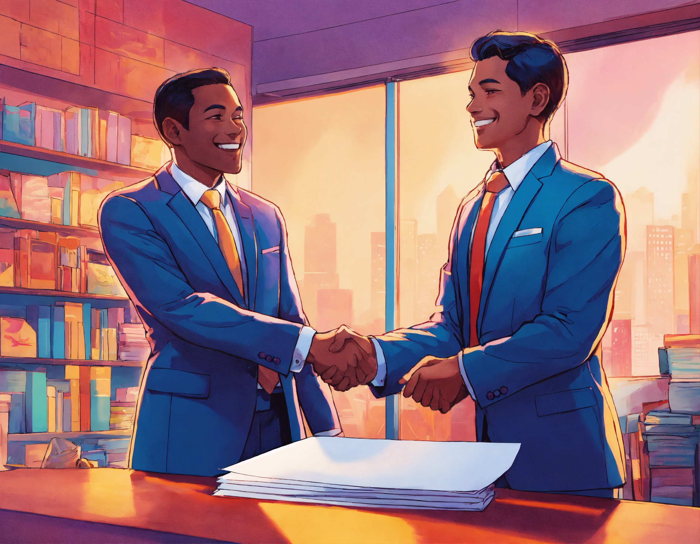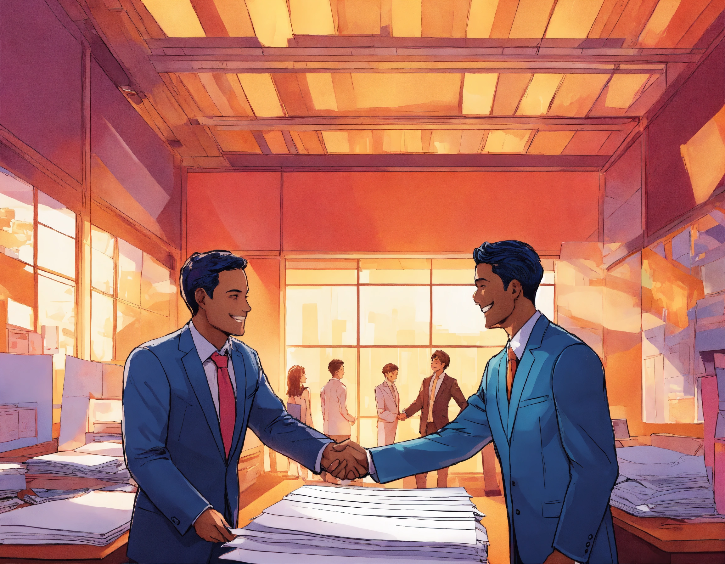 2 workers wearing suits shaking hands, behind workers holding sheets of paper, smiling, indonesian faces, indoor background in office, dramatic light, storybook illustration, 8k, by lisa frank
