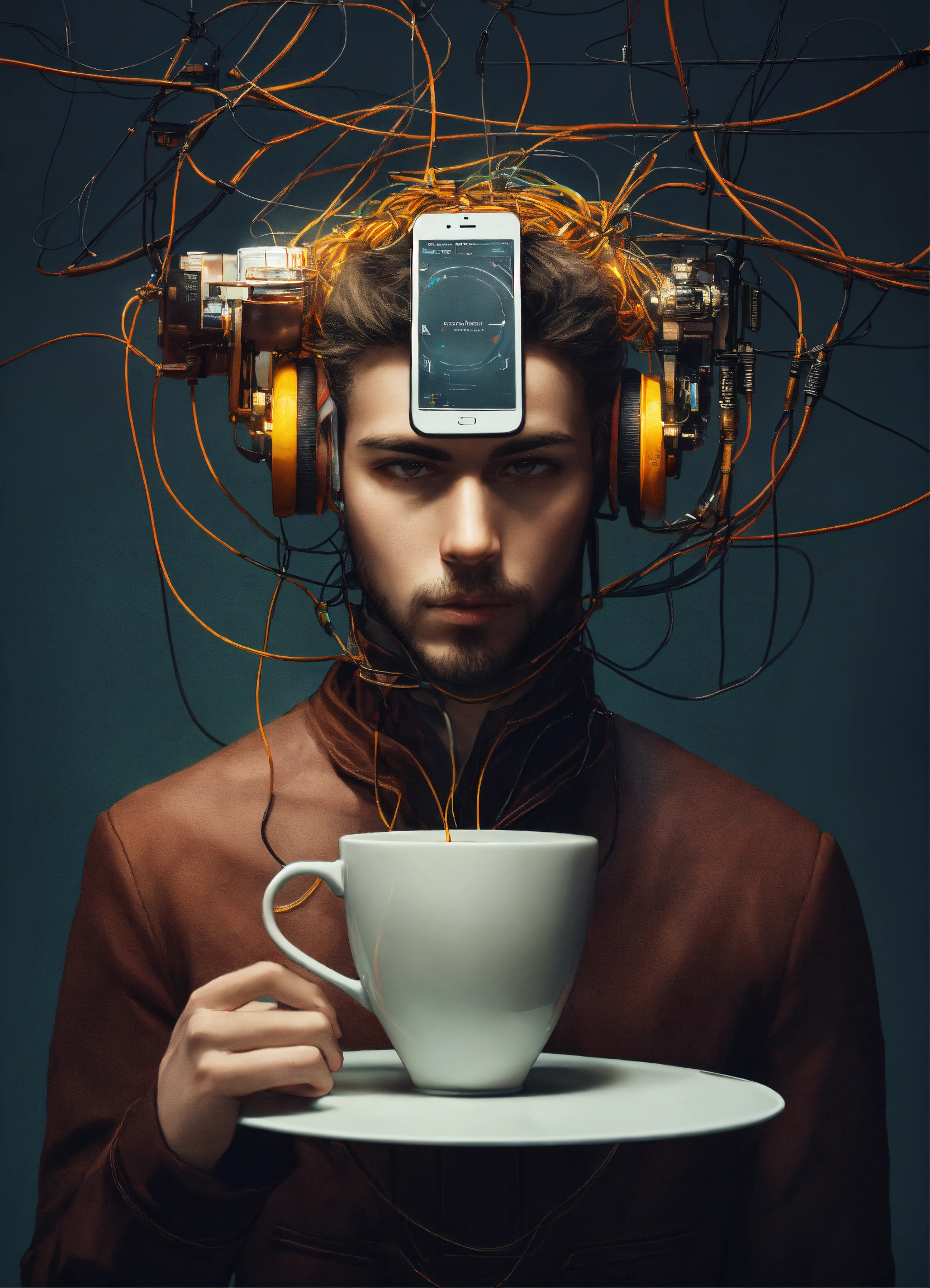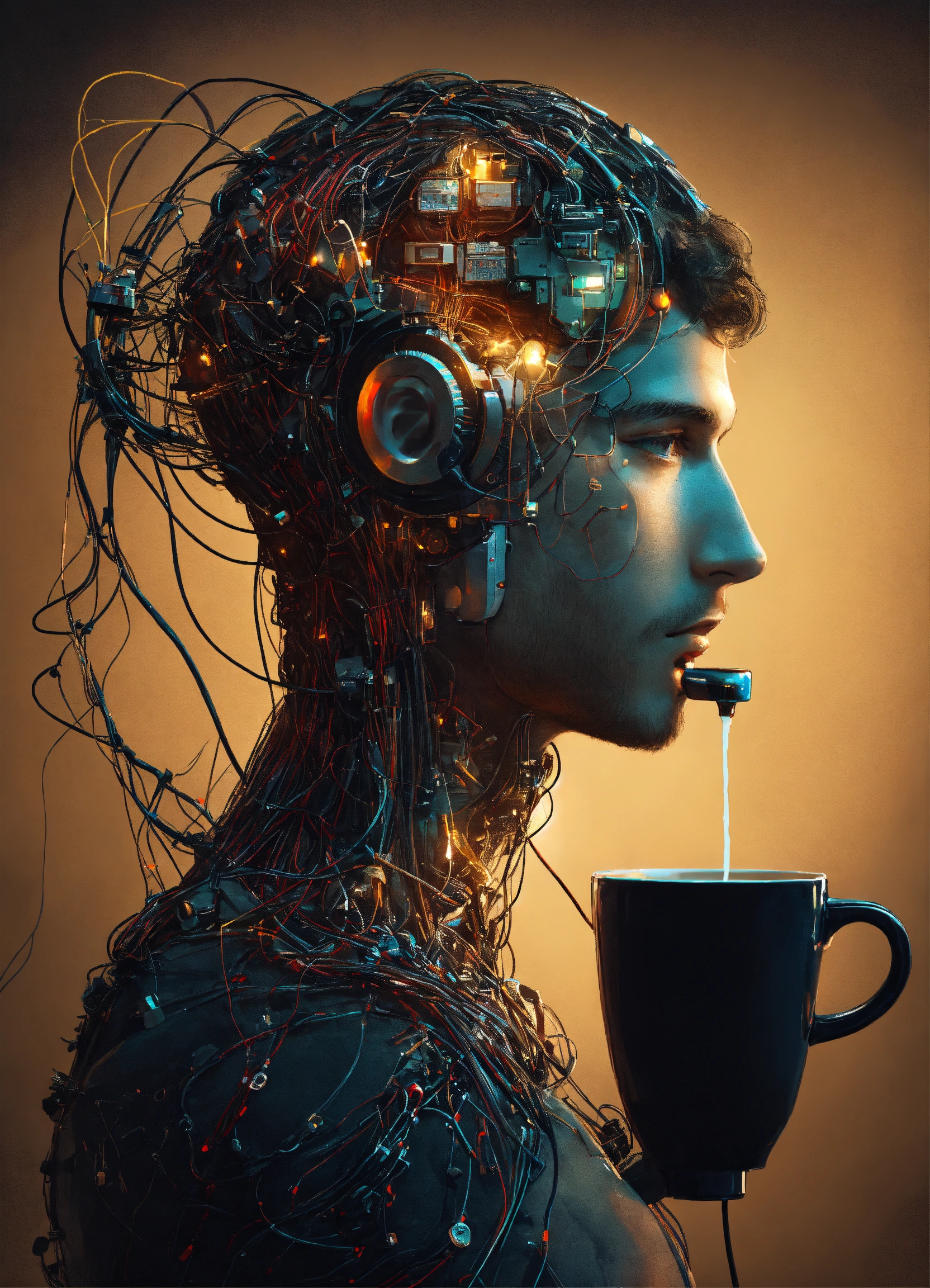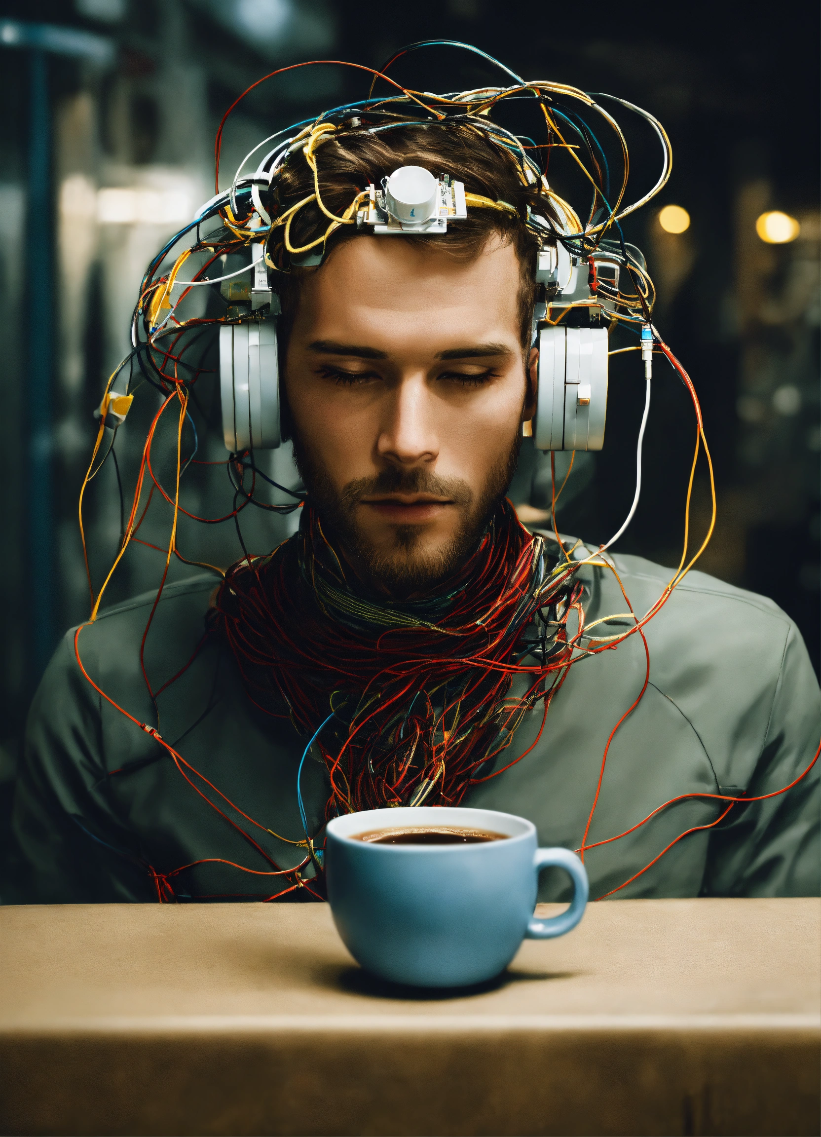 A cup of coffee connected to man's head while he drink the coffee, with full of cable and wire, futuristic