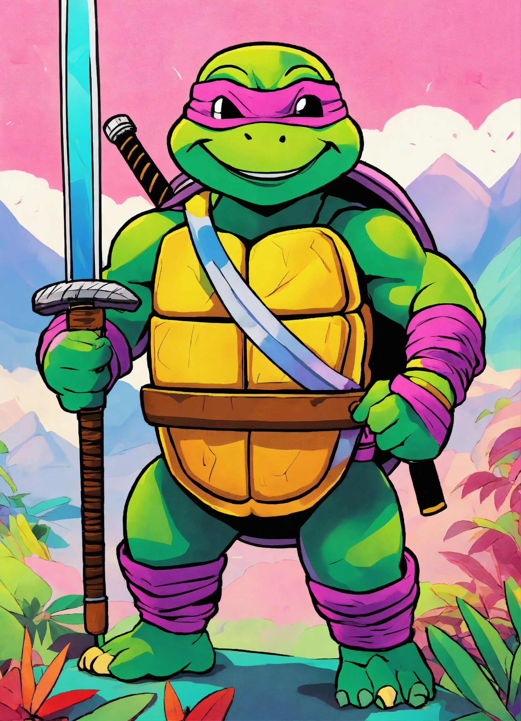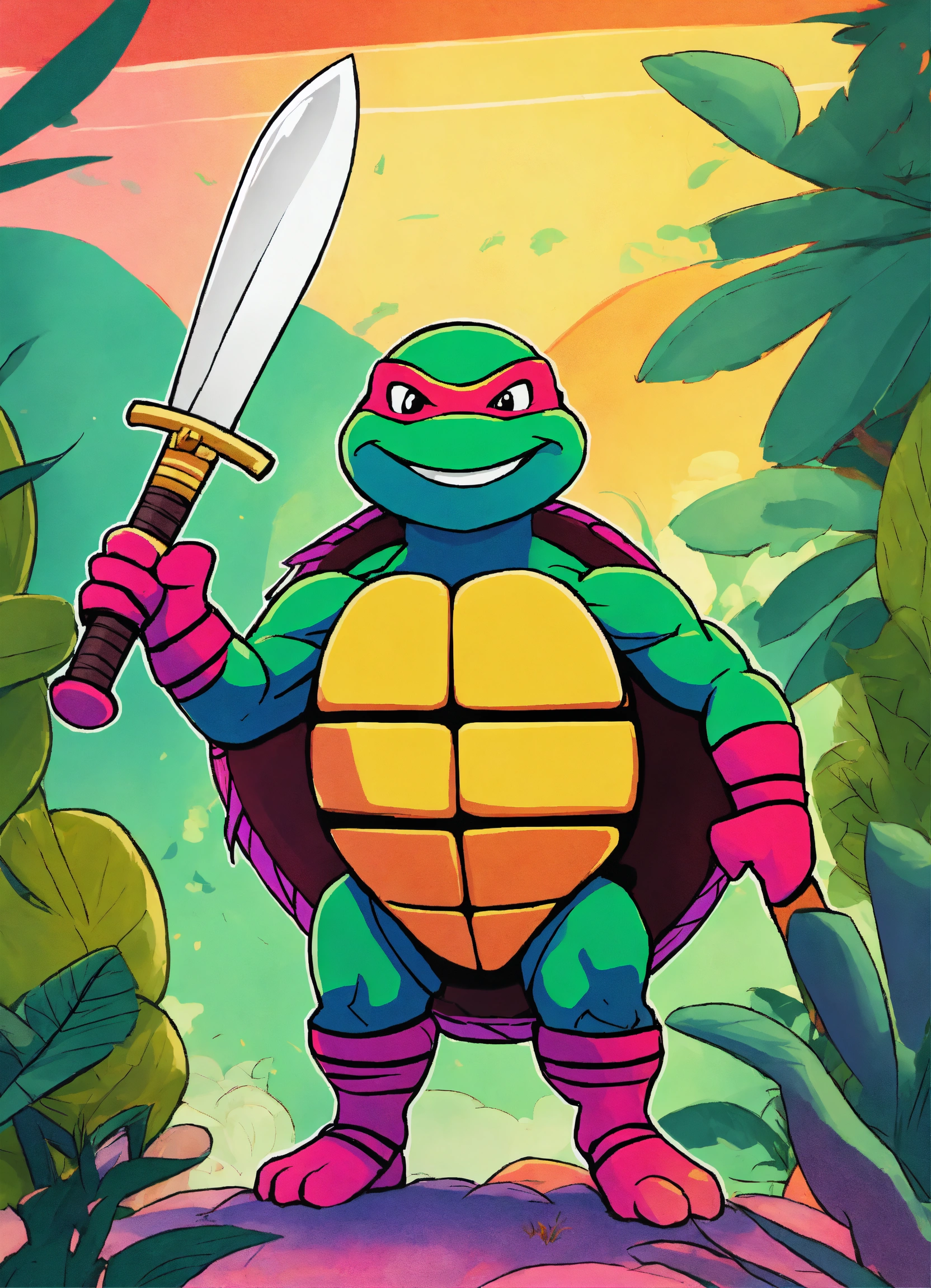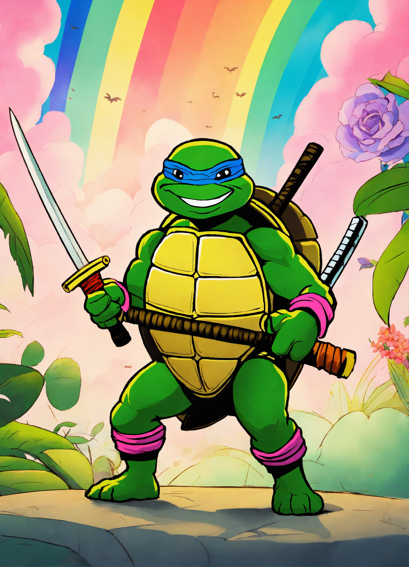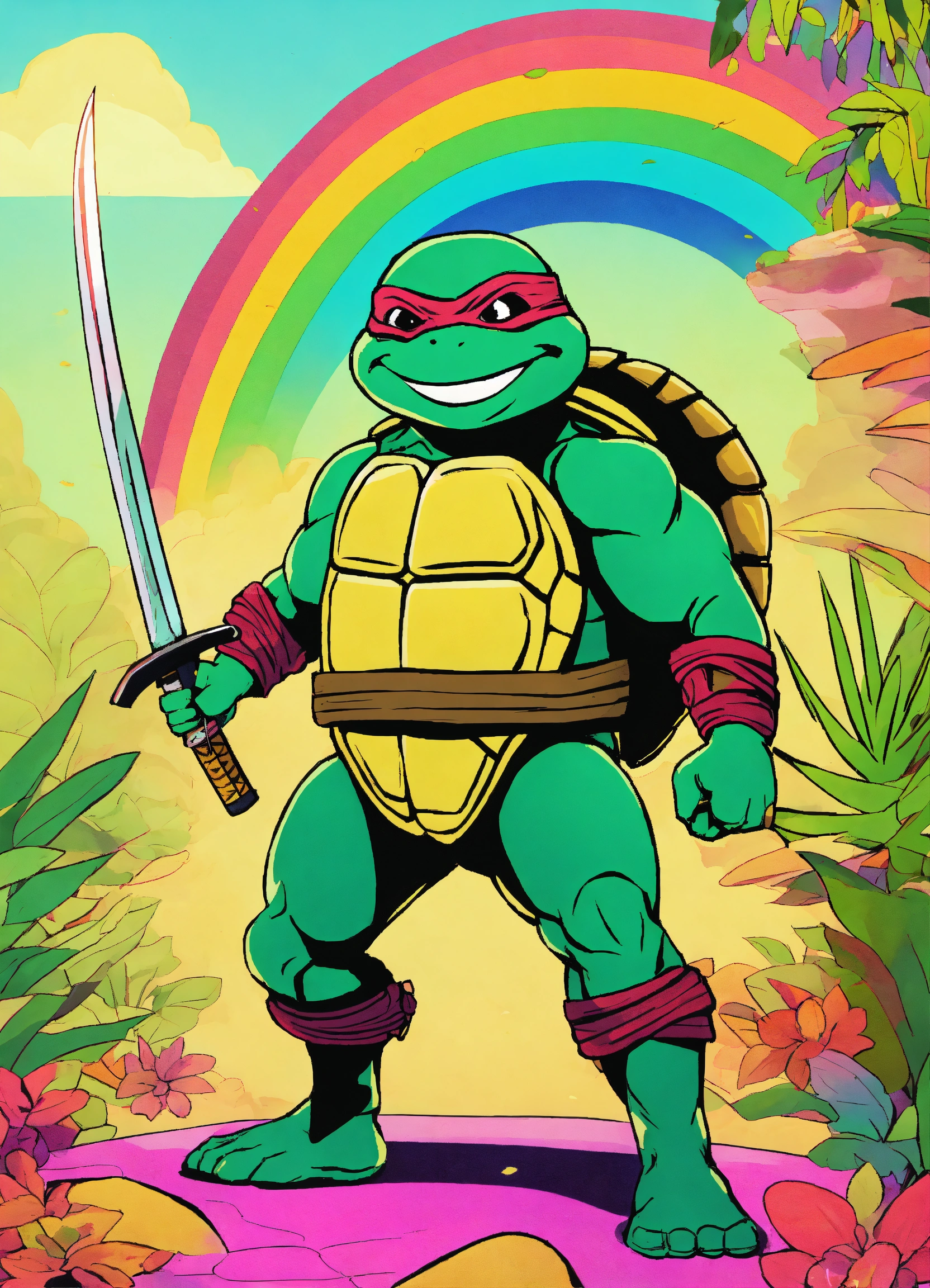 A smiley ninja turtle with a katana in the hand and a pastel rainbow jungle background