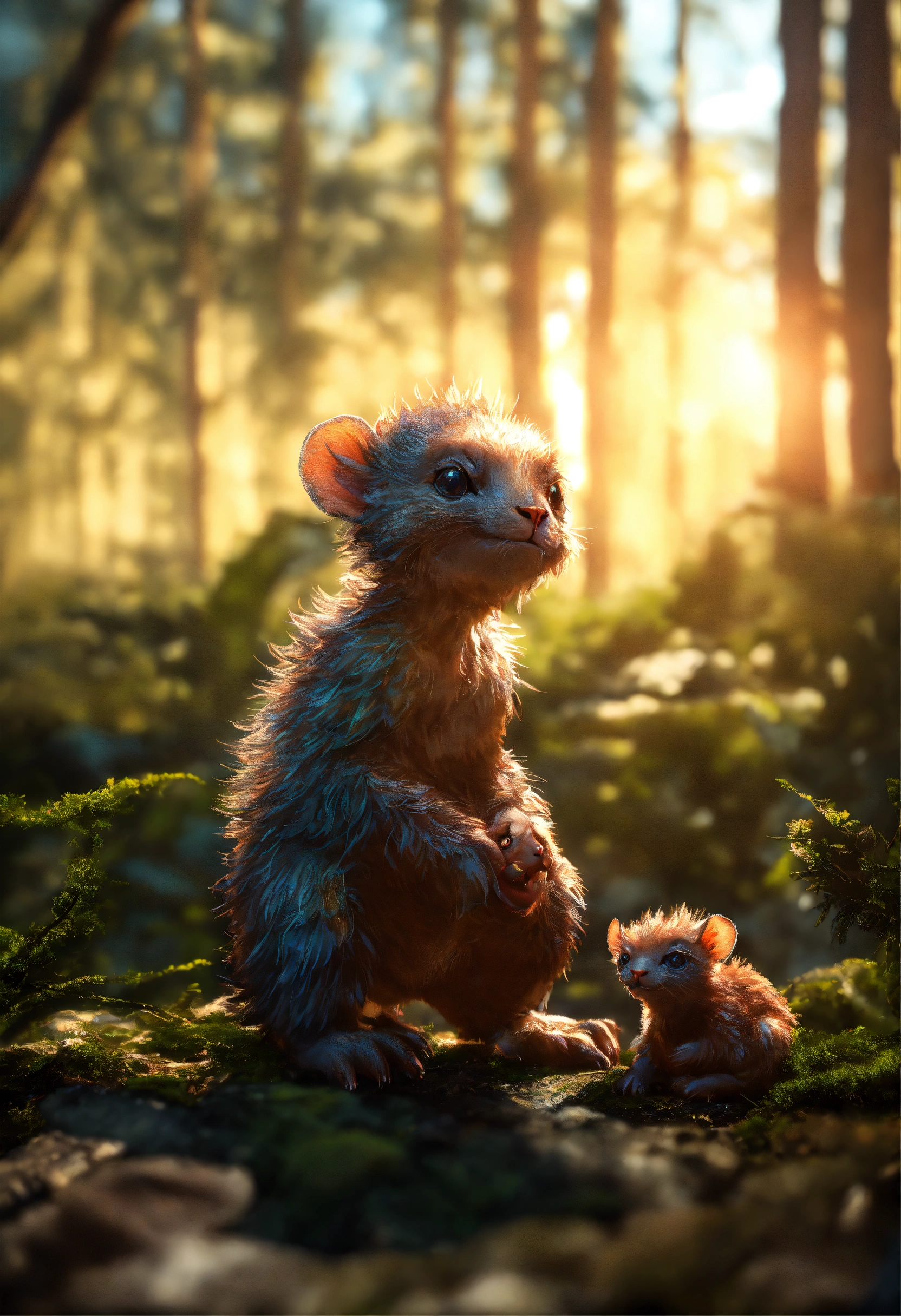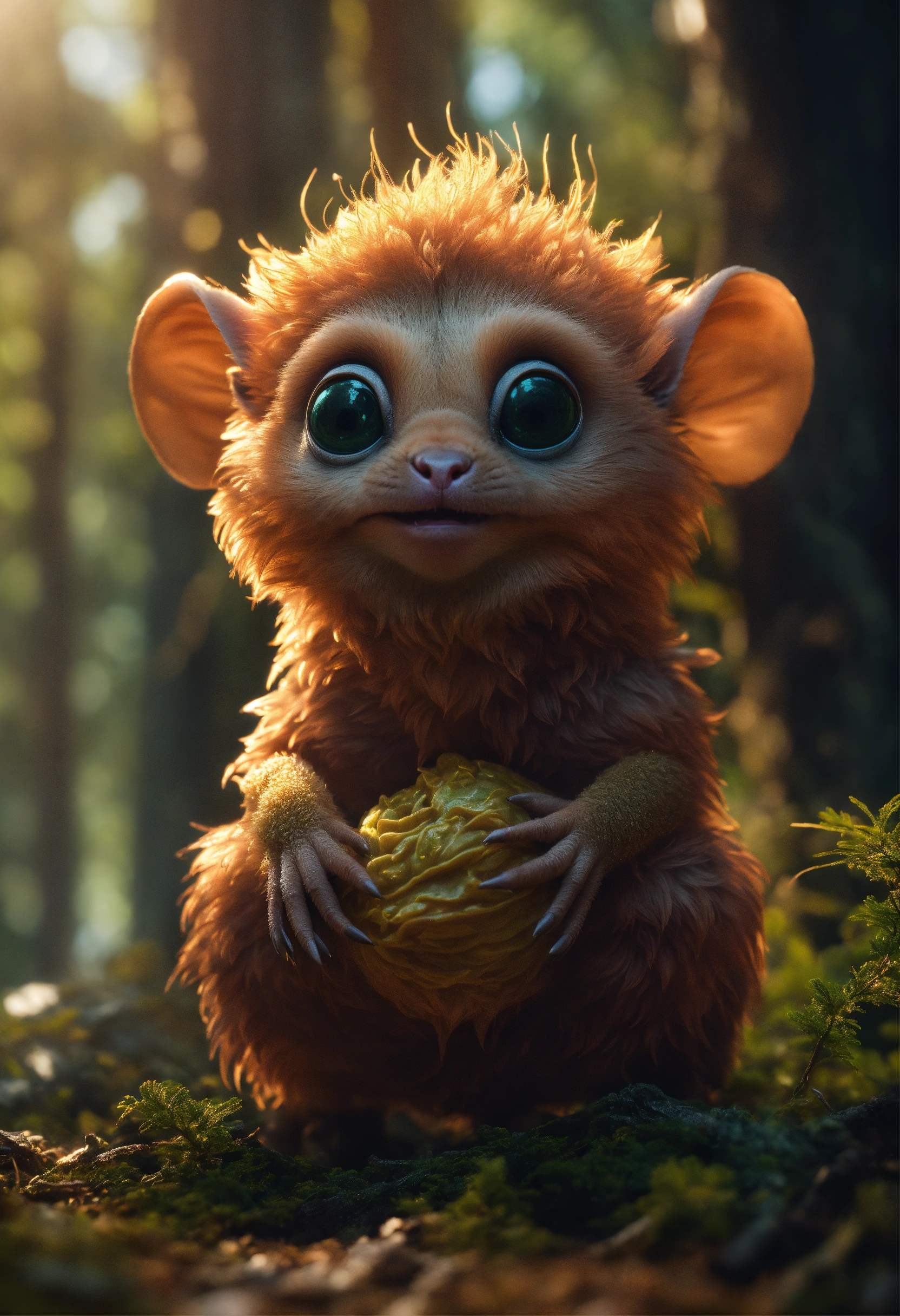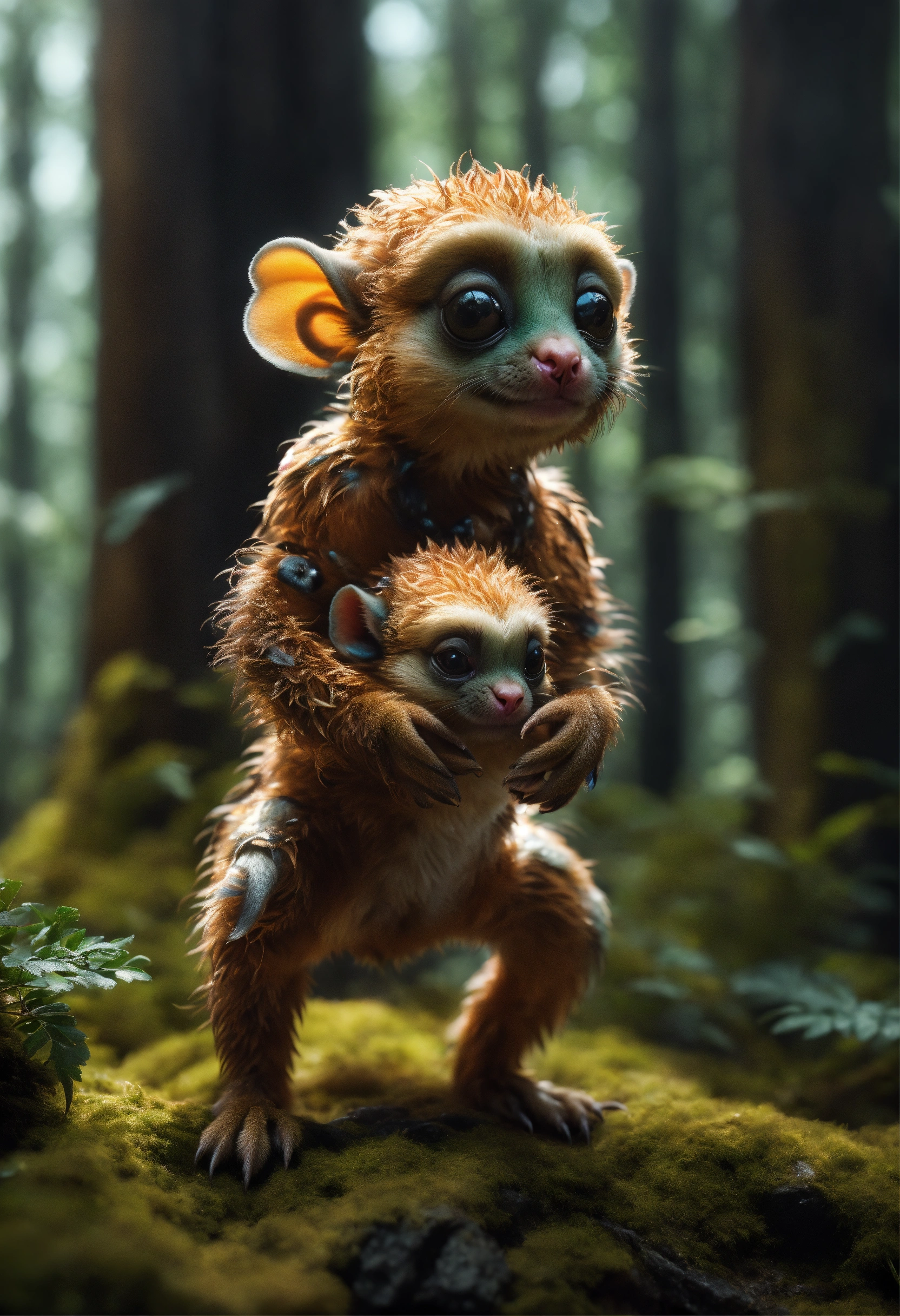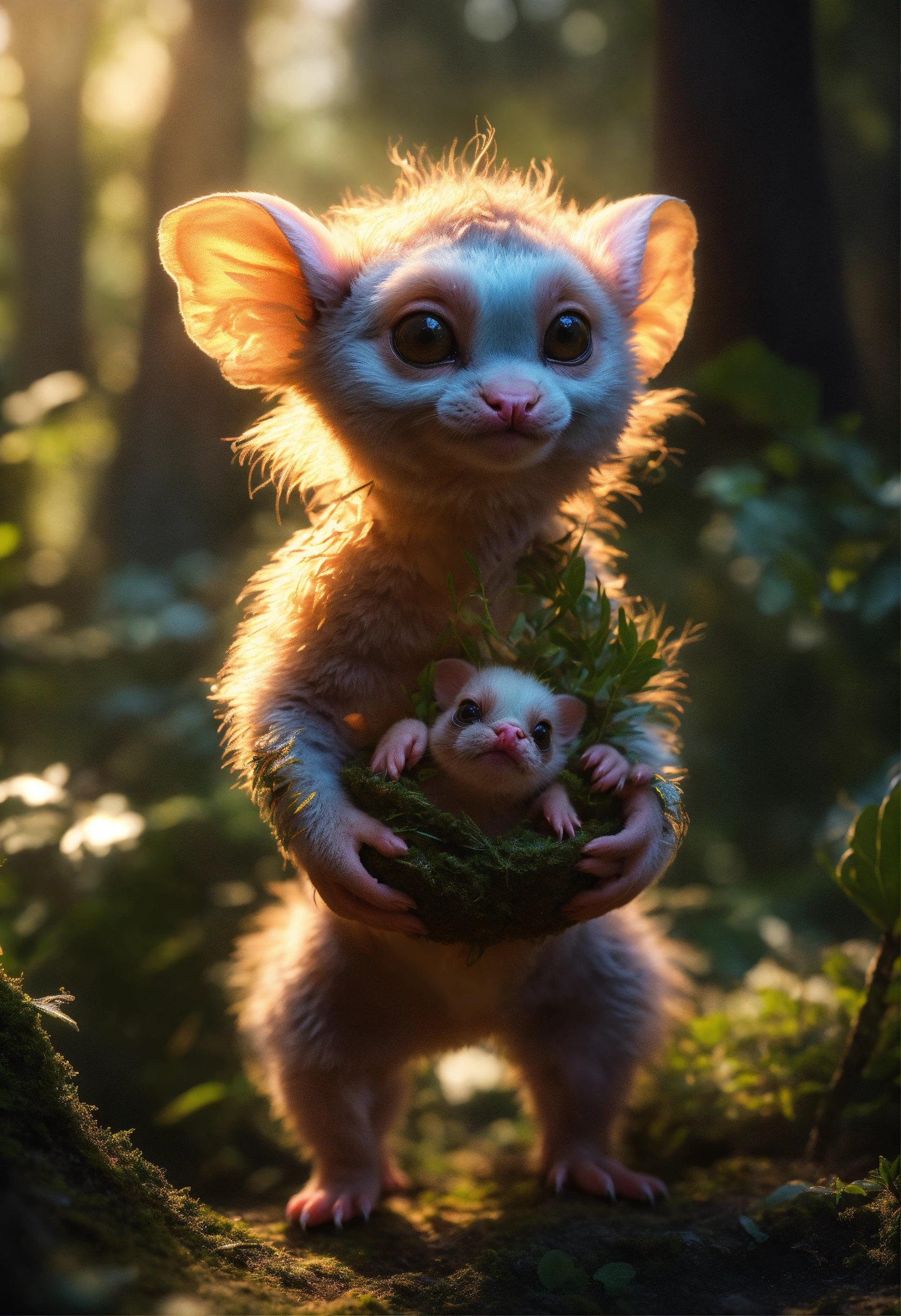 Medium shot, "extremely ultrarealistic photorealistic cute little ugliest creature holding its own baby professional photography, natural lighting, volumetric lighting maximalist photo illustration 8k resolution concept art intricately detailed, complex, elegant, expansive, fantastical", moody lighting, best quality, full body portrait, real picture, intricate details, depth of field, in a forest, fujifilm xt3, outdoors, bright day, beautiful lighting, raw photo, 8k uhd, film grain, unreal engine 5, ray tracing