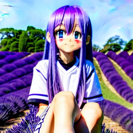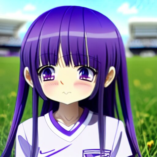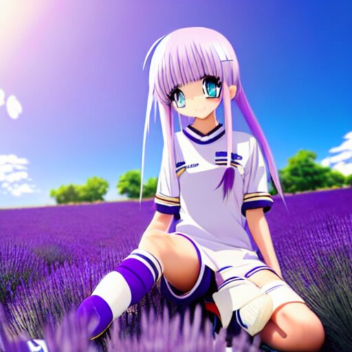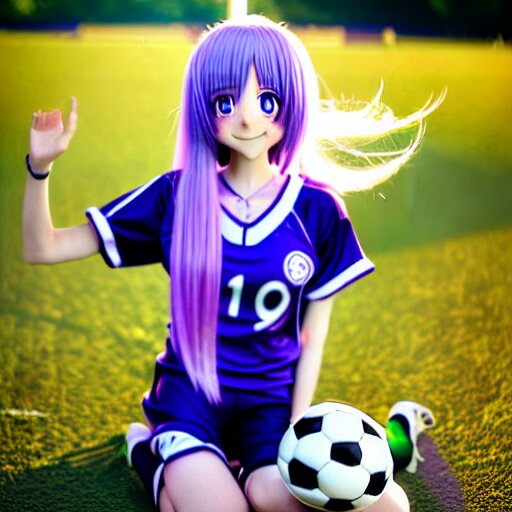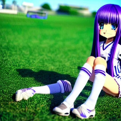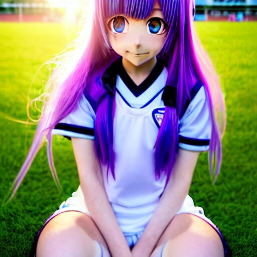 A cute young real life 3d anime girl with long blueish lavender hair, wearing a white soccer uniform with shorts, soccer ball against her foot, sitting on one knee in a large grassy green field, shining golden hour, she has detailed black and purple anime eyes, extremely detailed cute anime girl face, she is happy, child like, kid, black anime pupils in her eyes, haruhi suzumiya, umineko, lucky star, k-on, kyoto animation, she is smiling and happy, tons of details, sitting on one knee on the grass, chibi style, extremely cute, she is smiling and excited, her tiny hands are on her thighs, she has a cute expressive face