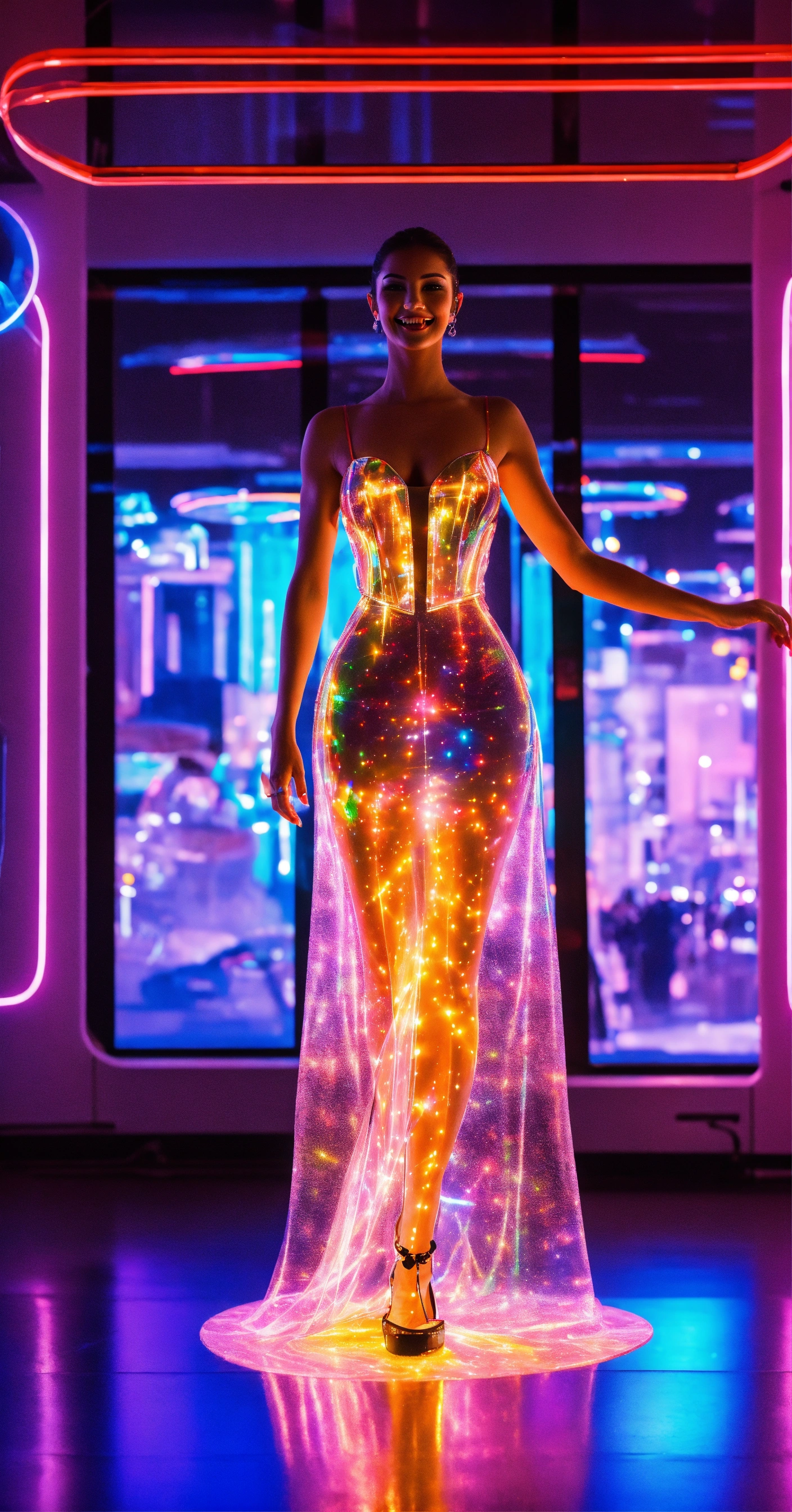 Futuristic tesla and bmw oil glass and chrome city filled, with holographic projections of, very tall glass banners with very beautiful brazilian model next to a female cyborg, with large muscles made from bmw glass in a glass dress made from neon smoke smiling while smelling a line of baking soda from a glass table, iredescent reflections, 8k 16k 32k very real lights, glass dress made from tiny lights and neon smoke glasses