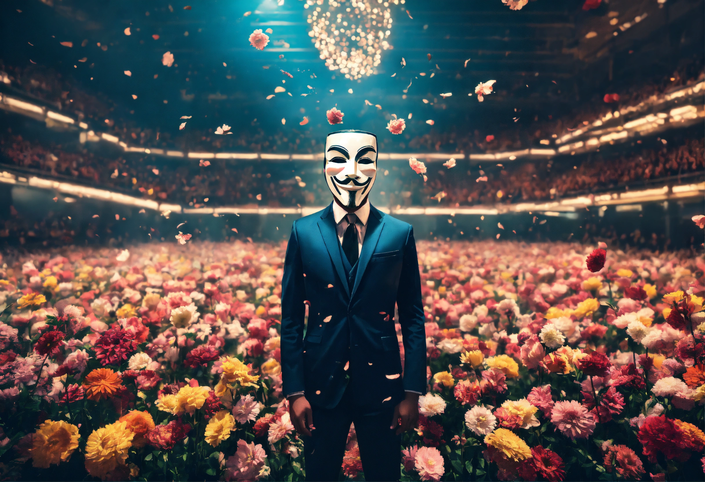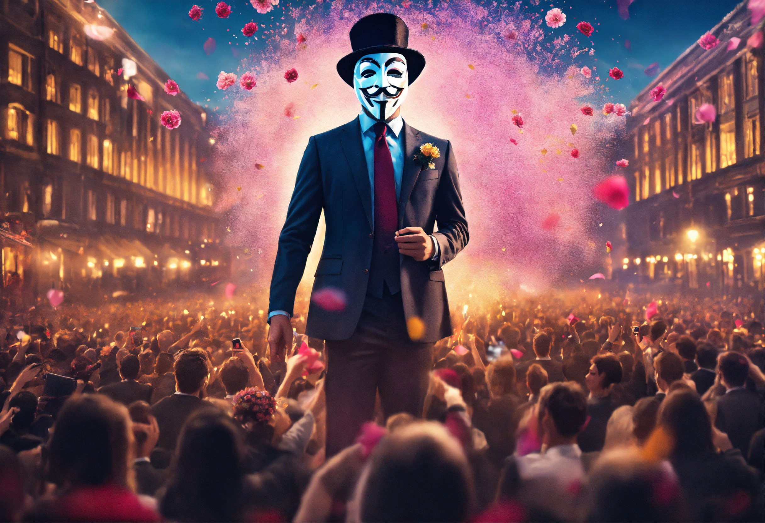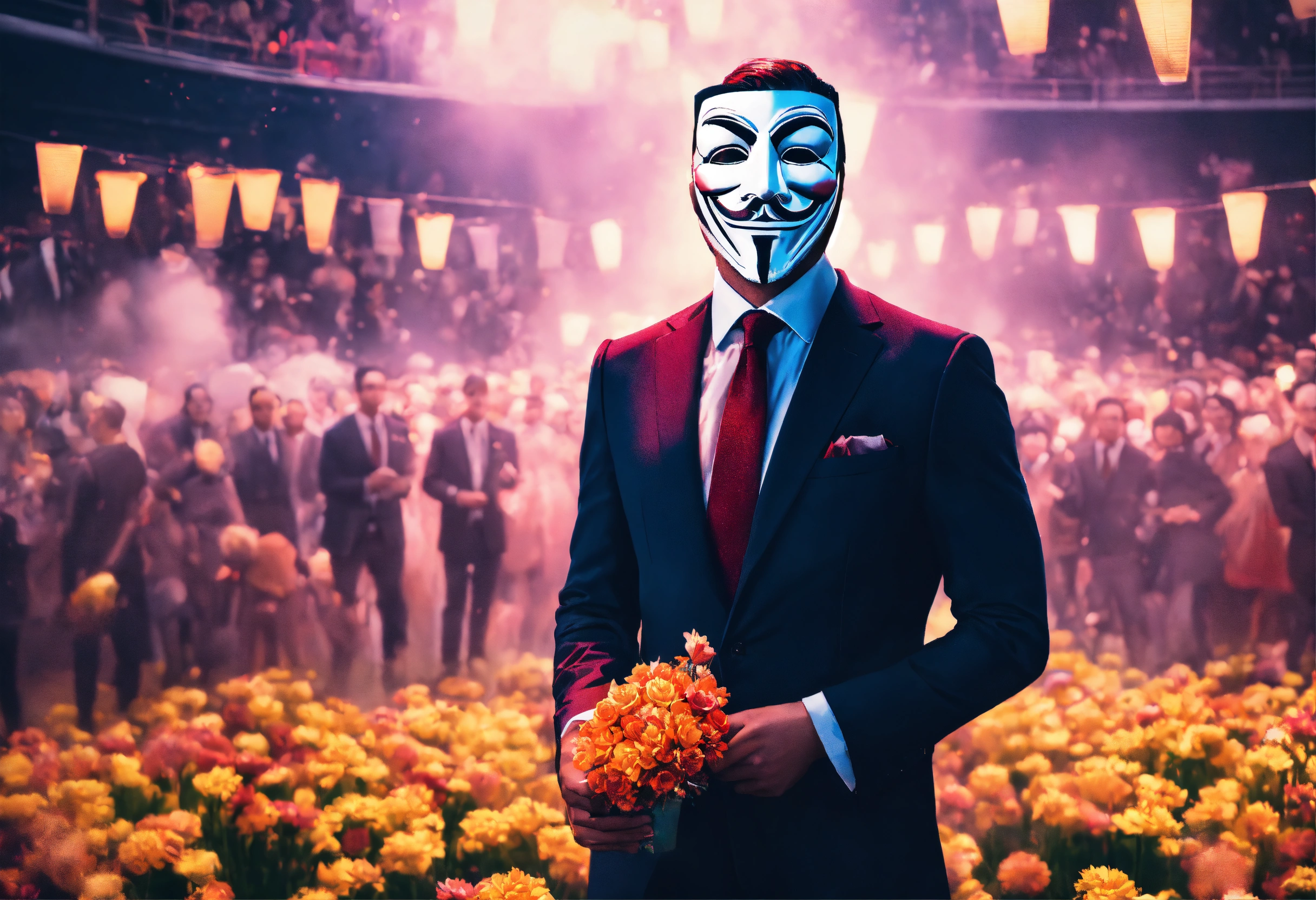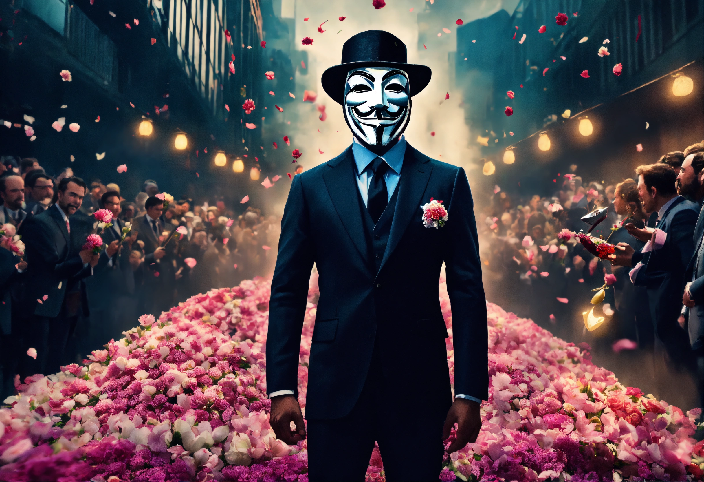 A businessman in a suit wearing a guy fawkes mask and performing in front of a large crowd, throwing flowers in the air, 4k, aubrey powell, vintage photo, reflection, beautiful cinematography, surreal, film grain, hype, with detailed background and relevant 8k ultra realistic neon