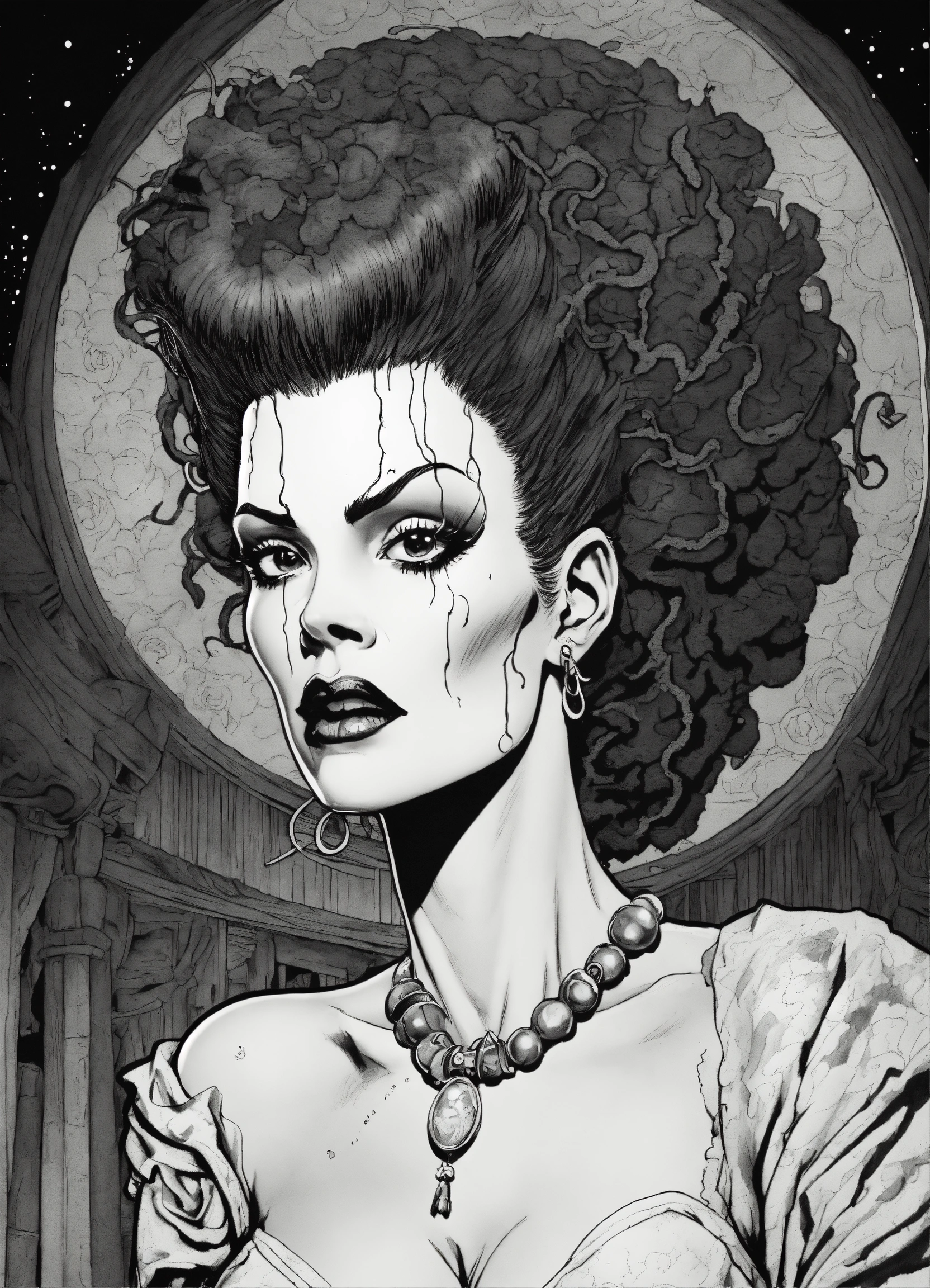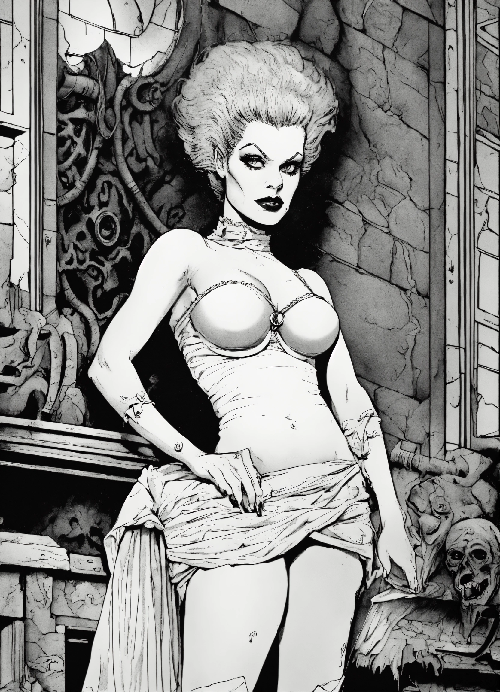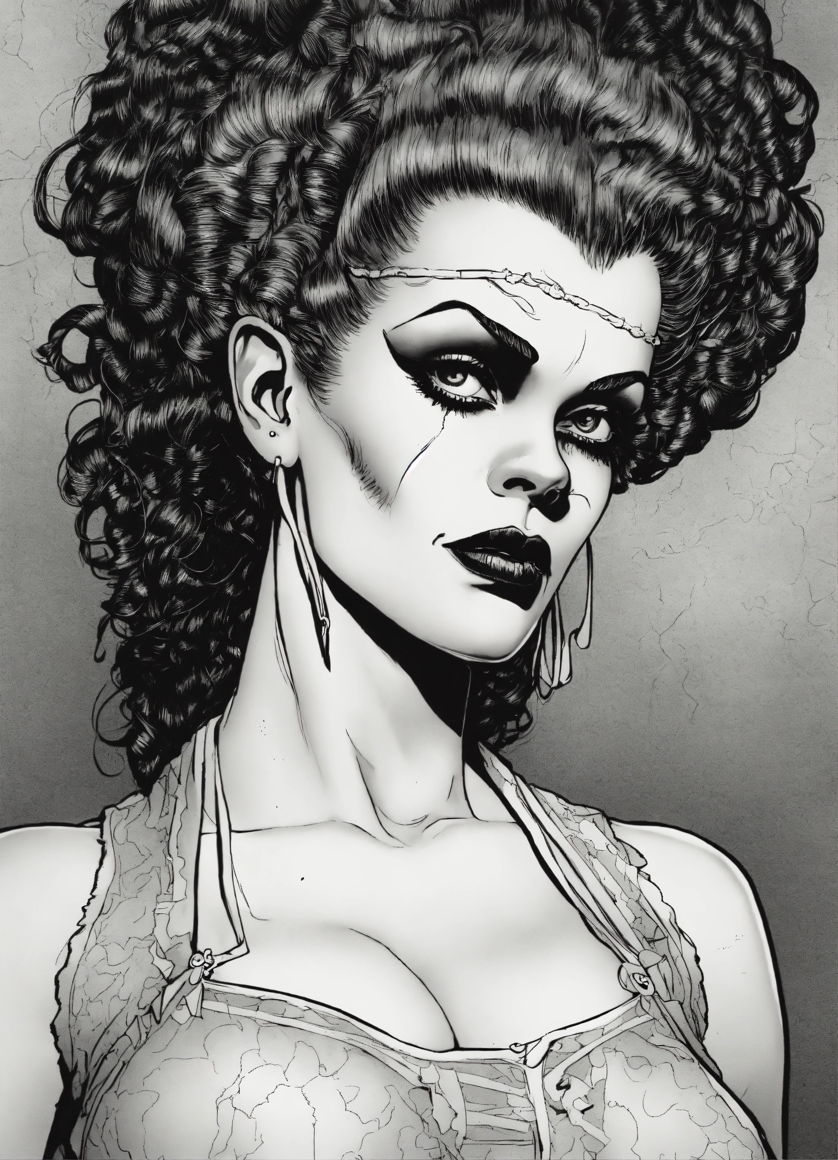 Adult coloring book page of a beautiful bride of frankenstein's monster pin-up, line art, black and white, richard corben style