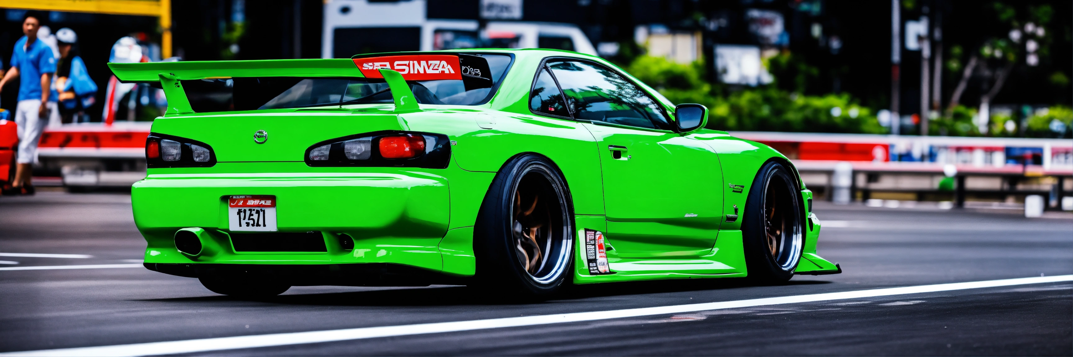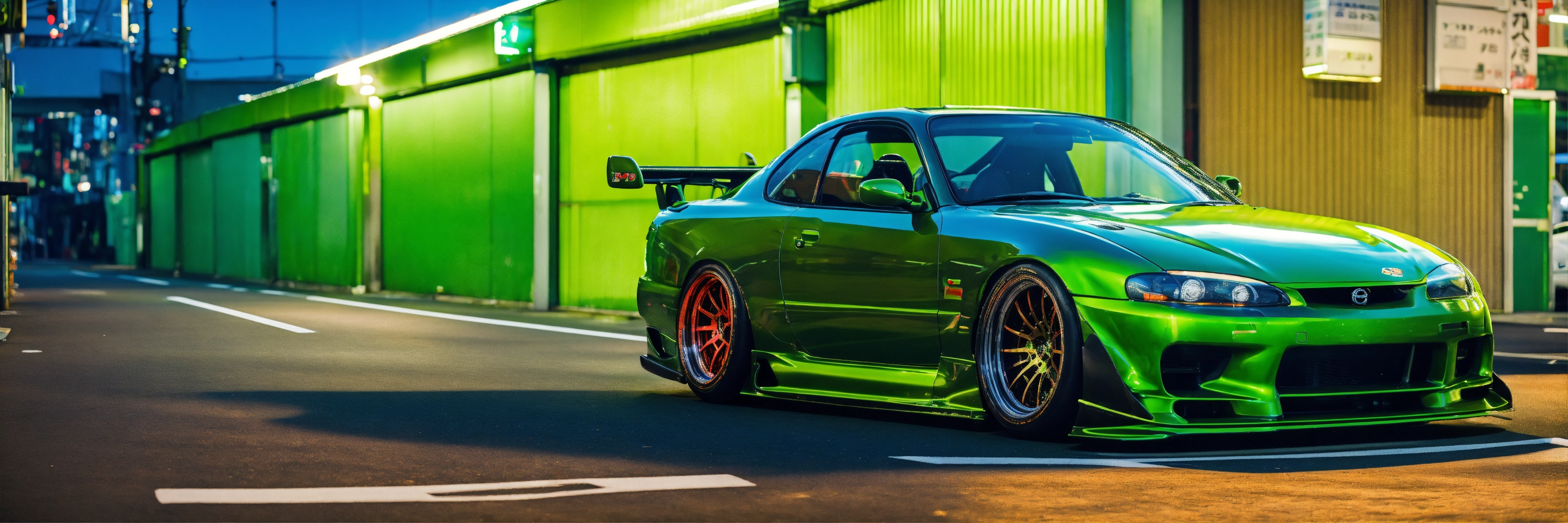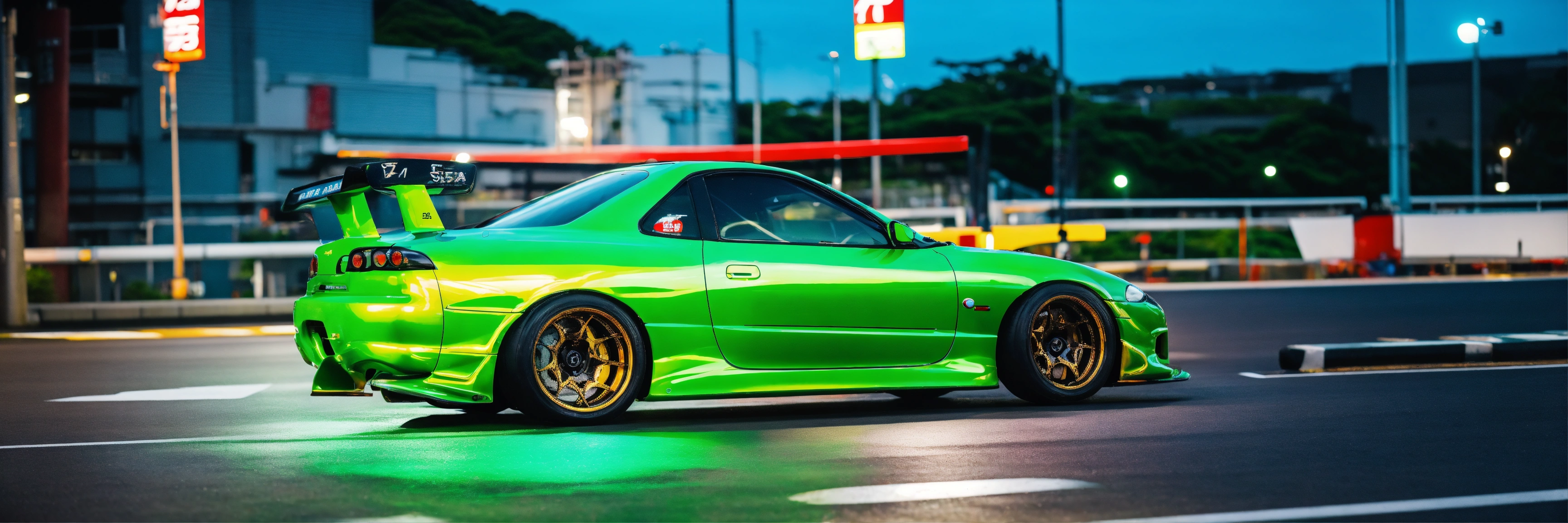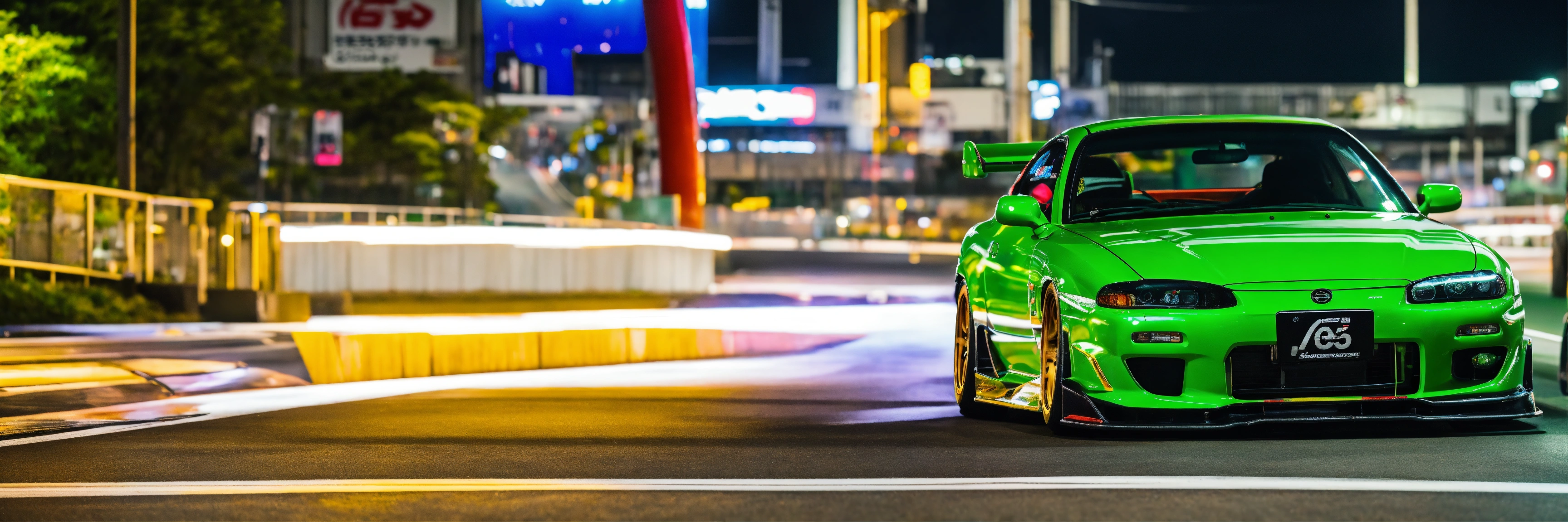 A colorful green nissan silvia s15 with a wide-body kit racing a white mazda rx7 in tokyo highway