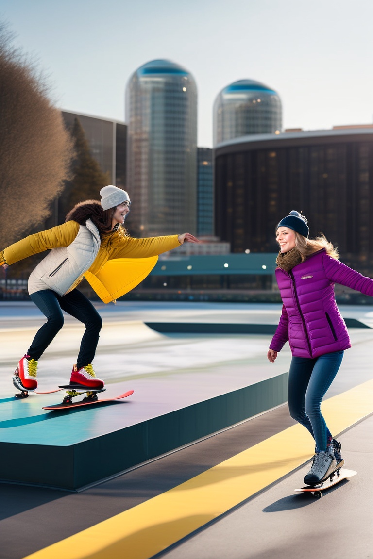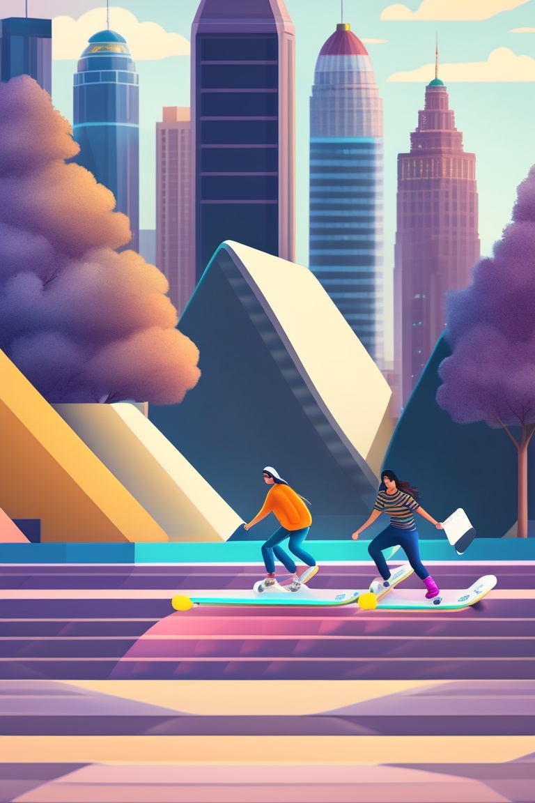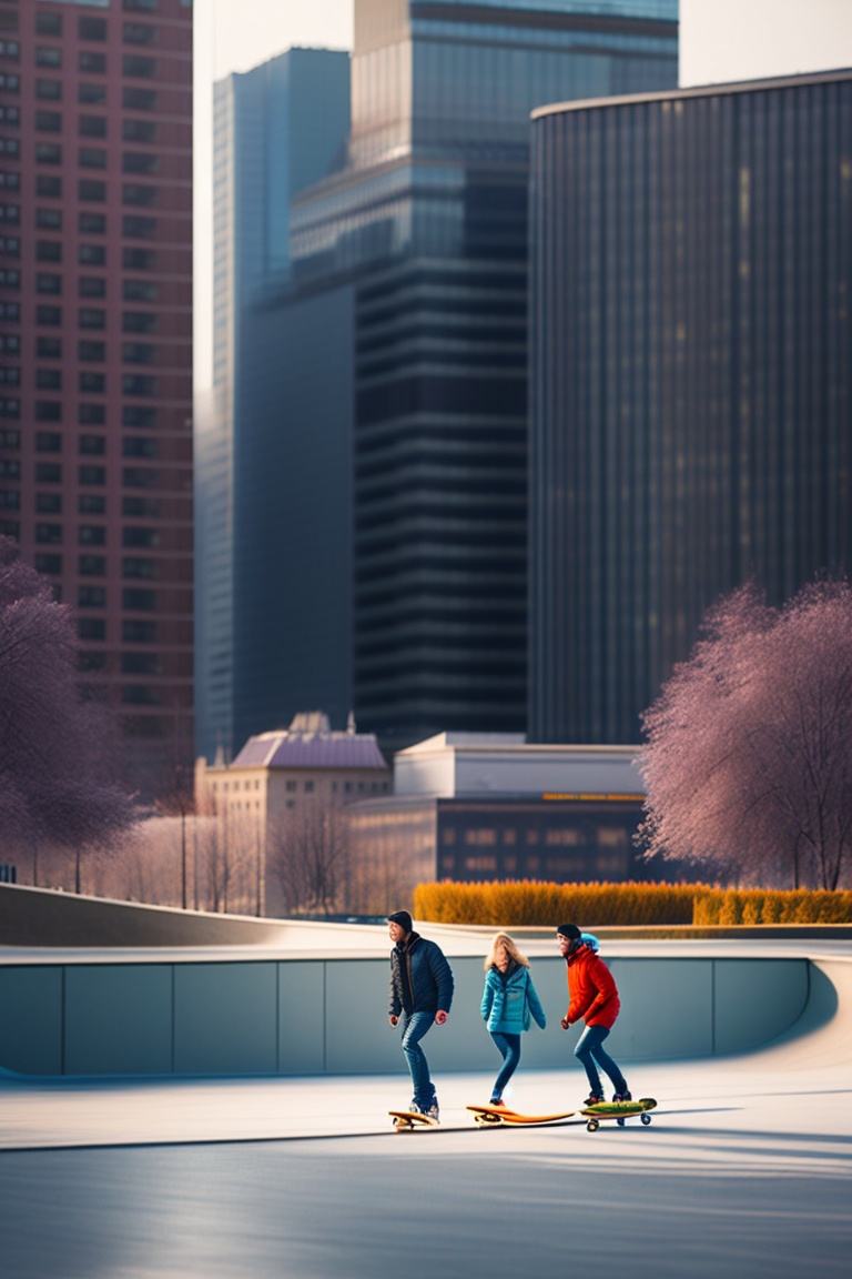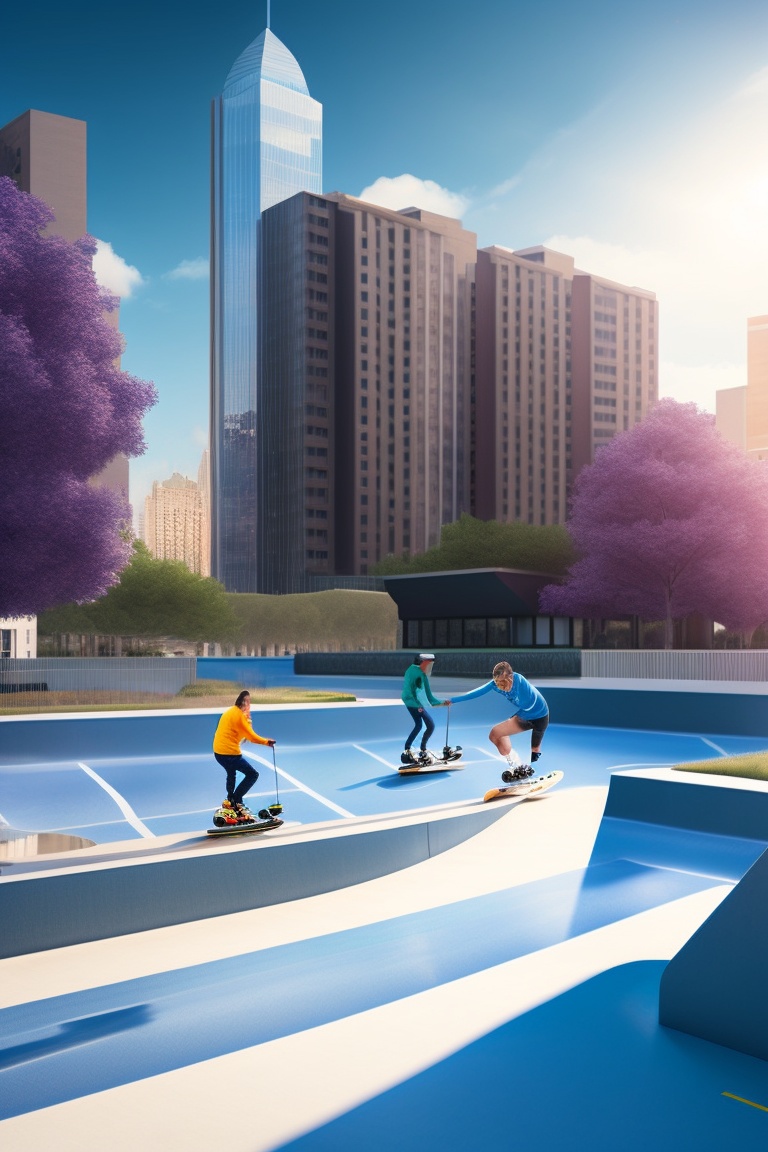 Three people skating on skateboard in a skating park with ramps