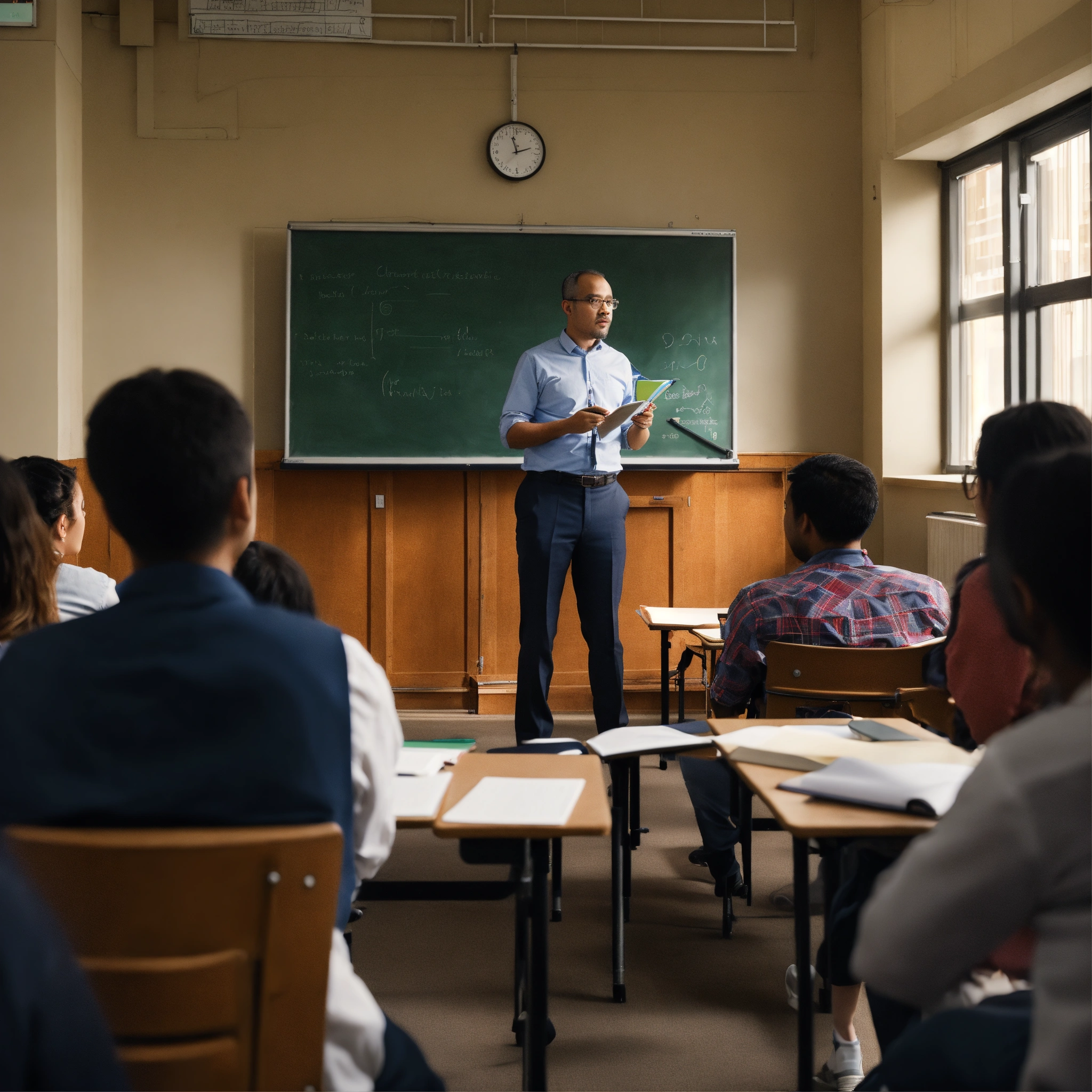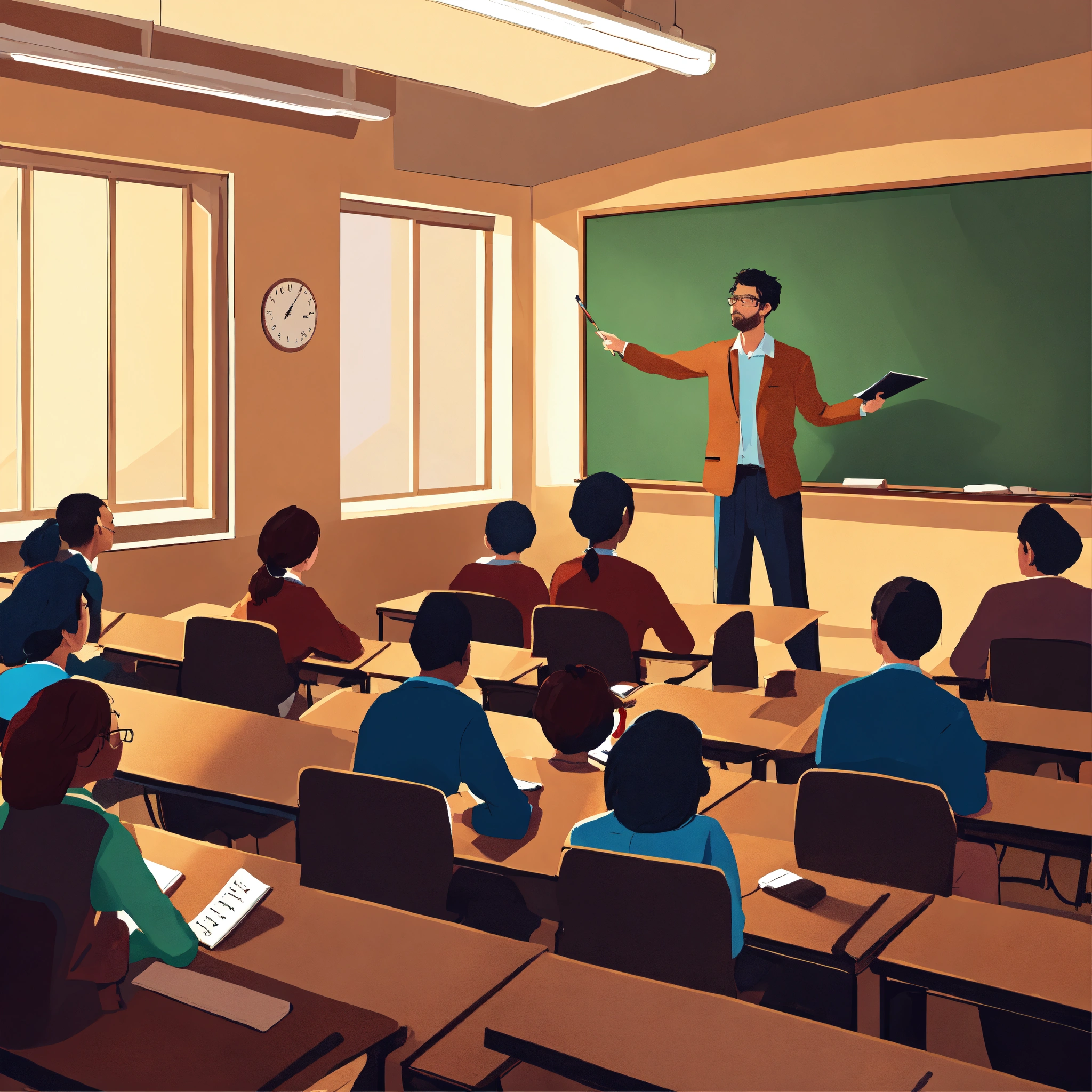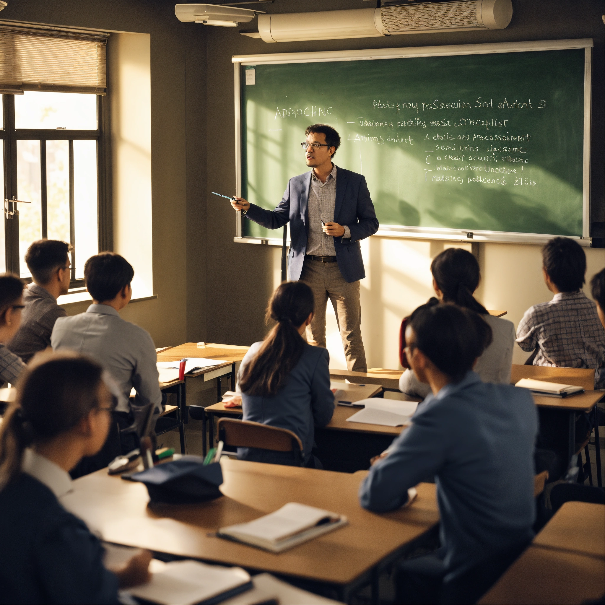 “please generate an image of a postgraduate professor teaching a group of master’s degree students in a university classroom. the professor should be standing next to a chalkboard or projector, while the students should be attentive, taking notes, or actively participating. the scene should convey a serious and professional academic atmosphere.”