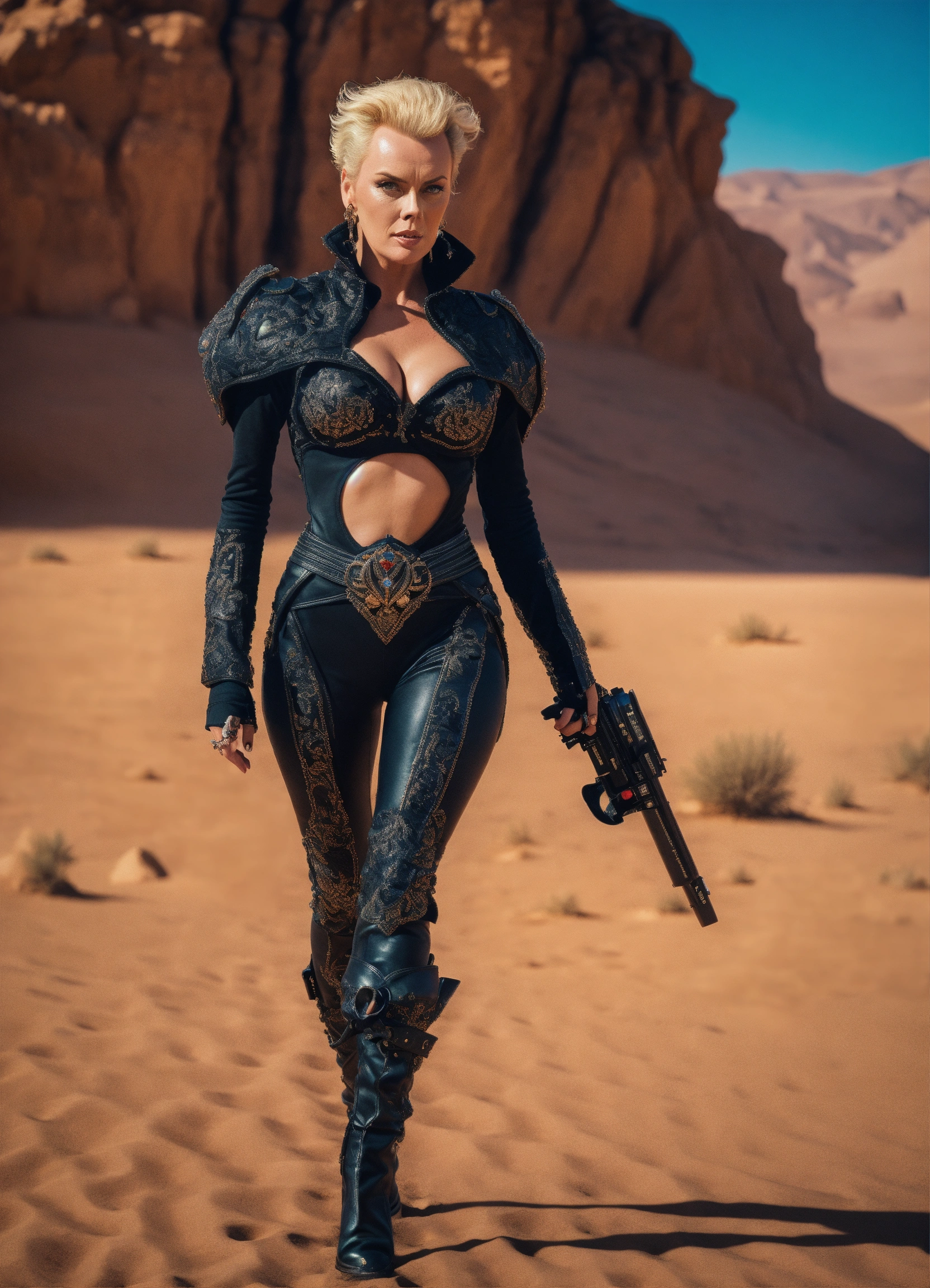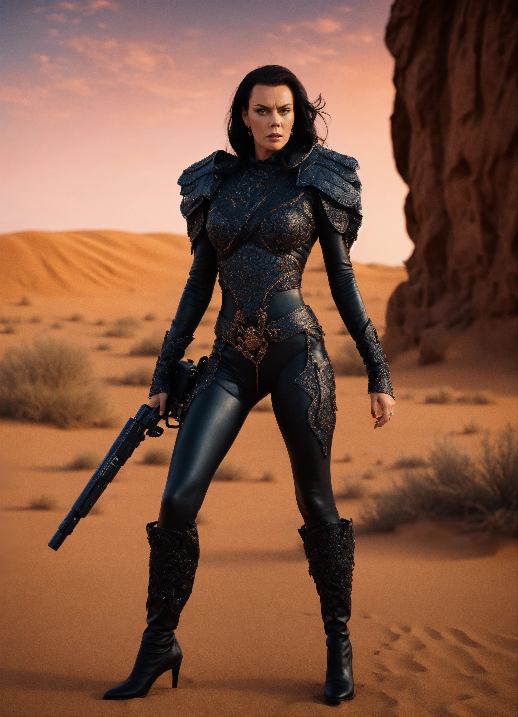 Young evil brigitte nielsen, black hair dressed like evil-lyn of masters of the universe, full body, dark suite, camera look, walking in a desert, 8k resolution, photorealistic, hard light photo, hyper detailed, intricately detailed