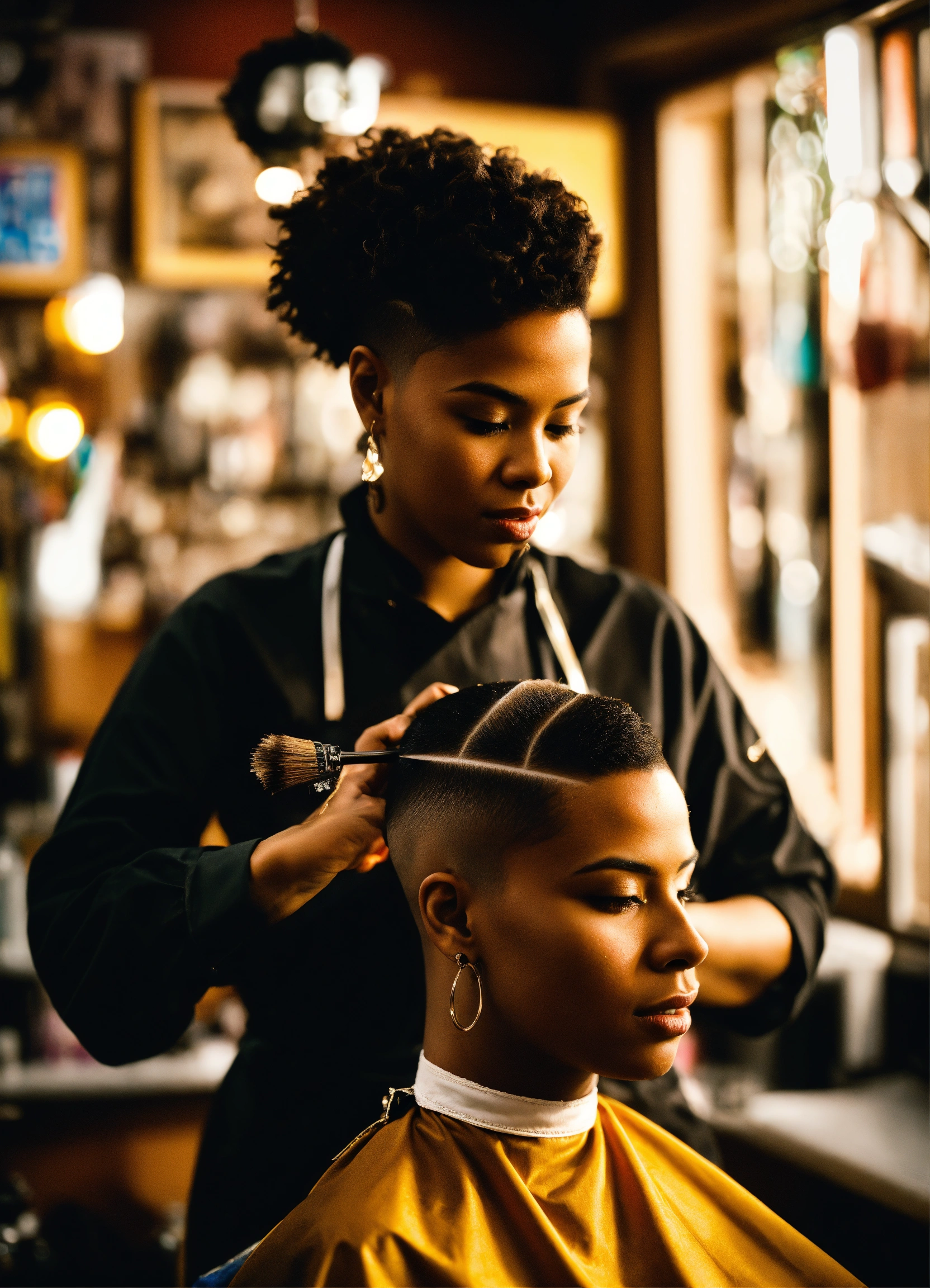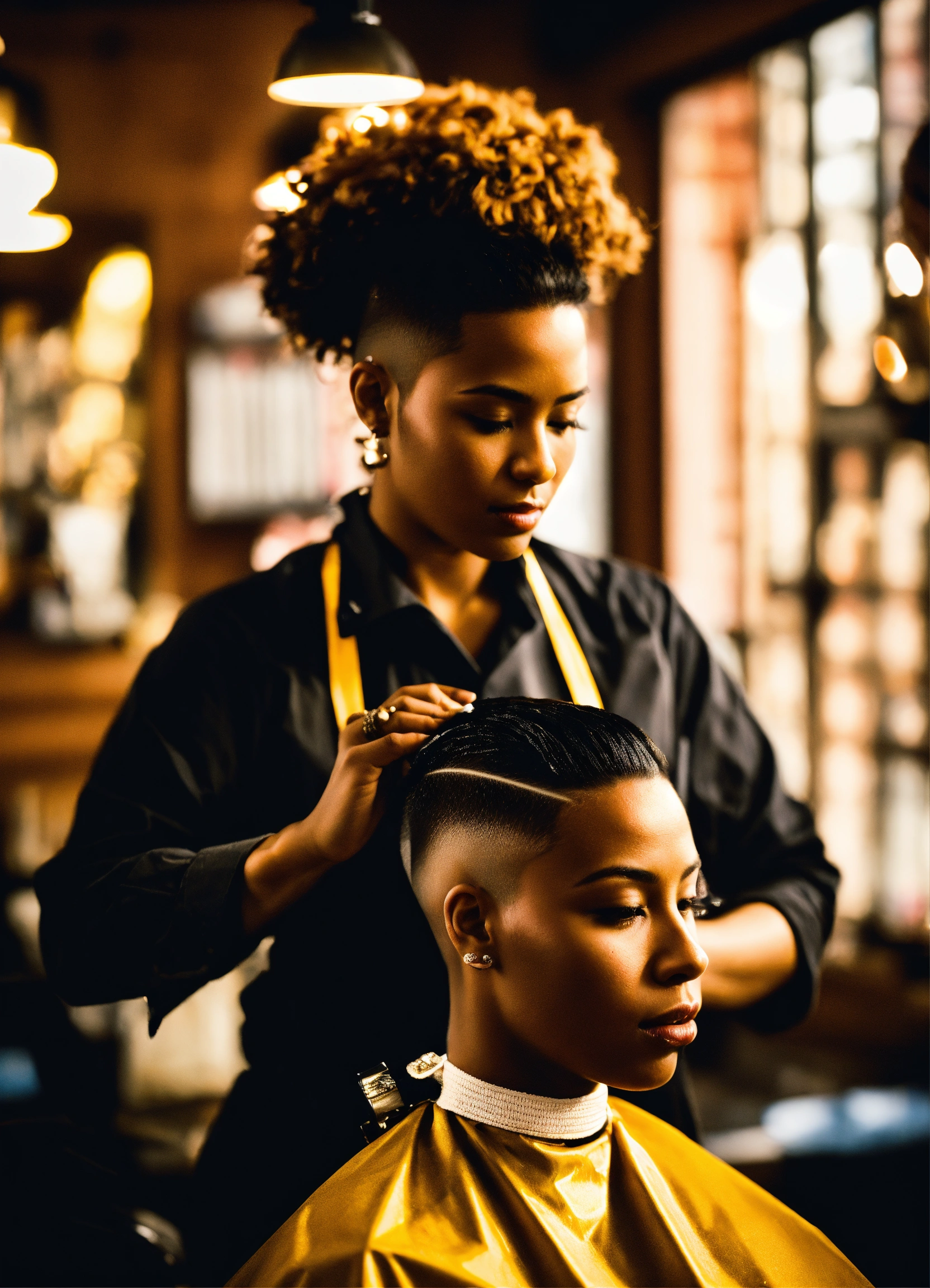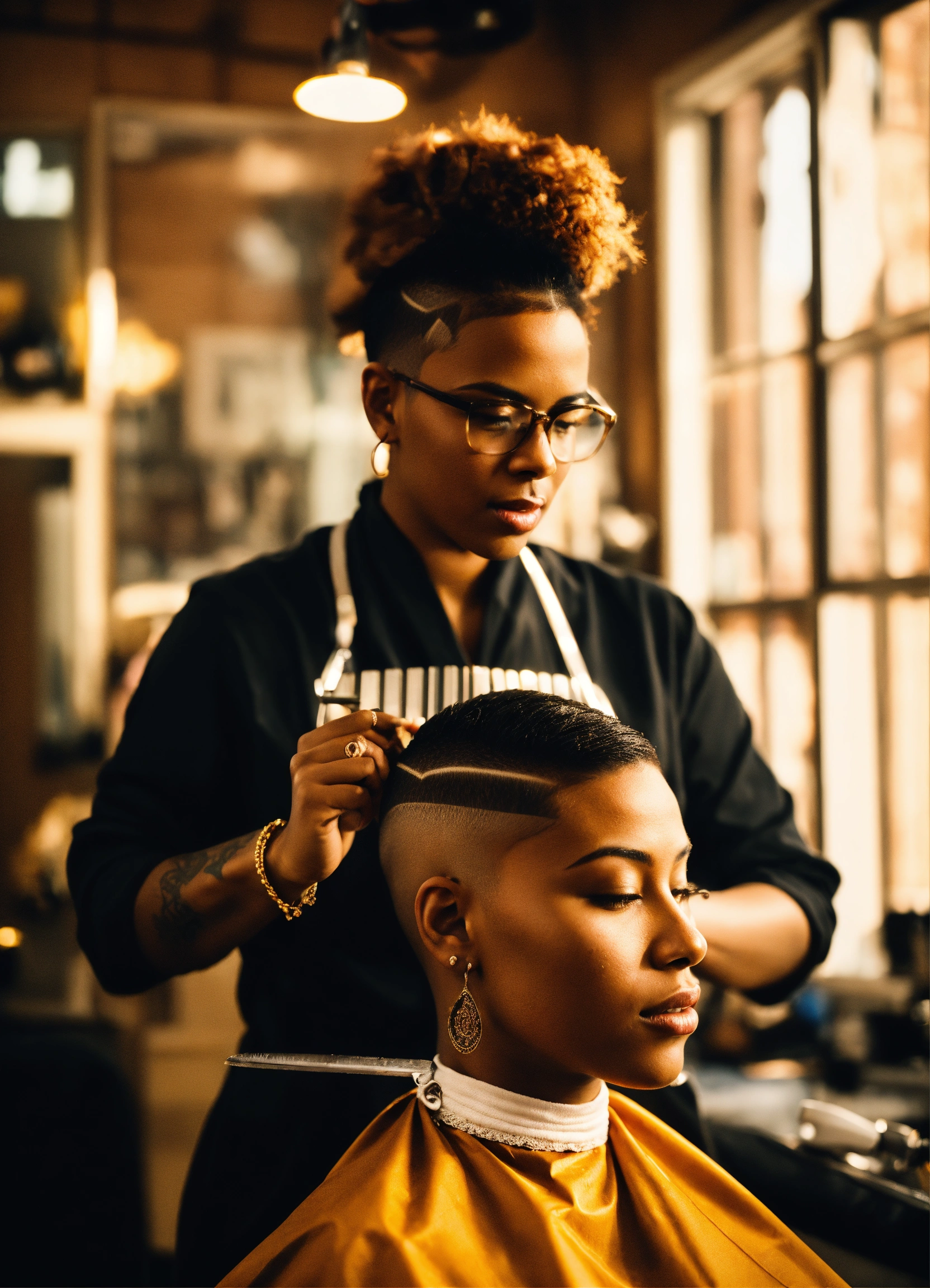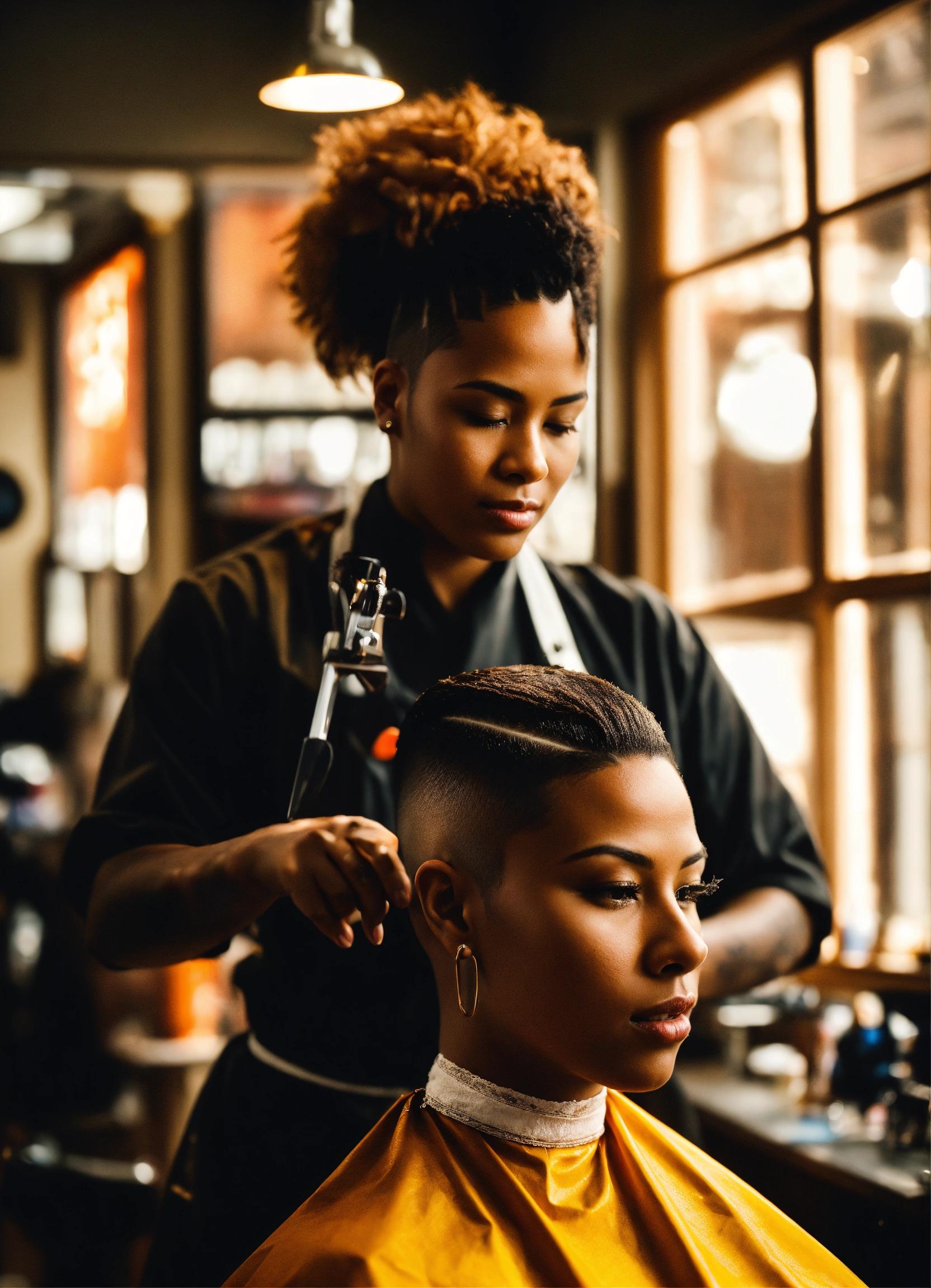 /imagine prompt a skilled brown-skinned professional female barber working in an urban barbershop, surrounded by other barbers, is cutting skin fades and creating fantasy haircuts. bright sunlight streams through large windows, capturing the barber's essence, creativity and expression of passion for his skill. intricate clipper work, attention to detail, photography, dslr with a 66mm prime lens, f/2.8 aperture, --ar 45 --v 5