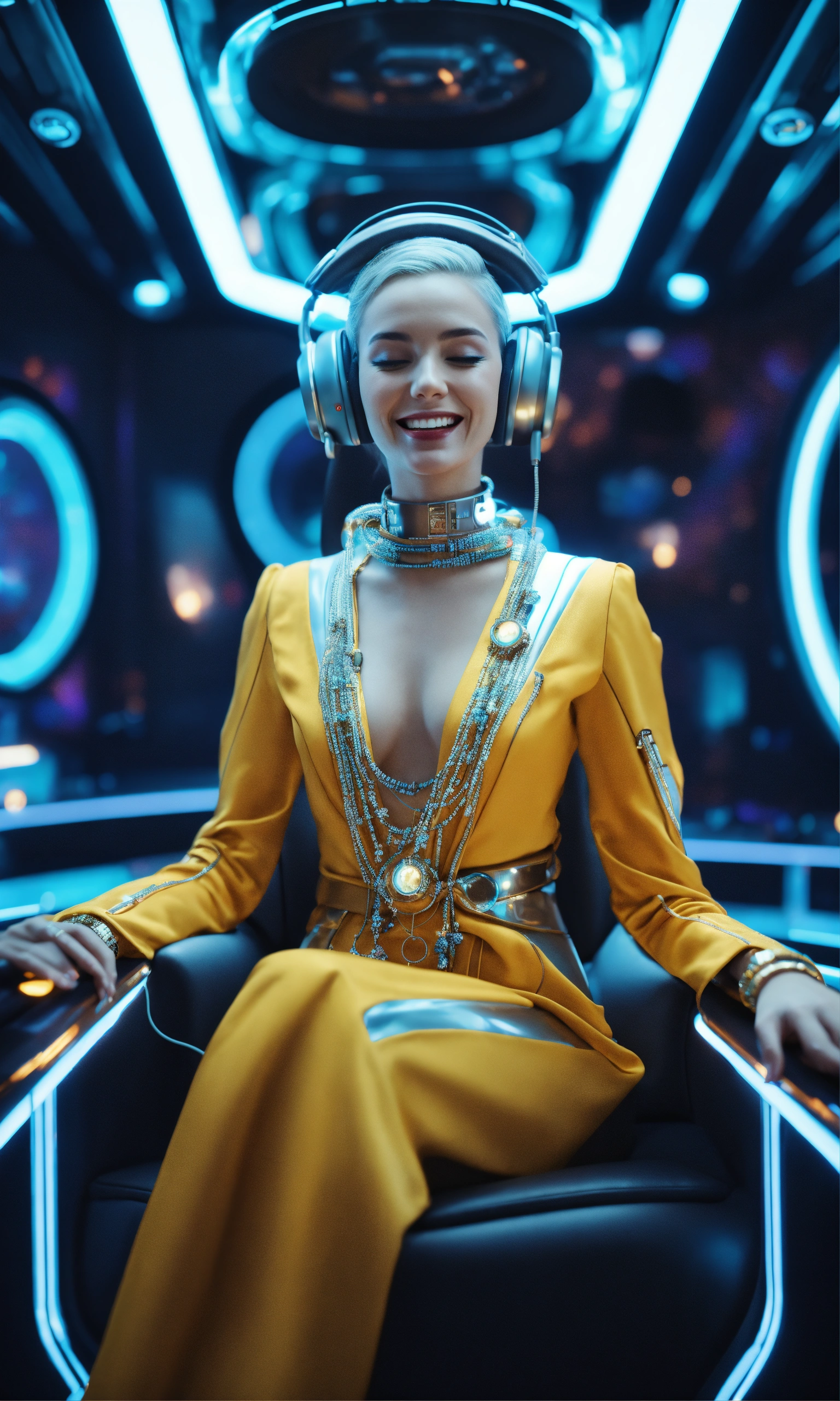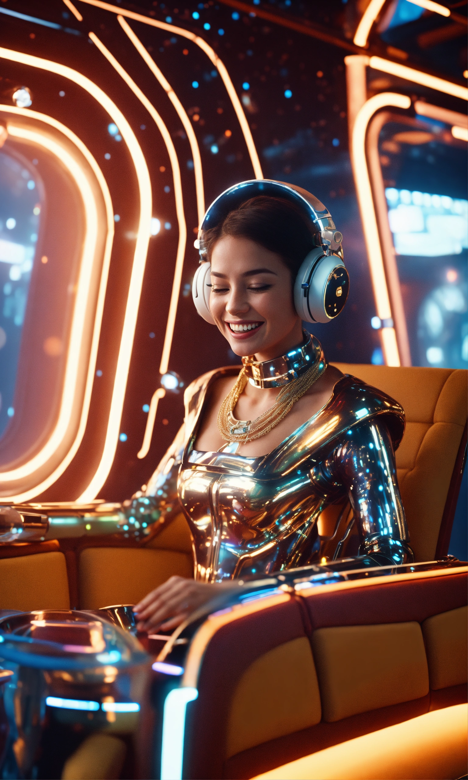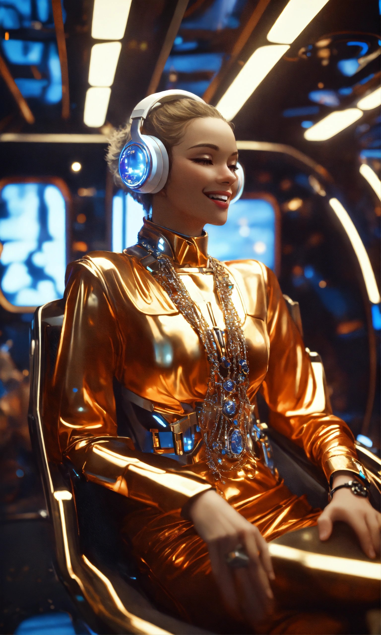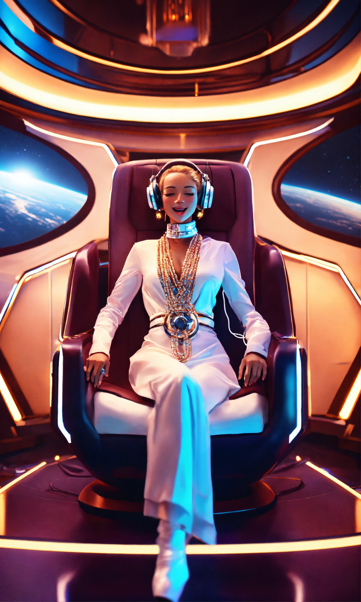 Zoom out from a beautiful. laughing humanoid, wearing a fancy space robe with earphones and jewelry relaxing in a futuristic space yacht lounge, realistic, futuristic, sci-fi, 8k, unreal engine
