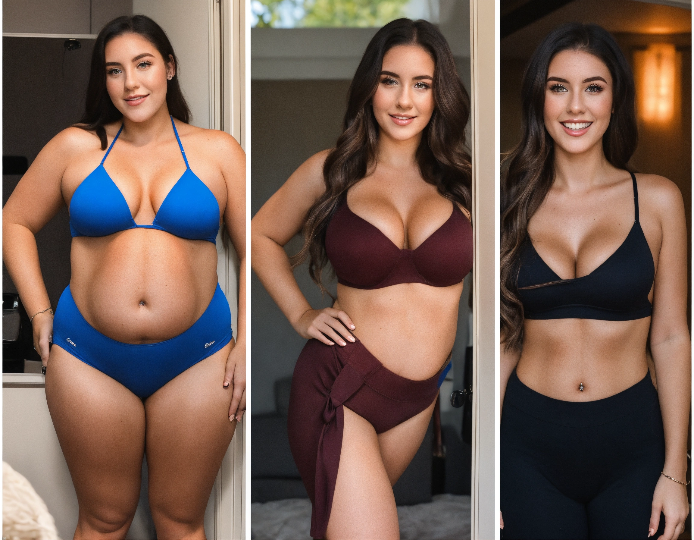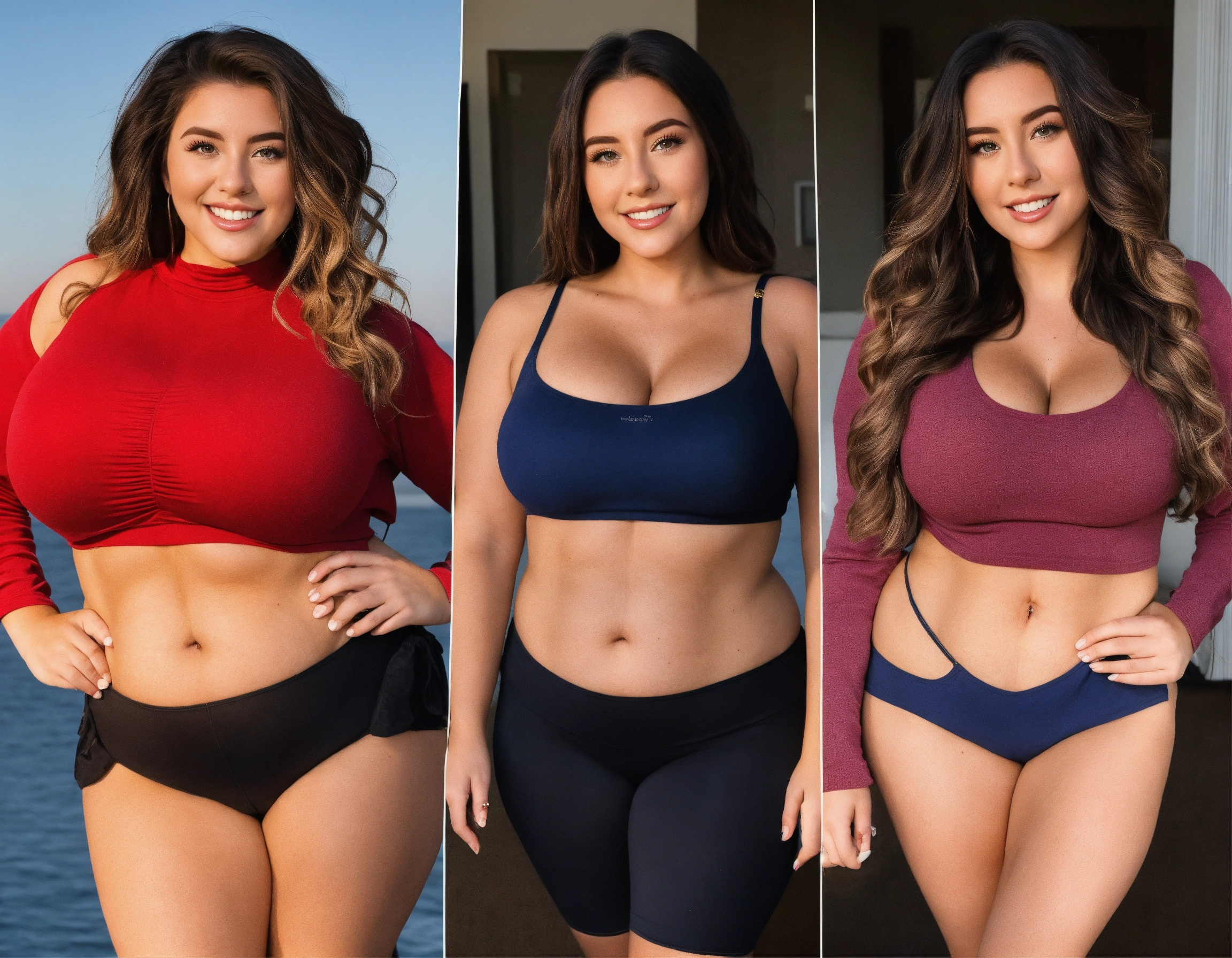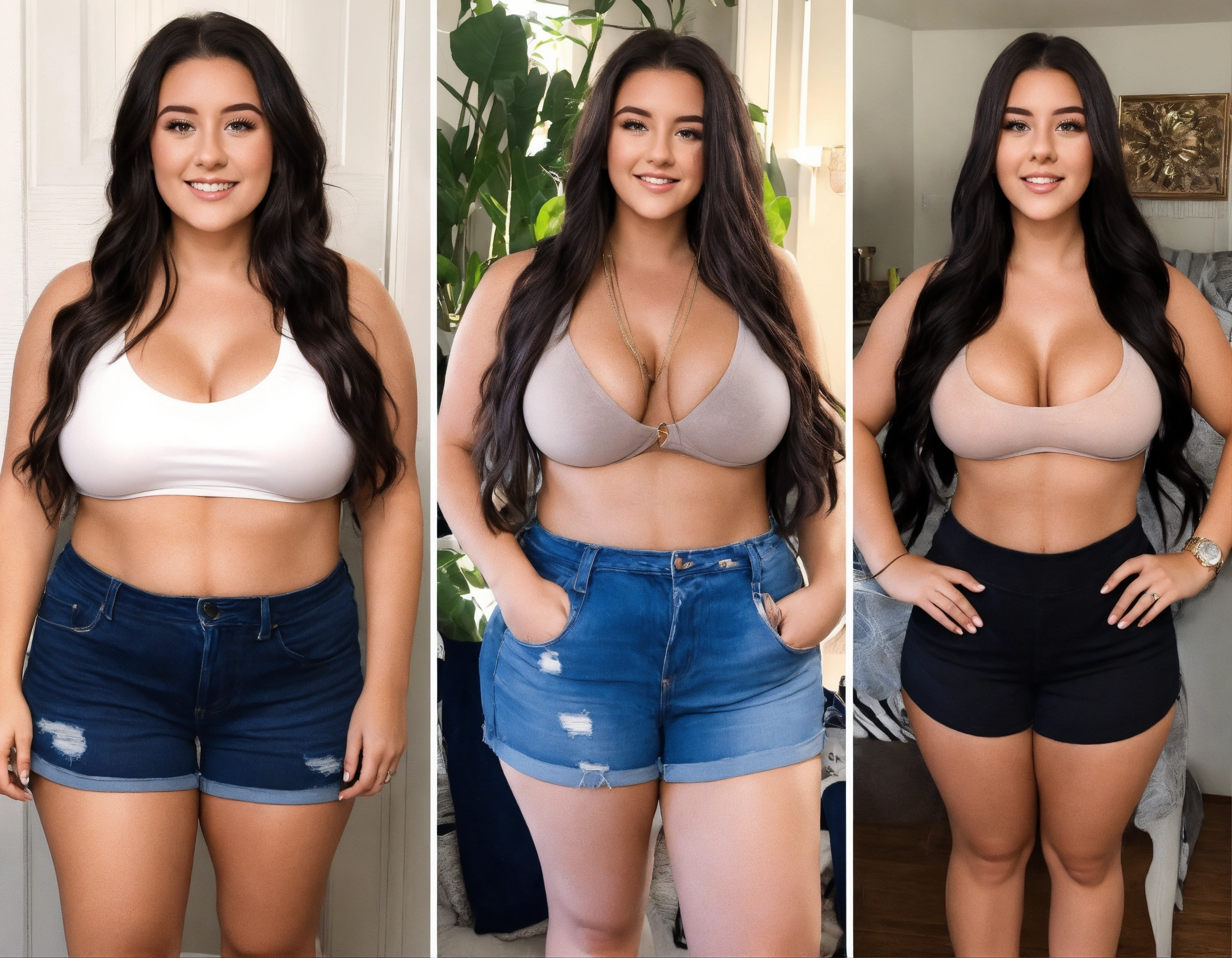 The photos of each progression of the social media influencer ella schnacky transformation starting at age of 18 then into her 28 then in her 38 and in her 48, the last progression is a curvaious large breasted dark haired loving mother
