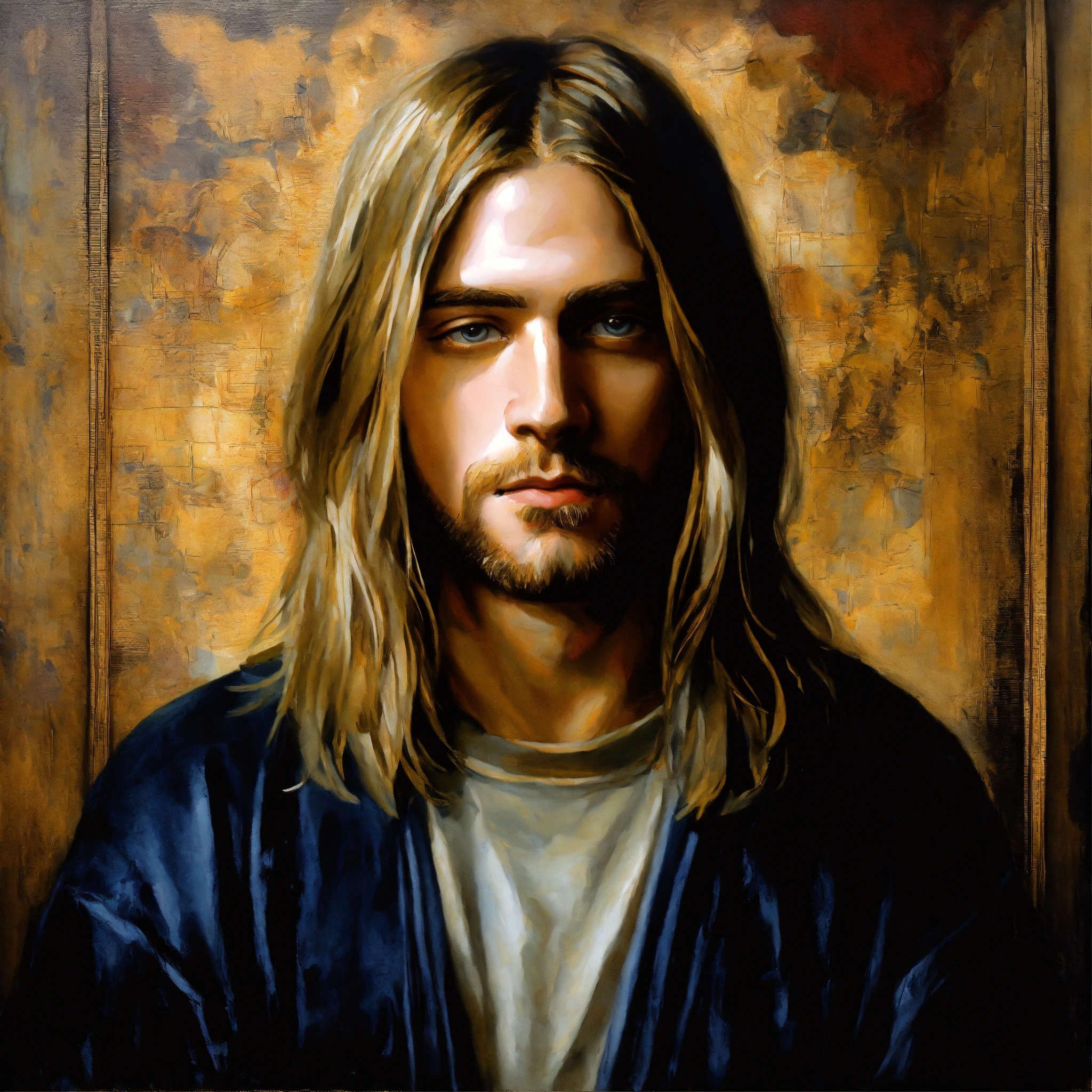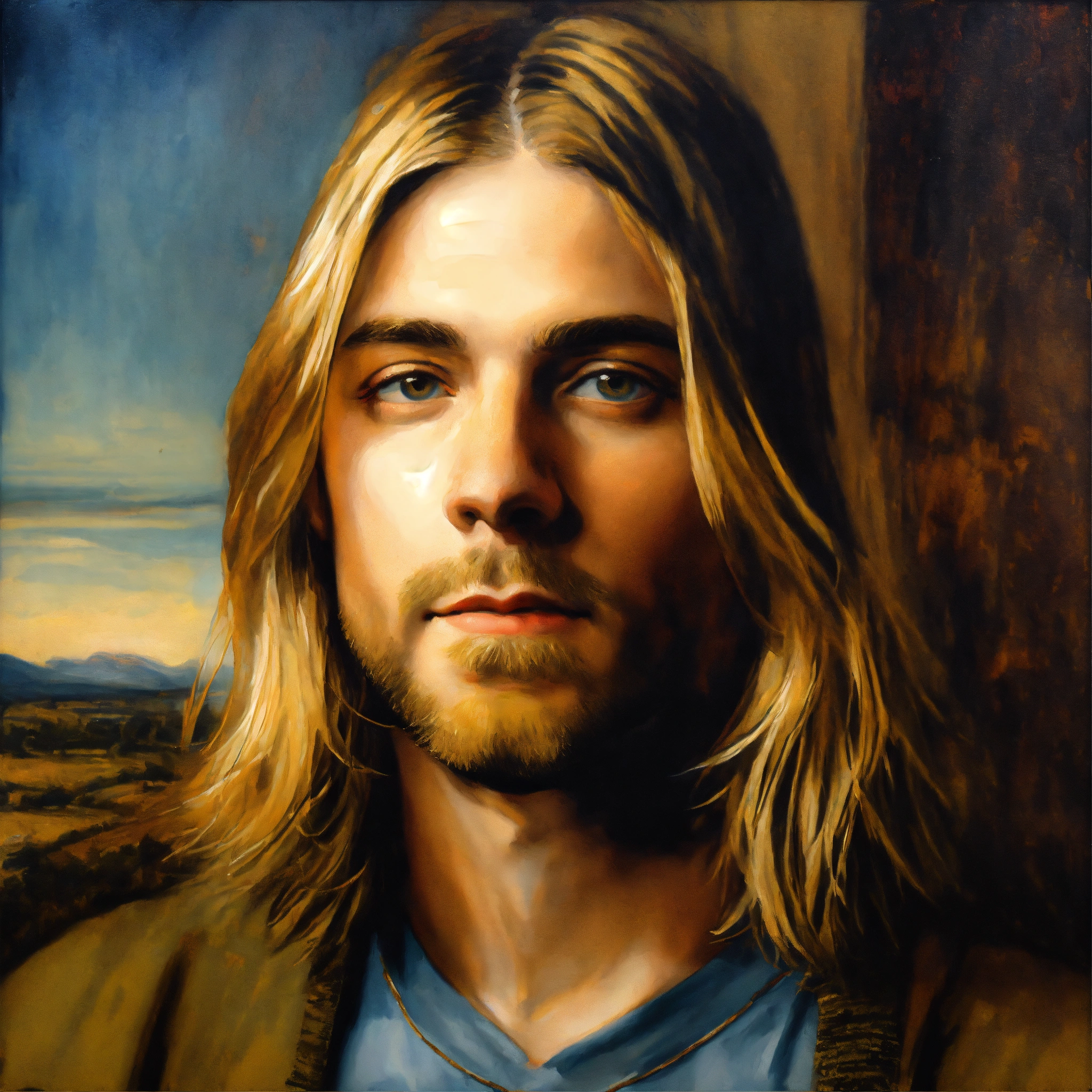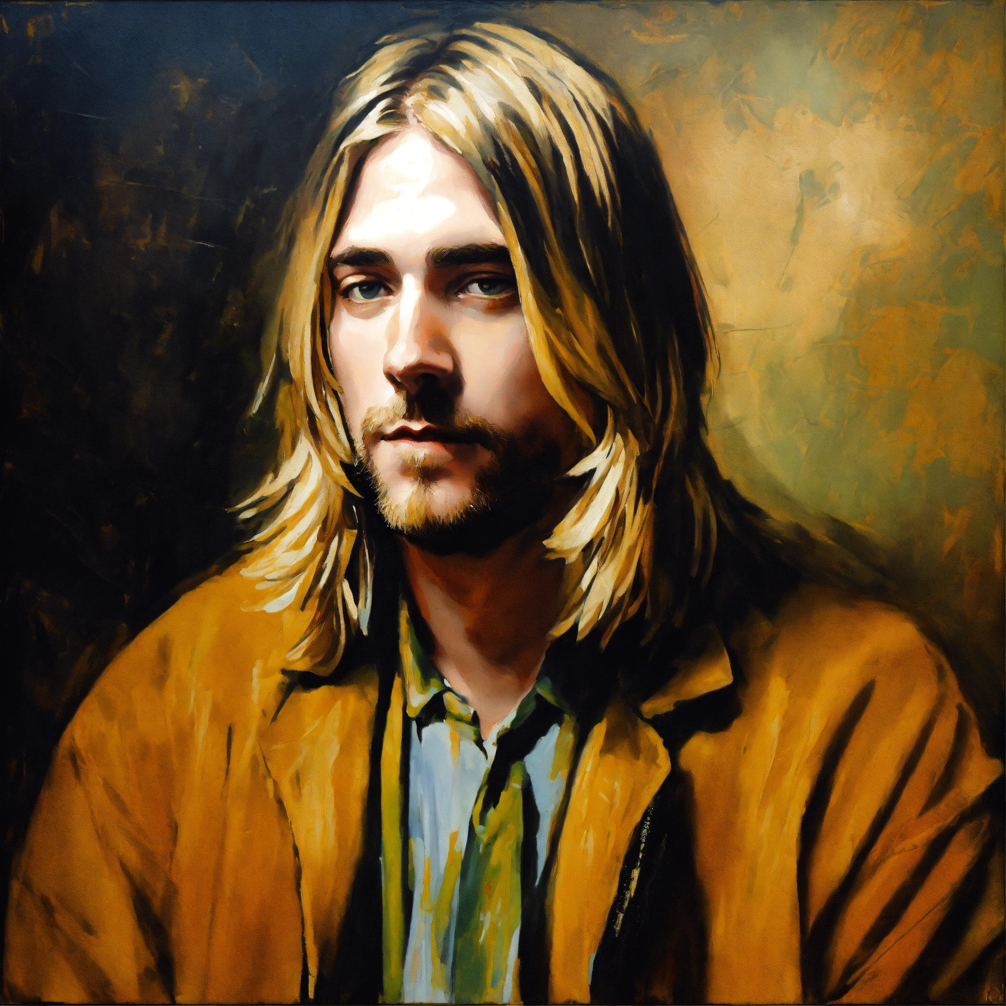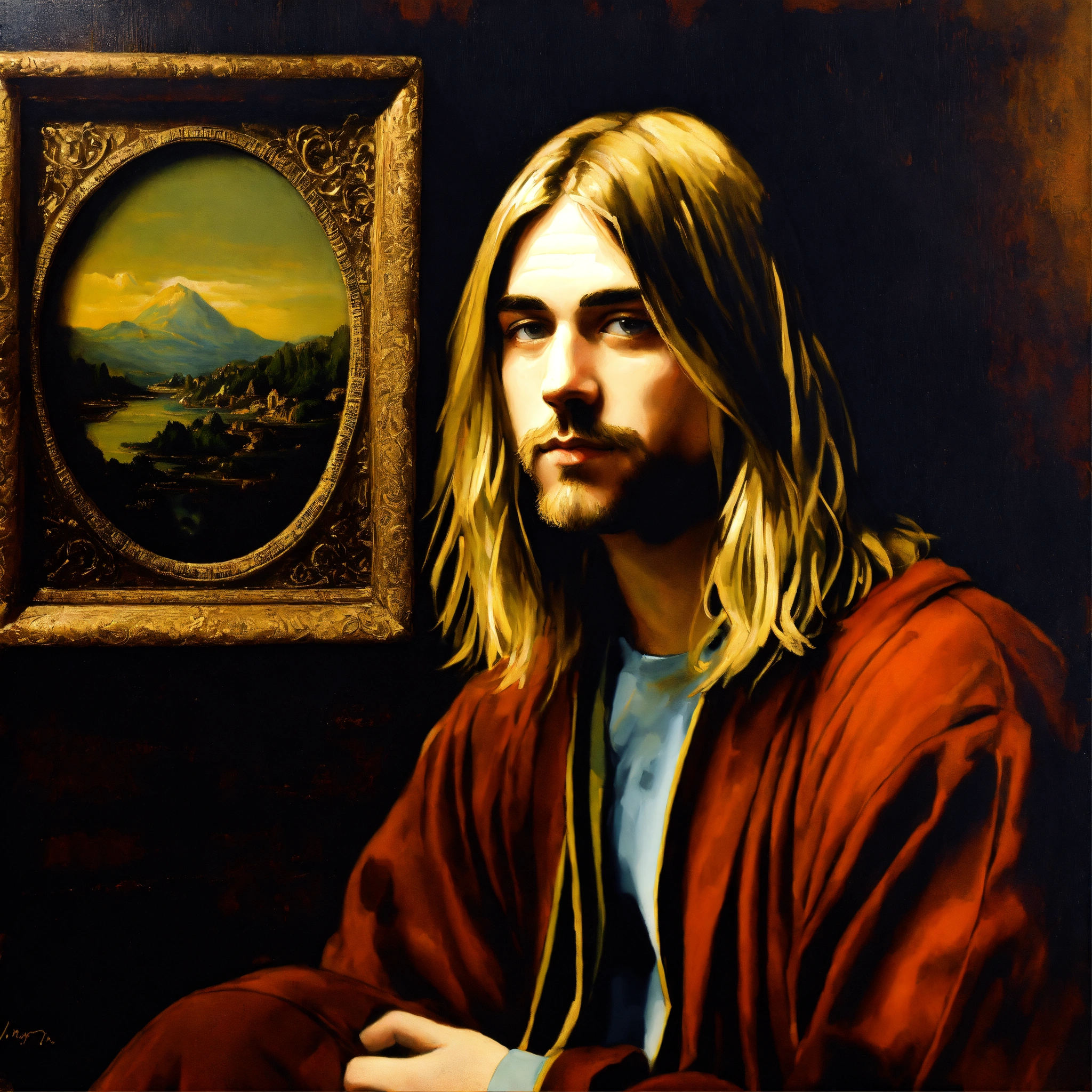 A portrait of kurt cobain in the style of leonardo da vinci, with a similar vibe to the mona lisa. kurt cobain should be seated in a chair, with a slightly enigmatic smile. the painting should be set in a dark, atmospheric room with a single window letting in a shaft of light. the overall tone of the painting should be moody and introspective. additional instructions use high-quality brushstrokes and a smooth, blended finish. pay close attention to the details of kurt cobains face, including his facial features, hair, and skin texture. use a limited palette of colors, with an emphasis on earthy tones. create a sense of depth and dimension in the painting.
