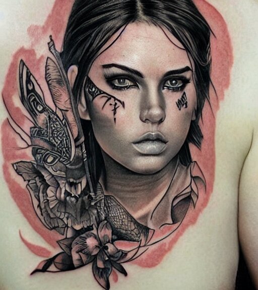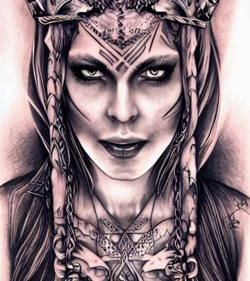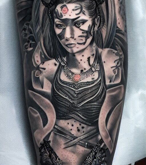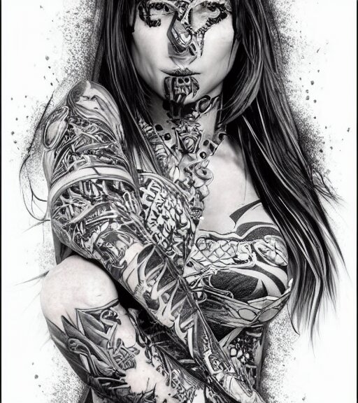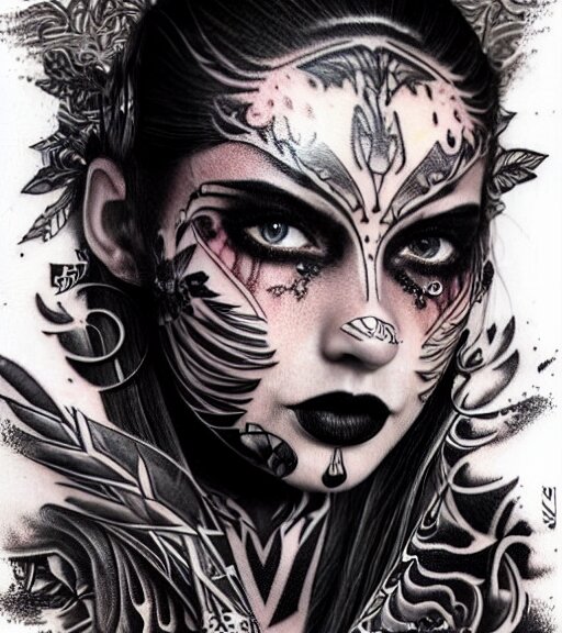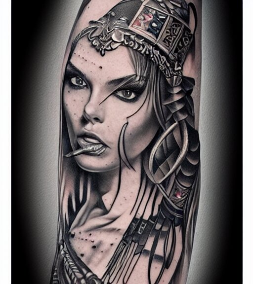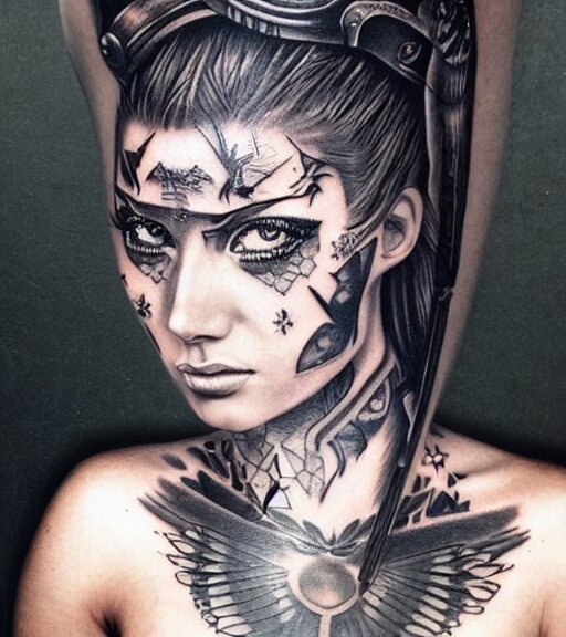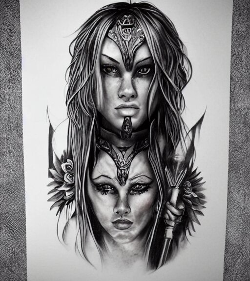 Tattoo design of a hyper realistic beautiful girl warrior, hyper detailed, inspired by eliot kohek, on white background