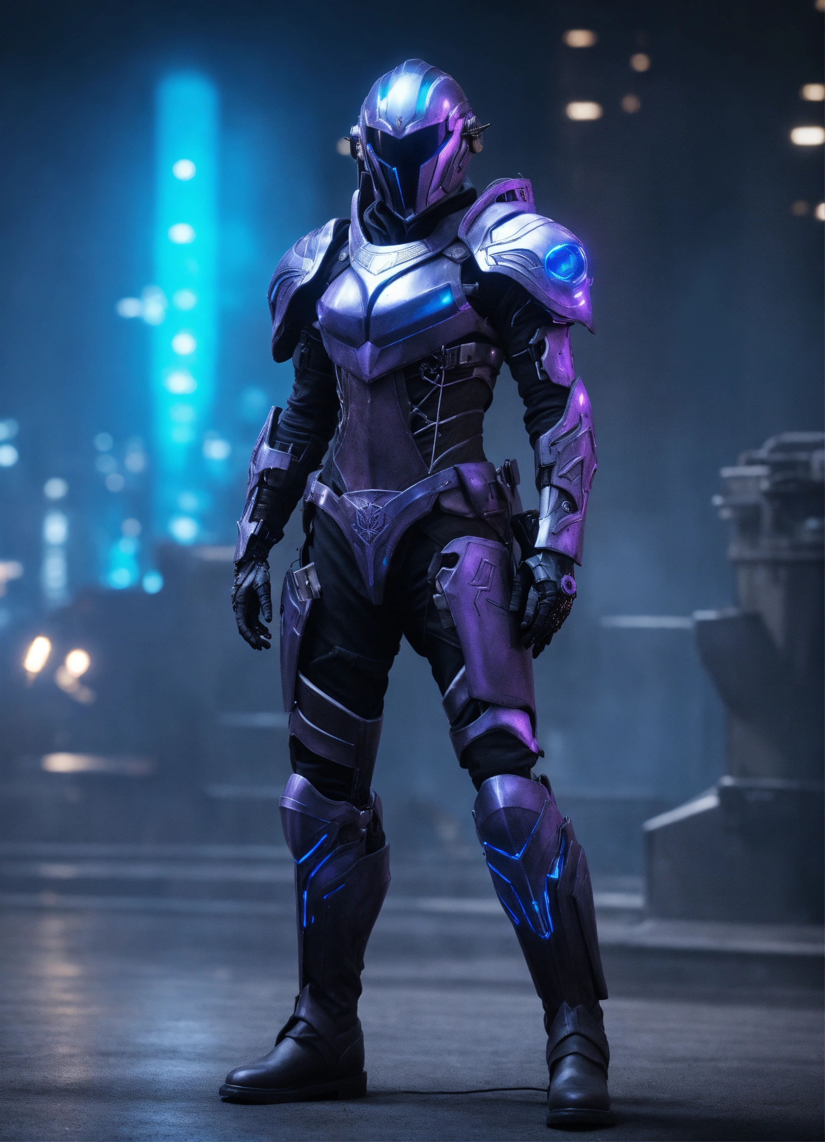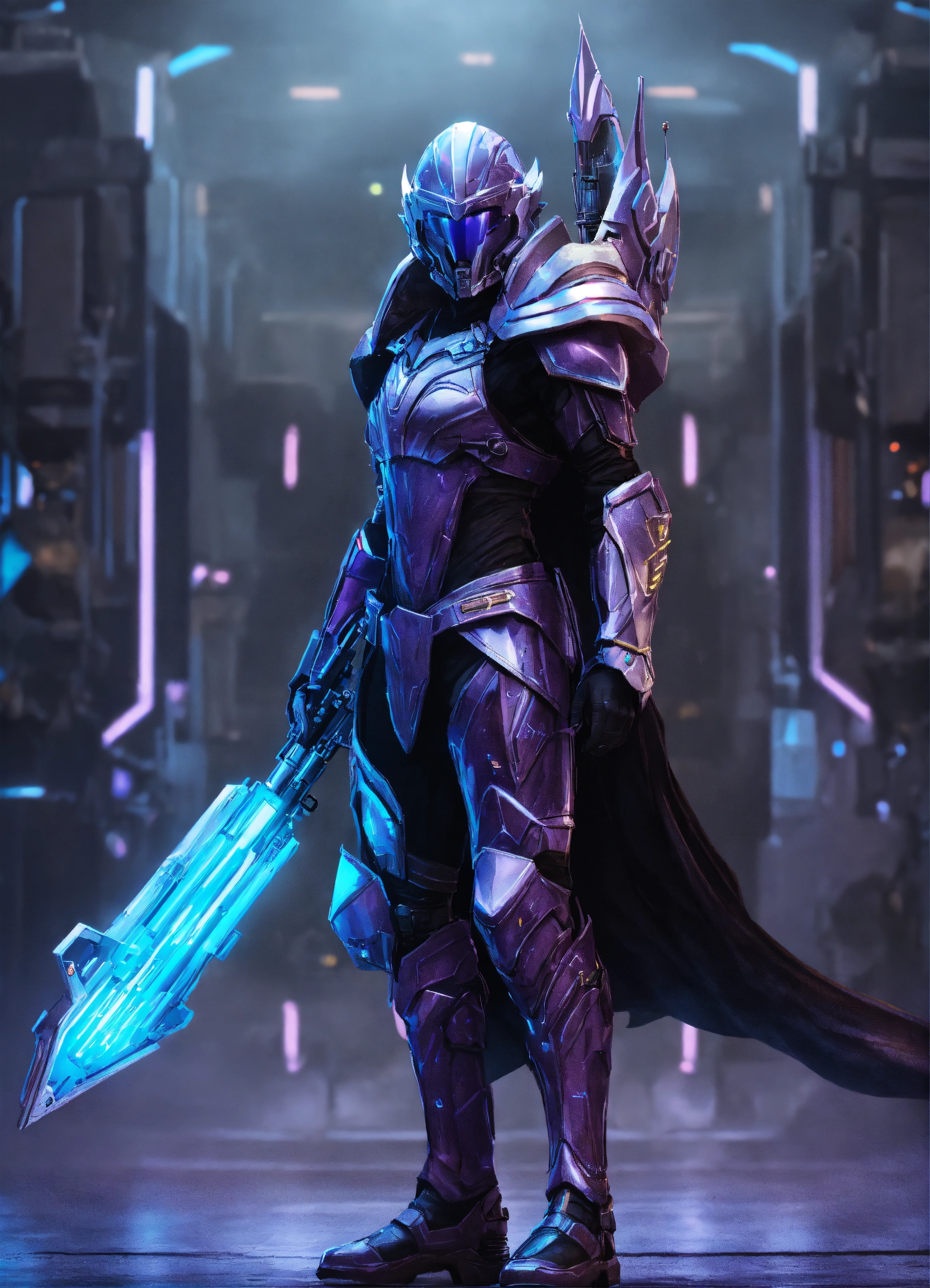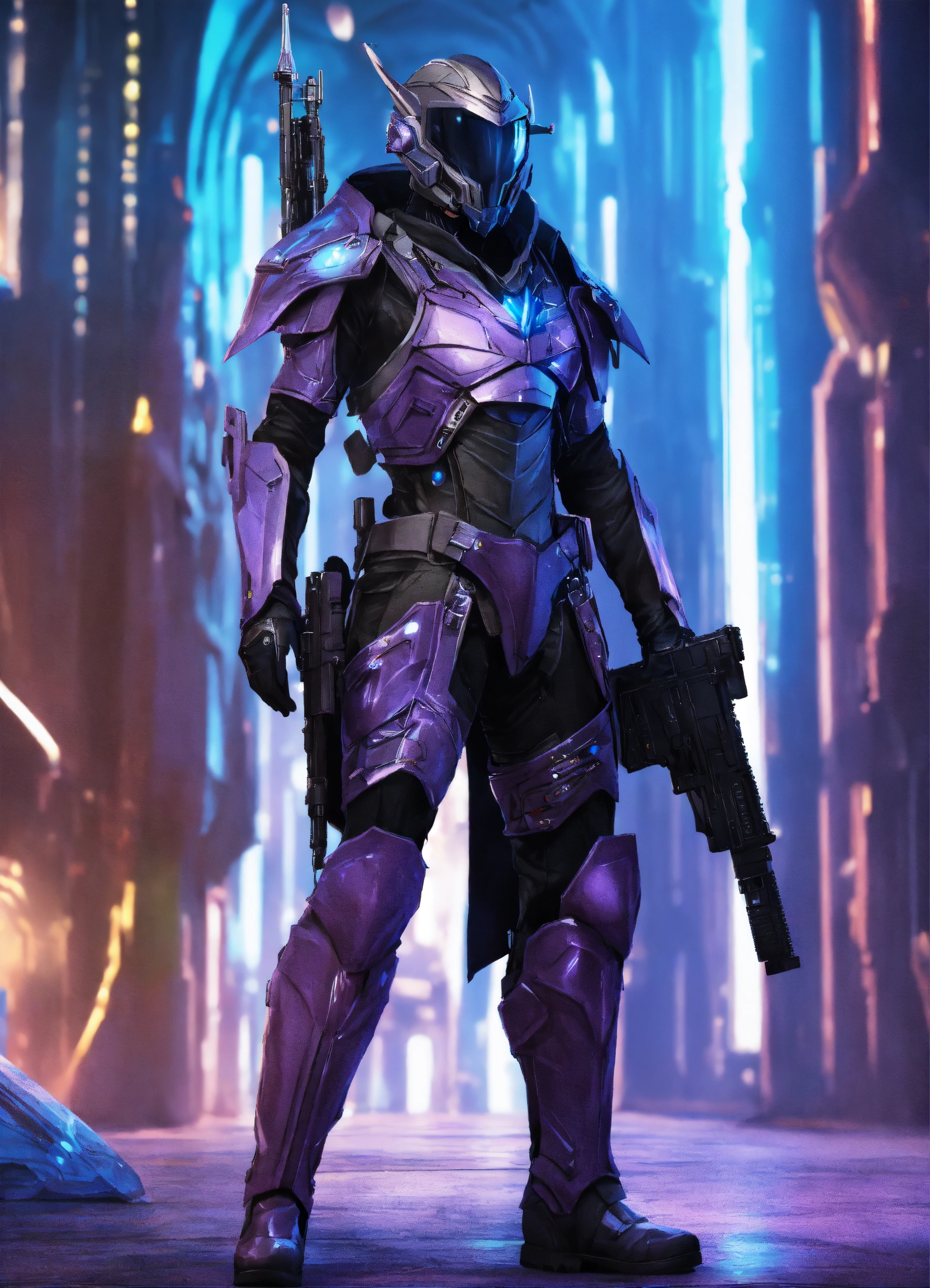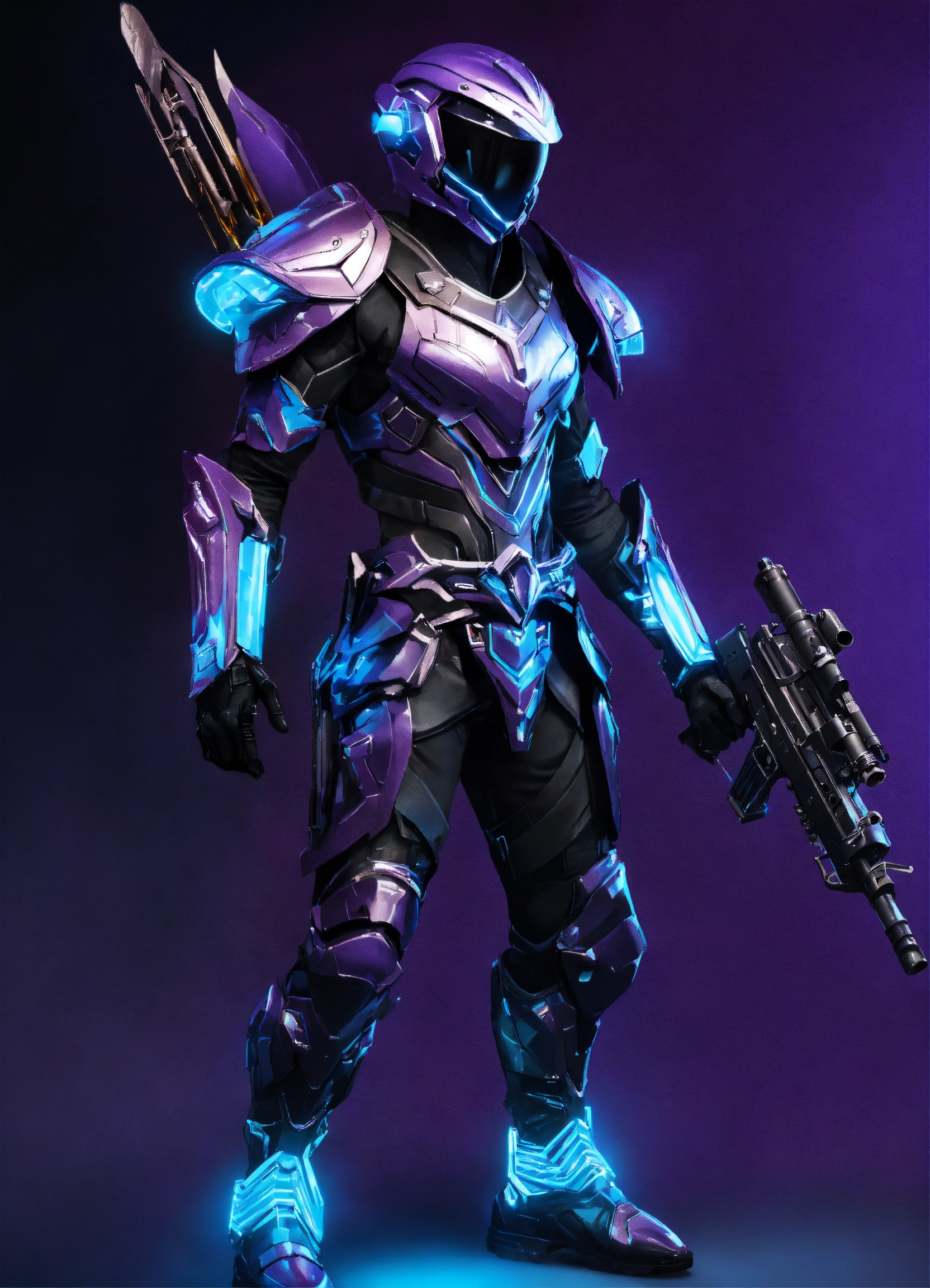Full body of a high elf sci fi soldier wearing heavy sci fi elven armor, cybernetic black and purple and light blue armor and helmet, boots, male, holding a light machine gun with both hands, full body, hd