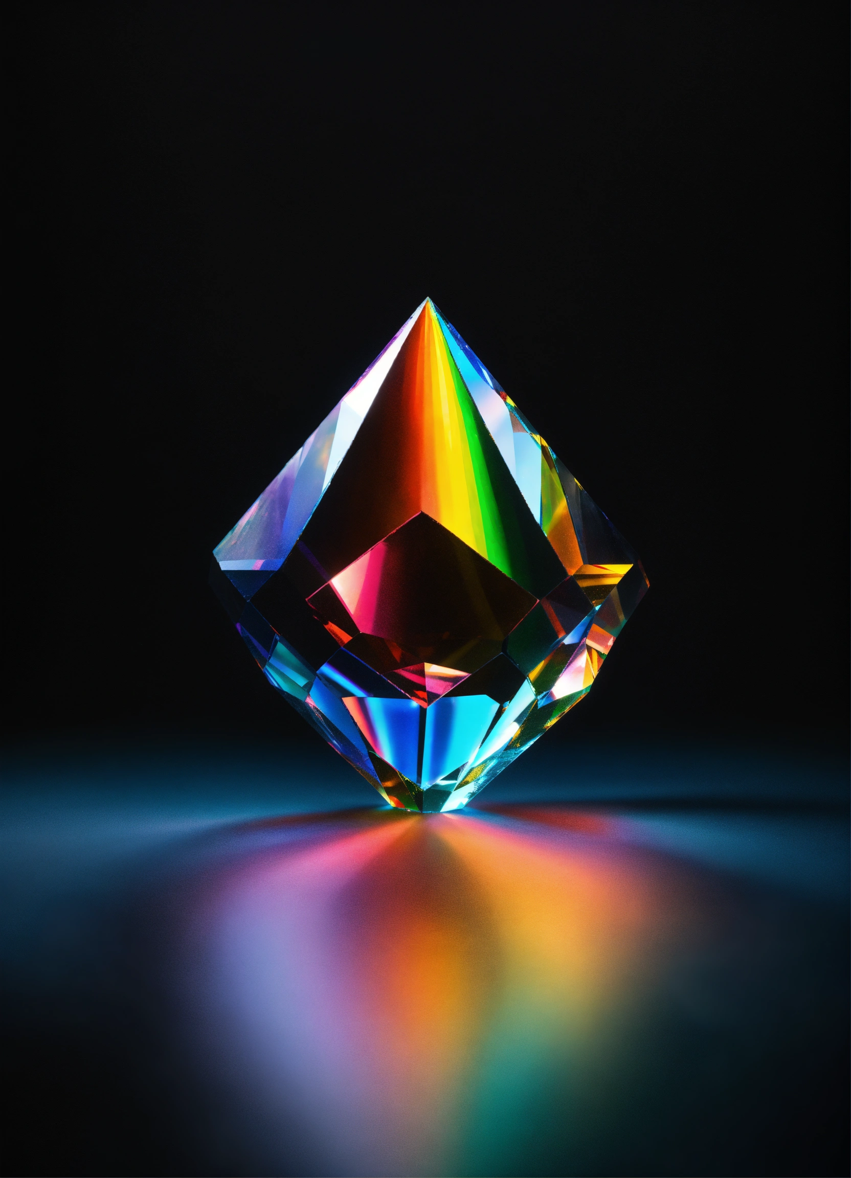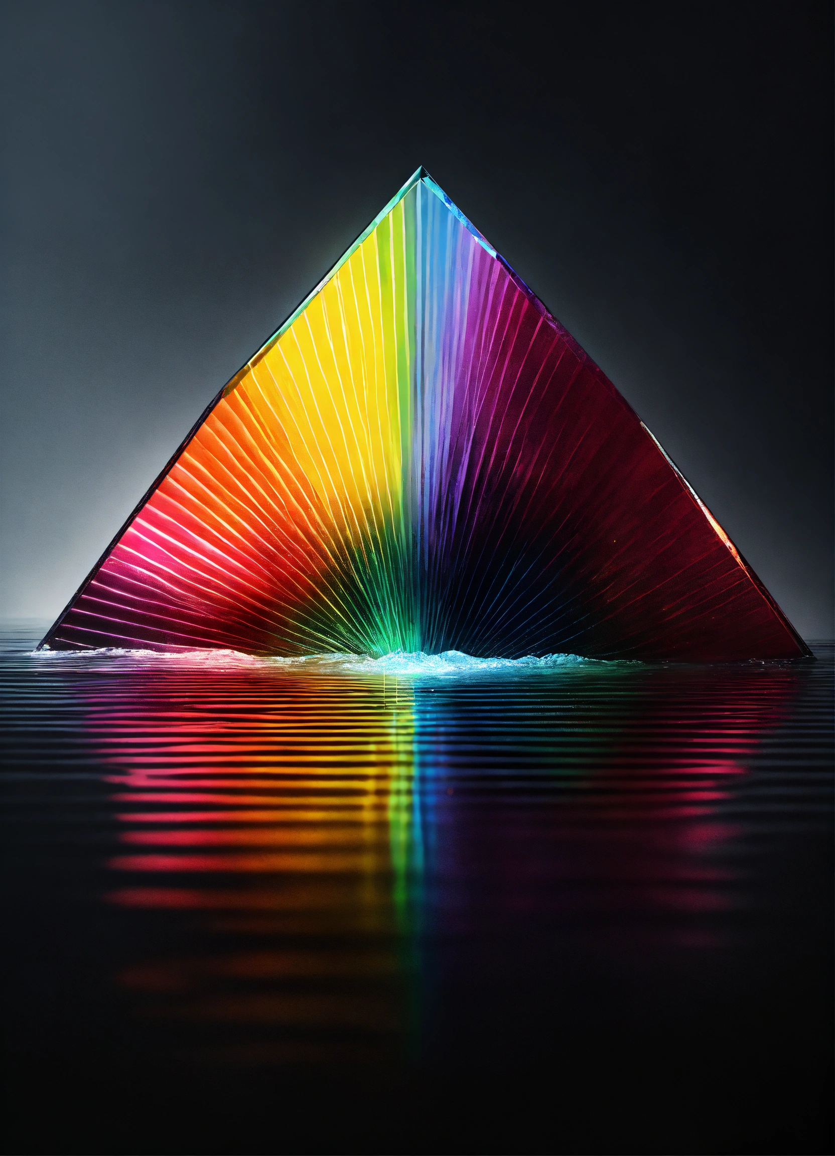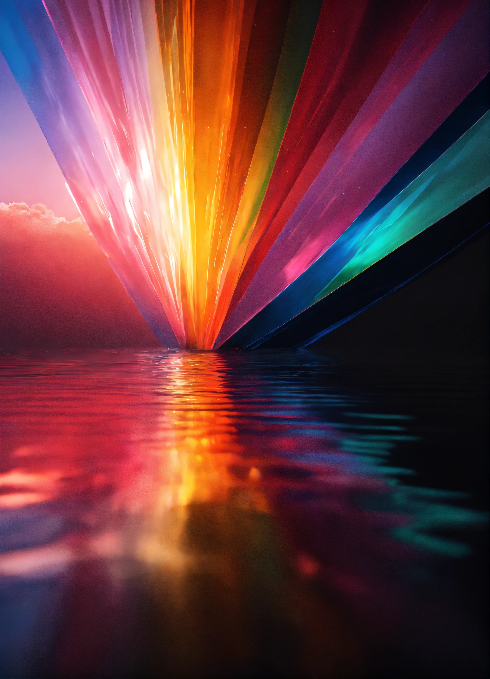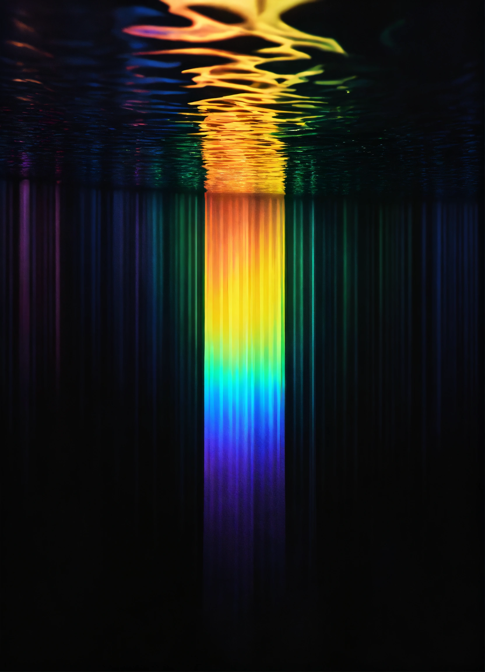 Hyper realistic opaque rainbow crystal rays of light reflecting on water with black background minimalist