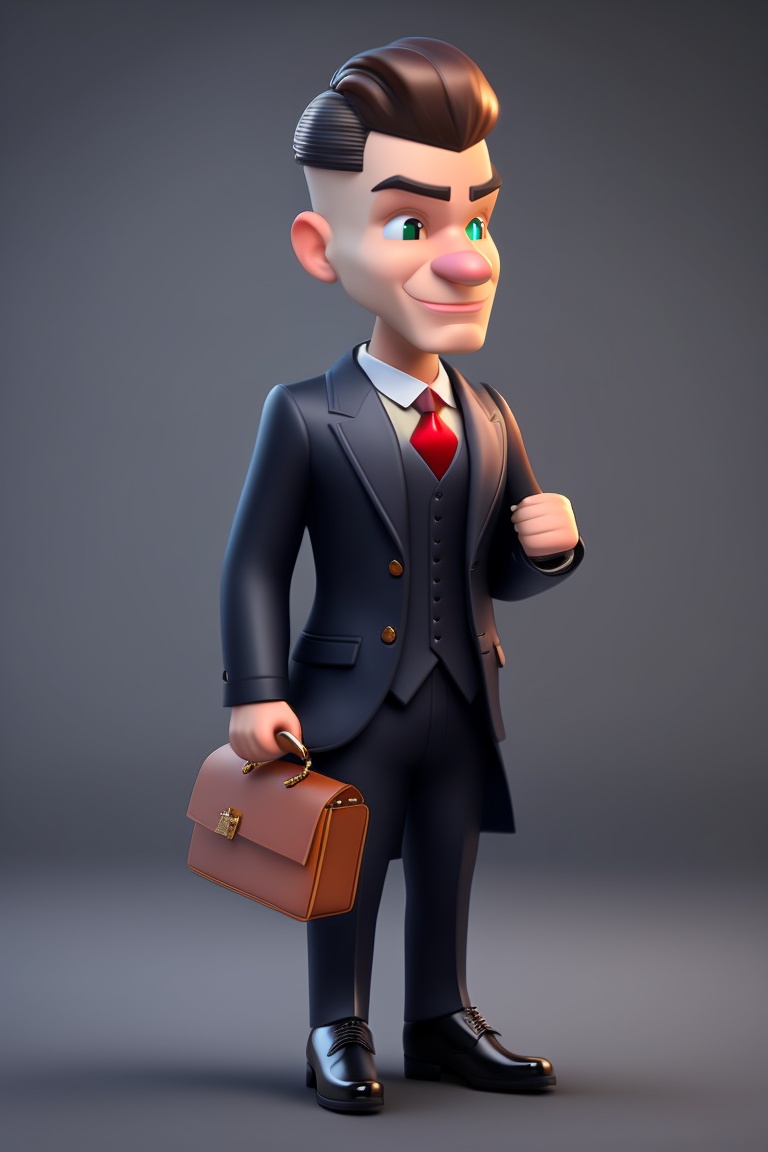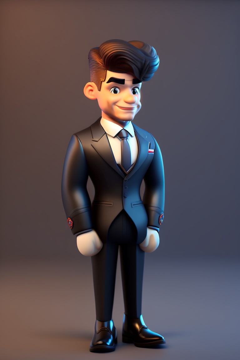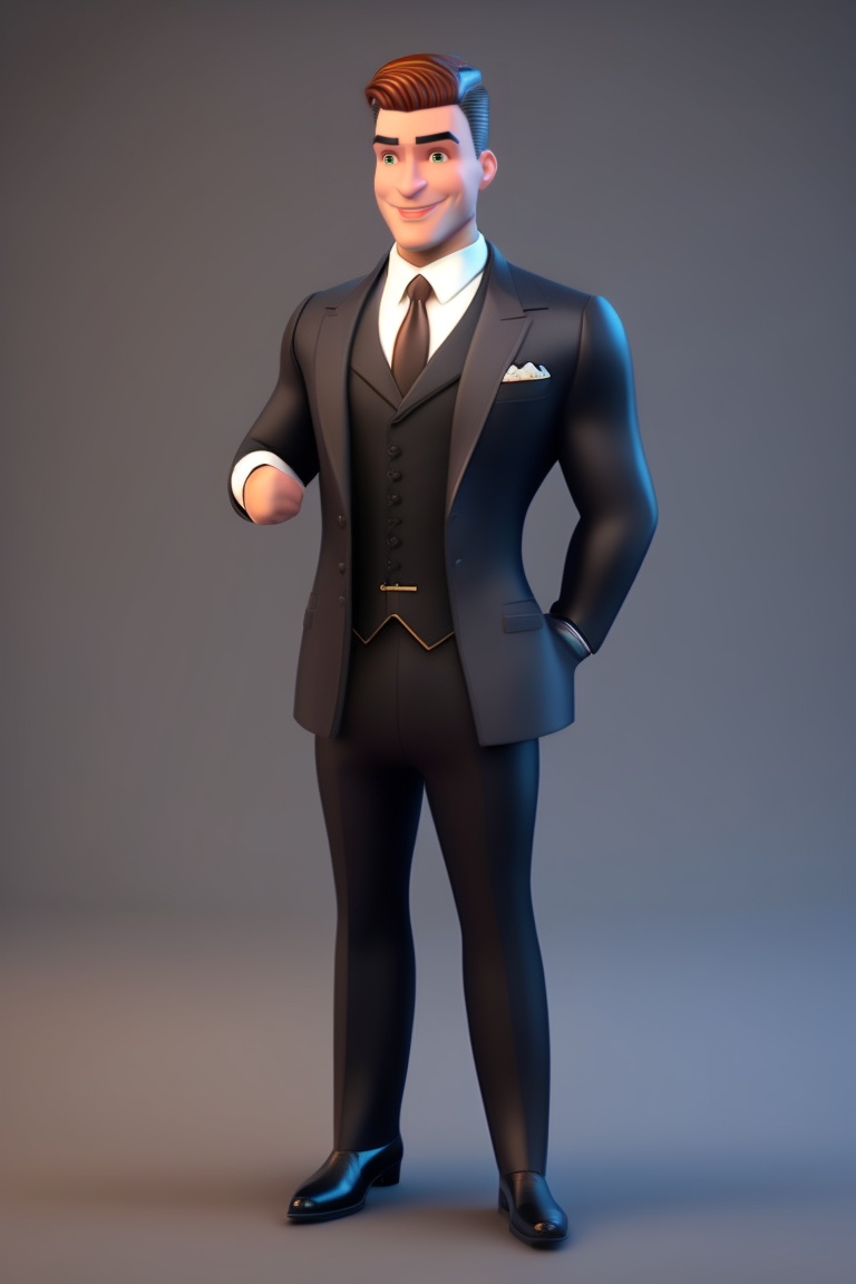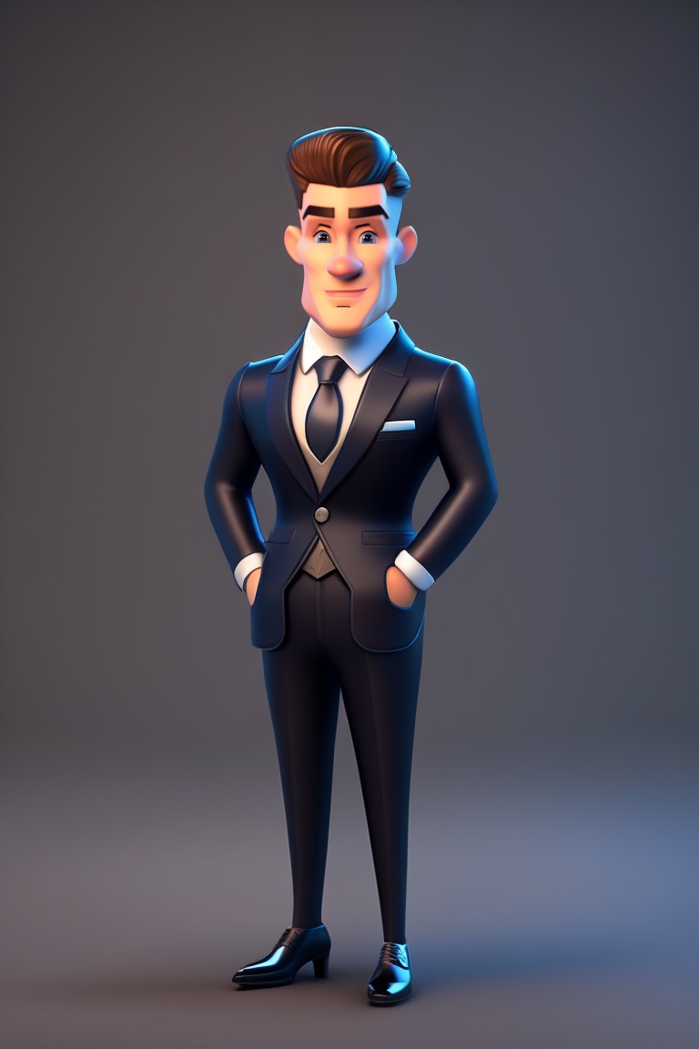 A classy british ai butler dressed in a business suit age 30. 8k, 3d disney character animated style. dark grey background