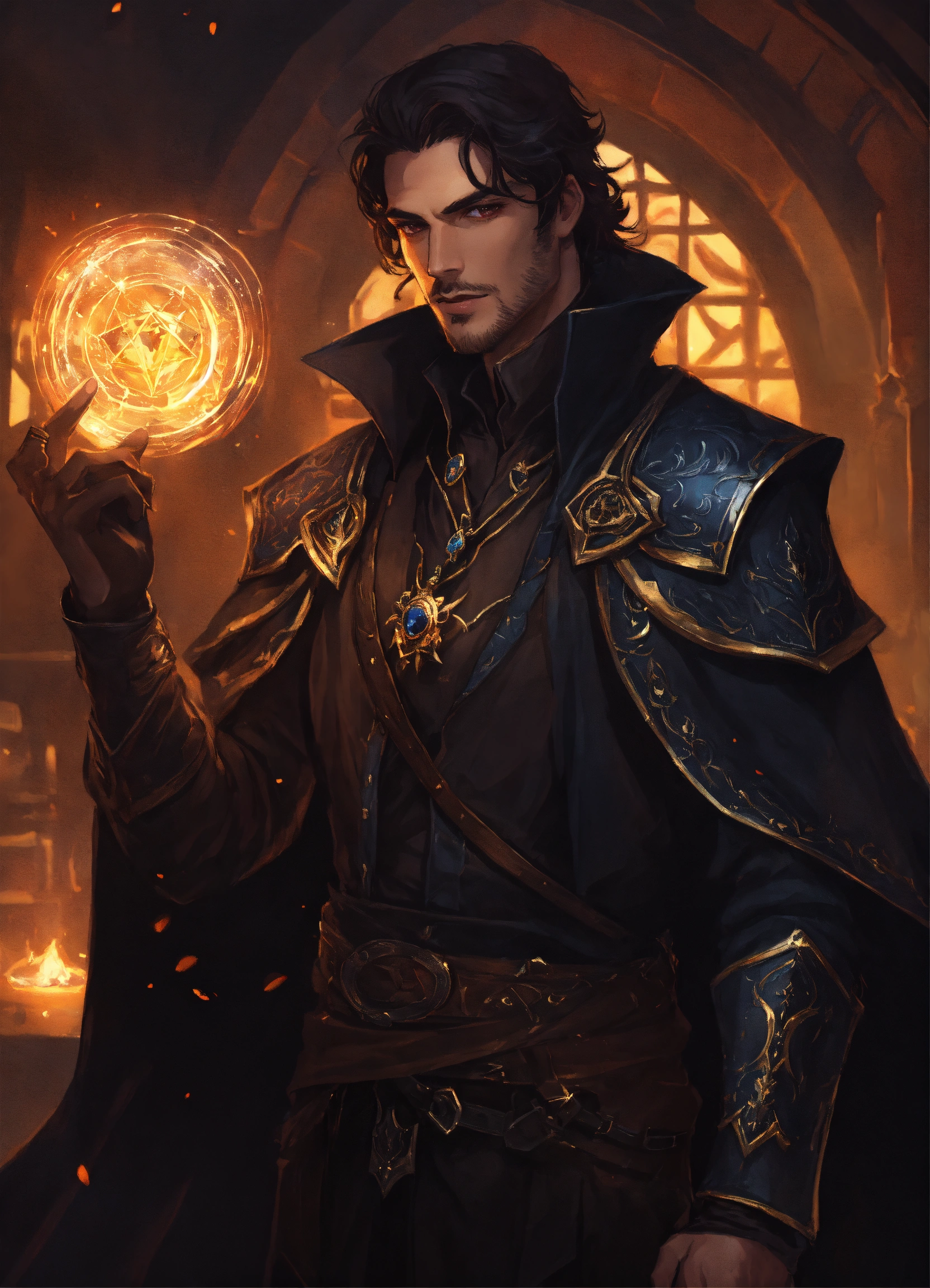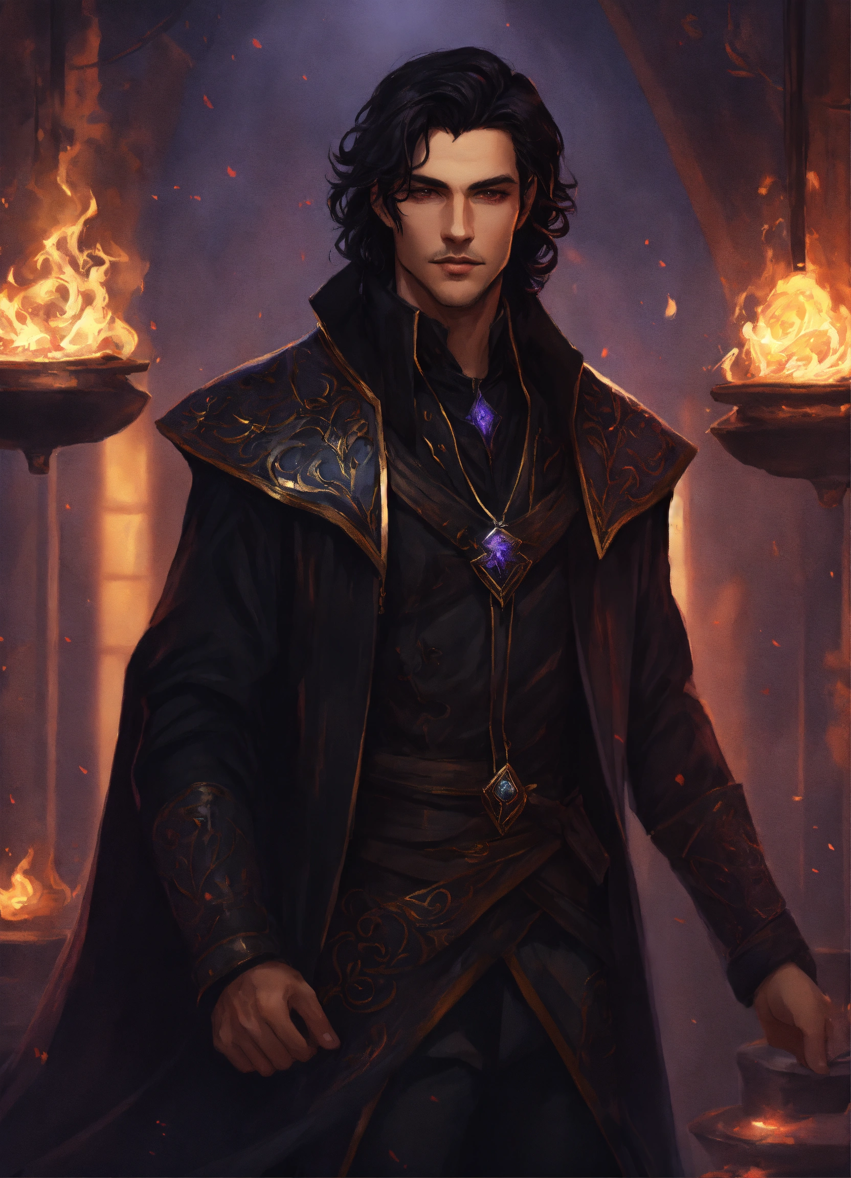 A handsome warlock with dark magic and medium length dark hair wearing all black with dark magic circling him dnd character art