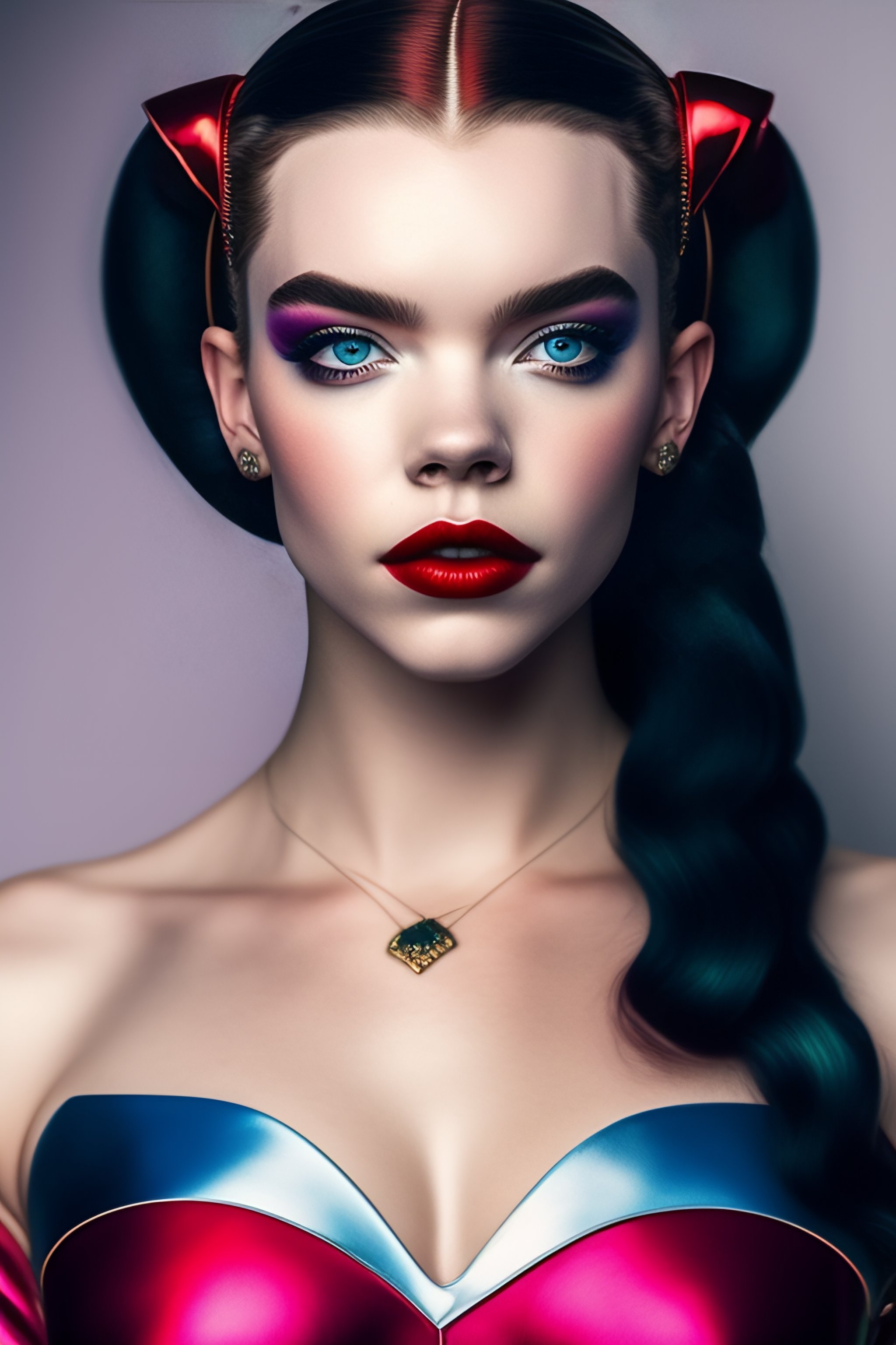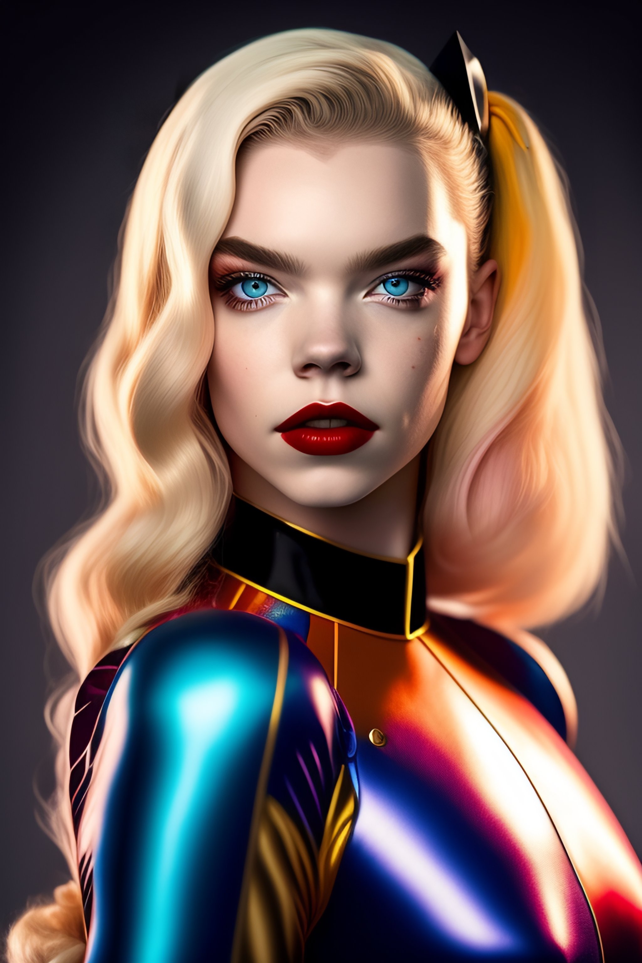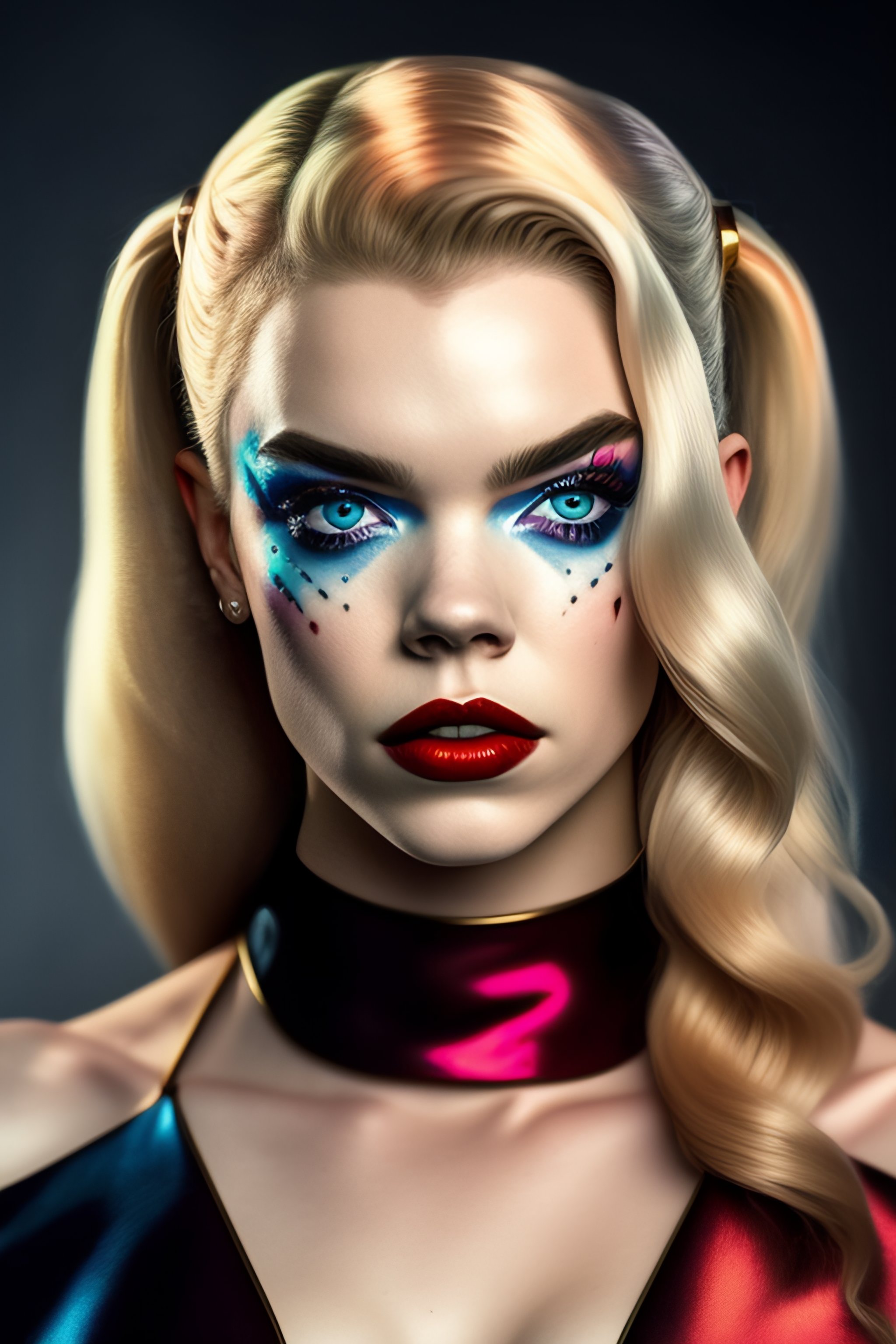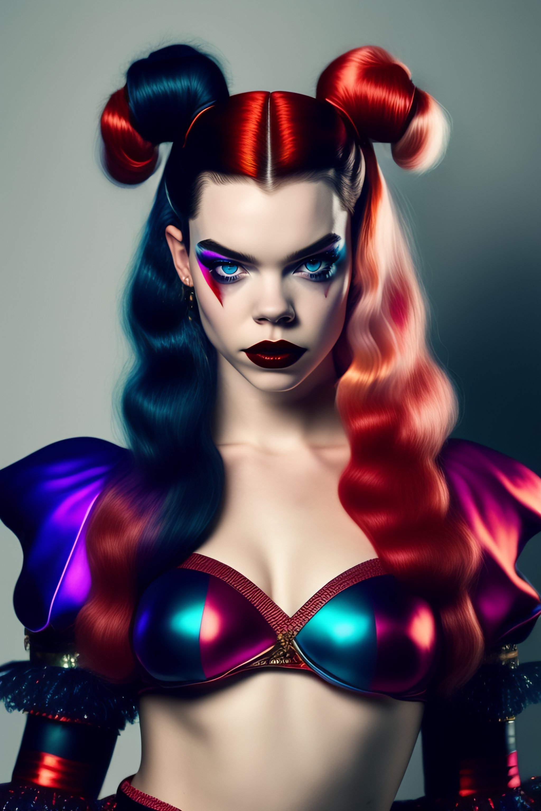 Anya taylor-joy as a beautiful yet crazy looking version of harley quinn, photo shoot quality, hd extremely high quality and highly detailed