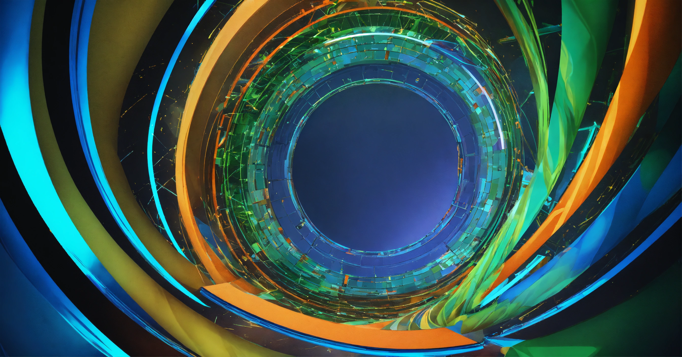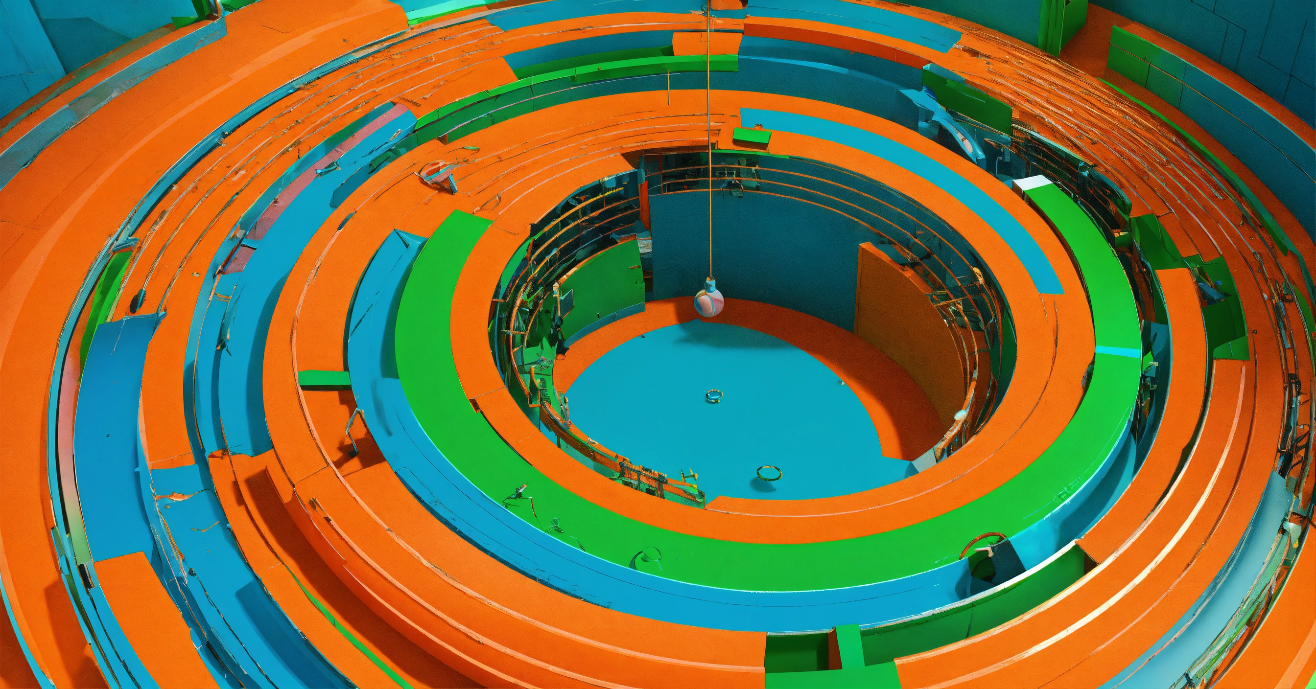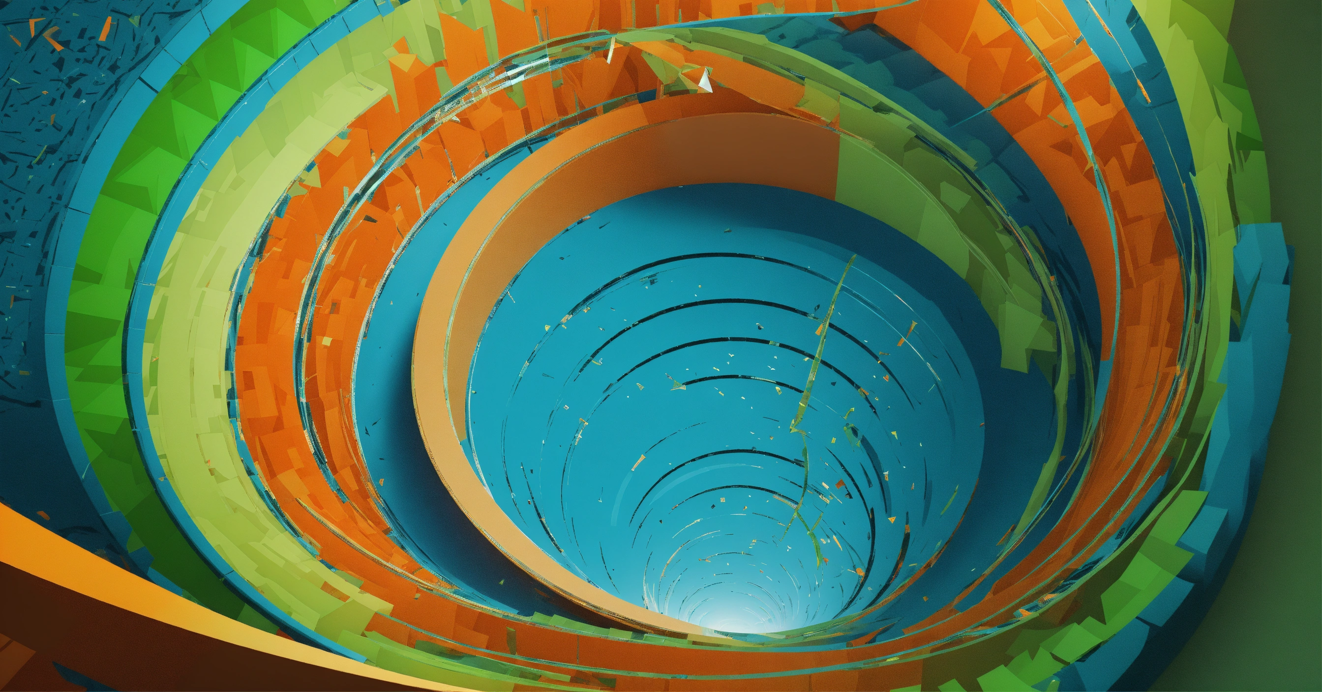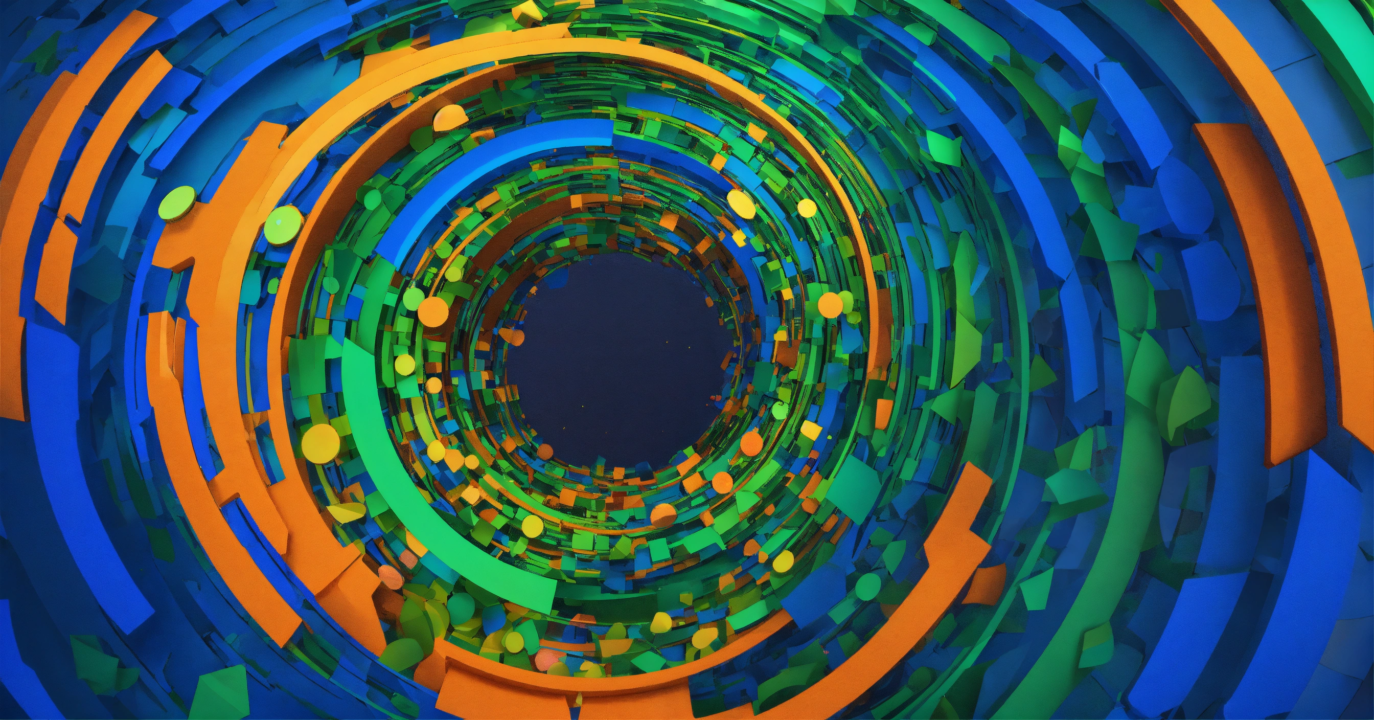 A 3d digital illustration of 360 degrees, using circles and curved arrows, done in blue, green, and orange.