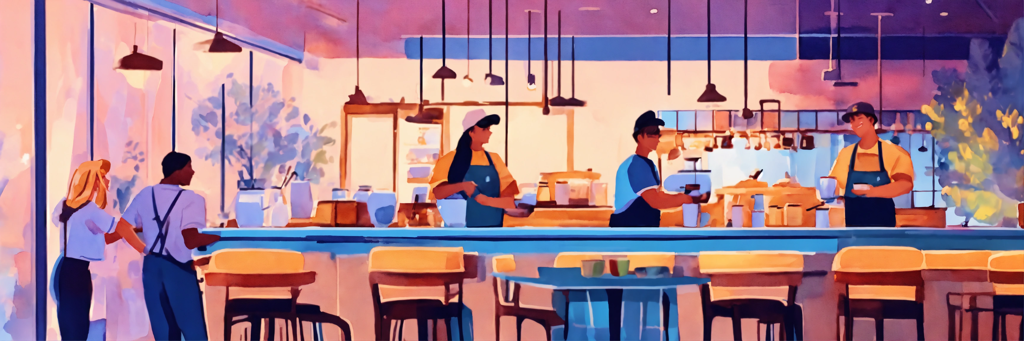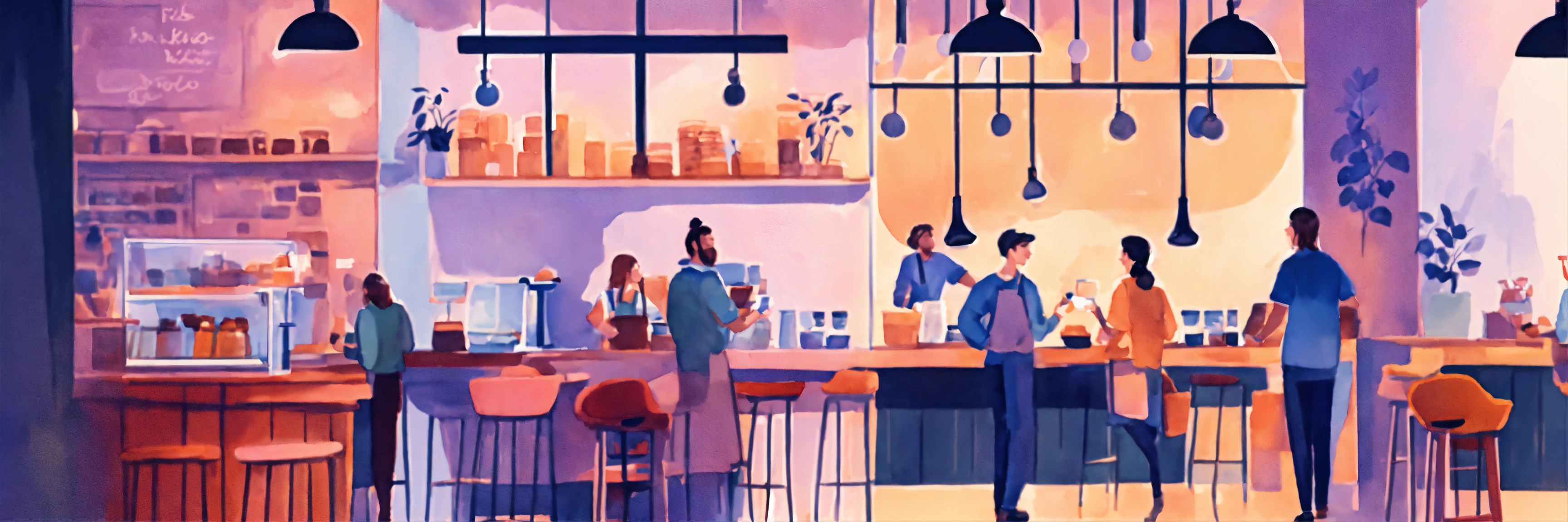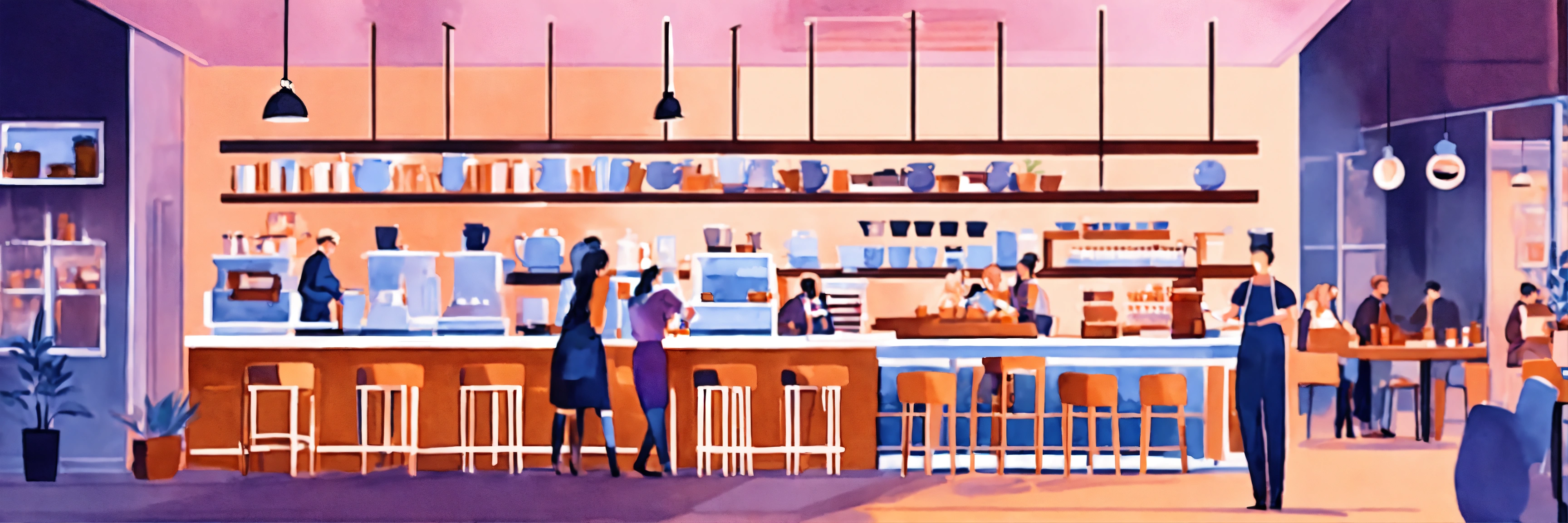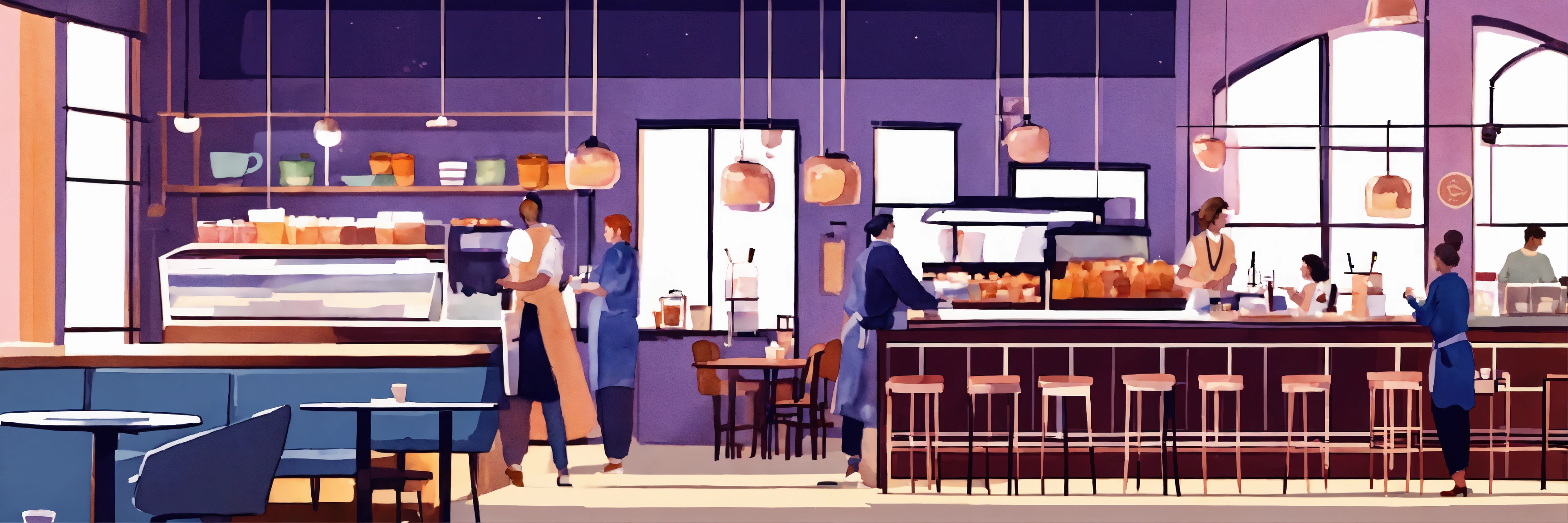 A picture of coffee shop employees making coffee or happy customers in the cozy cafe interior. style flat illustration, minimalist, watercolor, blue, violet.