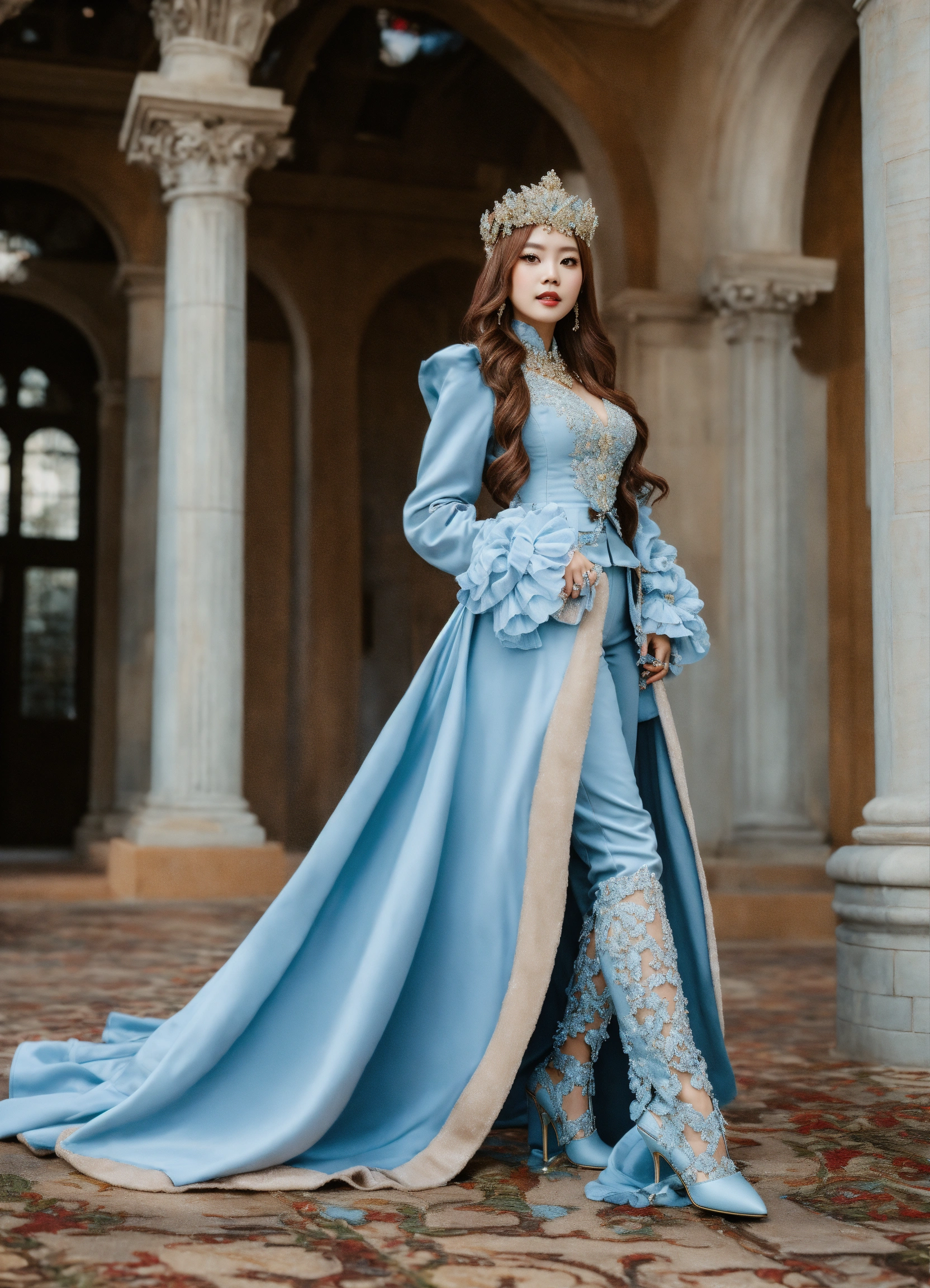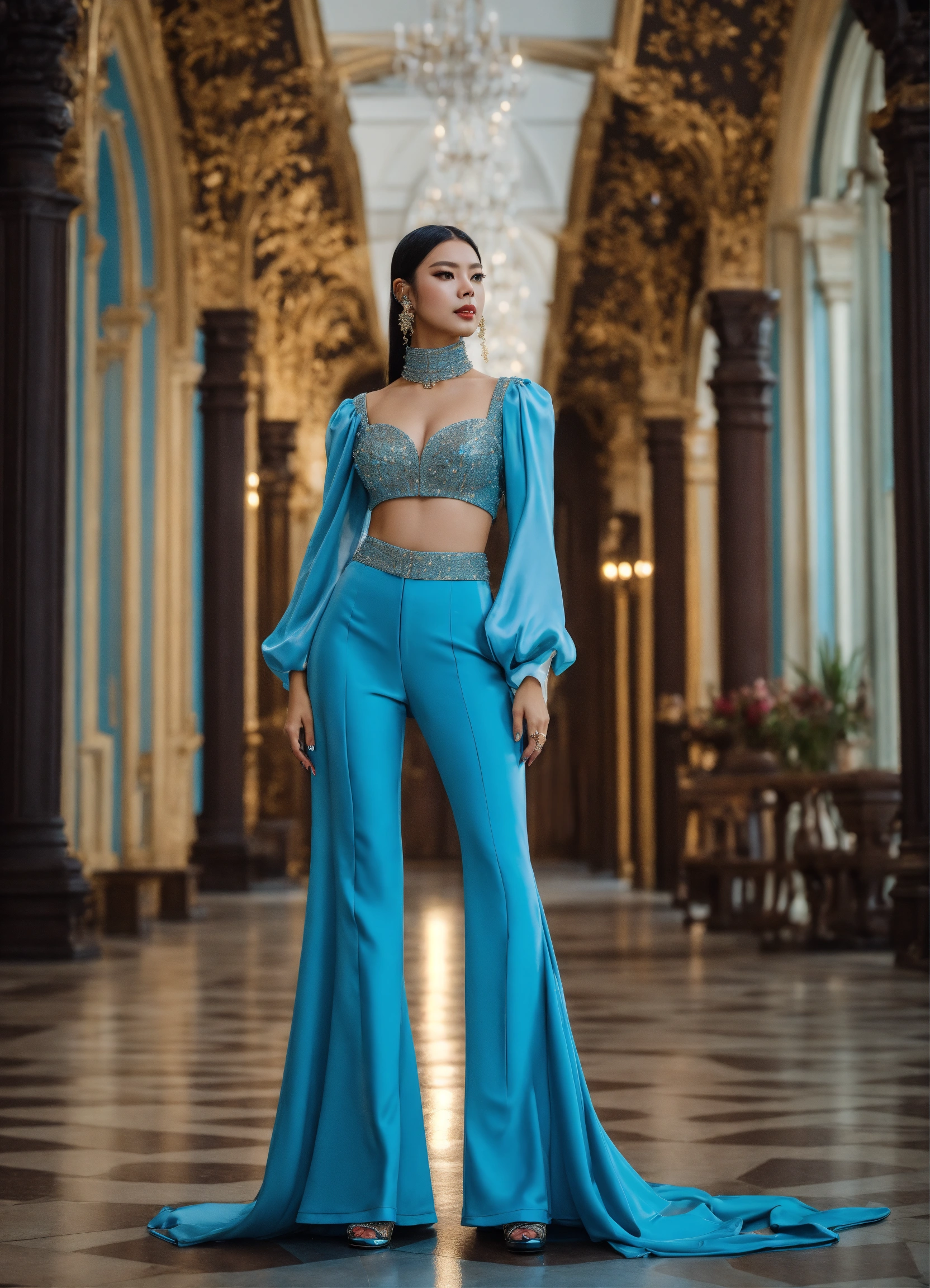 Jiu sparkly fashionable baby blue and hold renaissance outfit with pants and high heels
