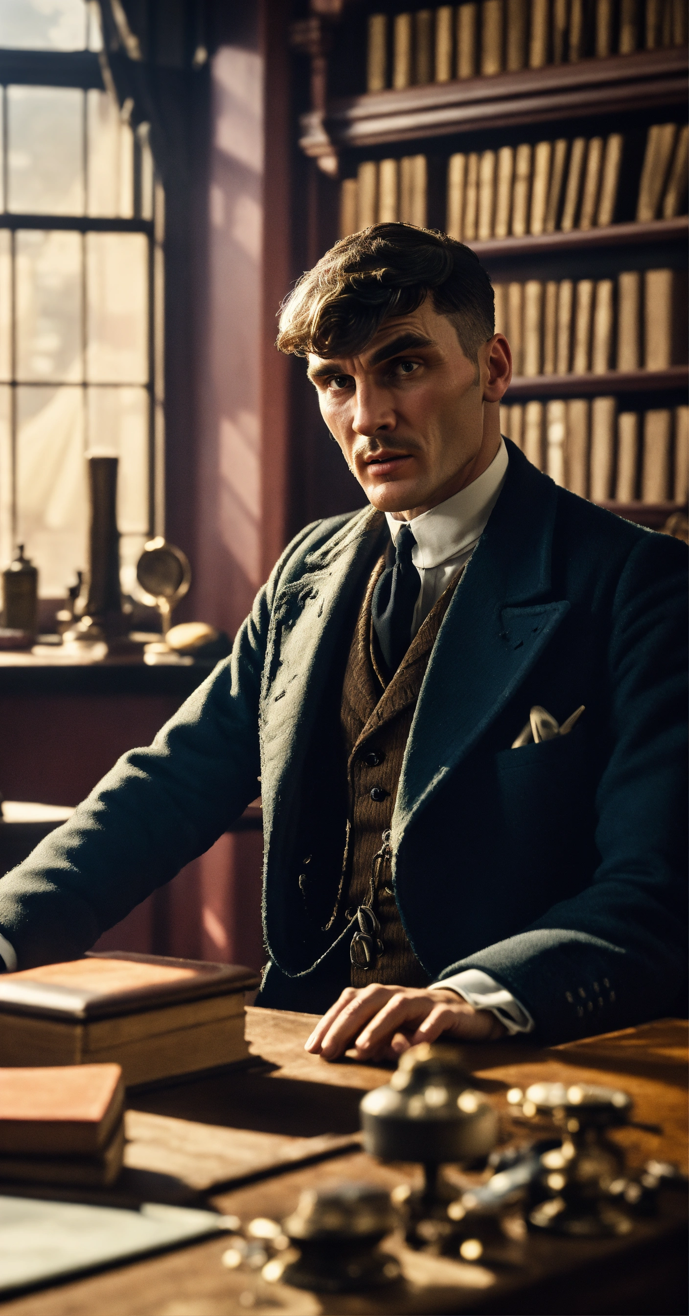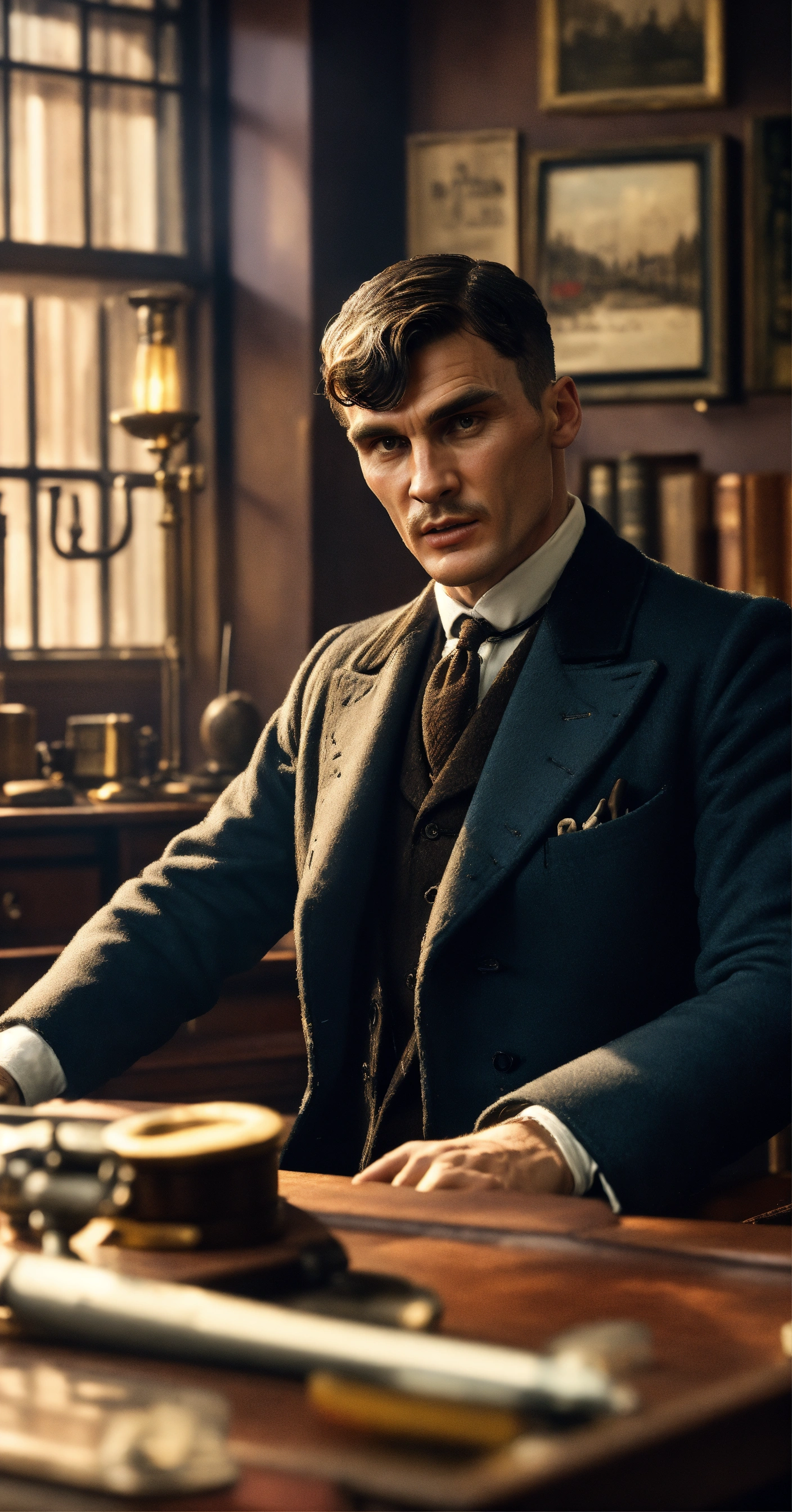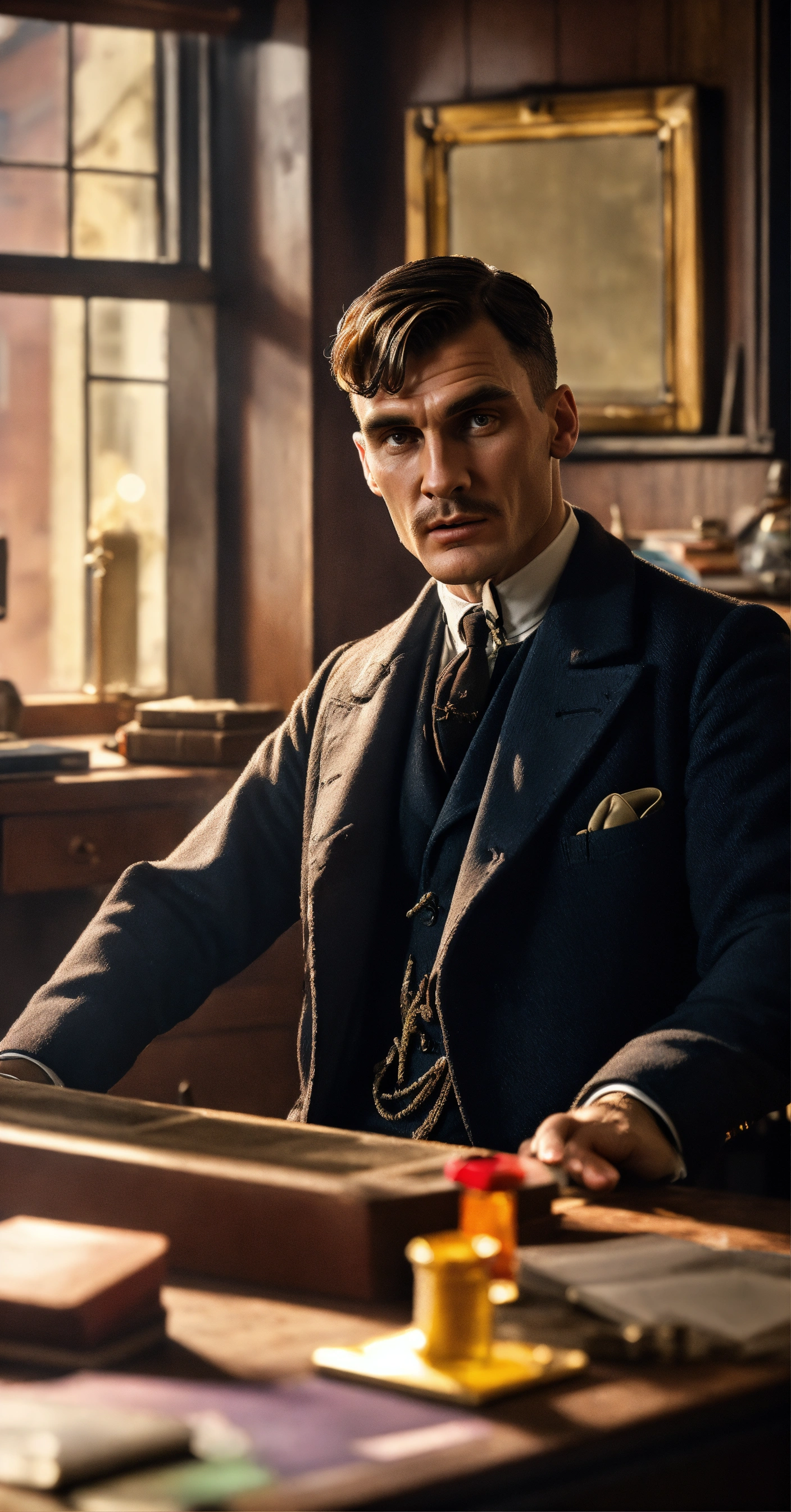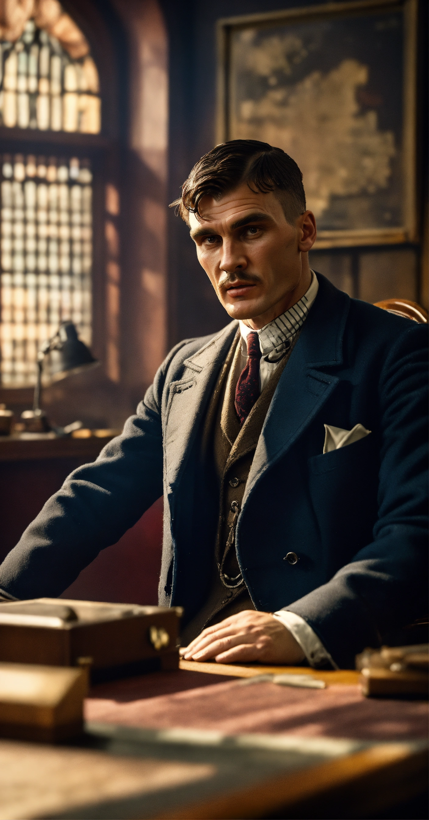Character in the style of thomas shelby, front view, brightly colored image background, placing the character sitting behind a desk, looking towards the camera, with a large window behind, sharp focus, dramatic spotlighting, very detailed, 8k, autofocus creates an incredibly realistic image, slight blur in the background, studio quality