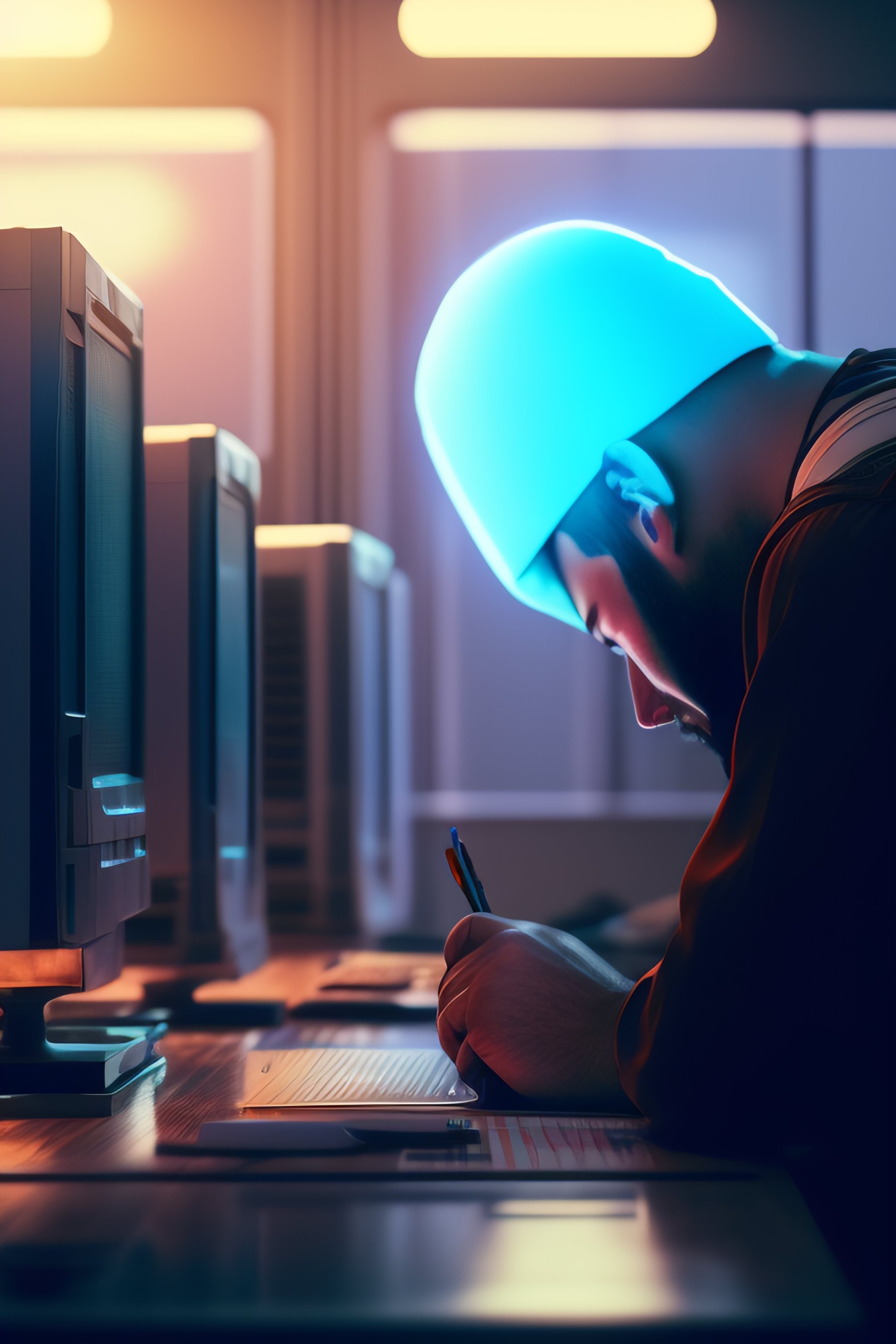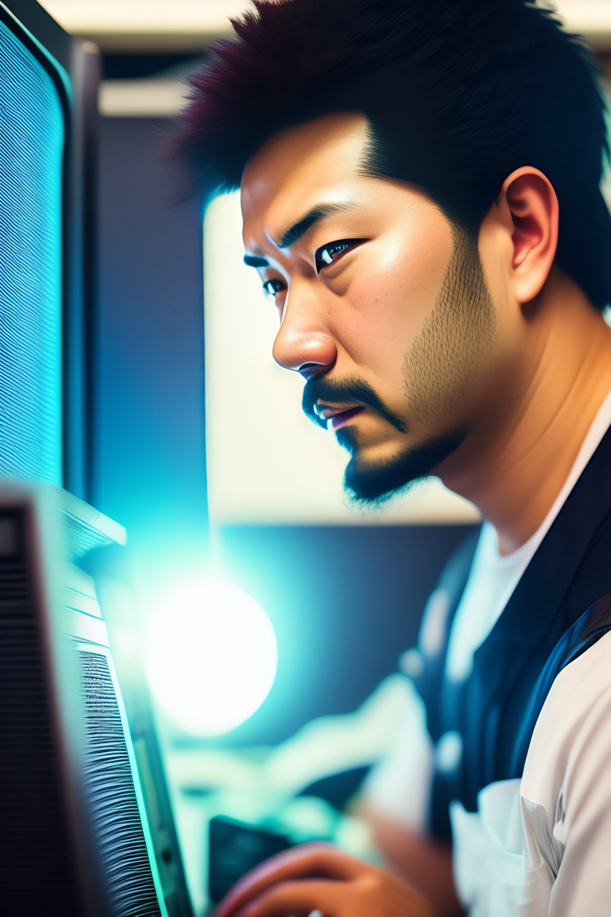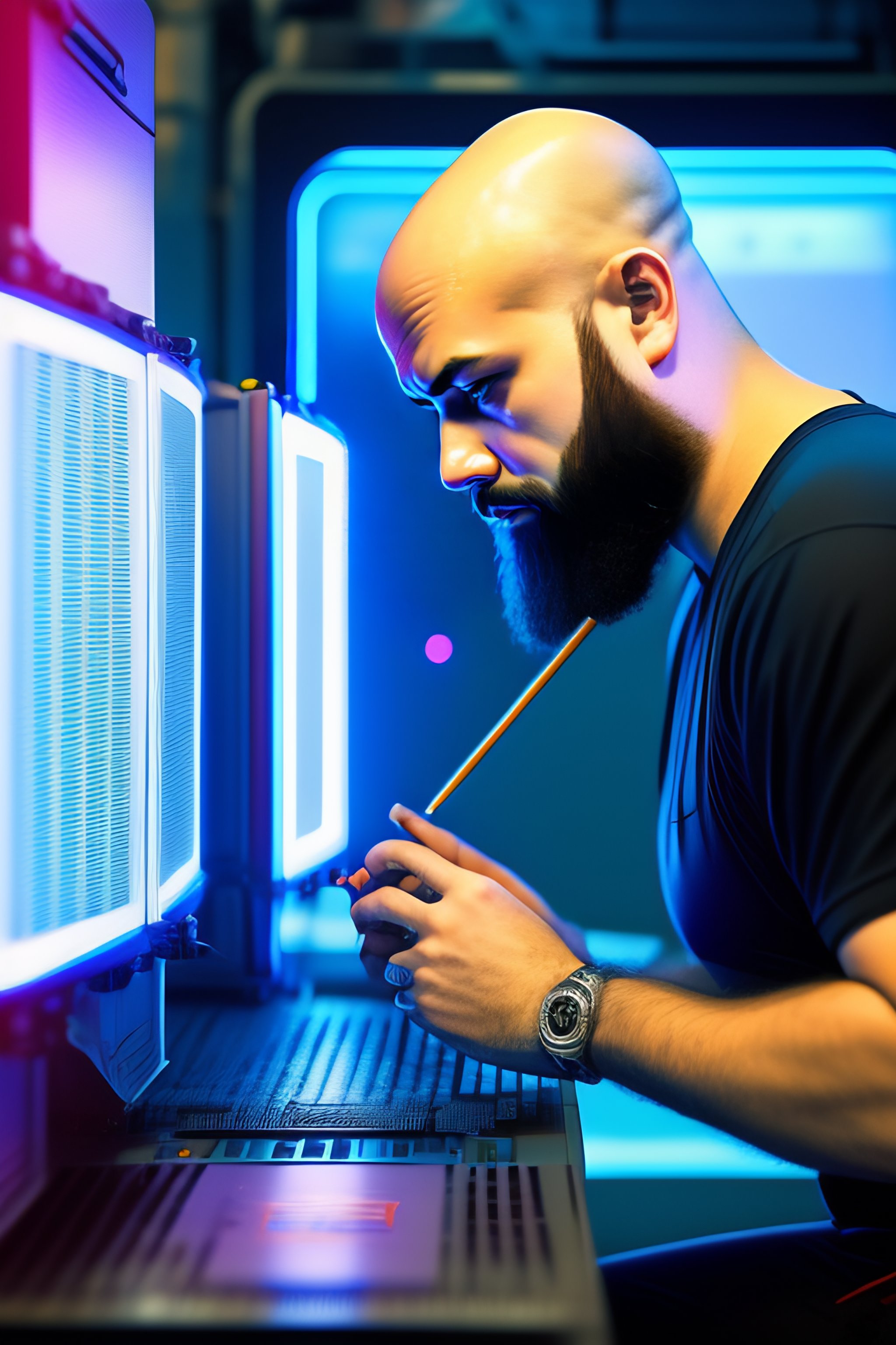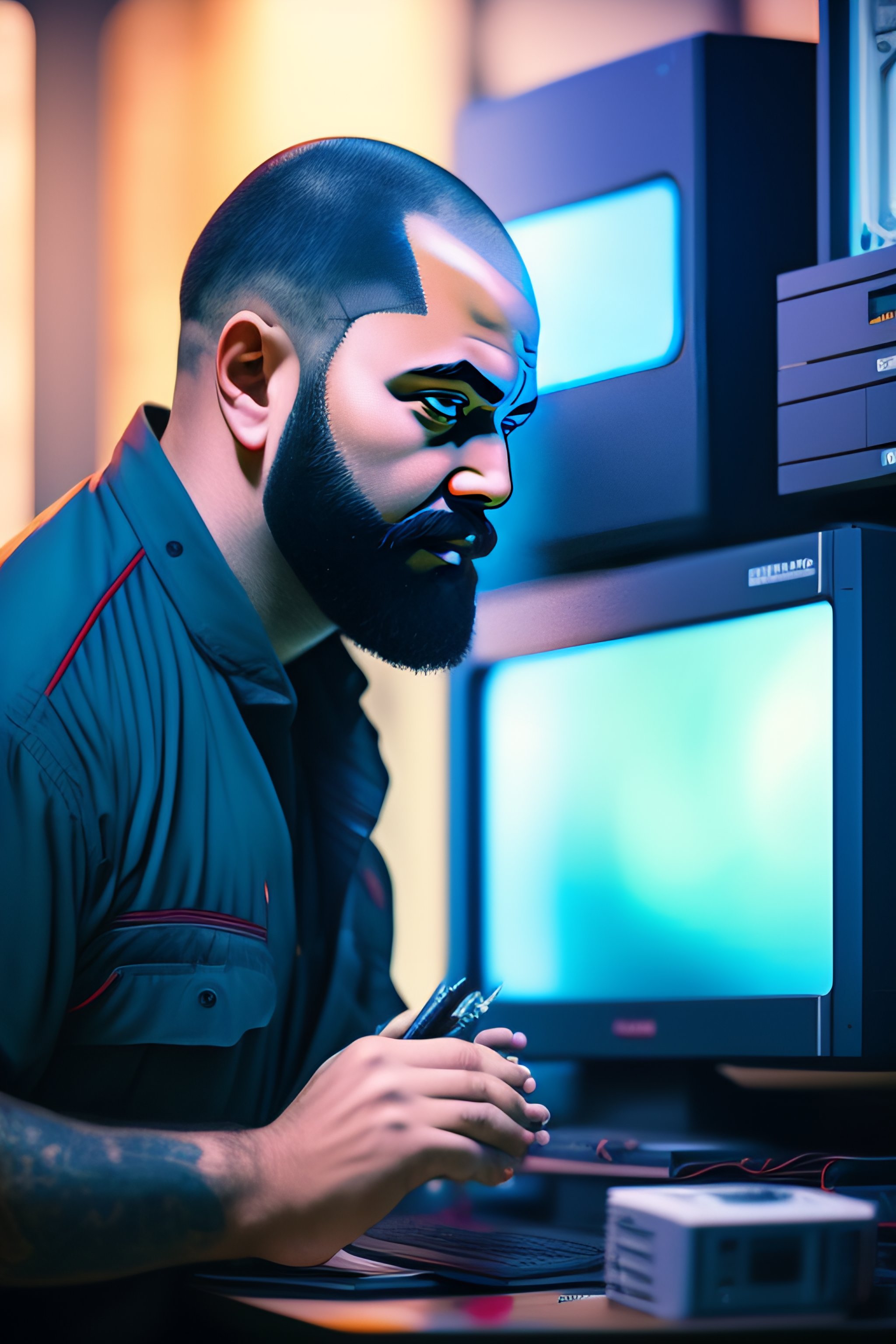 A bald bearded tech support guy fixing computers, repairing computers, anime, retro anime, 1980s anime, 1990s anime, ghost in the shell, serial experiments lain, 4k, rule of thirds, extreme detail, detailed drawing, trending artstation, hd, sharp focus, backlit, symmetrical features, film grain, digital art, illustration