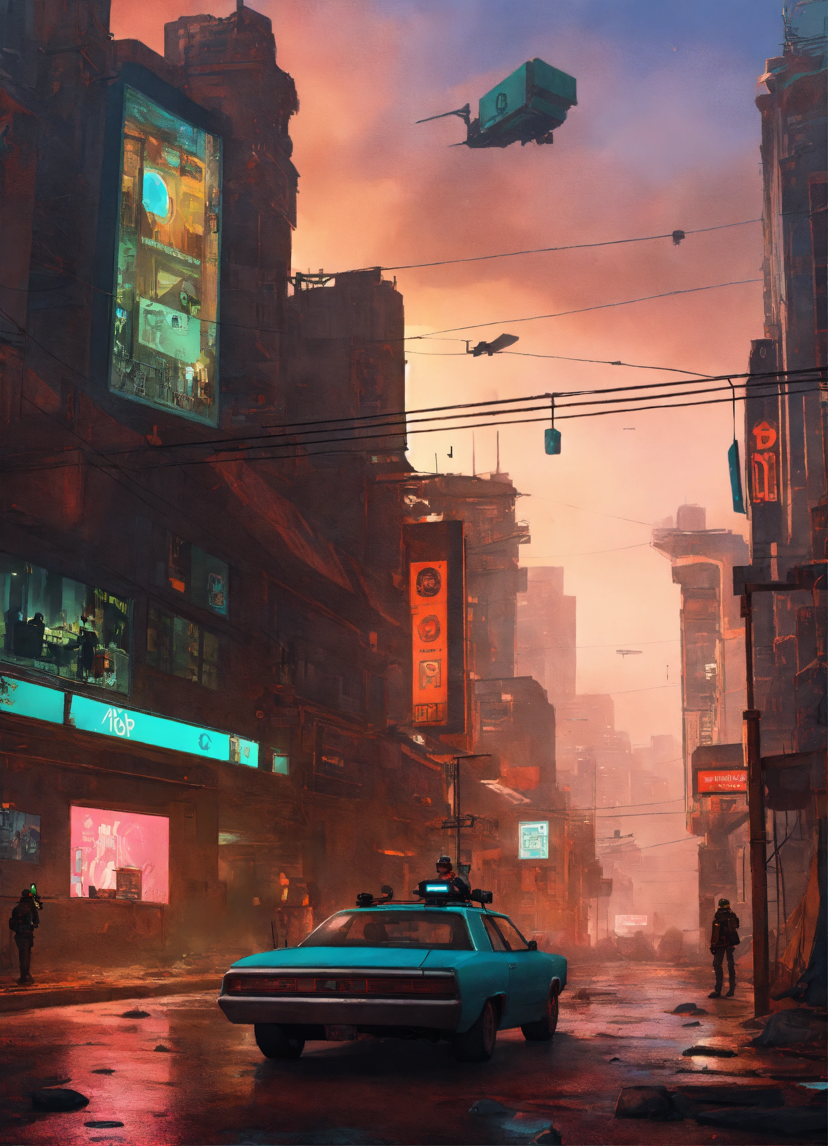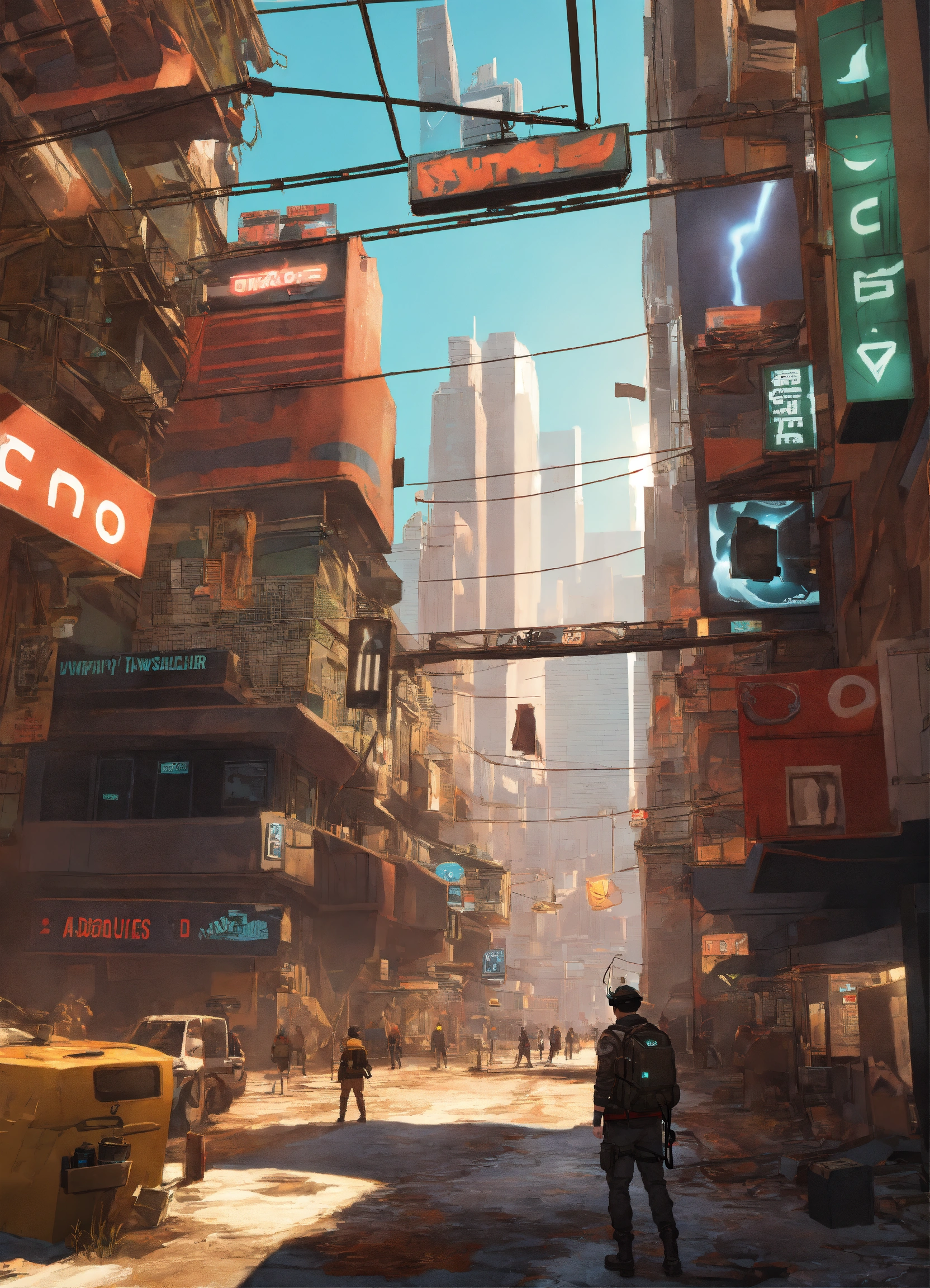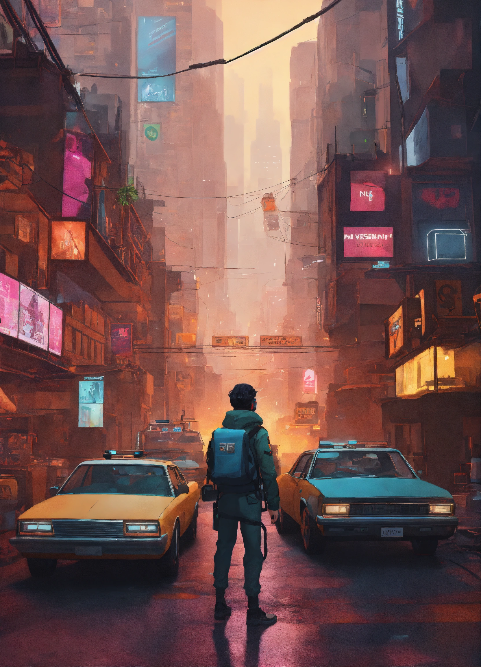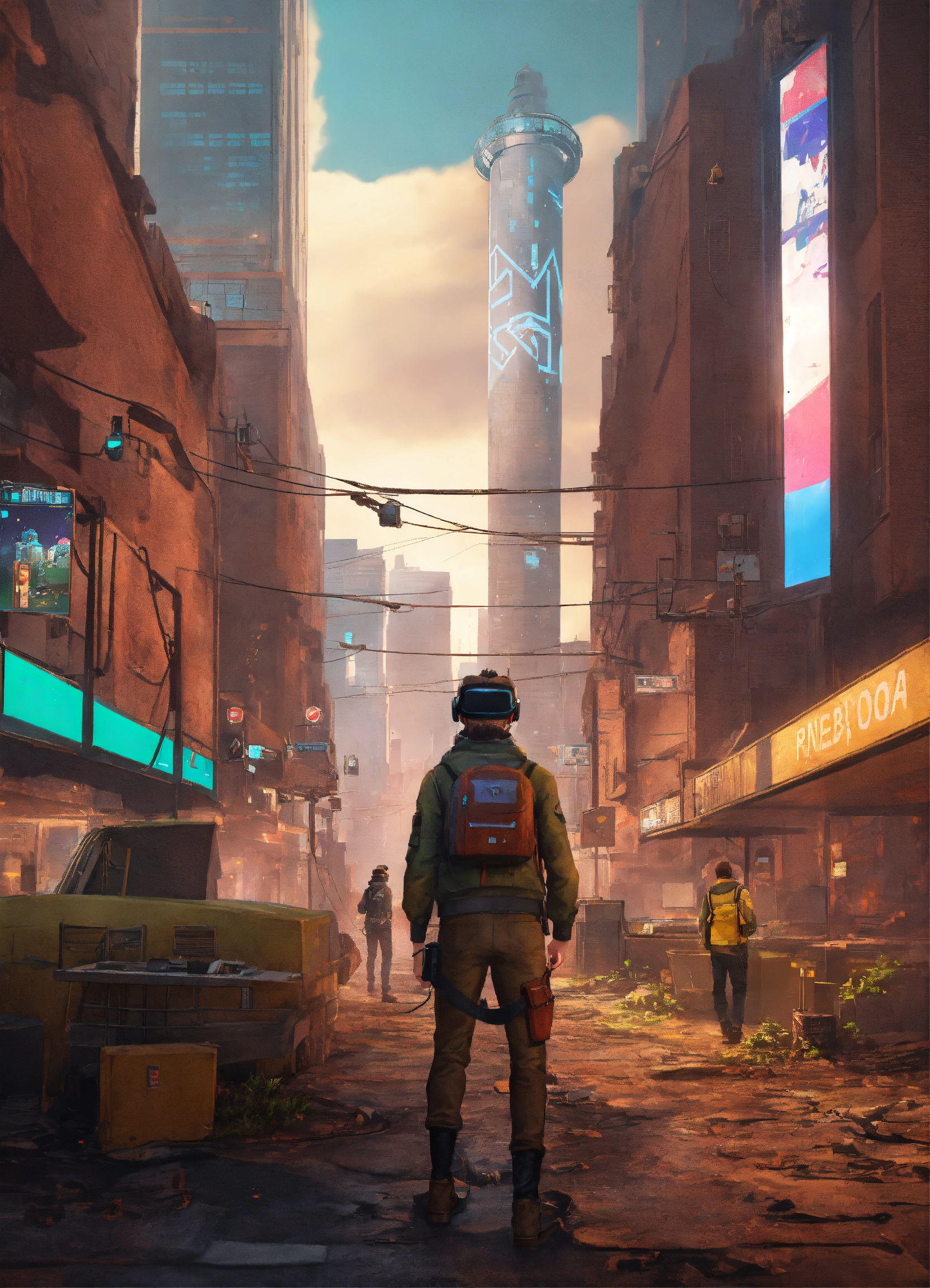 An adventure game set in a dystopian city full of virtual reality, where we see icons of social networks and news.