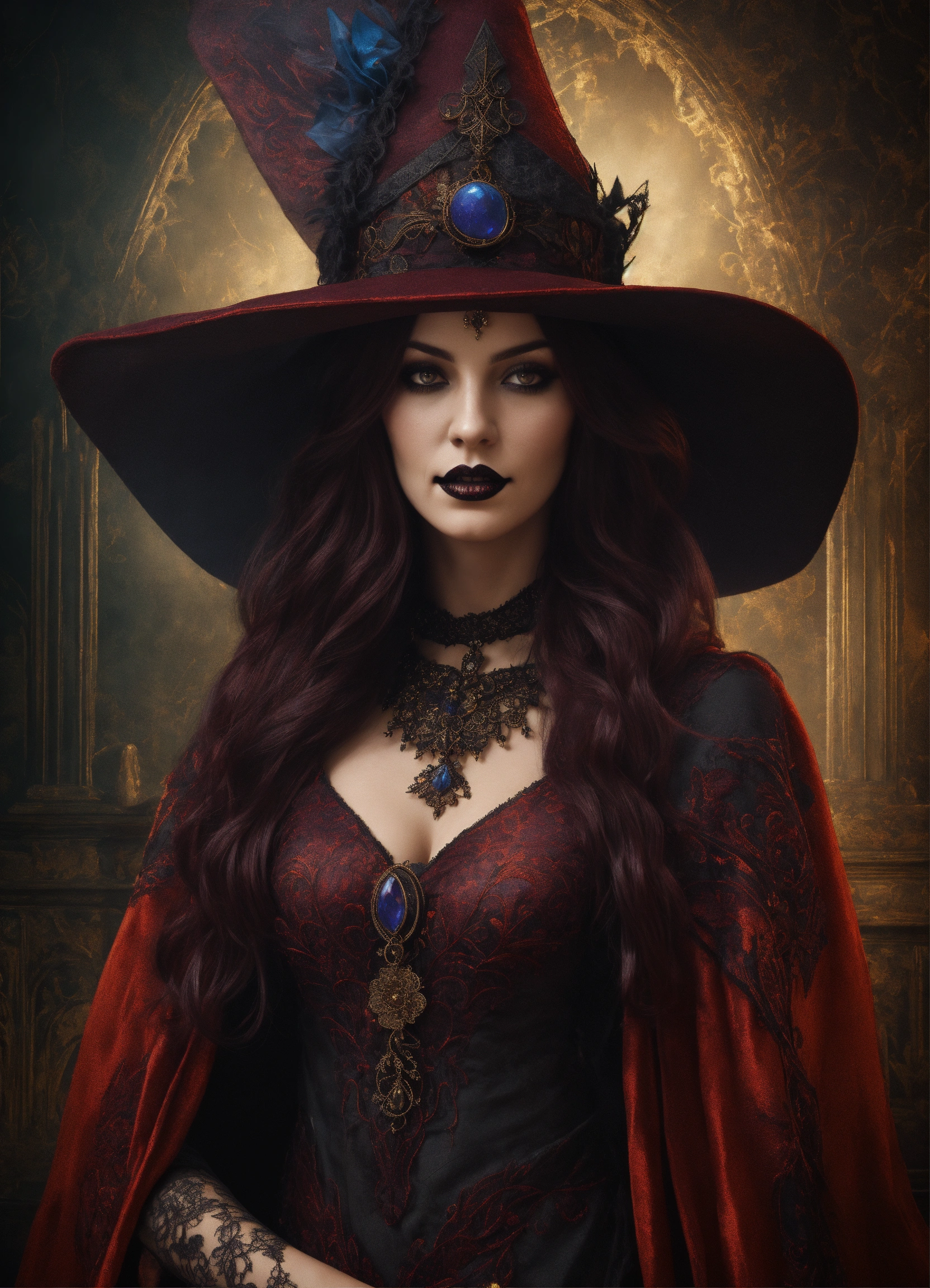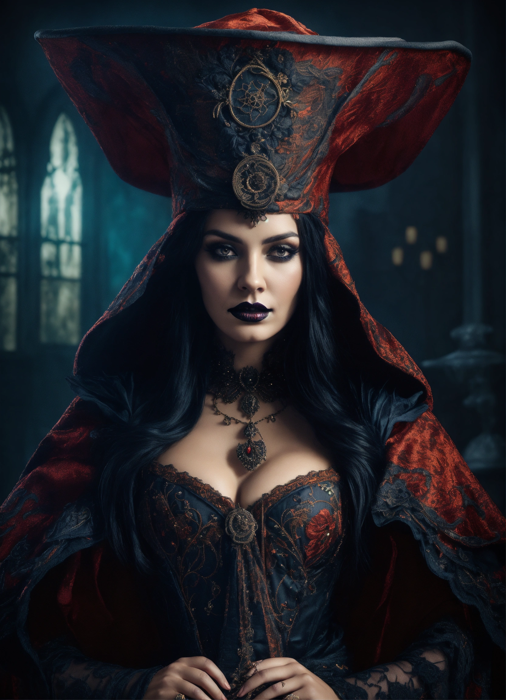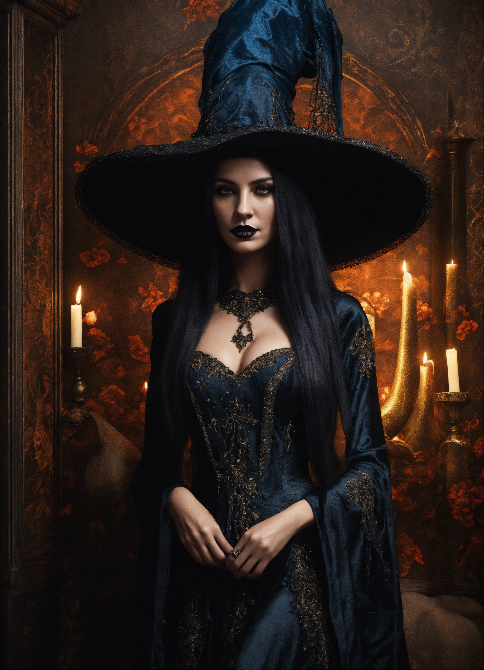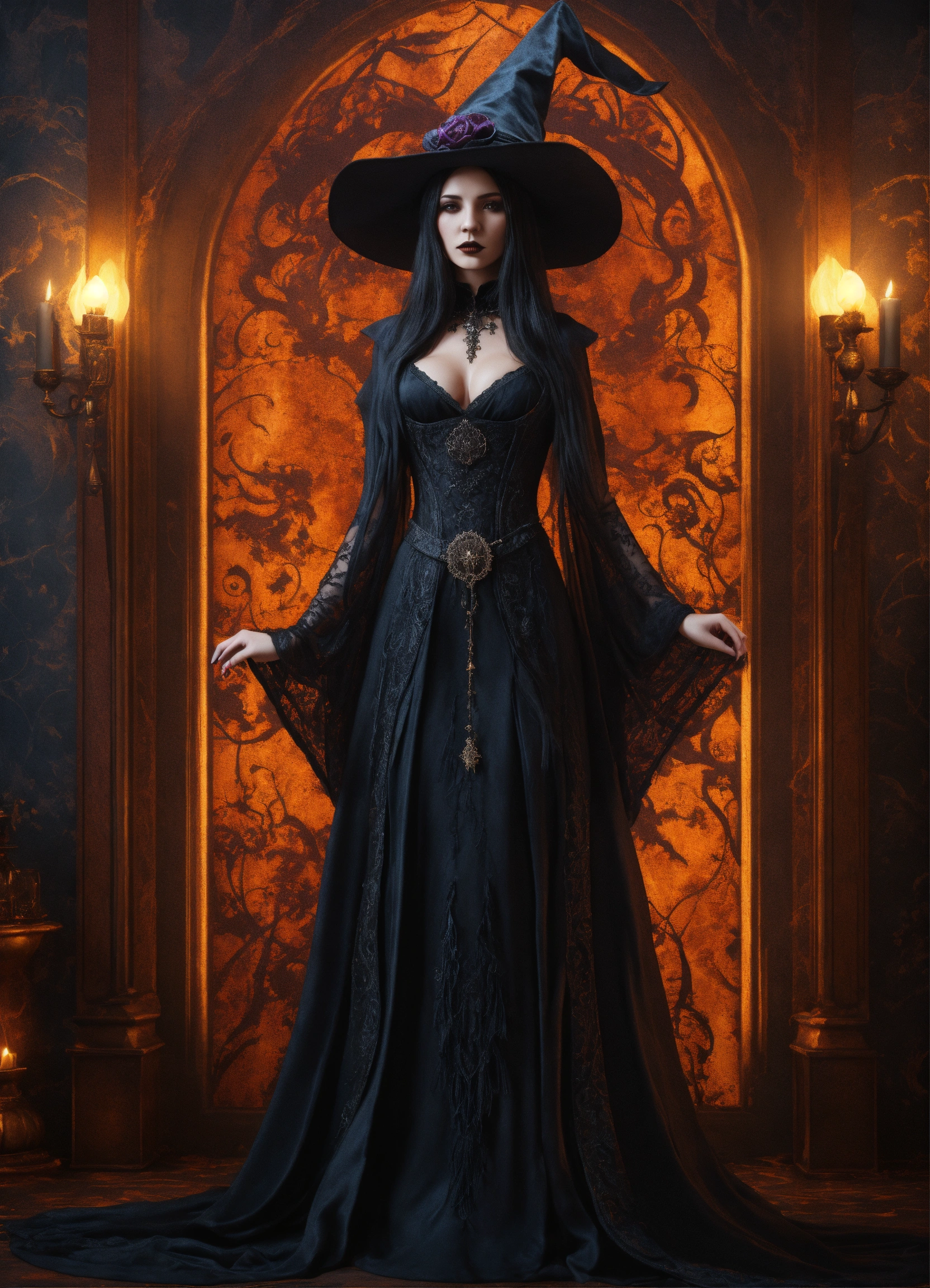 Beautiful gothic dark sorceress with flowing robes in an elegant and intricate costume with a fascinating hat, background with grungy wallpaper, 3d, 32k, photorealistic and very detailed. detailed and realistic skin texture, halloween colours and elements.