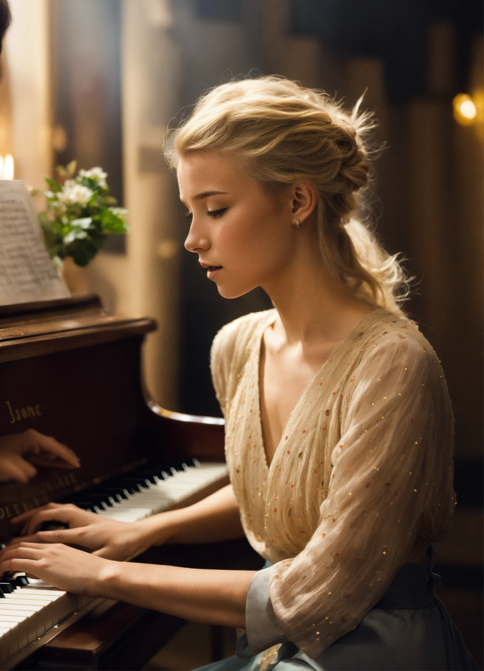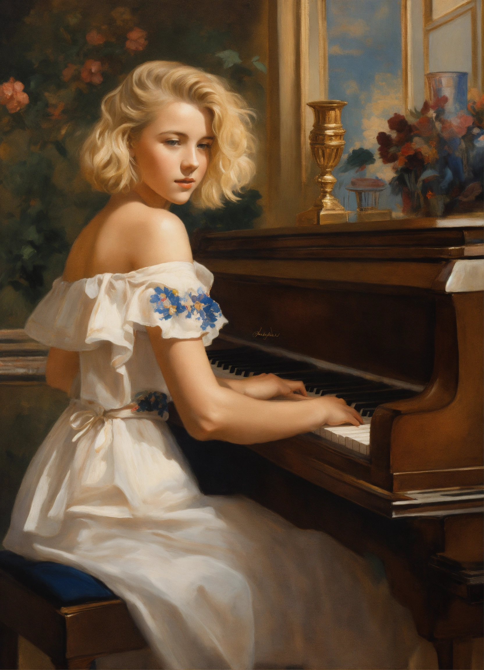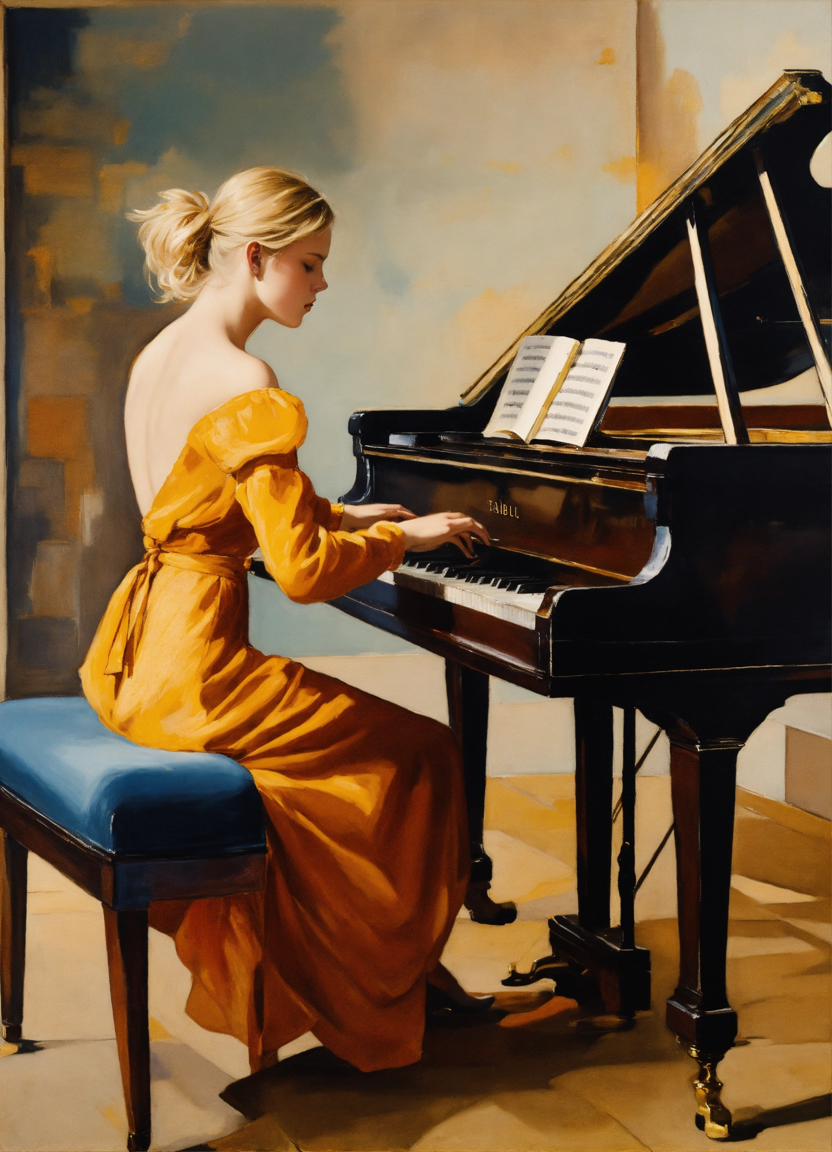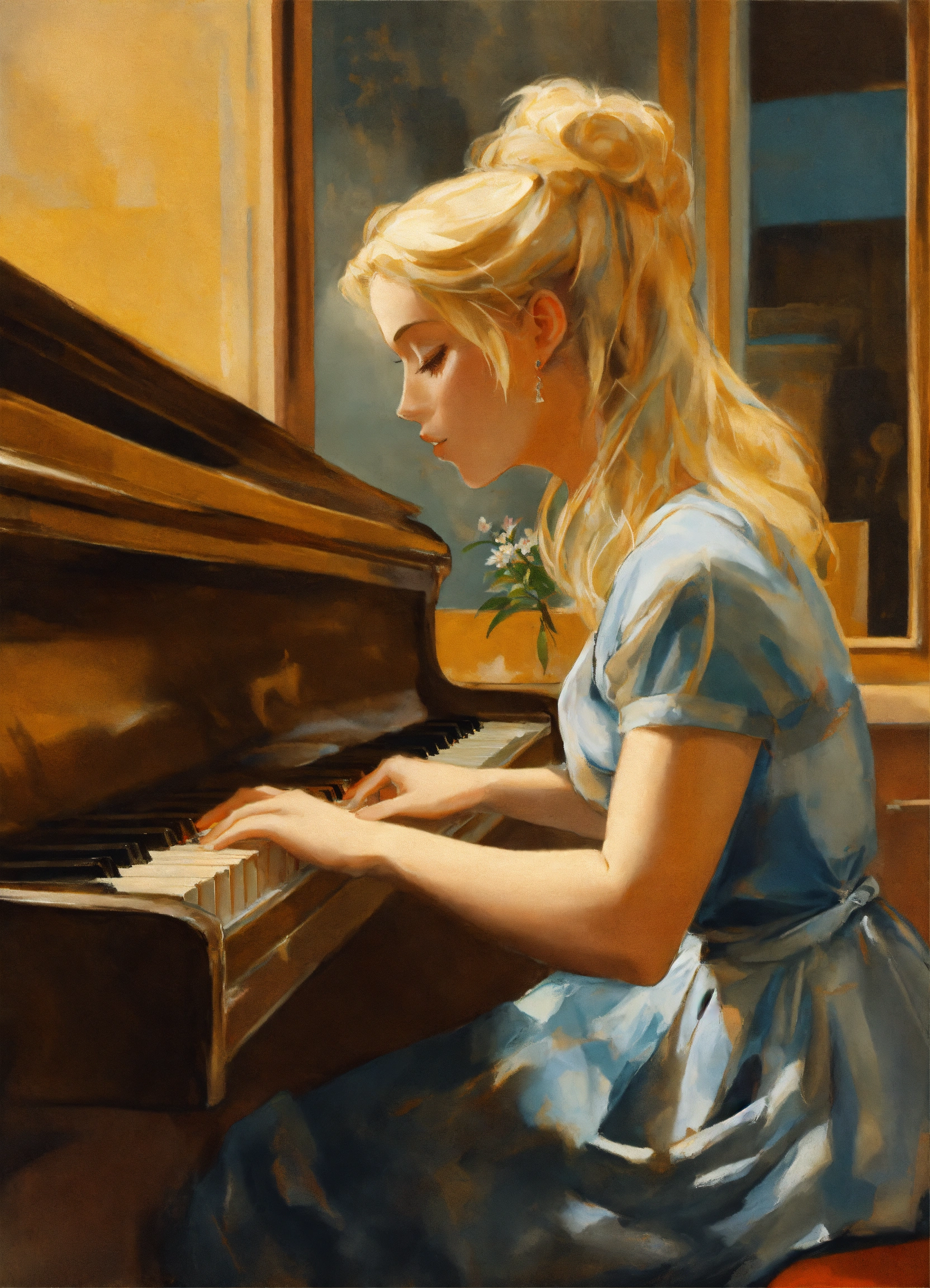 Tableau d'une jeune femme ronde et blonde qui joue du piano