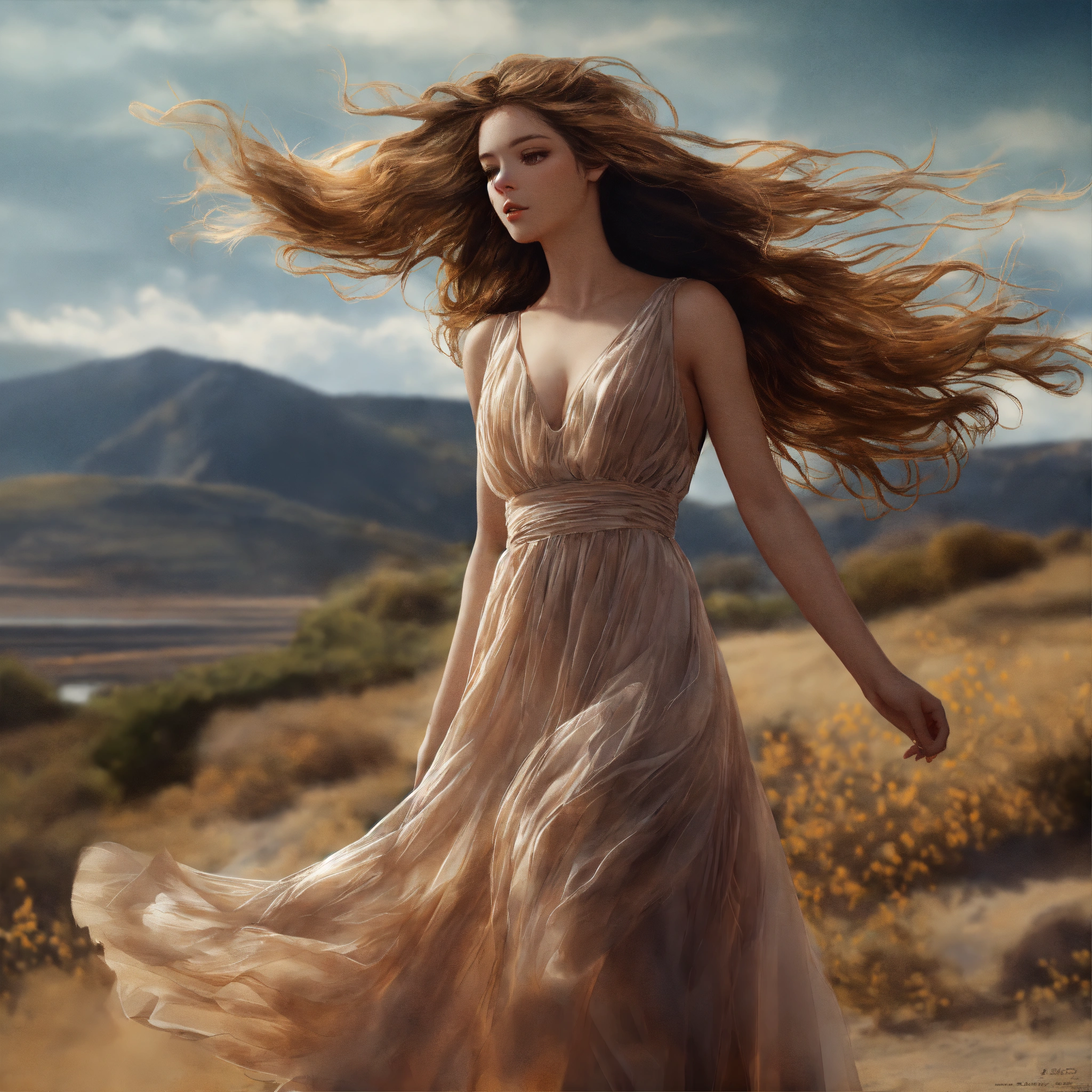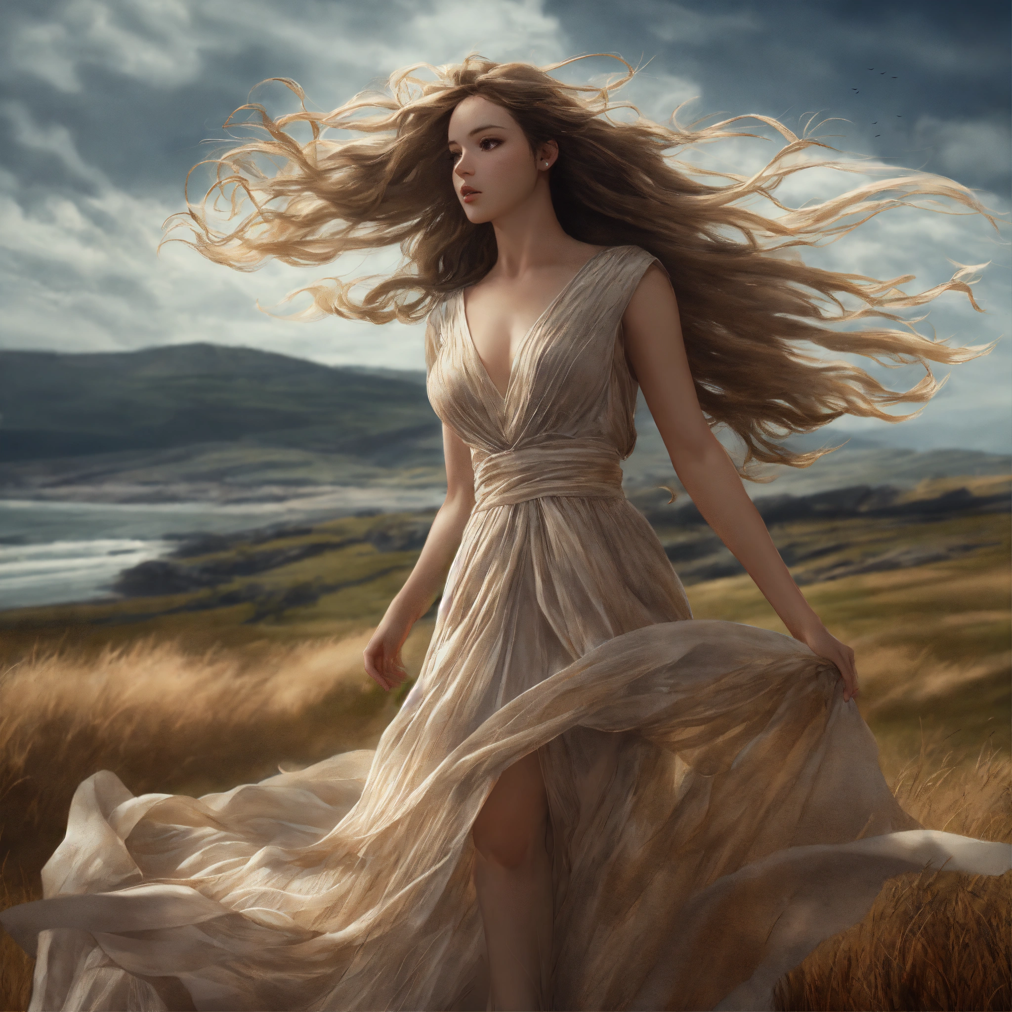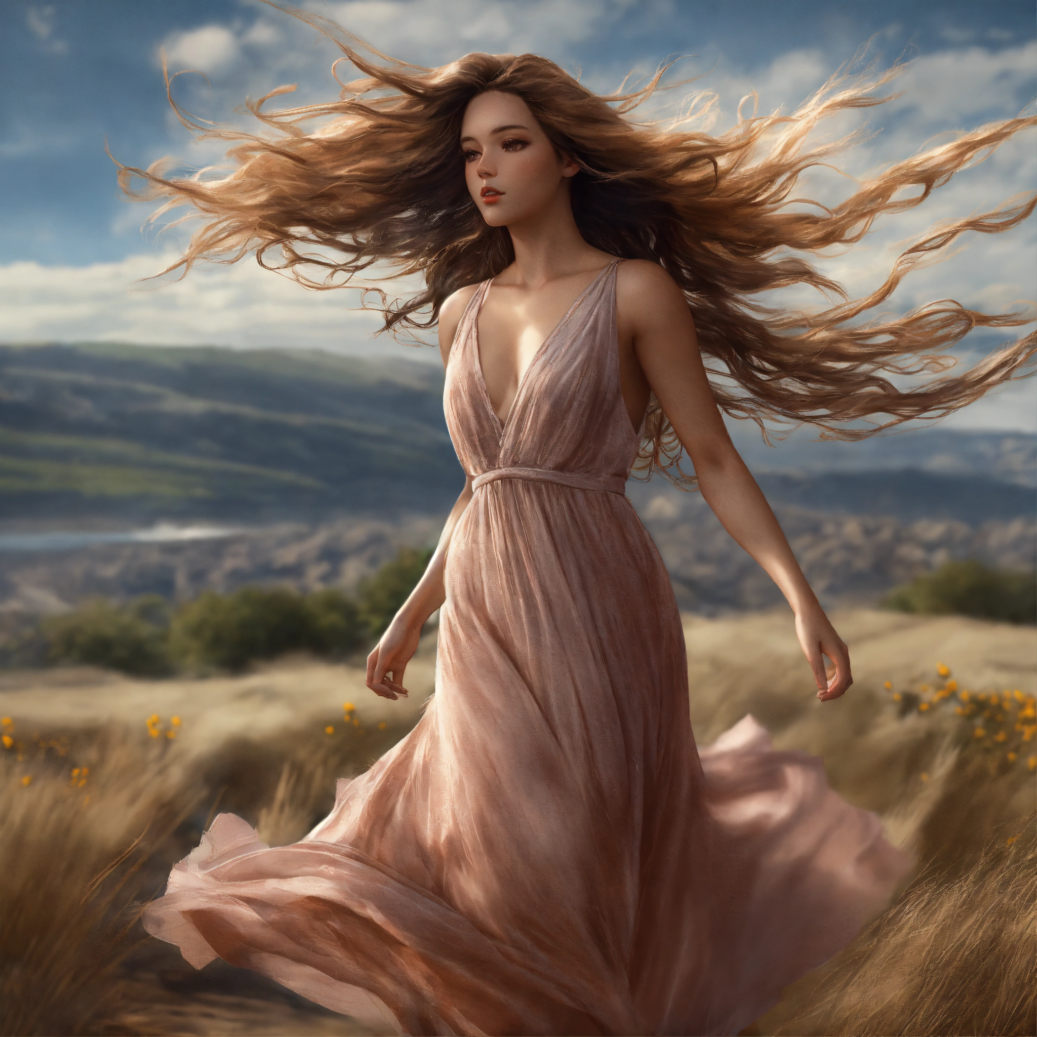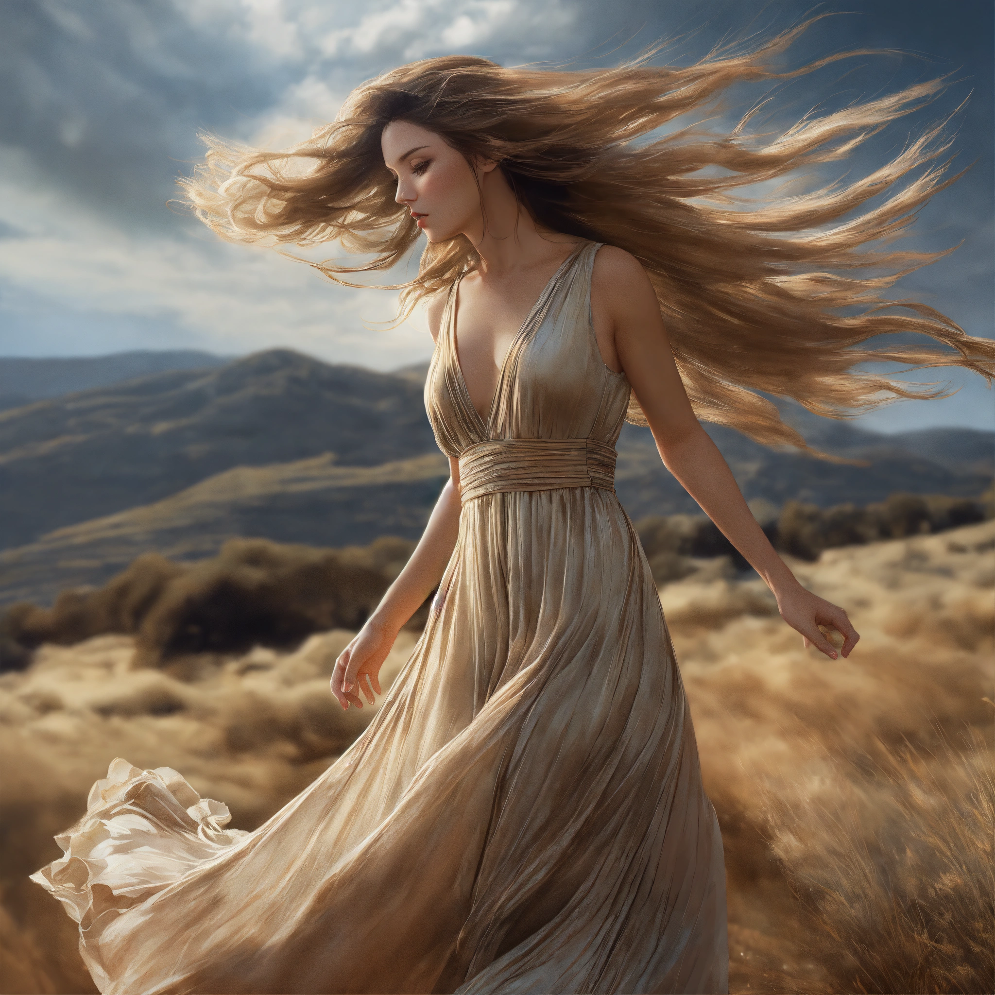 Hair in the wind, full body, hyper realism, poetic, romantic, angelic long dress, realistic shading, realistic render, detailed textures, photorealistic, wide shot, landscape