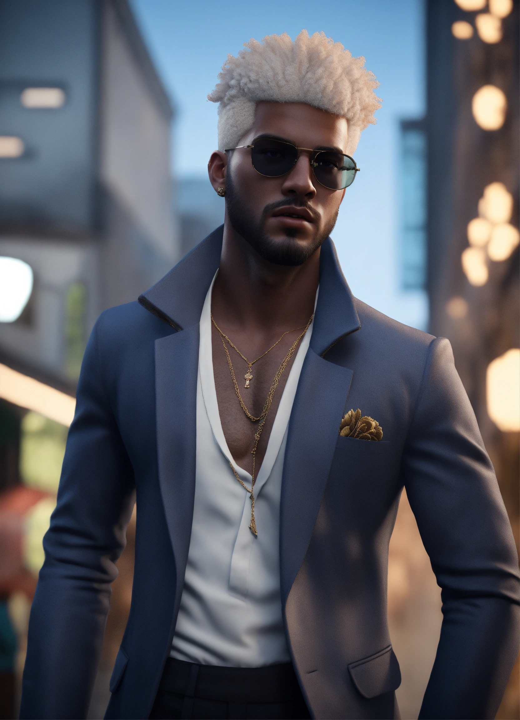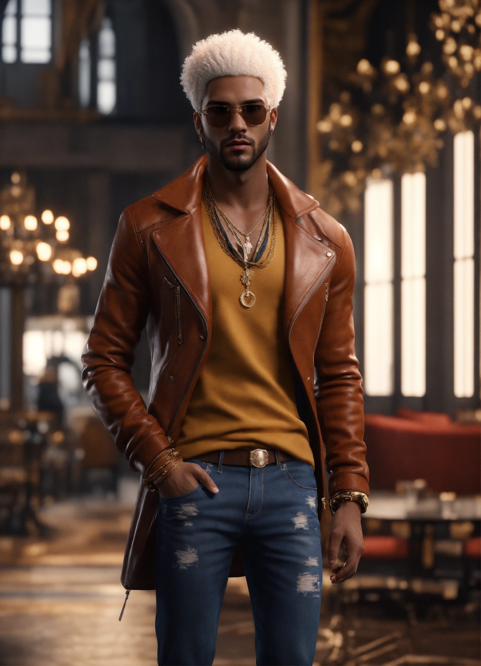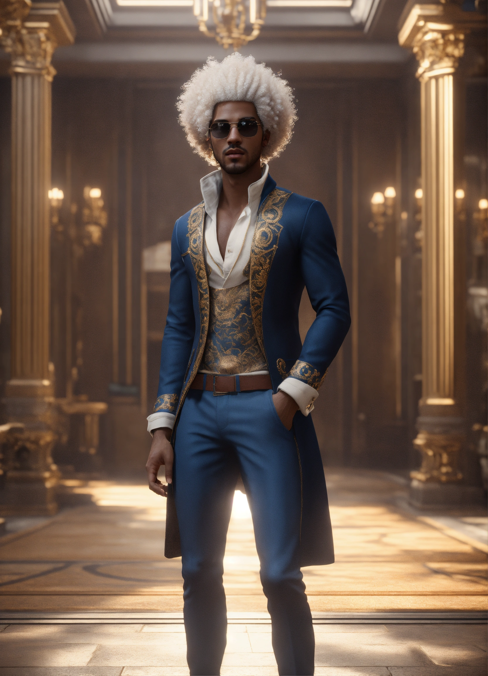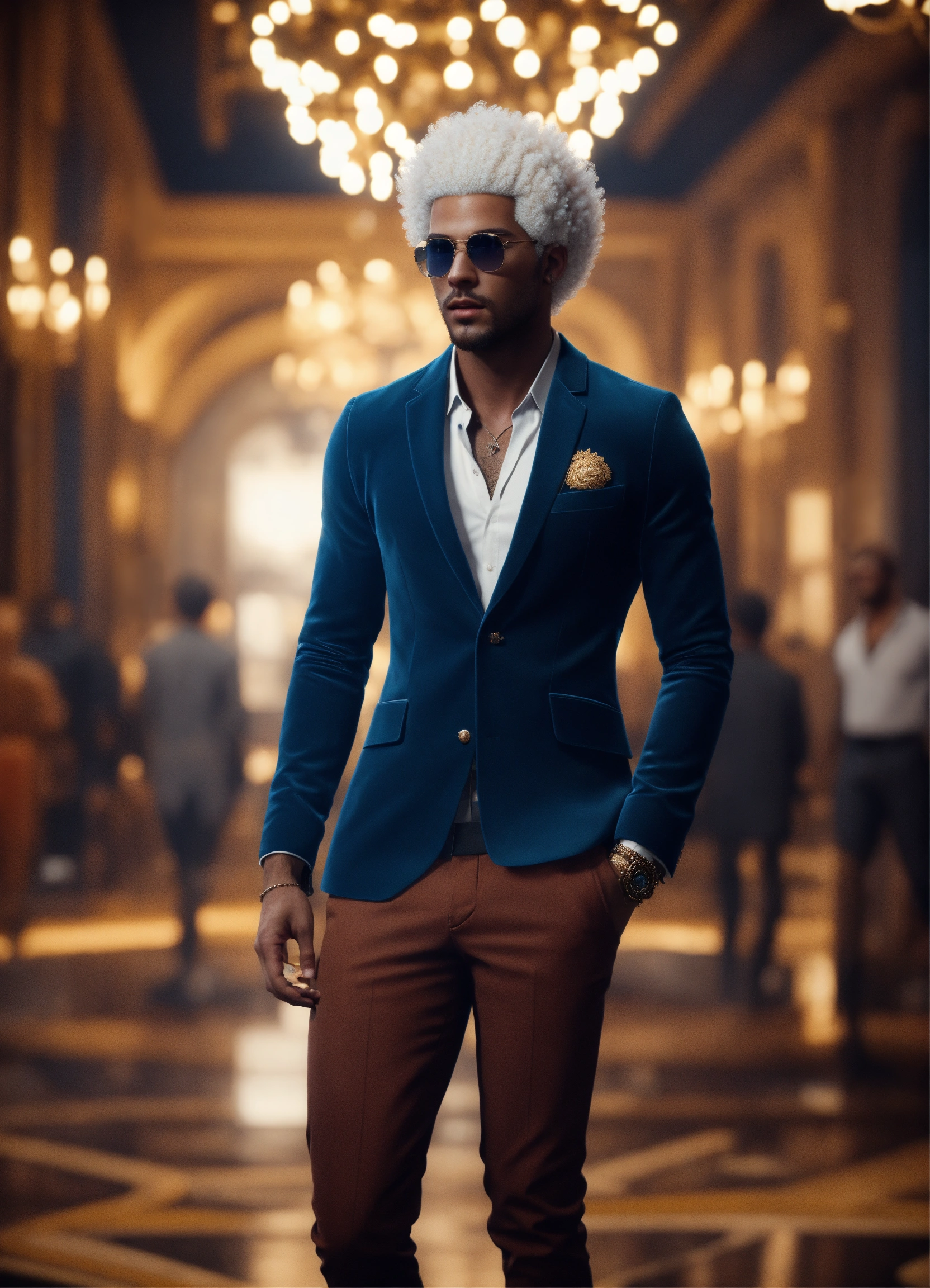 Handsome 27-year-old male. with a white afro. tall build, dressed in haute coture casual wear. 8k, unreal engine. standing in upscale in loby, misischievous demeanor, 8k, unreal engine. 8k, unreal engine.