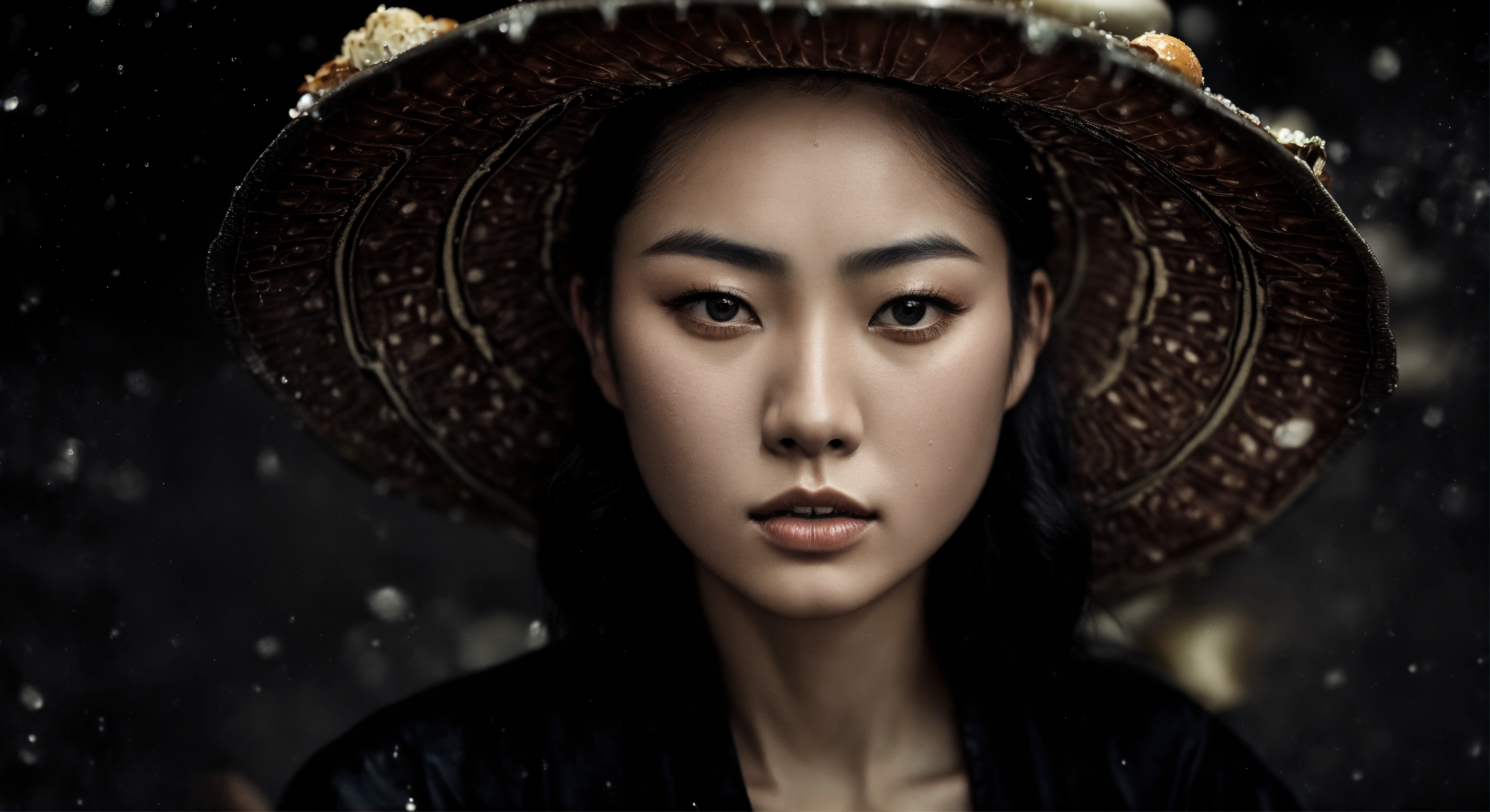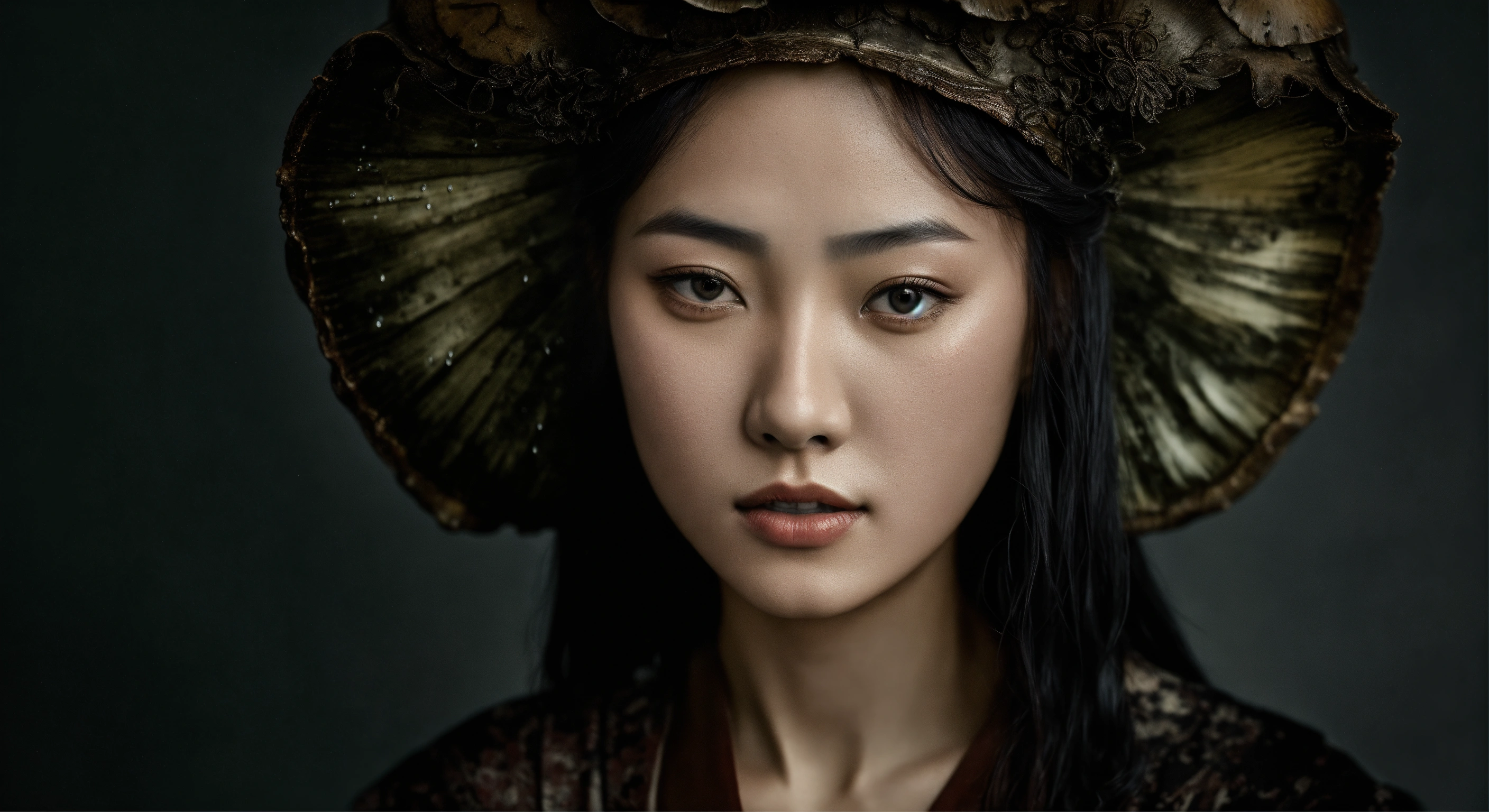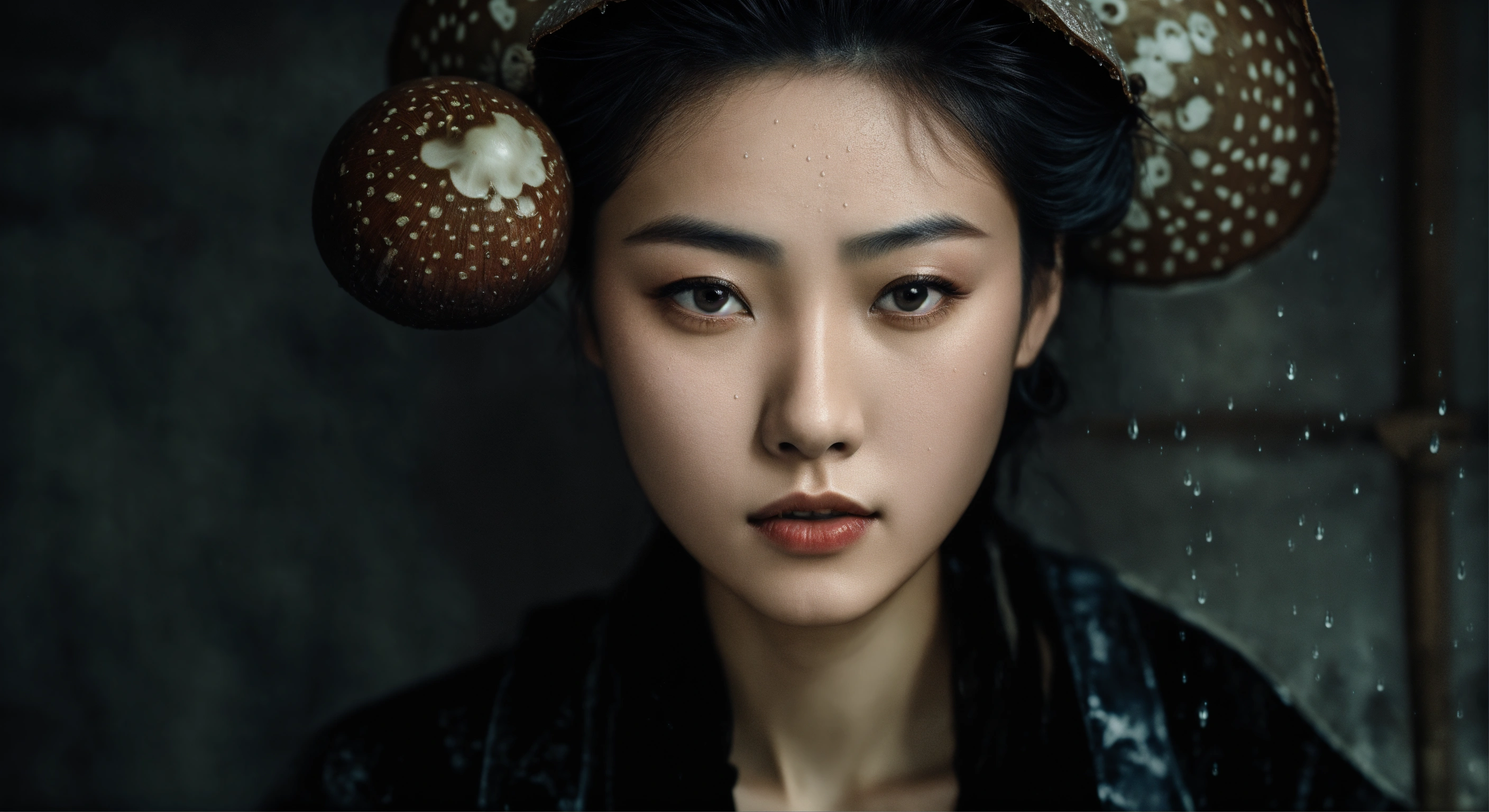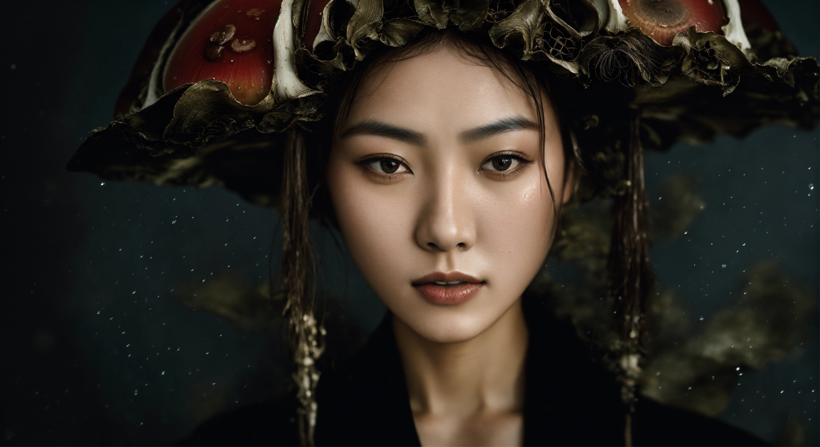 A hyper-realistic wet-plate photograph of a japanese fashion model in a top and a short, holding a huge magic mushroom, 256k.
