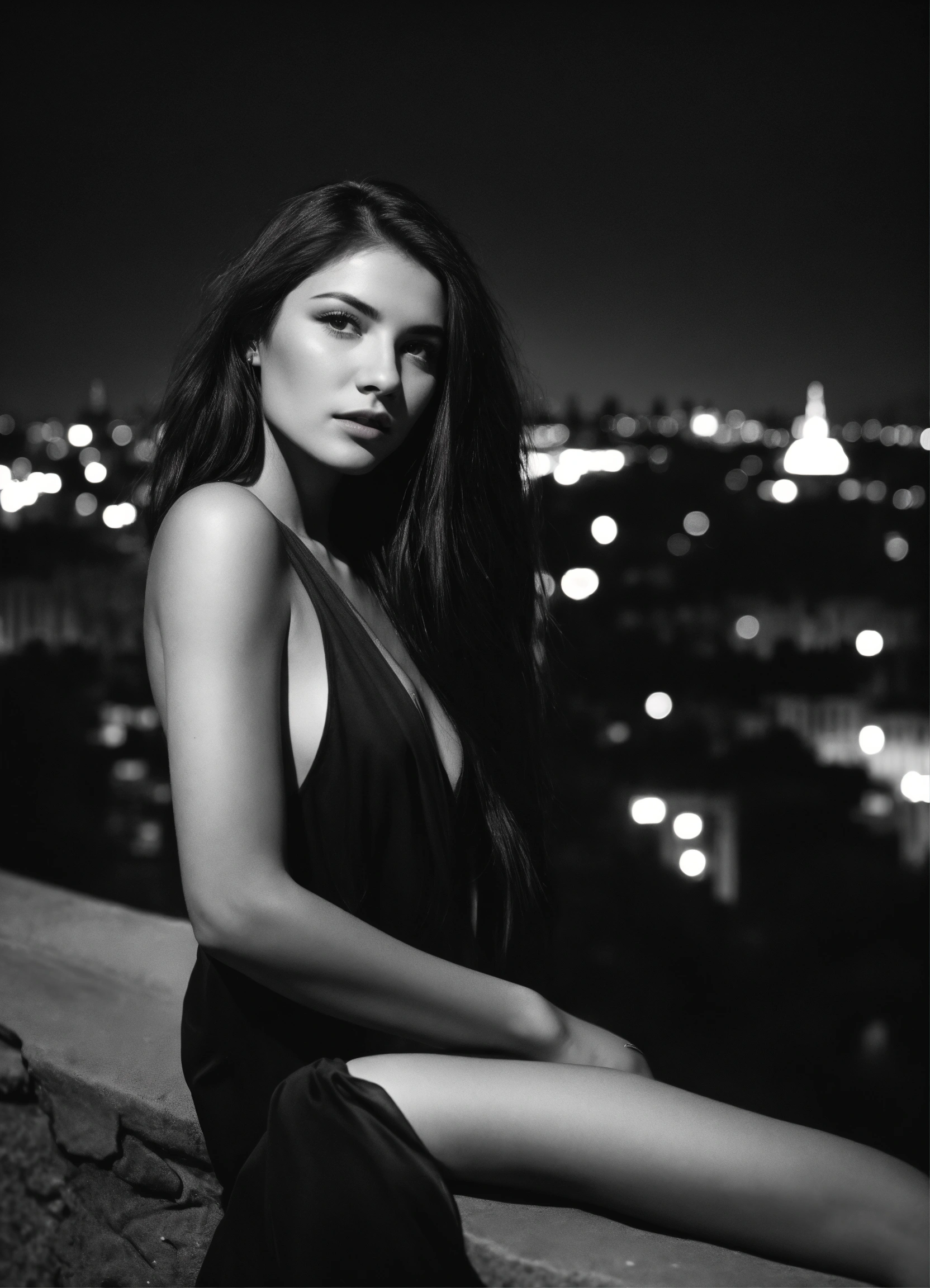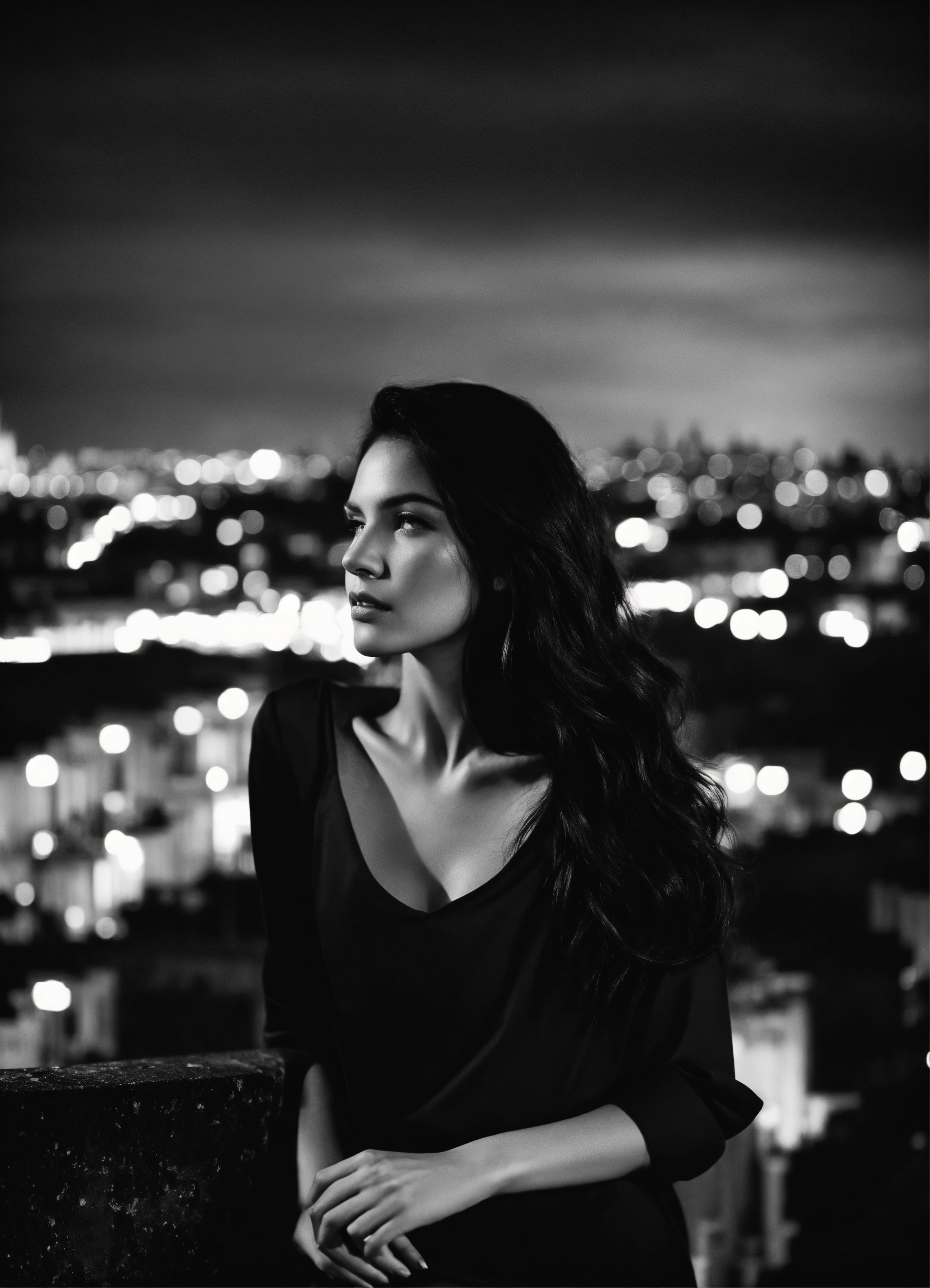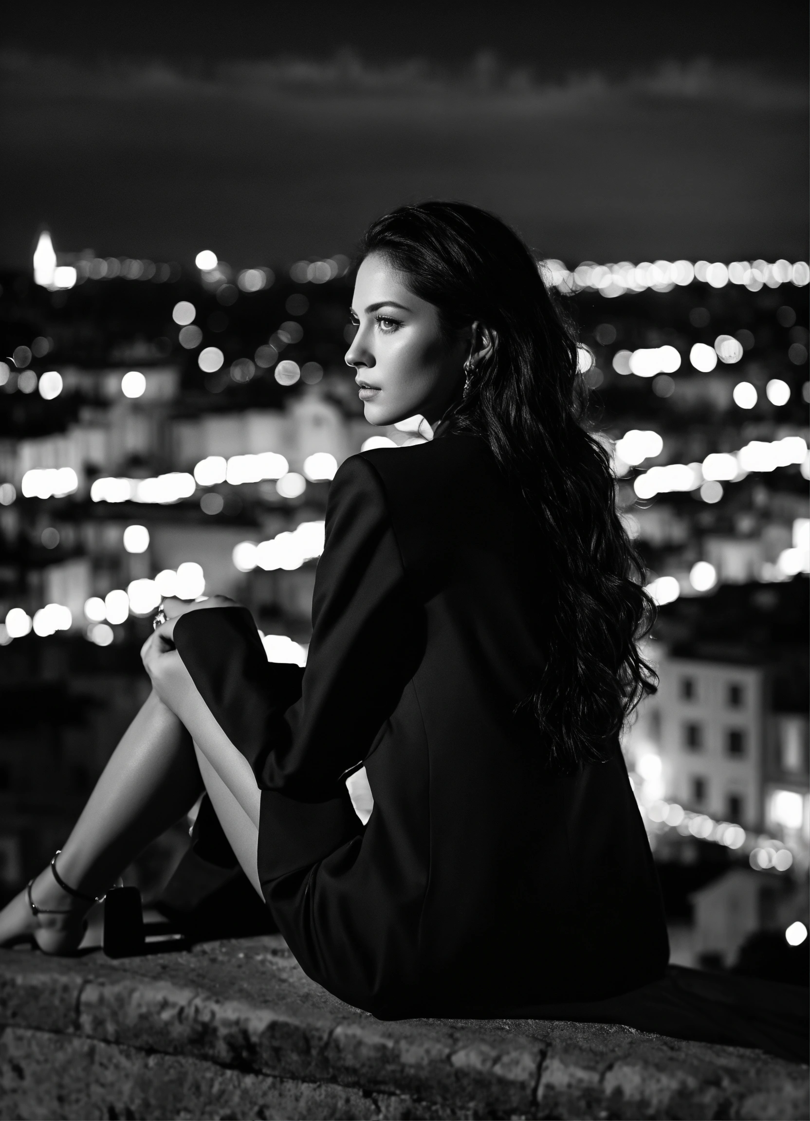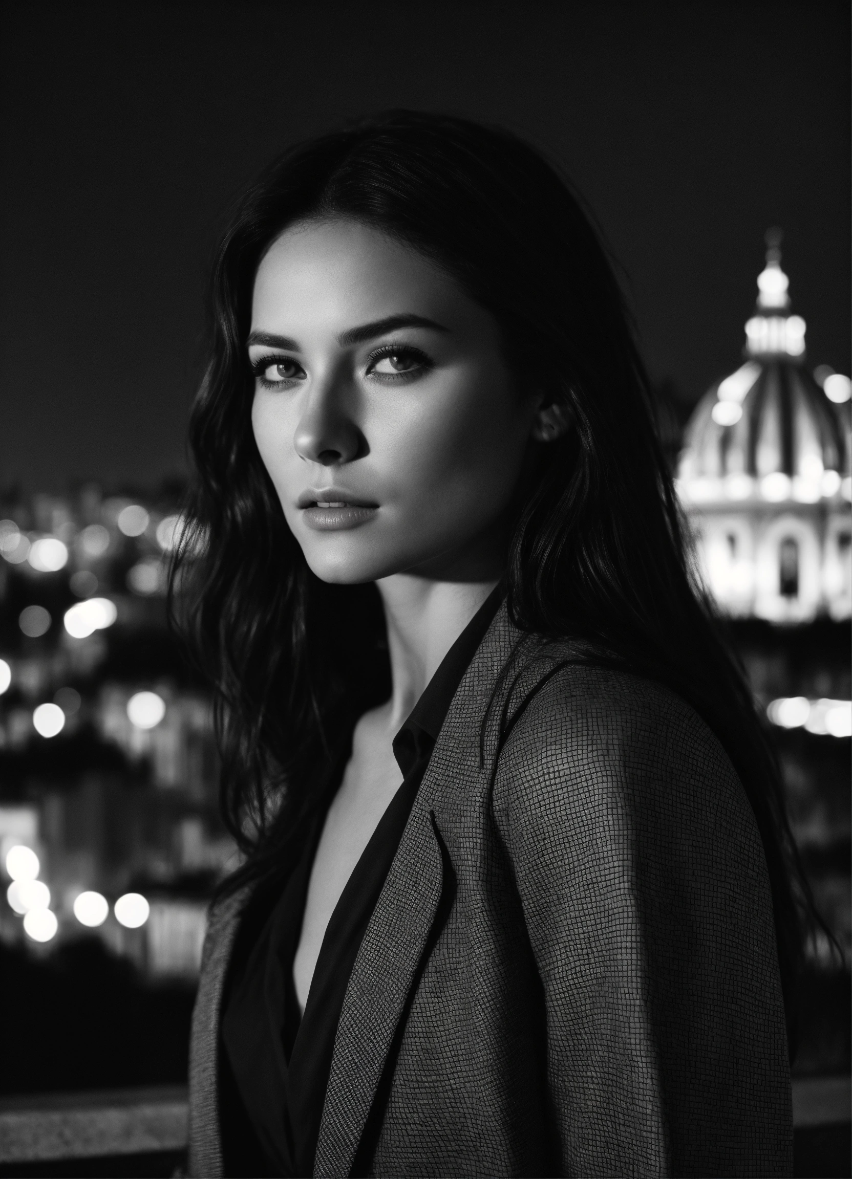Photo of a model one women with long dark hair in passion sitting, head over shoulder looking into camera, in front of the skyline of rome head left looking in the camera in full view at night as background black and white, realistic, portrait, not painted, very detailed faces, skin with pores, 4k, dark suit, skin not smoothed, looking into the camera, dark shirt. rome skyline in full view at night as background