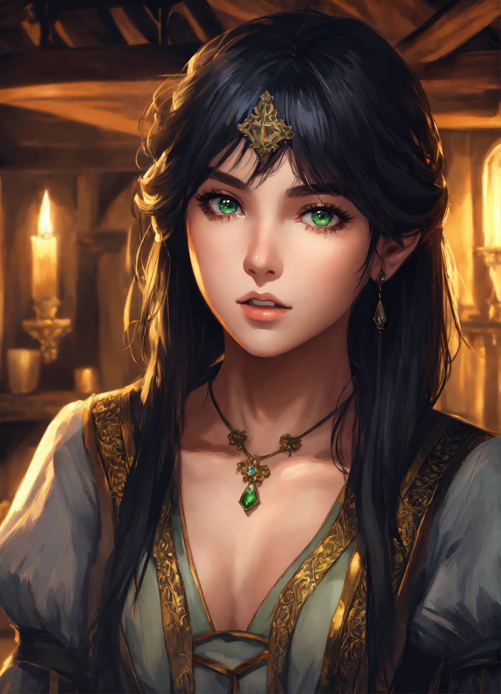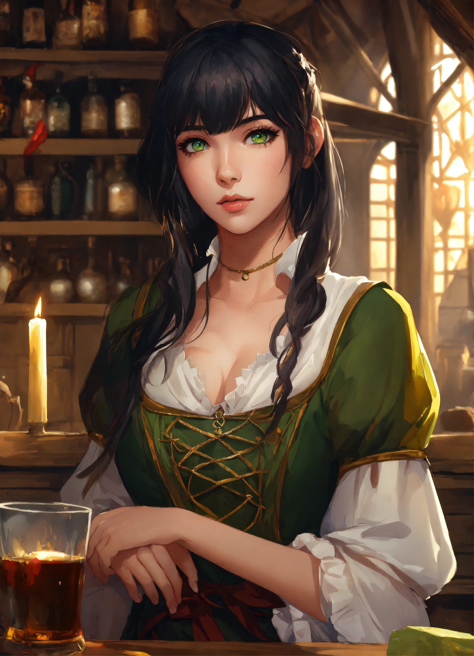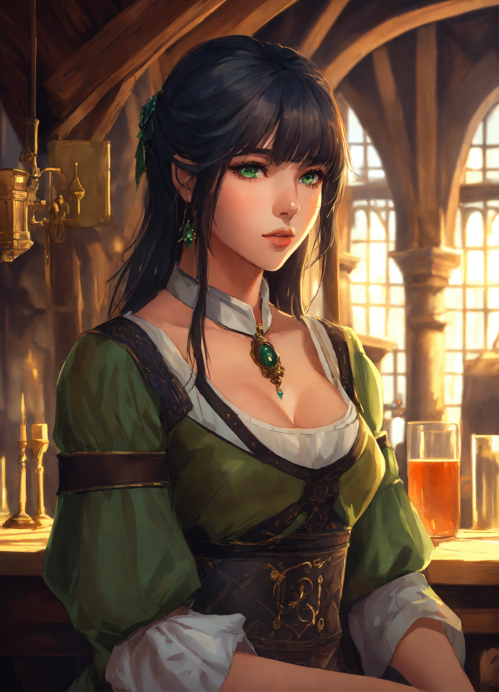 Beautiful anime girl with bangs and black hair, wearing medieval blouse, ample chested, standing inside a medieval tavern, green eyes, character portrait, digital art, realistic painting, dnd, character design, trending on artstation, intricate, elegant, highly detailed, digital painting, artstation, concept art, smooth, sharp focus, illustration