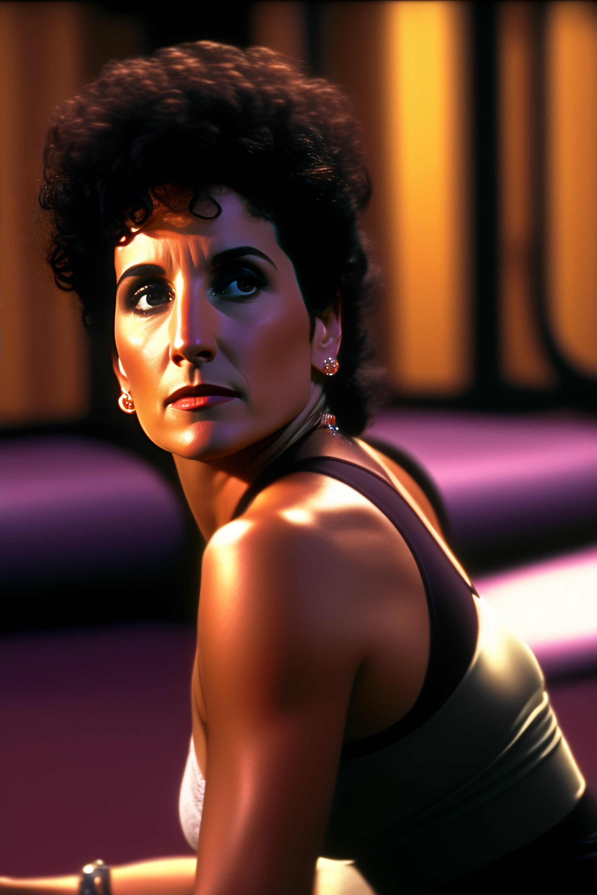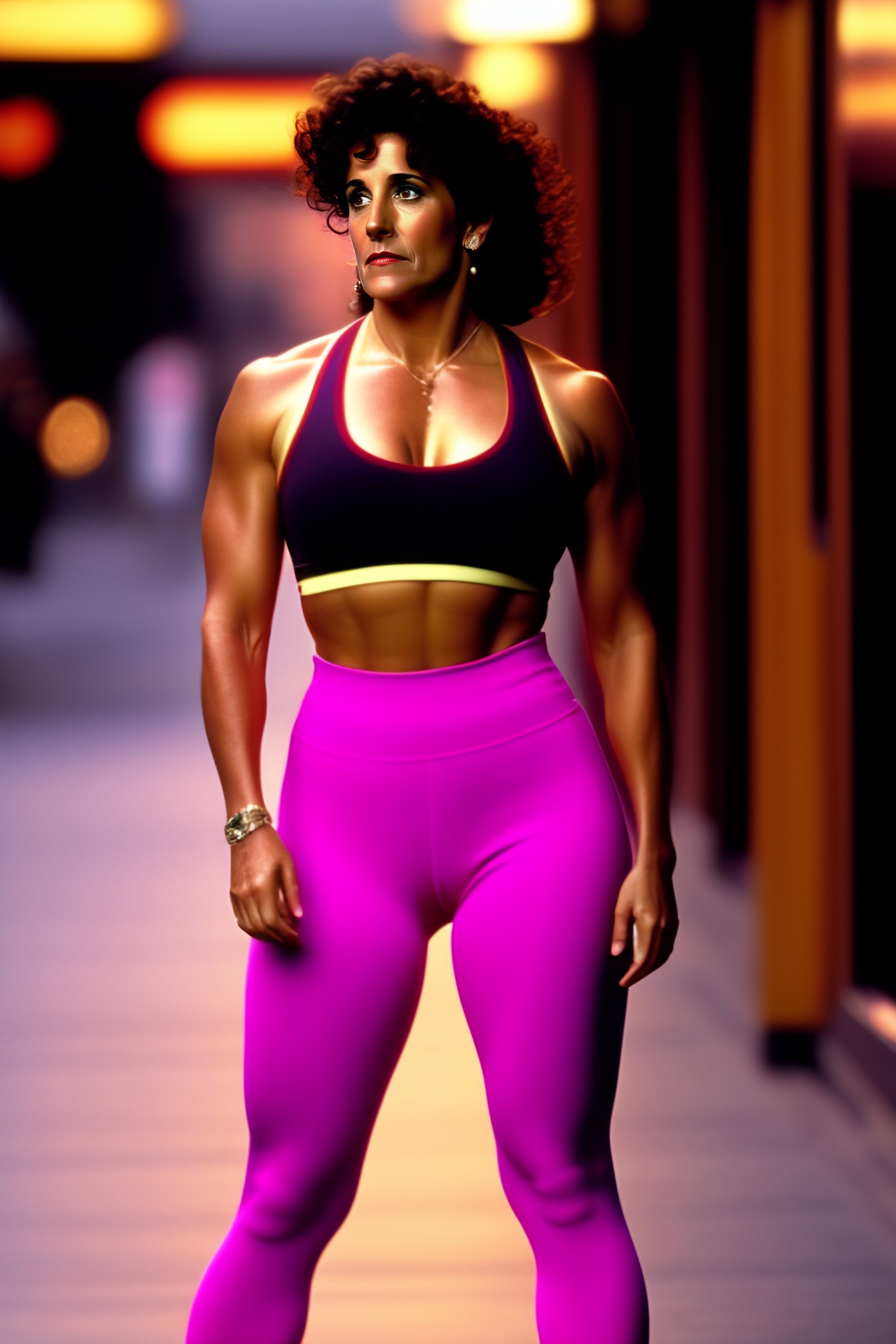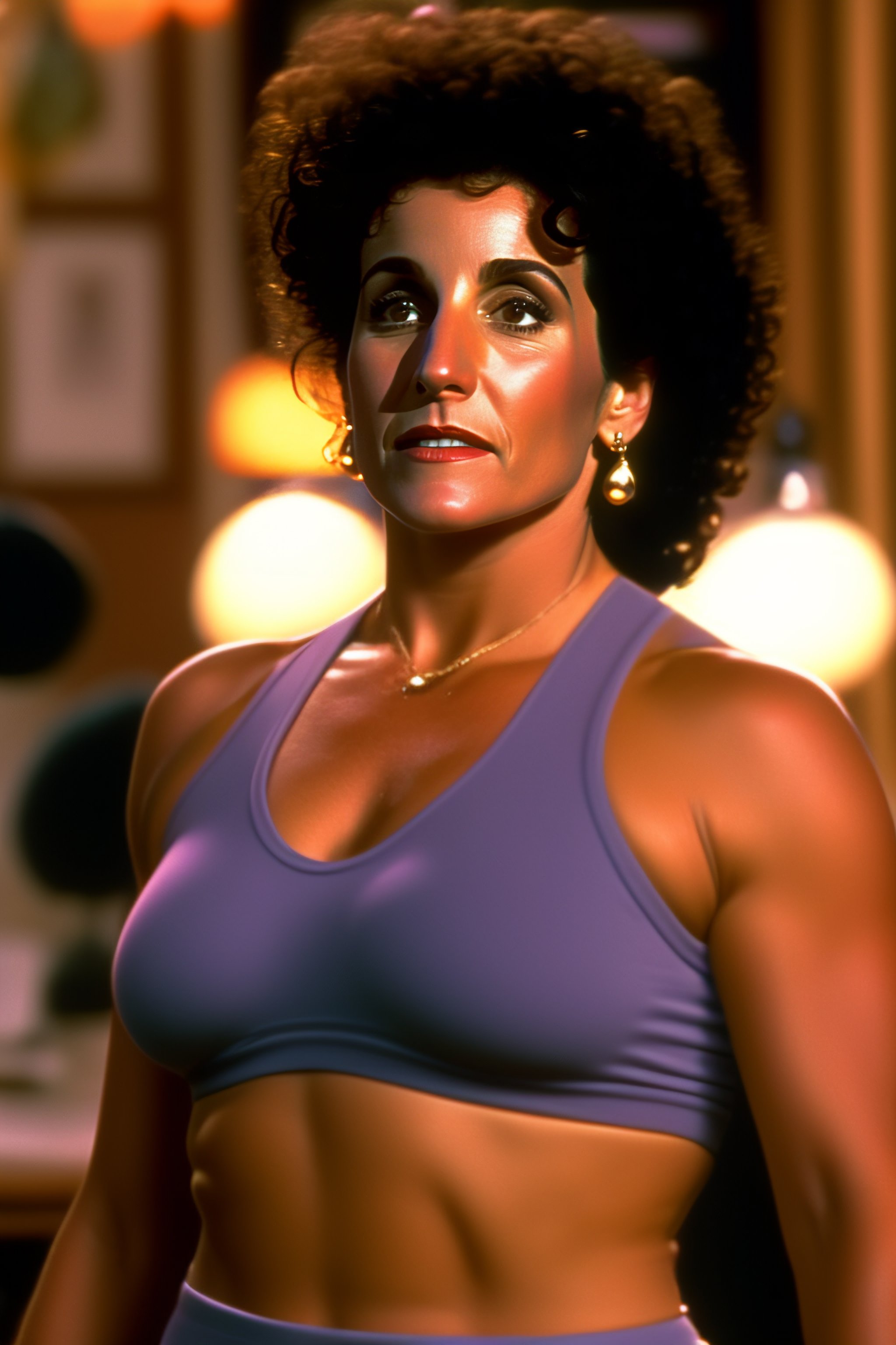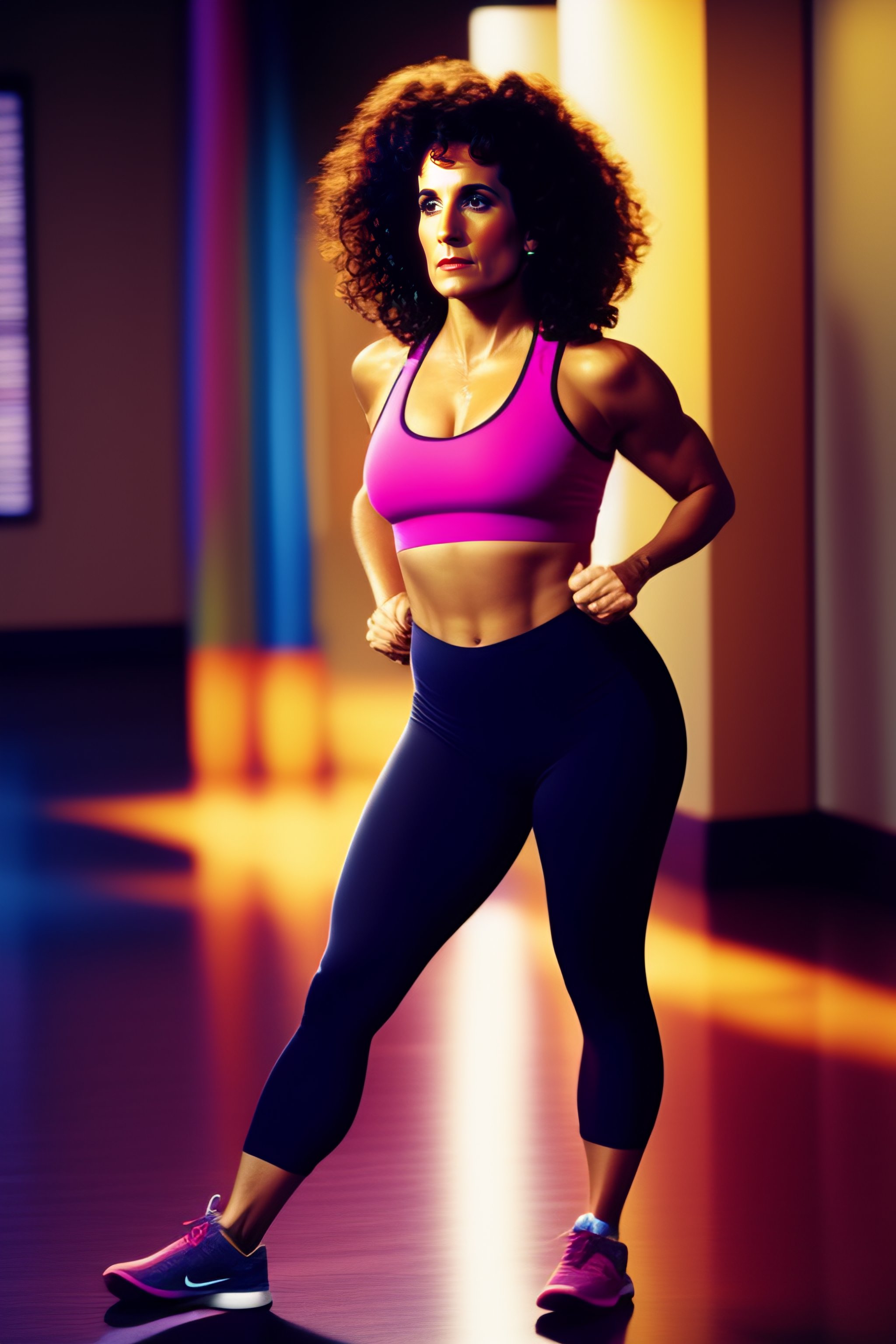 Body shot of elaine benes in yoga pants, detailed, intricate, full of colour, cinematic lighting, focused, extreme details, cinematic, masterpiece