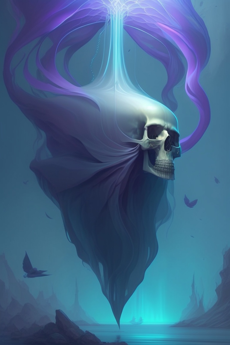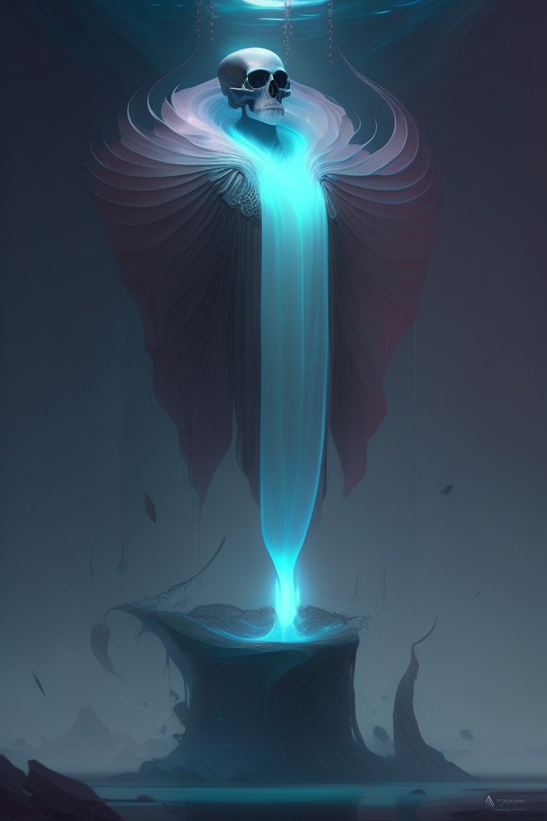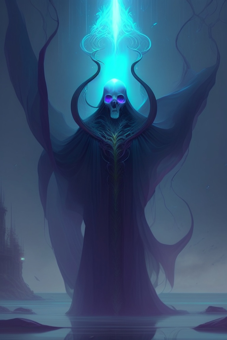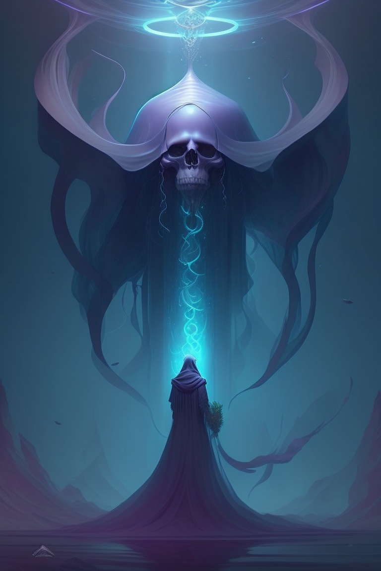 Establishing shot of a fantasy spectral anthropomorphic stingray dementor with a savage rib cage for a skull with extremely long thin tentacle hair attached to its skull floating in an endless dark void of complete darkness, dnd dungeons and dragons, fantasy character art, trending on artstation, by ross tran greg rukowski
