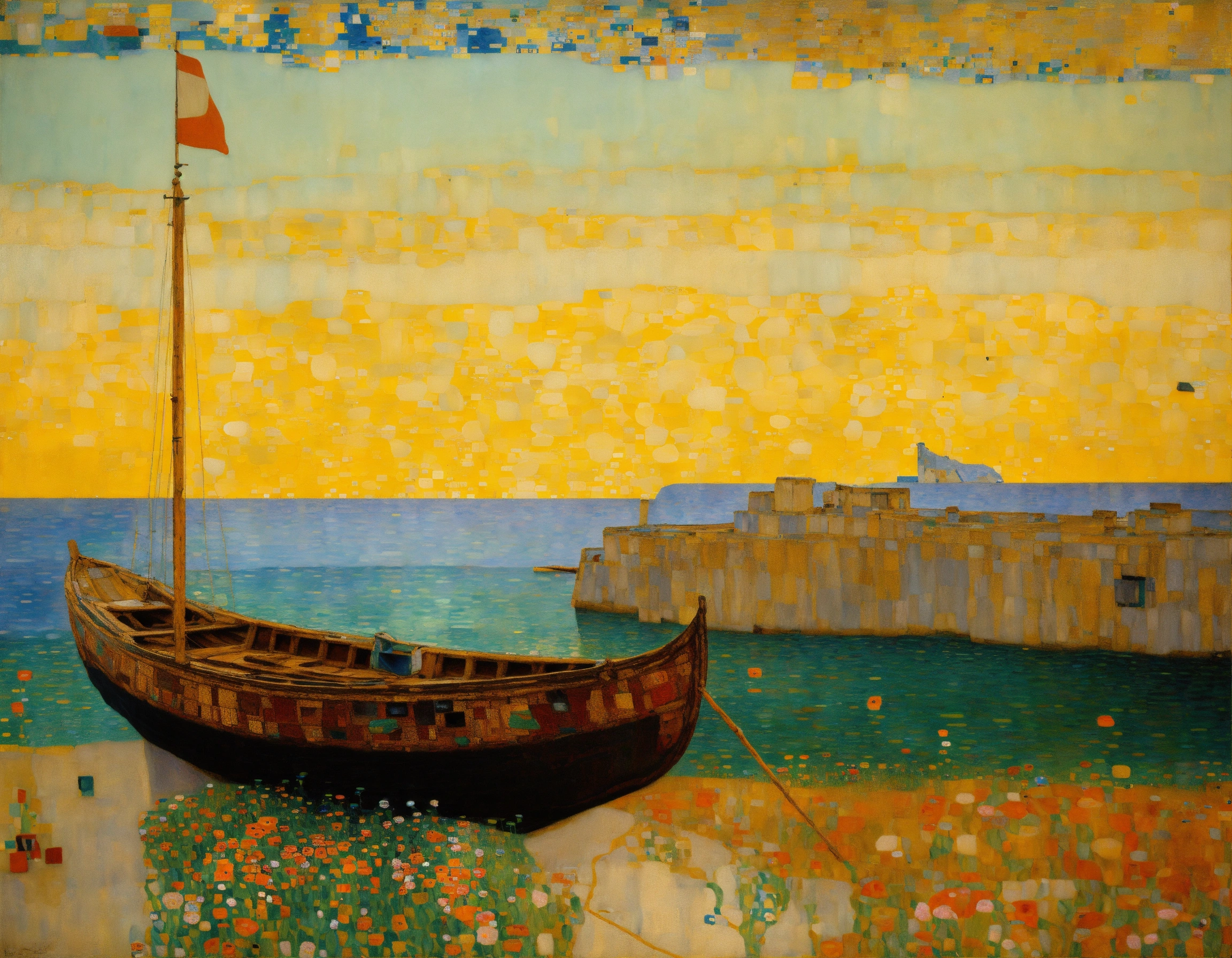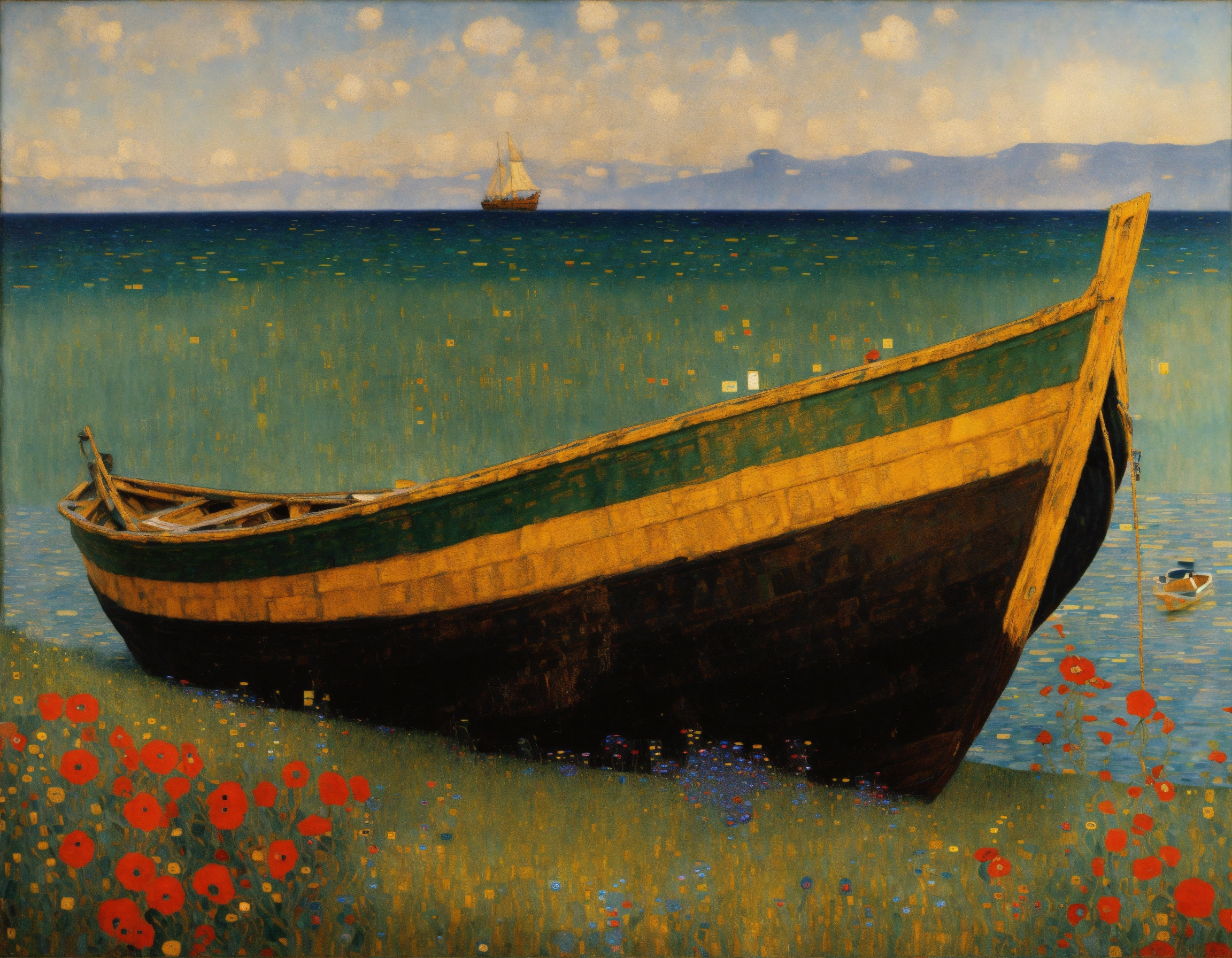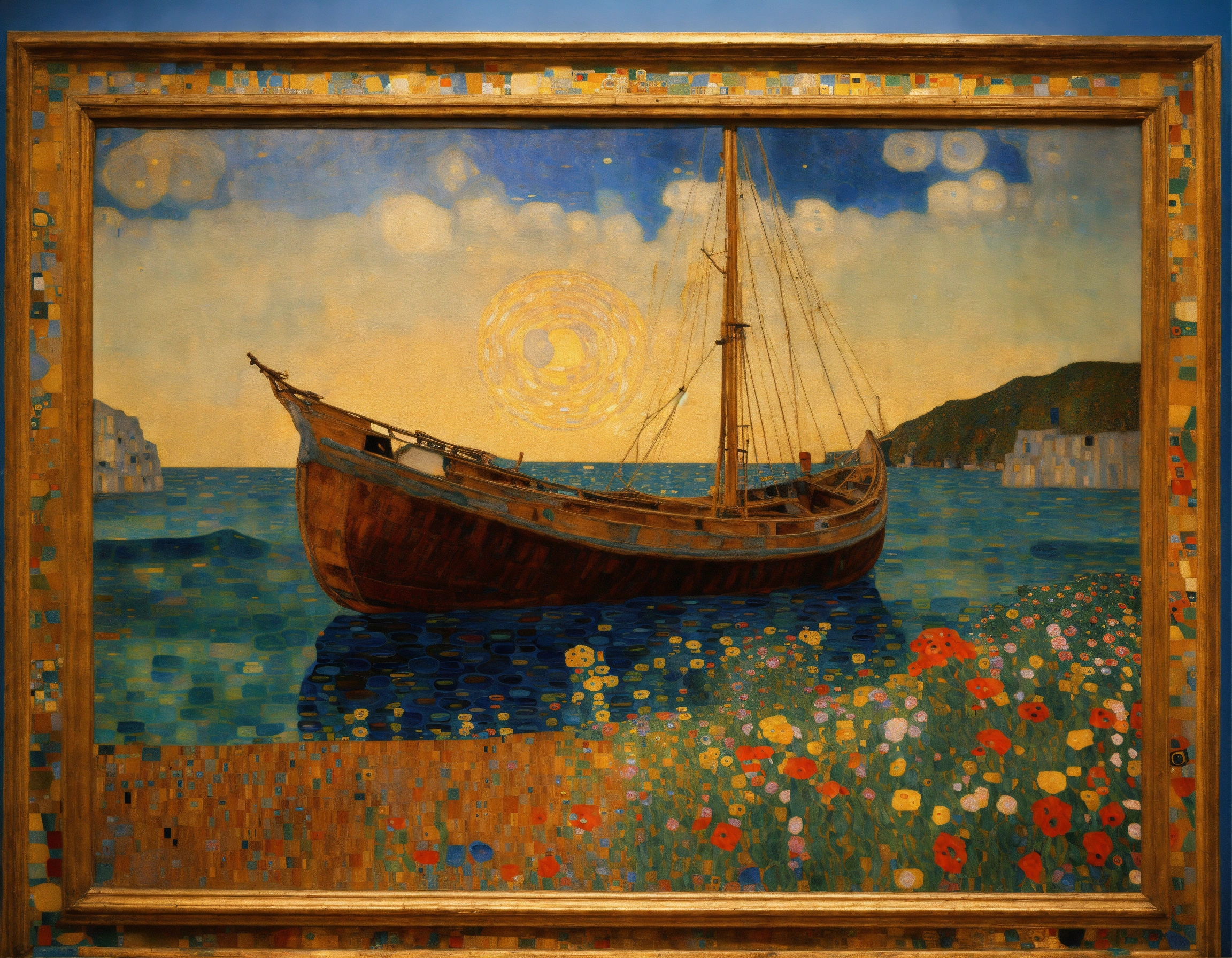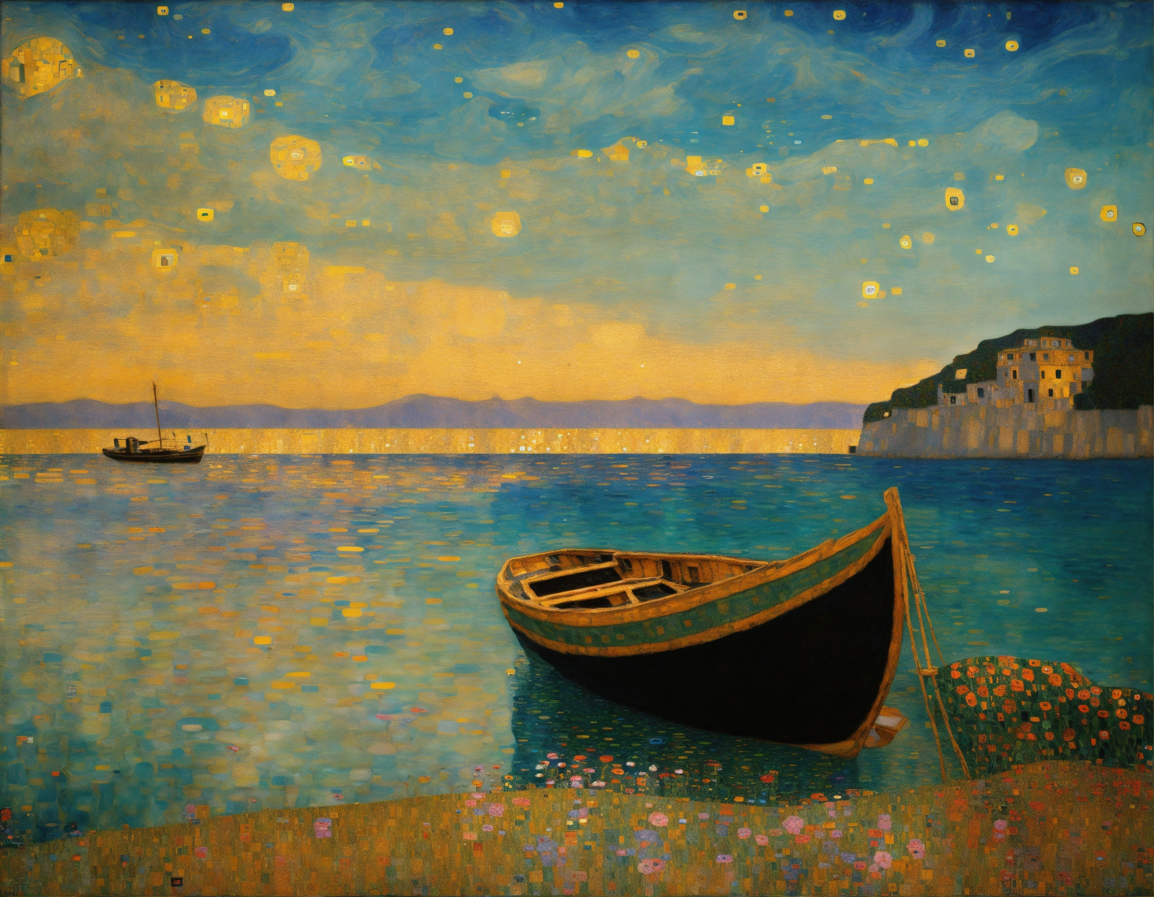 Painting by klimt with the sea and an old boat